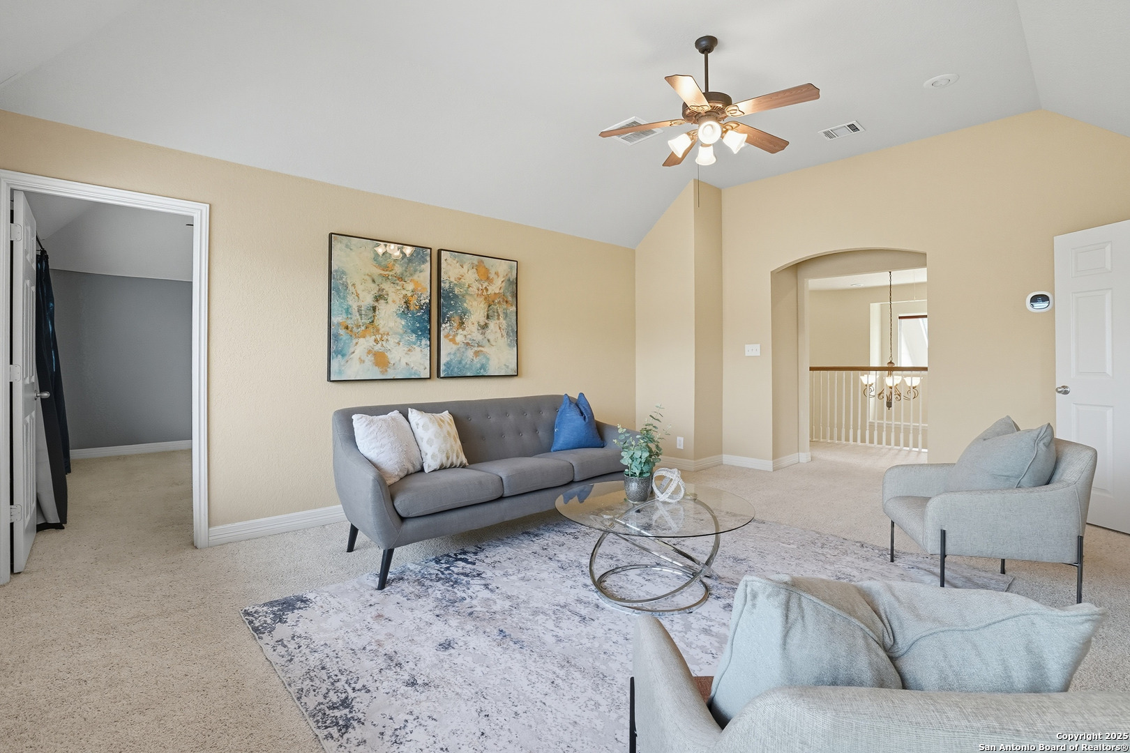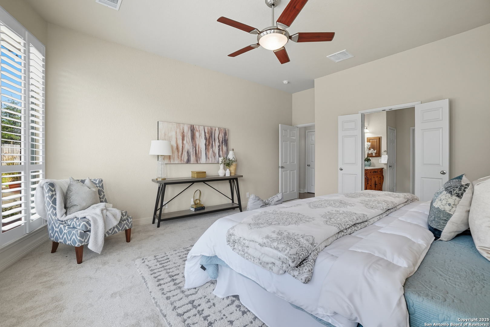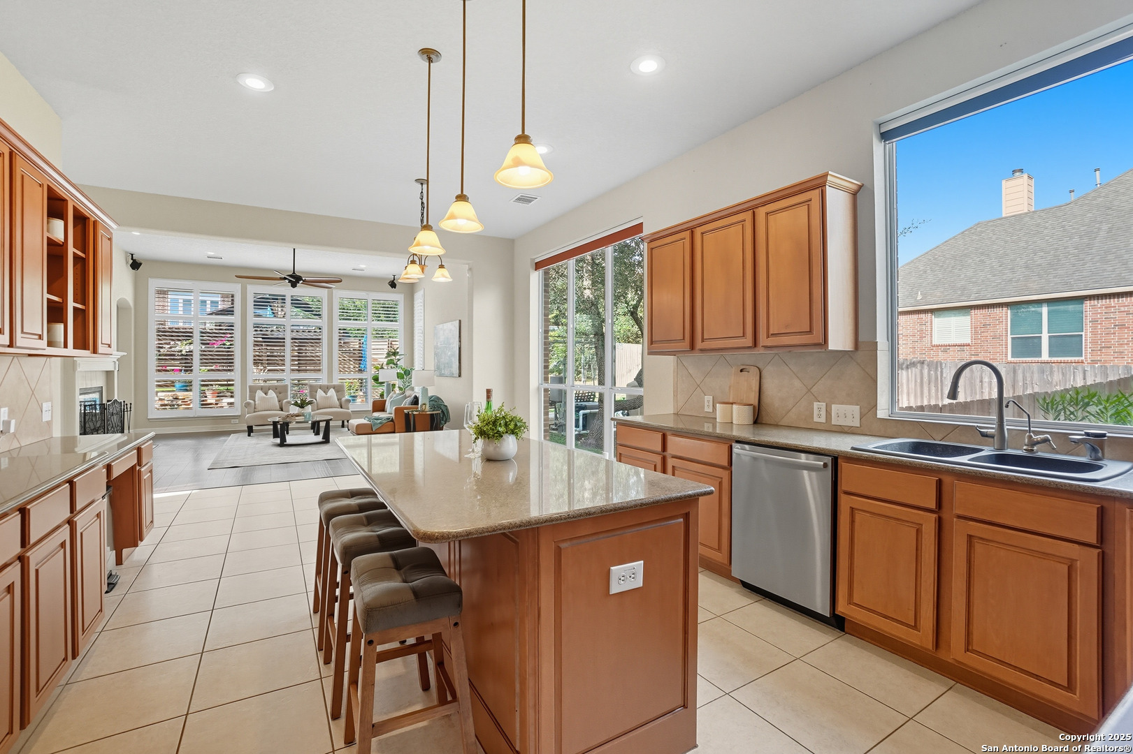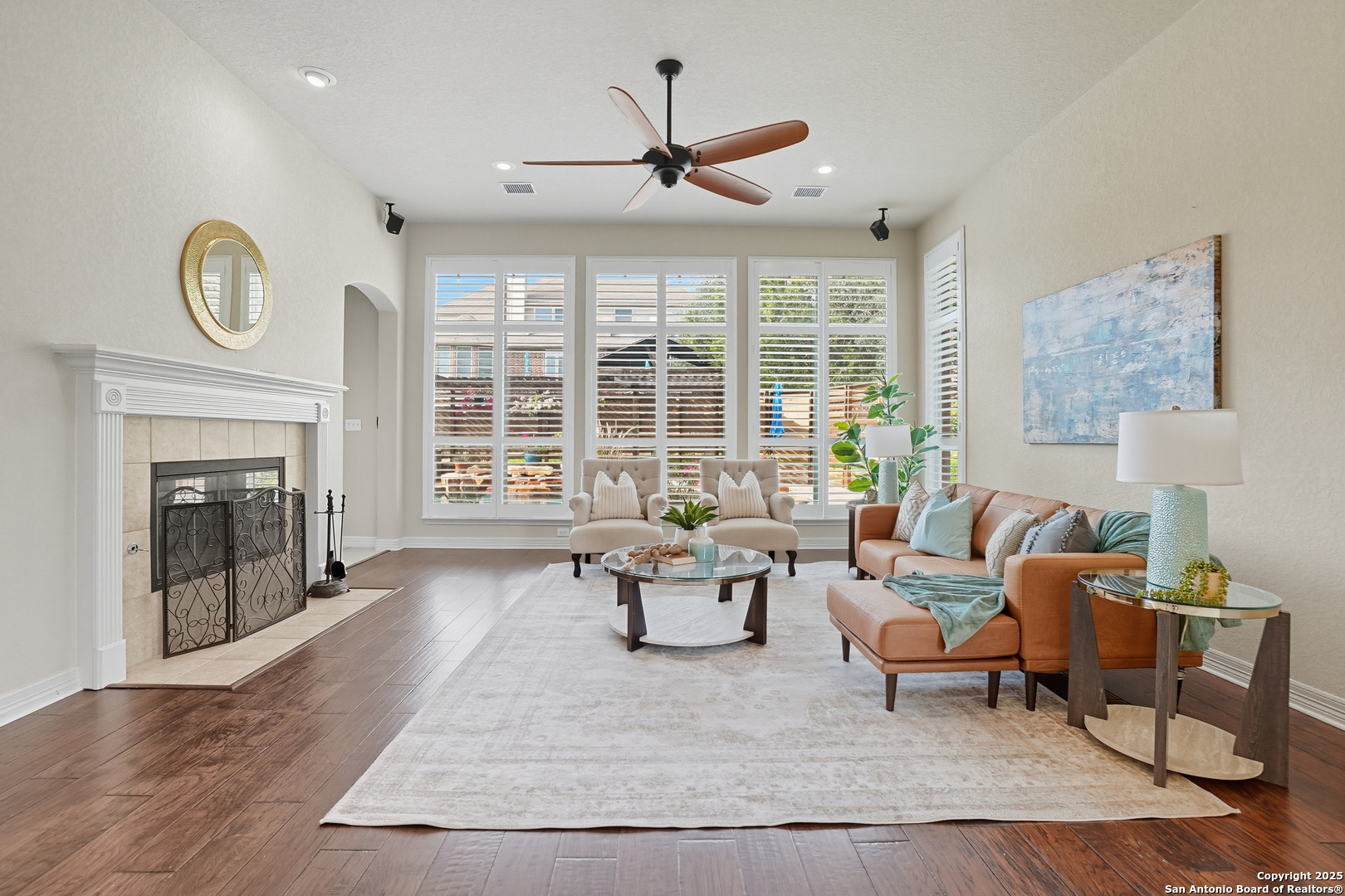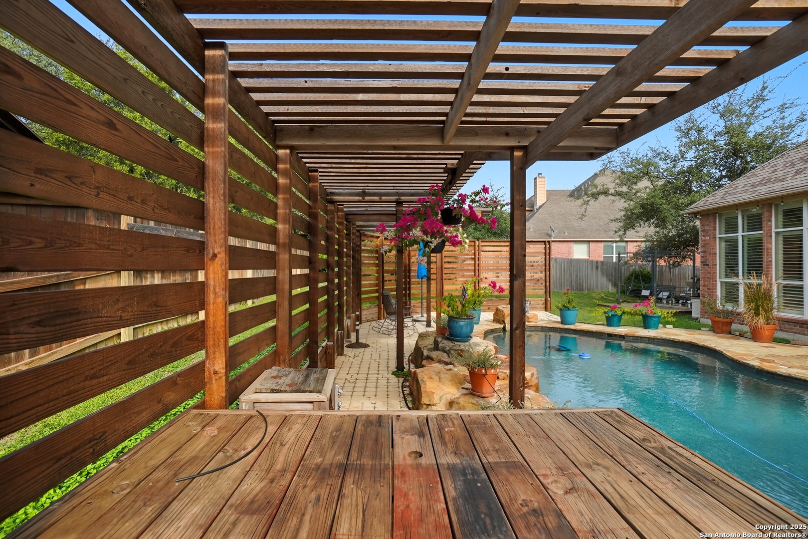 Nestled in the gated enclave of the Stone Oak Mesa Grande, this stately residence sits on a beautifully landscaped .36-acre lot. Featuring five bedrooms plus a dedicated study, the layout includes a private upstairs guest suite-ideal for visitors or multigenerational living. The expansive open-concept living room impresses with soaring ceilings, abundant natural light, and a cozy gas fireplace. The spacious island kitchen features gas cooking, extensive cabinetry, and generous prep space for any culinary endeavor. Upstairs offers a large second living room- perfect for media, play, or fitness, and a versatile bonus room. The primary suite is a peaceful retreat, complete with a sitting area. Step outside into a resort-style backyard oasis, highlighted by a custom heated pool and spa designed by Keith Zars Pools. Surrounded by mature landscaping and ample patio space, it's perfect for year-round entertaining. Additional highlights includes abundant storage space in the garage.