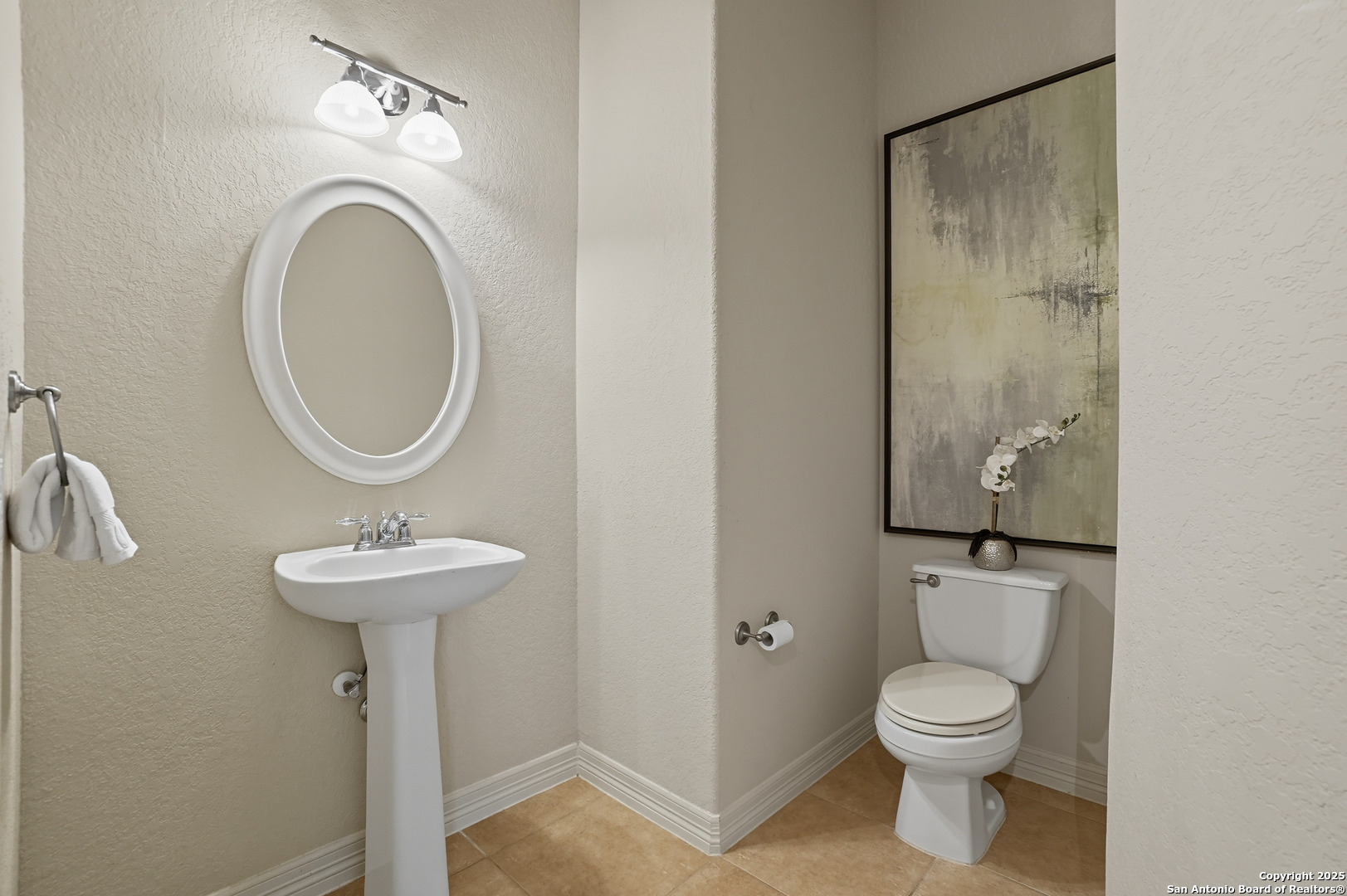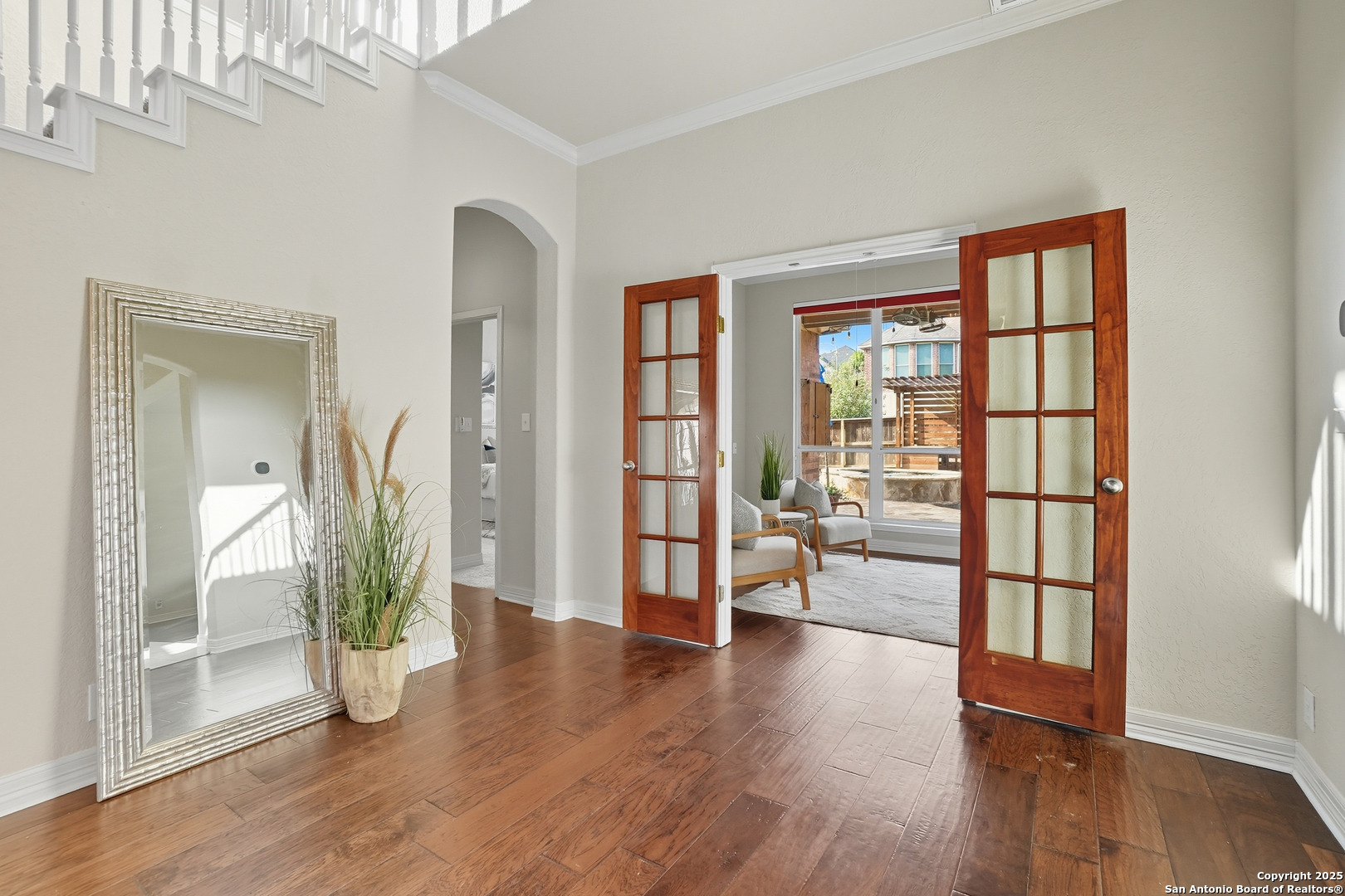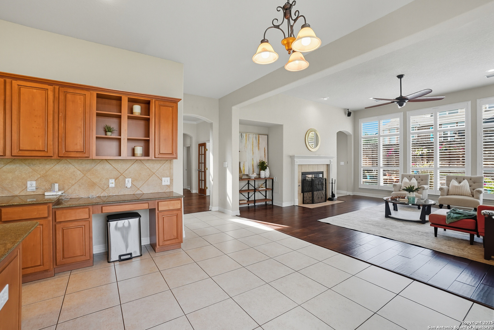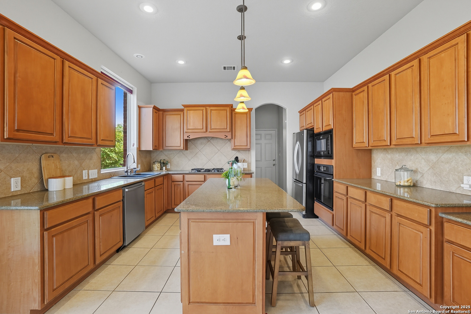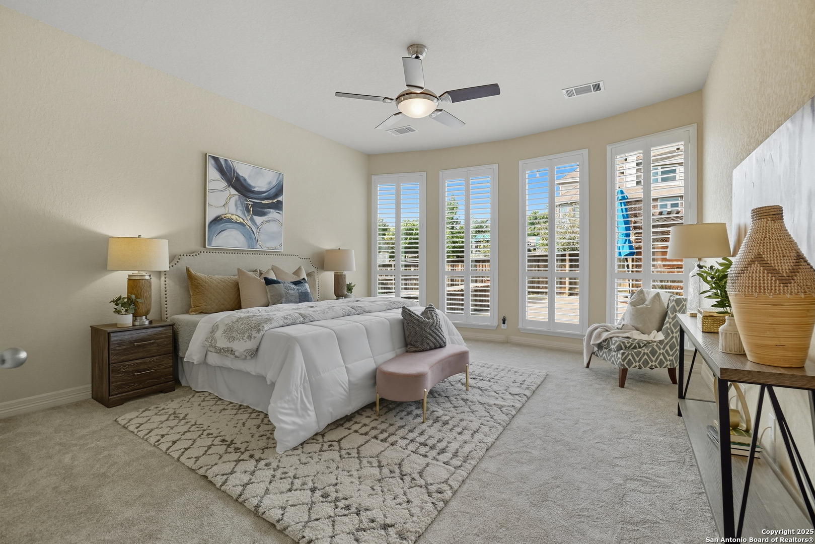 Nestled in the gated enclave of the Stone Oak Mesa Grande, this stately residence sits on a beautifully landscaped .36-acre lot. Featuring five bedrooms plus a dedicated study, the layout includes a private upstairs guest suite-ideal for visitors or multigenerational living. The expansive open-concept living room impresses with soaring ceilings, abundant natural light, and a cozy gas fireplace. The spacious island kitchen features gas cooking, extensive cabinetry, and generous prep space for any culinary endeavor. Upstairs offers a large second living room- perfect for media, play, or fitness, and a versatile bonus room. The primary suite is a peaceful retreat, complete with a sitting area. Step outside into a resort-style backyard oasis, highlighted by a custom heated pool and spa designed by Keith Zars Pools. Surrounded by mature landscaping and ample patio space, it's perfect for year-round entertaining. Additional highlights includes abundant storage space in the garage.