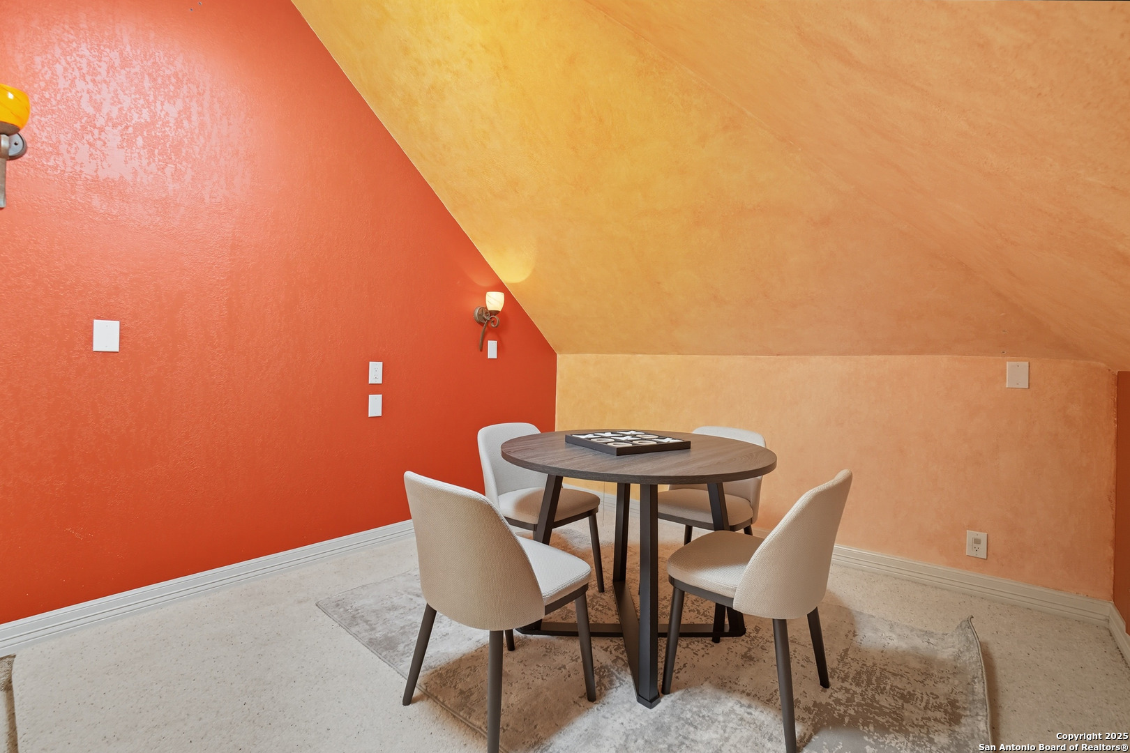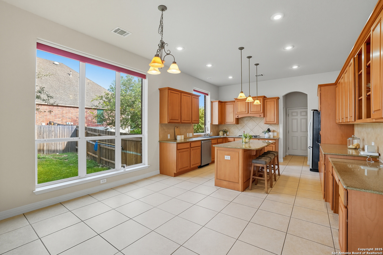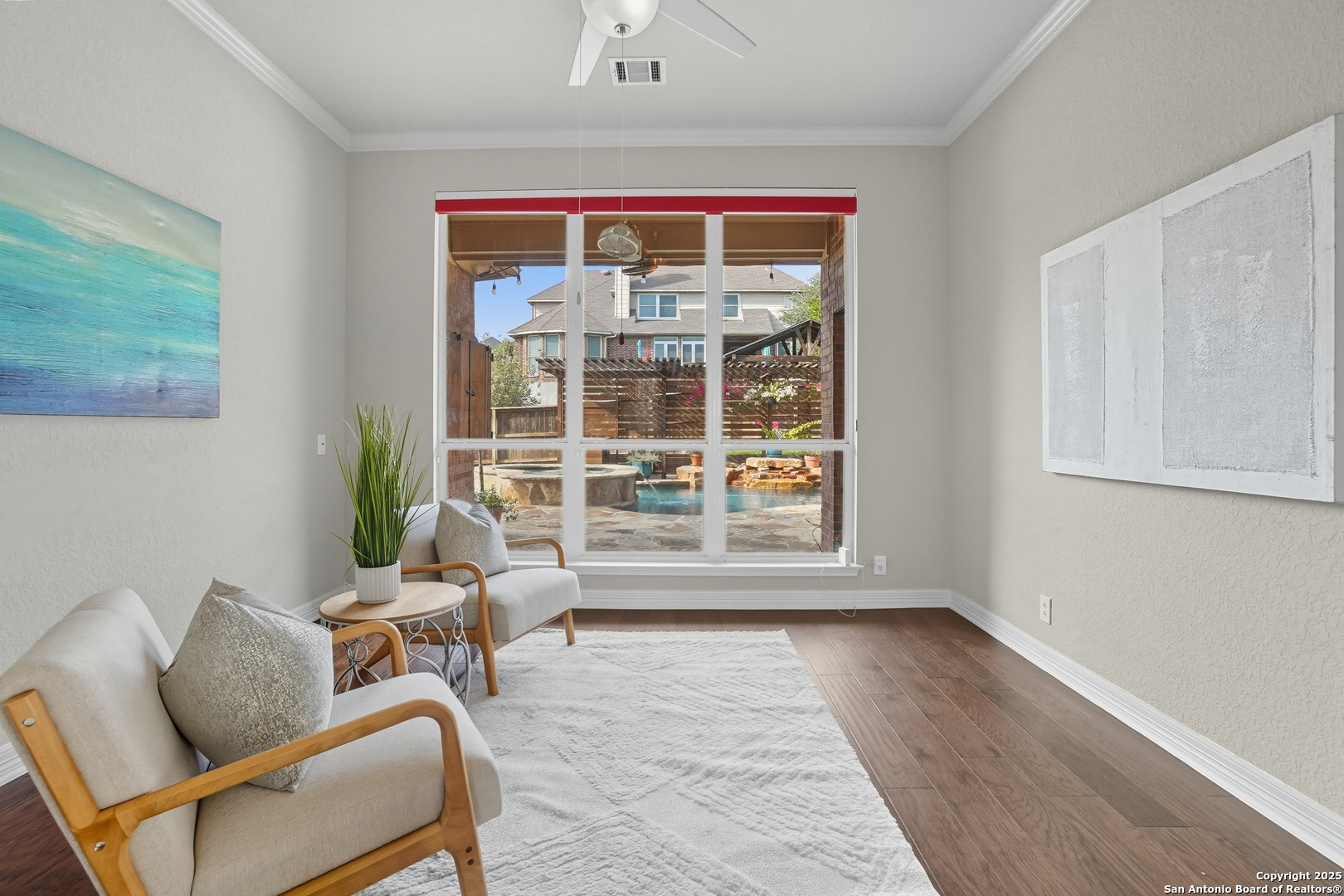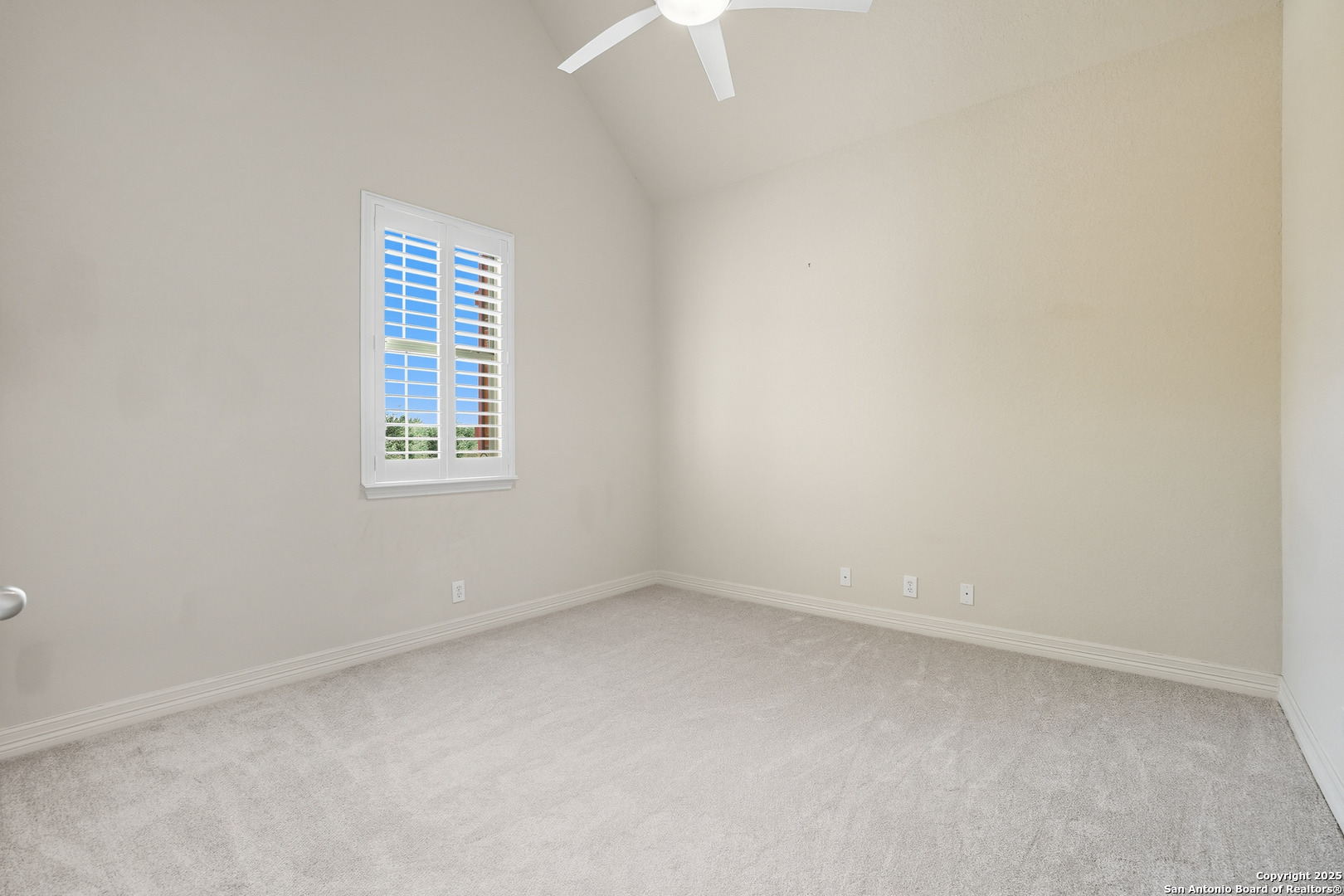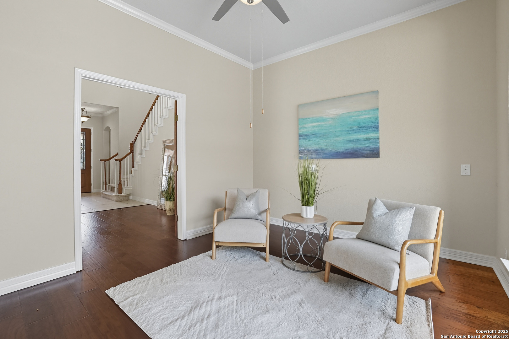 Nestled in the gated enclave of the Stone Oak Mesa Grande, this stately residence sits on a beautifully landscaped .36-acre lot. Featuring five bedrooms plus a dedicated study, the layout includes a private upstairs guest suite-ideal for visitors or multigenerational living. The expansive open-concept living room impresses with soaring ceilings, abundant natural light, and a cozy gas fireplace. The spacious island kitchen features gas cooking, extensive cabinetry, and generous prep space for any culinary endeavor. Upstairs offers a large second living room- perfect for media, play, or fitness, and a versatile bonus room. The primary suite is a peaceful retreat, complete with a sitting area. Step outside into a resort-style backyard oasis, highlighted by a custom heated pool and spa designed by Keith Zars Pools. Surrounded by mature landscaping and ample patio space, it's perfect for year-round entertaining. Additional highlights includes abundant storage space in the garage.