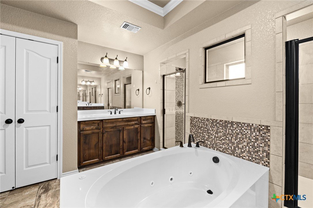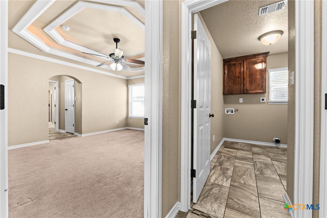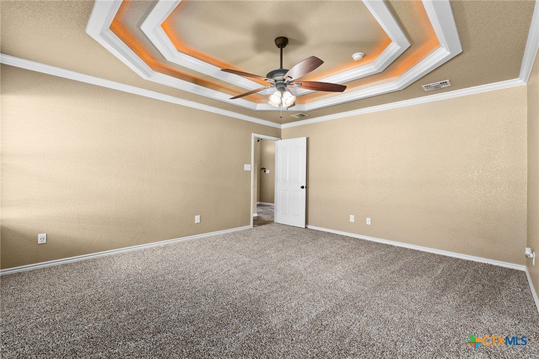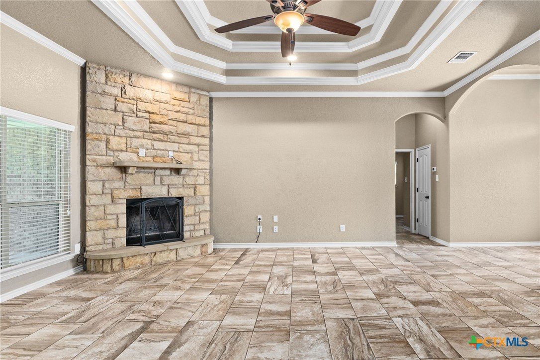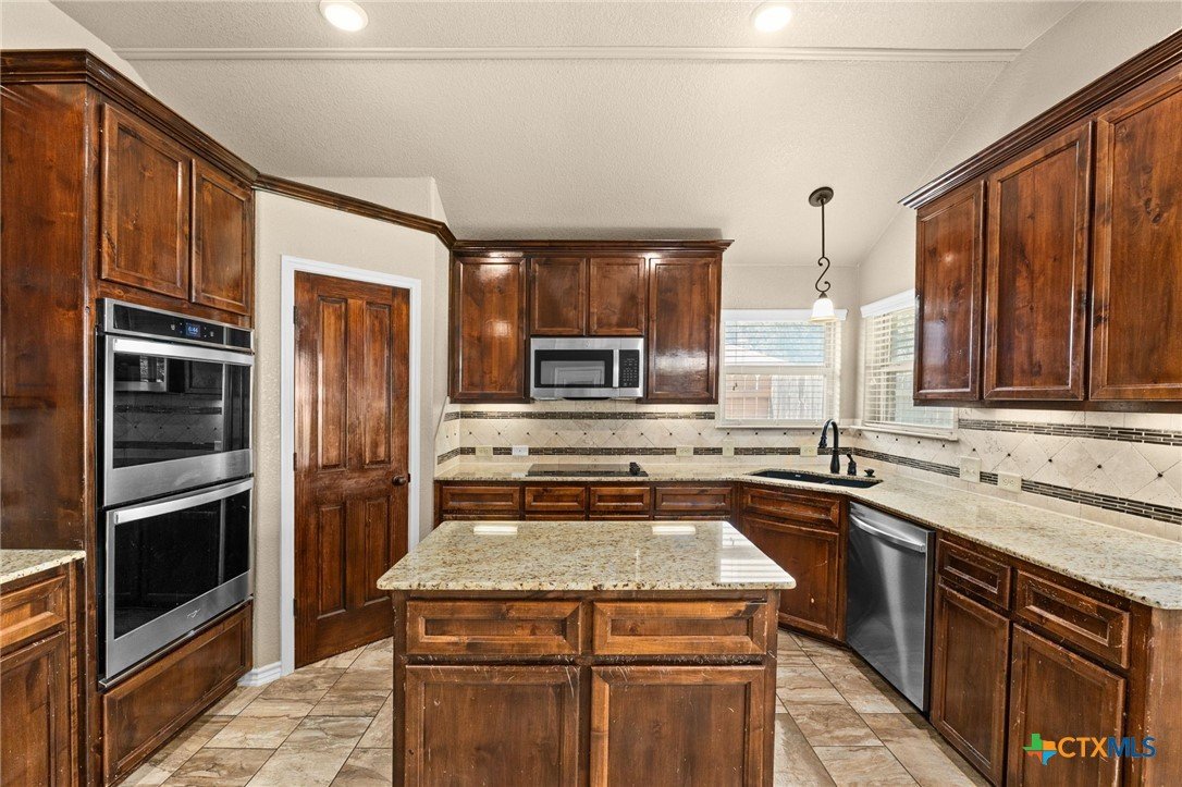 3.99% assumable rate! This beautifully designed four bedroom, two and half bath home blends classic style with today’s modern upgrades, to include a brand new roof & back privacy fence (2025). This home offers generous room sizes and exceptional entertaining spaces. Step into the spacious living room, complete with a cozy corner stone fireplace and double tray ceiling enhanced by soft mood lighting. The chef’s kitchen is a true highlight, featuring granite countertops throughout, a large center island, tiled backsplash, under-cabinet lighting, and stainless steel appliances to include double ovens. The secluded master suite is a luxurious retreat with its own tray ceiling and built-in mood lighting. The spa-like bathroom offers his-and-hers walk-in closets, dual vanities on separate sides, an oversized jetted tub, and a LARGE walk-through shower with dual shower heads. Every bedroom & closet in this home is a great size giving you the comfort and flexibility you’ve been searching for. Step outside to a large covered patio overlooking the huge flat yard with a sprinkler system—perfect for gatherings, play, or relaxation. You will also love the large three car garage , Manicured lawn, walking distance to schools, The dishwasher/microwave are less than a year old, HVAC recently serviced, and living in one of the most highly desirbled neighborhoods, not only in Harker heights but the Fort. Hood area! New carpet 9/27 (never lived on!)