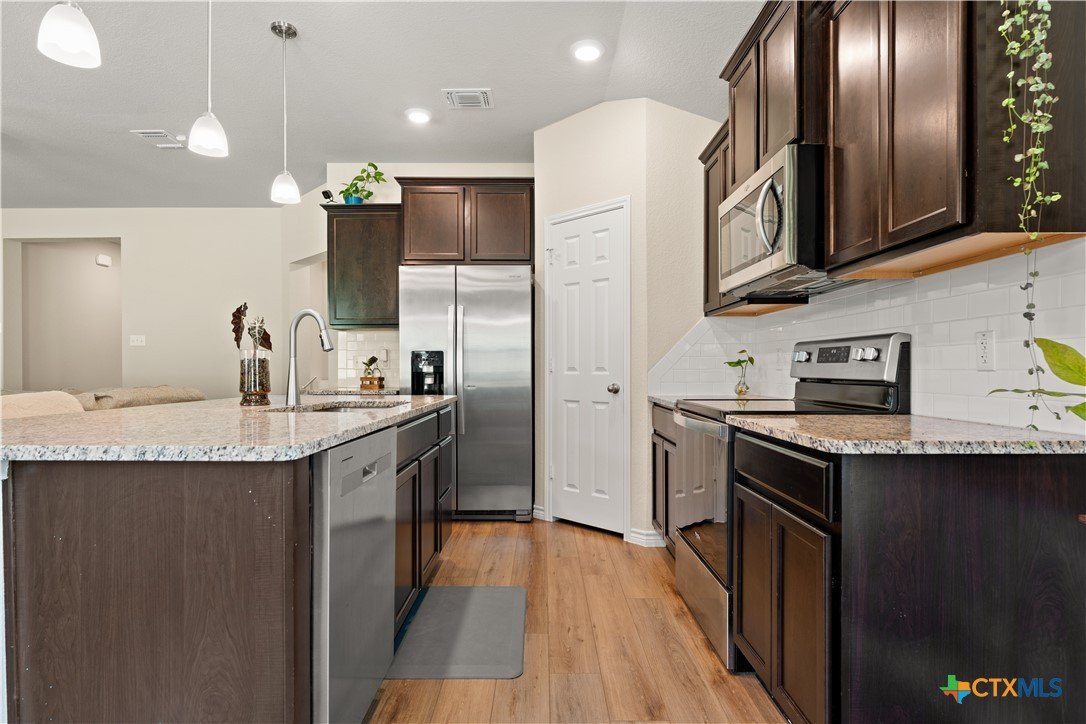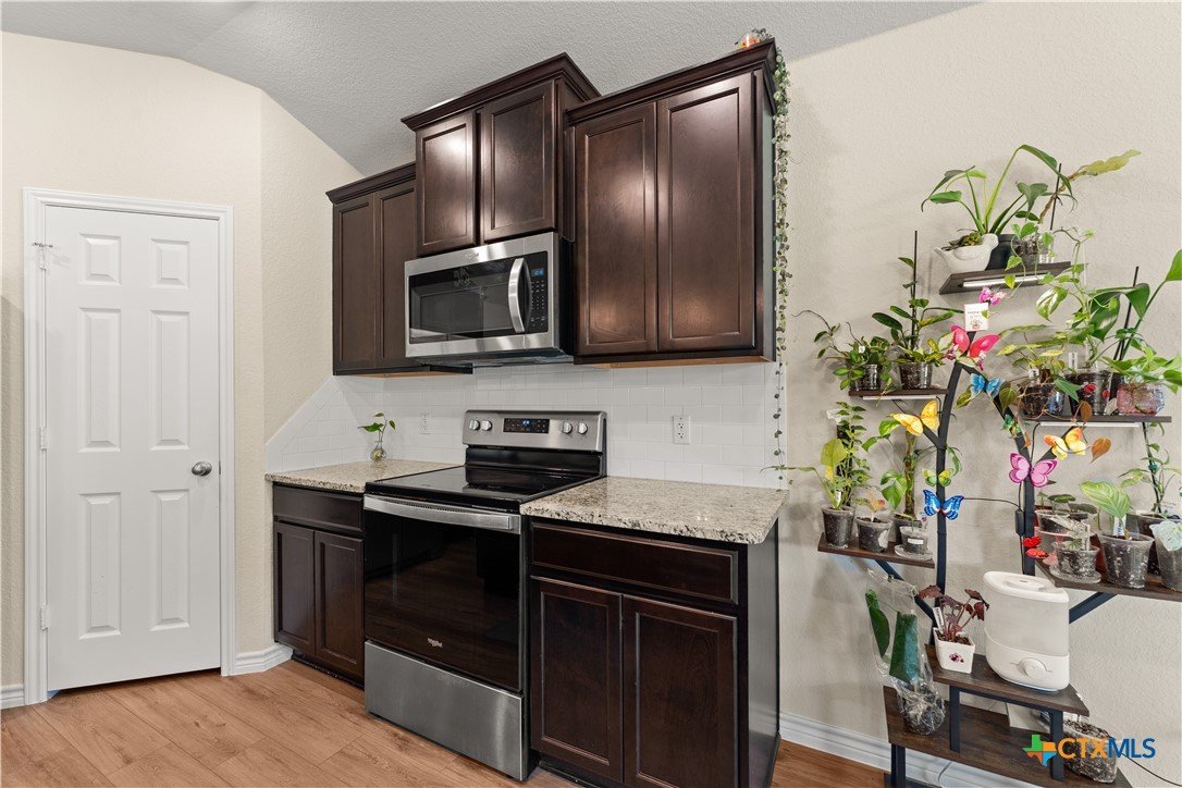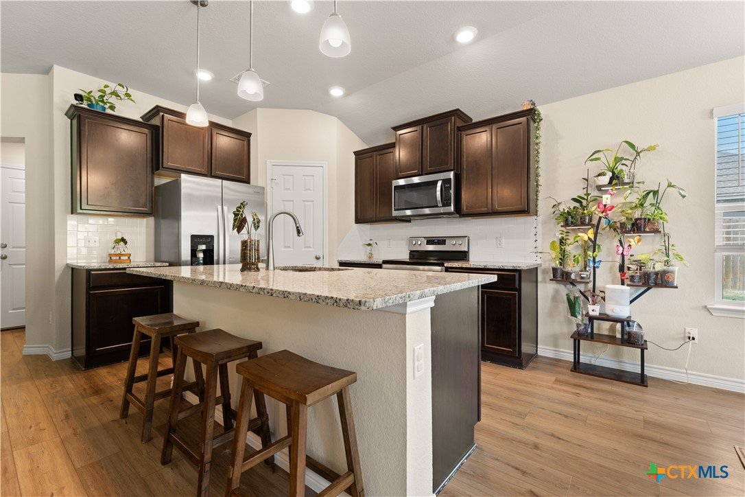 VA eligible? Ask about the assumable loan with a low interest rate on this amazing home—an incredible opportunity.This well-kept 3-bedroom, 2-bath home backs to a peaceful greenbelt with no rear neighbors—providing scenic tree views and added privacy. It’s within walking distance to the elementary school, yet far enough to enjoy quiet surroundings. Inside, all bedrooms include walk-in closets, and there’s no carpet throughout most of the home for low-maintenance living. The oversized 3-car garage offers plenty of space for vehicles, storage, or a workshop.