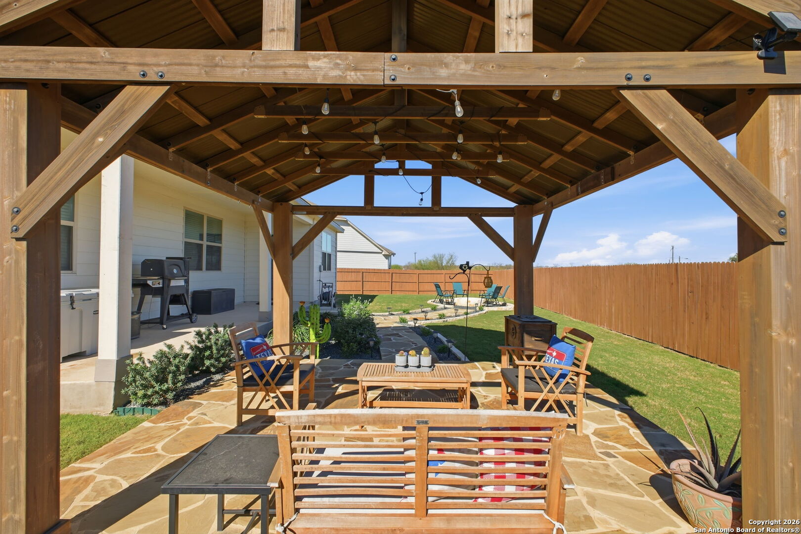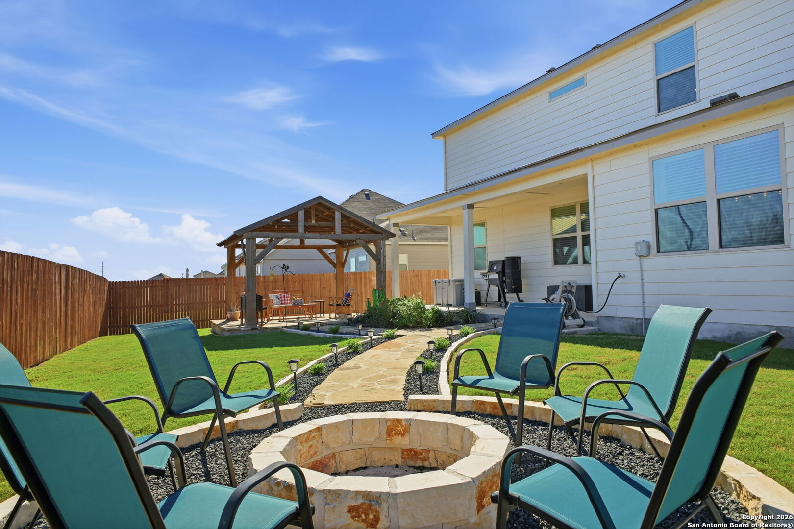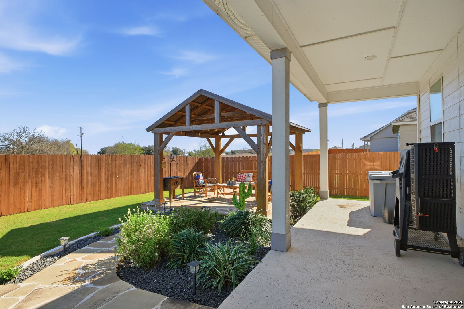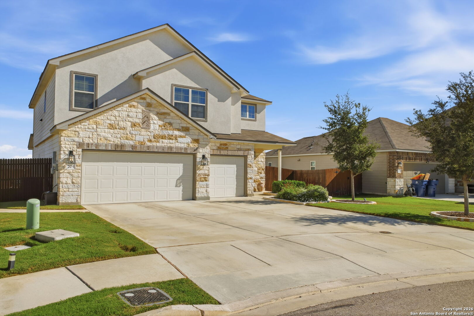 *This home offers an assumable VA loan at an incredible 4.125% interest rate, a rare opportunity in today's market!!* Welcome to 205 Pudu Trail in Cibolo, a true showstopper that blends modern design, thoughtful upgrades, and exceptional pride of ownership. This beautifully maintained 2022 View home stands apart from others in the neighborhood thanks to a long list of curated enhancements both inside and out. From the moment you arrive, you'll notice the professionally landscaped front yard, premium lot and extended concrete driveway, adding both curb appeal and everyday convenience. Step inside to an open-concept living space designed for effortless entertaining, featuring a spacious kitchen with granite countertops, a large island, select upgraded light fixtures, and no carpet downstairs for a clean, modern look and easy maintenance. The entryway makes a lasting impression with a charming beaded-board ceiling, while designer wainscoting in the bathrooms adds warmth and sophistication throughout the home. A functional mudroom with built-in storage and hooks keeps daily life organized and clutter-free. The outdoor space is where this home truly shines. Enjoy professionally landscaped front and back yards, a covered patio, and a custom flagstone walkway that leads to a stunning, professionally built fire pit and beautiful pergola, creating the perfect setting for entertaining, relaxing evenings, or gathering with friends and family. A thoughtfully added sidewalk provides added convenience when moving trash bins, a small detail that makes a big difference in everyday living. Additional highlights include an oversized laundry room with abundant cabinetry and storage, enhancing both functionality and convenience. Ideally located just minutes from Randolph Air Force Base, this home is perfect for military relocation buyers seeking comfort, style, and a quick commute. With tasteful upgrades, intentional design choices, and inviting indoor and outdoor spaces, 205 Pudu Trail is more than move-in ready, it's a home that feels special the moment you walk through the door.