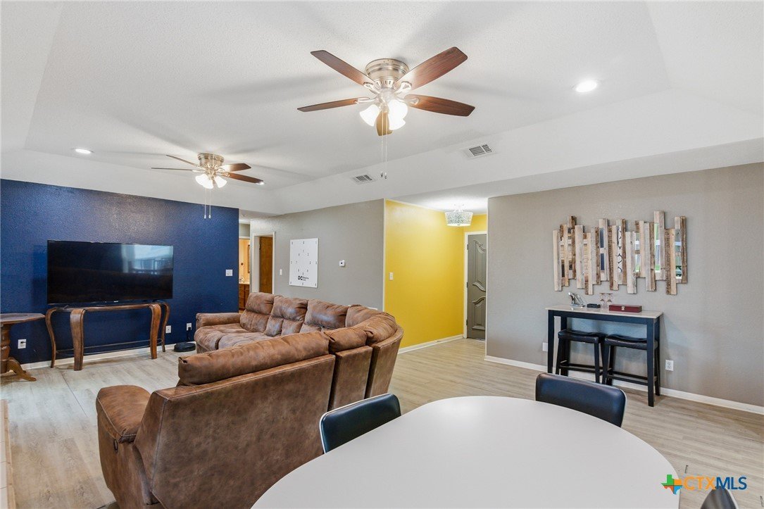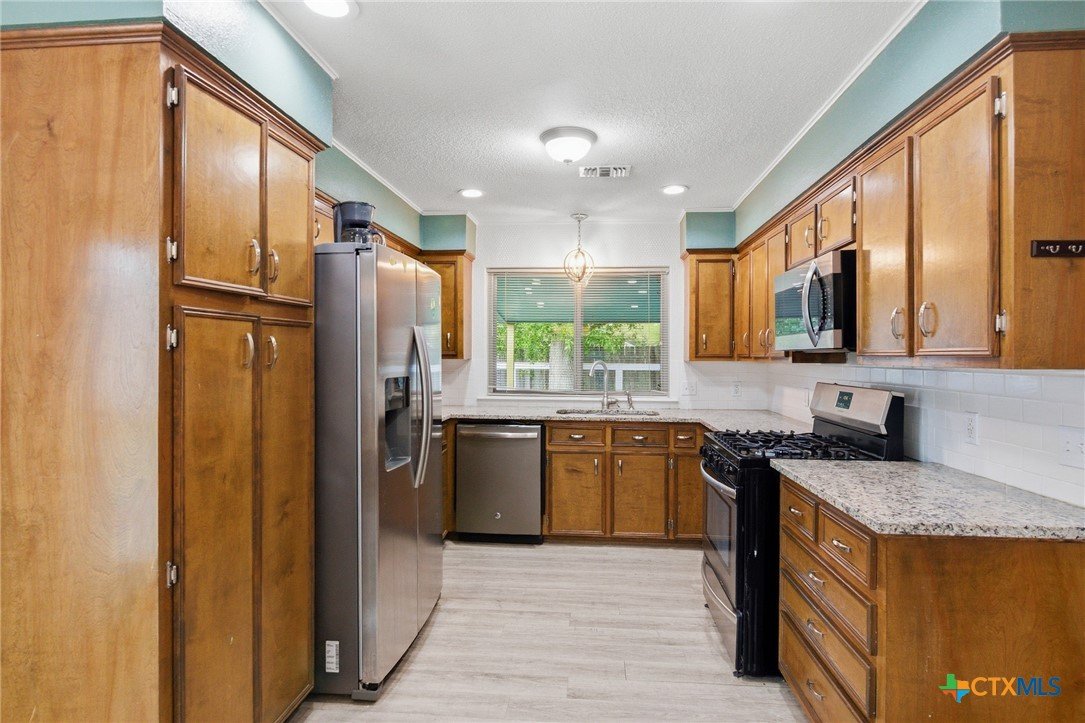 Welcome to this beautifully maintained home nestled in a highly desirable neighborhood, offering 4 bedrooms and 2.5 baths with a warm and inviting layout perfect for everyday living and entertaining. The cozy living room features a charming fireplace with a newer mantel, creating the perfect focal point, while newer interior paint, recessed lighting, and newer windows throughout add a fresh, updated feel. The home also features all-new indoor outlets and an upgraded main electrical panel with a 50-amp generator interlock, ready for a buyer to add a generator. The spacious primary suite offers a relaxing retreat complete with a stylish barn door, and the laundry room conveniently includes a half bath. Additional updates include a newer water heater and garage door openers. Step outside to enjoy a covered patio overlooking the backyard with a storage building and beautiful mature trees. The front yard is perfectly illuminated at night with four charming light posts and under-eave lighting. Centrally located, this home provides easy access to shopping, schools, and dining, making it an ideal place to call home. Spring is here, and so is your perfect home—don’t miss out, schedule your showing today!