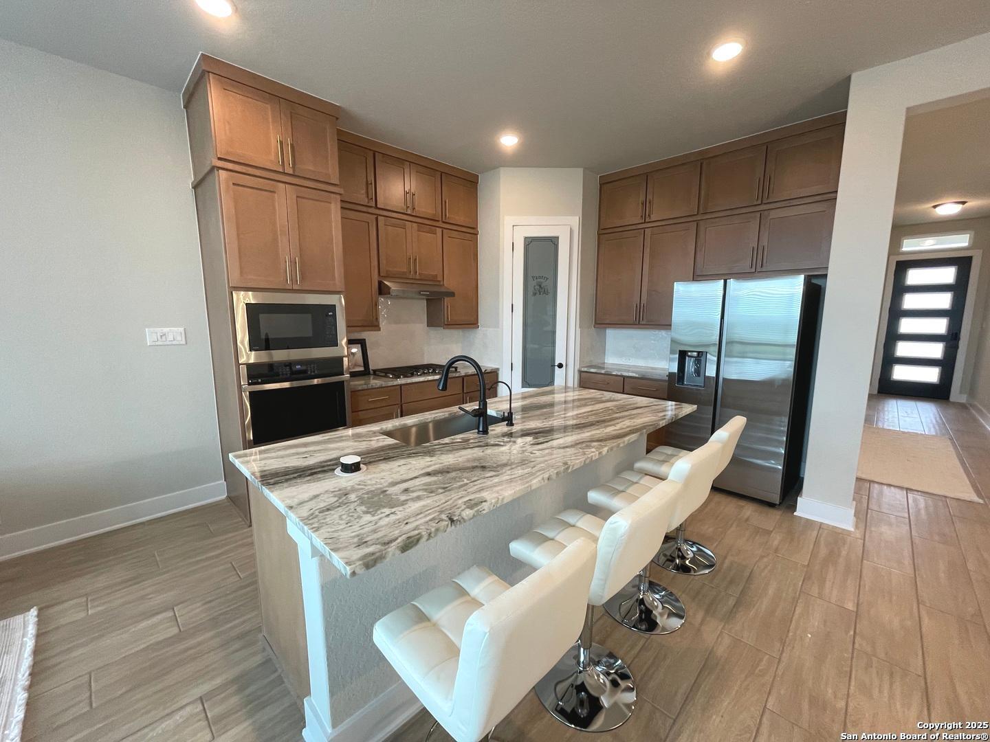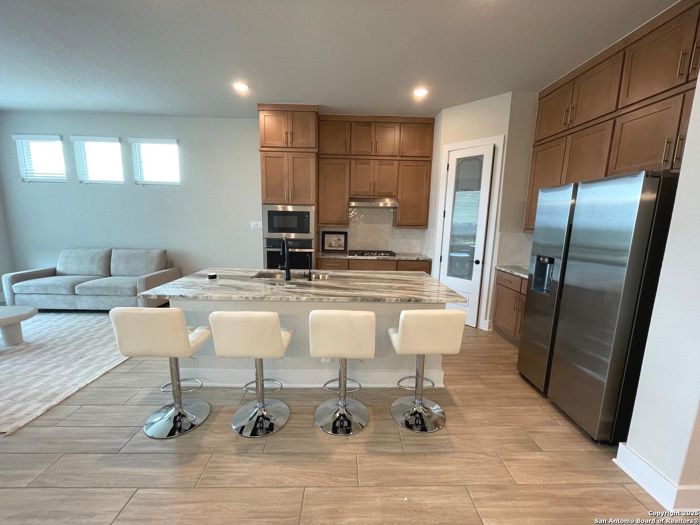 Available now! Brand-new, elegant four-bedroom, three-bathroom home located in the heart of Stone Oak at Centero. This residence features high-end finishes, including light wood cabinetry with gold hardware, stainless steel appliances, and a gas range in the kitchen. A refrigerator is also included, and the living room is equipped with a modern built-in fireplace. Brand-new furnishings are provided, though they can be removed if preferred. The spacious kitchen includes a large island, and the master suite is conveniently located on the ground floor, offering a walk-in shower, double sinks, and a generously sized closet. For added convenience, the home is equipped with a water softener, washer, and dryer. Upstairs, there is a large loft area, an additional bedroom, a full bathroom, and a covered patio.