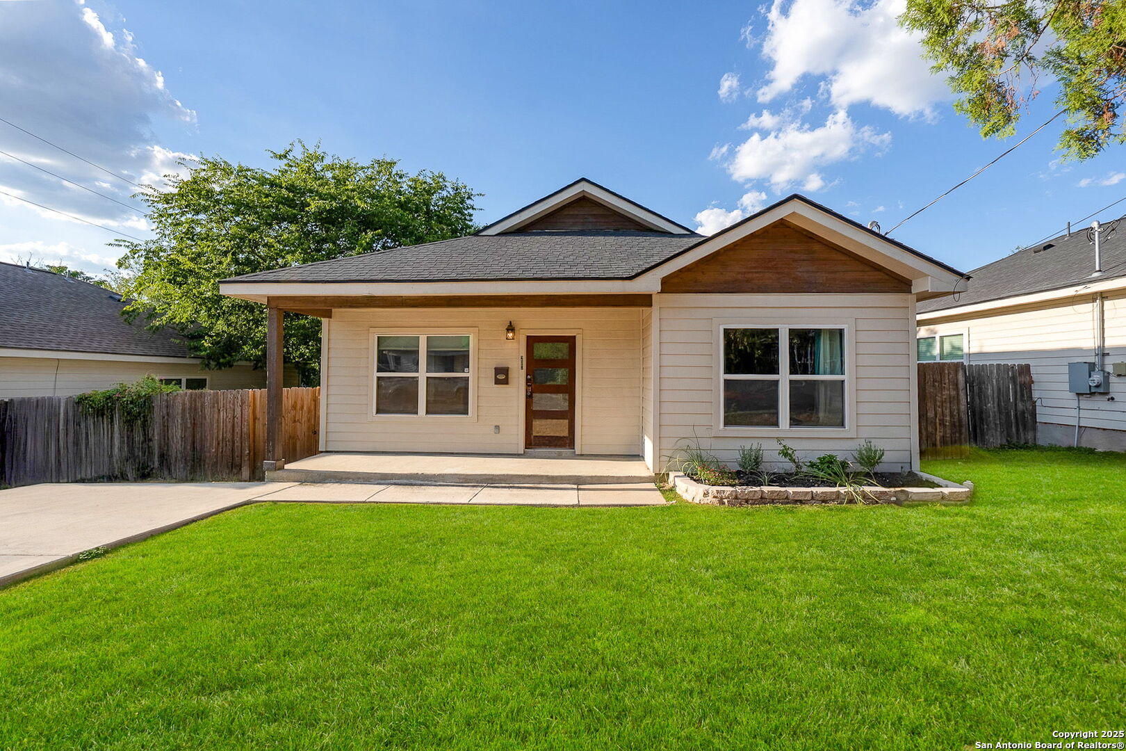 Contemporary Home built in 2020 in Denver Heights, just minutes from downtown! This beautifully maintained single-story residence captures the neighborhood's historic charm while offering the modern comforts of a new construction home. The open-concept design showcases a stylish kitchen with granite countertops, subway tile backsplash and stainless steel appliances. Stained concrete floors and no carpet throughout provide a sleek, low-maintenance finish and upkeep. The primary suite includes a spacious walk-in closet and a custom-tiled shower. But the true highlight of this home is private, landscaped backyard - a rare find in Denver Heights. This expansive backyard features a custom built pergola, privacy fencing and plenty of green space - creating the perfect setting for entertaining, gardening or simply enjoying the outdoors. Sprinklers have also been installed to allow ease in yard maintenance. With no HOA and convenient access to parks, trails, and downtown San Antonio, this home presents an excellent opportunity at a great value!