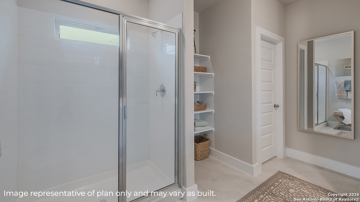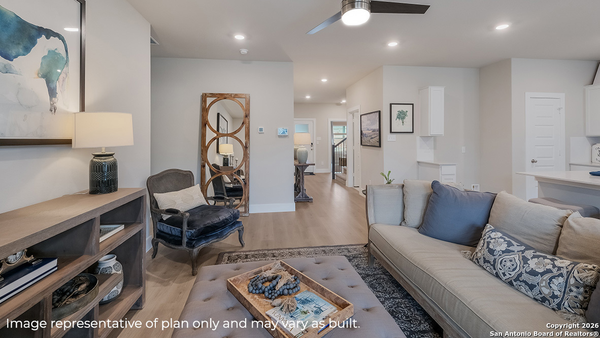 Welcome to The Naples, a gorgeous two-story home located at Brookstone Creek in San Antonio, TX. This floor plan offers 2 classic exteriors and a spacious 2-car garage. An inviting front porch welcomes you inside this 4 bedroom, 3 bathrom home situated across 2293 sq. ft. of living space. Follow the foyer down to an open concept living room, dining nook and kitchen with a spacious corner pantry. Your gourmet kitchen also includes stainless steel appliances, a natural gas cooking range, easy-mainentance quartz countertops and an eat-in kitchen island overlooking the living room. A deep, single basin sink located at the kitchen island makes washing dishes a breeze! A covered back patio (per plan) is located toward the back of the home off the dining area. Take a load off and relax with your loved ones in a fully landscaping and irrigated back yard with Bermuda sod. The primary bedroom is located downstairs off the living room and offers quality carpet flooring, large windows, a ceiling fan and a spacious ensuite bathroom. You'll enjoy dual vanity sinks, stylish shaker cabinetry and a large walk-in closet with tile surround. Your toilet is located through a separate doorway, ensuiring maximum privacy. The primary bedroom walk-in closet is a standout of this floor plan with plenty of storage space. Upstairs you will find an open loft or game room space, perfect for lounging, a third full bathroom and two additional secondary bedrooms. These rooms are versatile and can be set up as offices, home gyms or other spaces. All come complete with carpet flooring and closets. Additional features of The Naples include hard surface flooring at the entry, downstairs, halls, living room, kitchen, and dining/breakfast area, ceramic tile in all bathrooms and utility room, pre-plumb for water softener loop, and faux wood window blinds. Finally, this home includes our HOME IS CONNECTED base package. Using one central hub that talks to all the devices in your home, you can control the lights, thermostat and locks, all from your cellular device.
