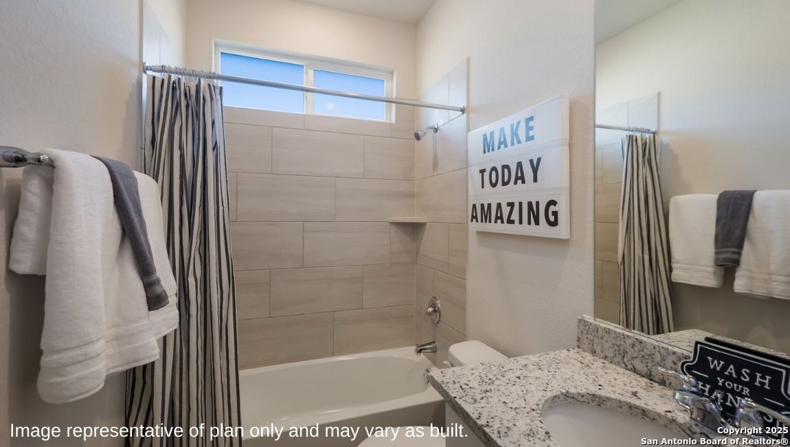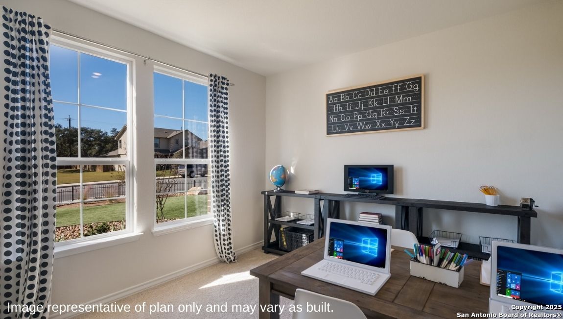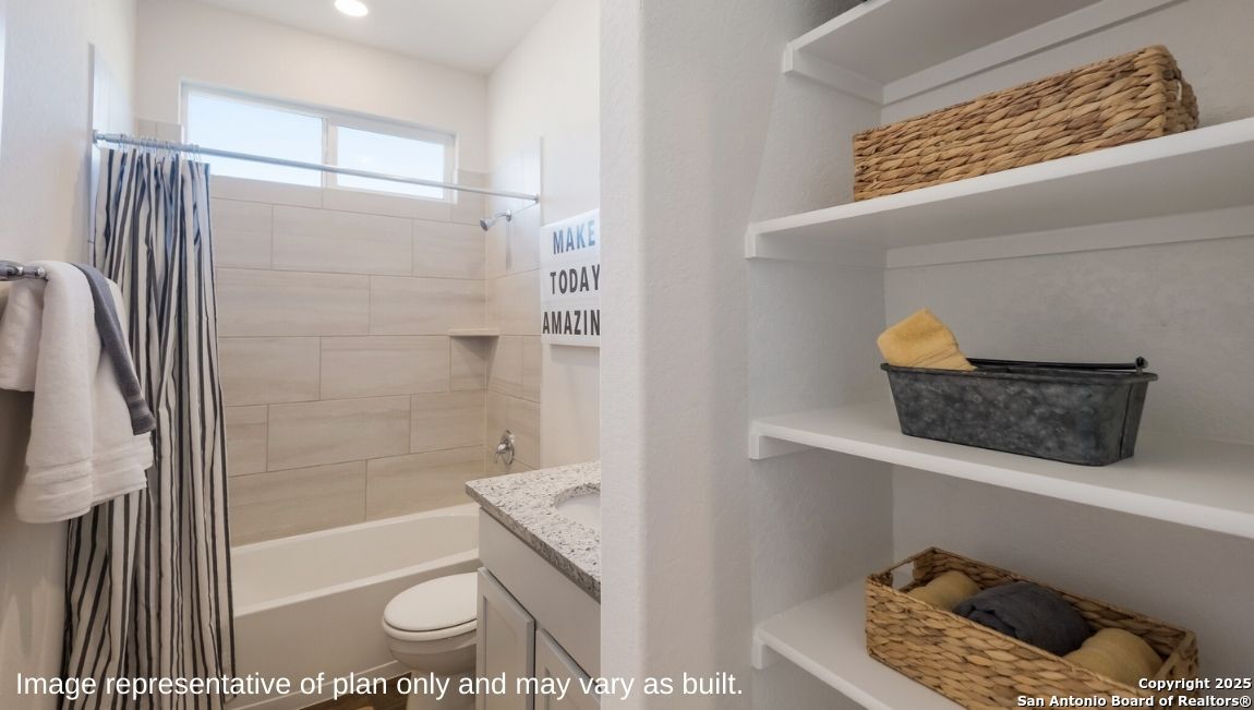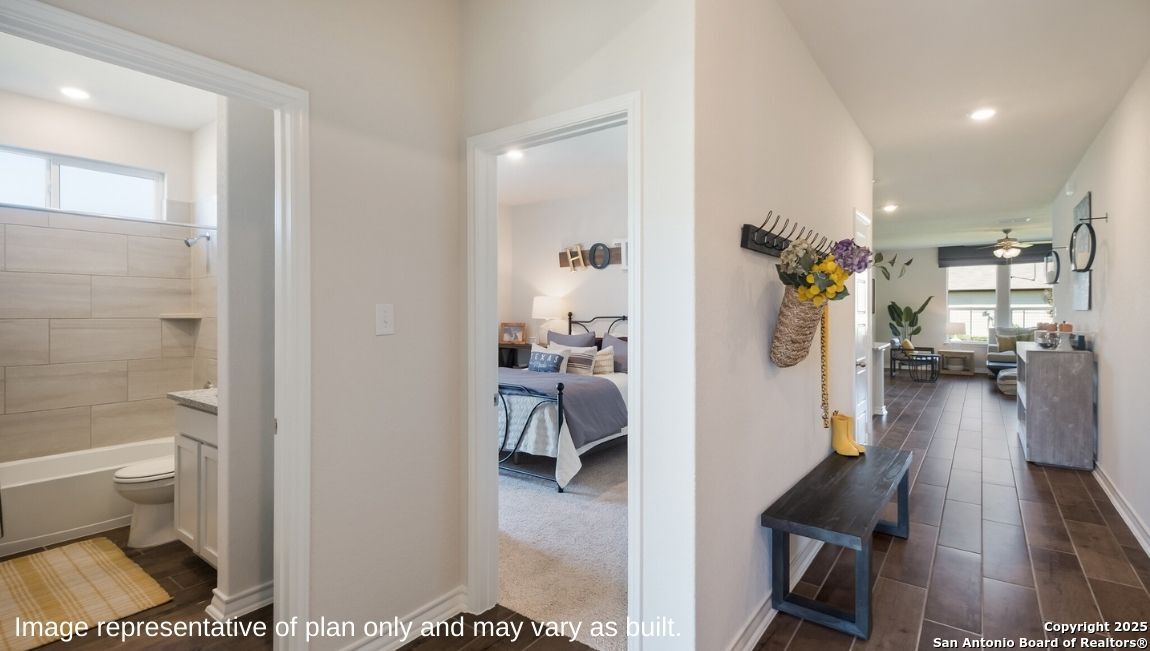 The Irvine is a charming single story home featured in Brookstone Creek in San Antonio, TX. Featuring 2 classic front exterior, this 4 bedroom, 2 bathroom home also offers 1796 square feet of living space and a 2-car garage. A front patio (per plan) welcomes you down a long entry foyer before opening into a blended kitchen, dining, and family room area. The gourmet kitchen features spacious quartz countertops with classic white subway tile backsplash, gleaming stainless steel appliances, a natural gas cooking range, shaker style cabinetry and a corner walk-in pantry. A spacious island with a deep, single basin sink overlooks the living and dining room area. You'll never miss a moment of action with this floor plan layout! Enjoy the private main bedroom suite situated off the living room, featuring quality carpet, a ceiling fan and large windows for abundant natural light. Your ensuite bathroom includes dual vanity sinks with a cultured marble countertop, a tiled walk-in shower and a spacious walk-in closet. Enjoy additional privacy with a separate door for the toilet. Your secondary bedrooms are all located towards the front of the home and feature quality carpet flooring and a closet. These rooms can be used as bedrooms, offices, work out spaces or other bonus rooms! Additional features of this home include, tall nine foot ceilings, pre-plumb for a water softener loop, two inch faux wood blinds throughoutt and hard surface flooring in the kitchen, living room, dining area, bathrooms and utilty room. The Irvine comes with a covered rear patio (per plan) giving view to the professionally irrigated and landscaped yard complete with bermuda sod. You'll enjoy added security in your new home with our Home is Connected features. Using one central hub that talks to all the devices in your home, you can control the lights, thermostat and locks, all from your cellular device.