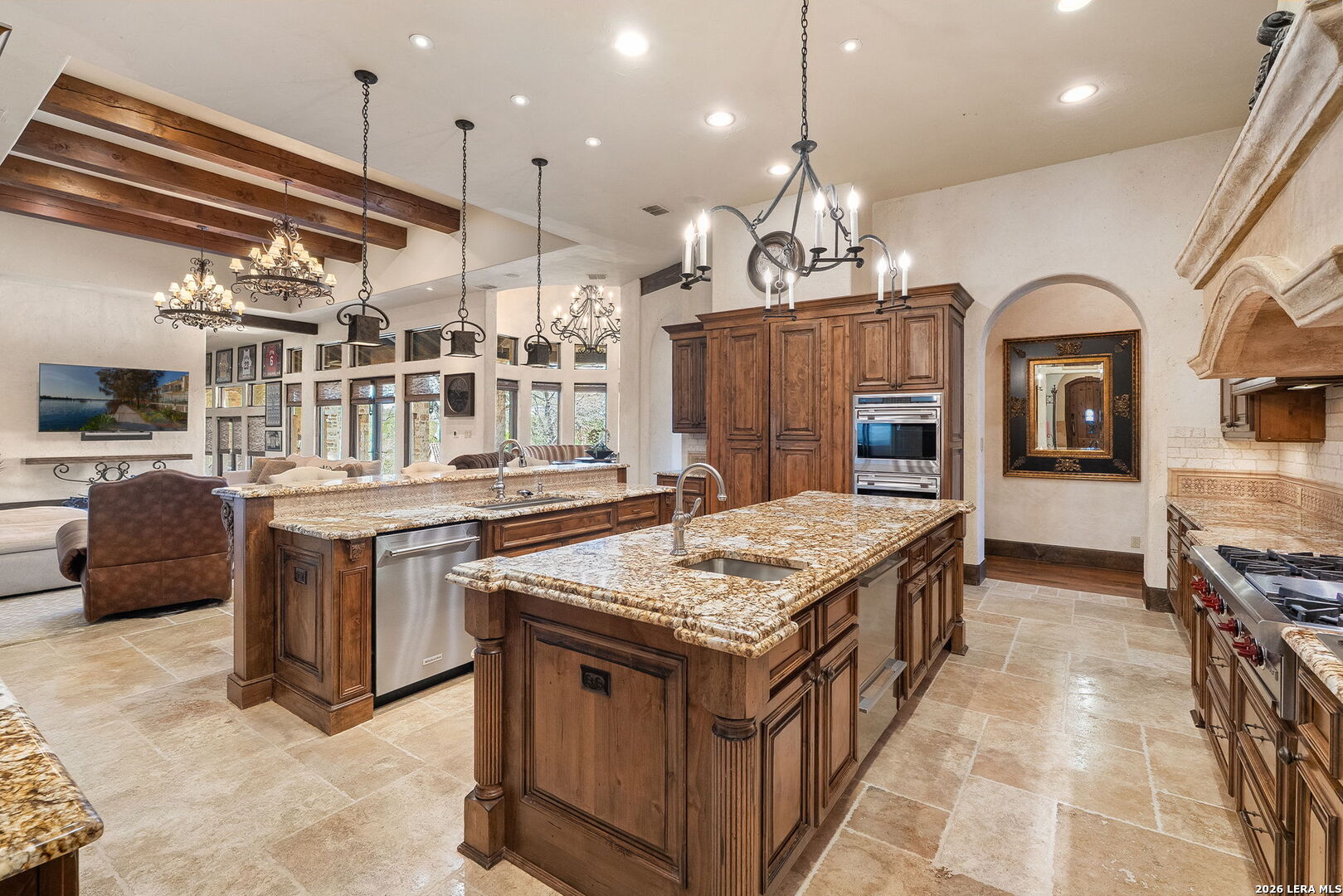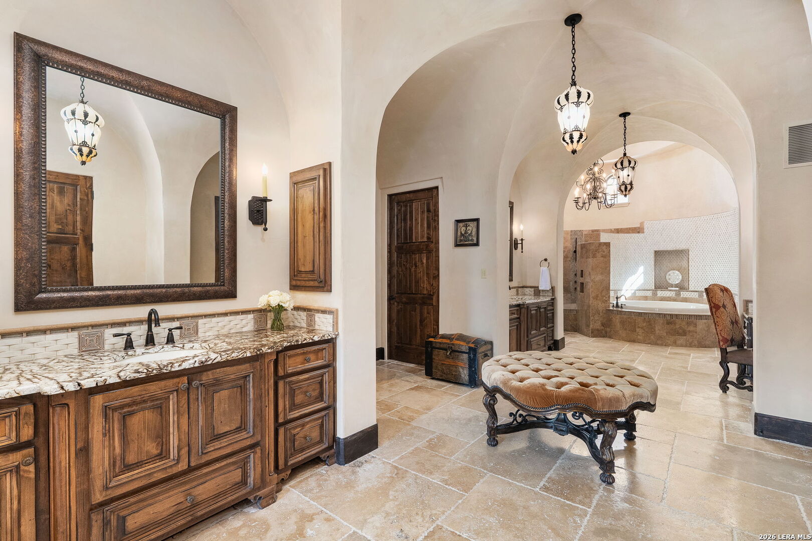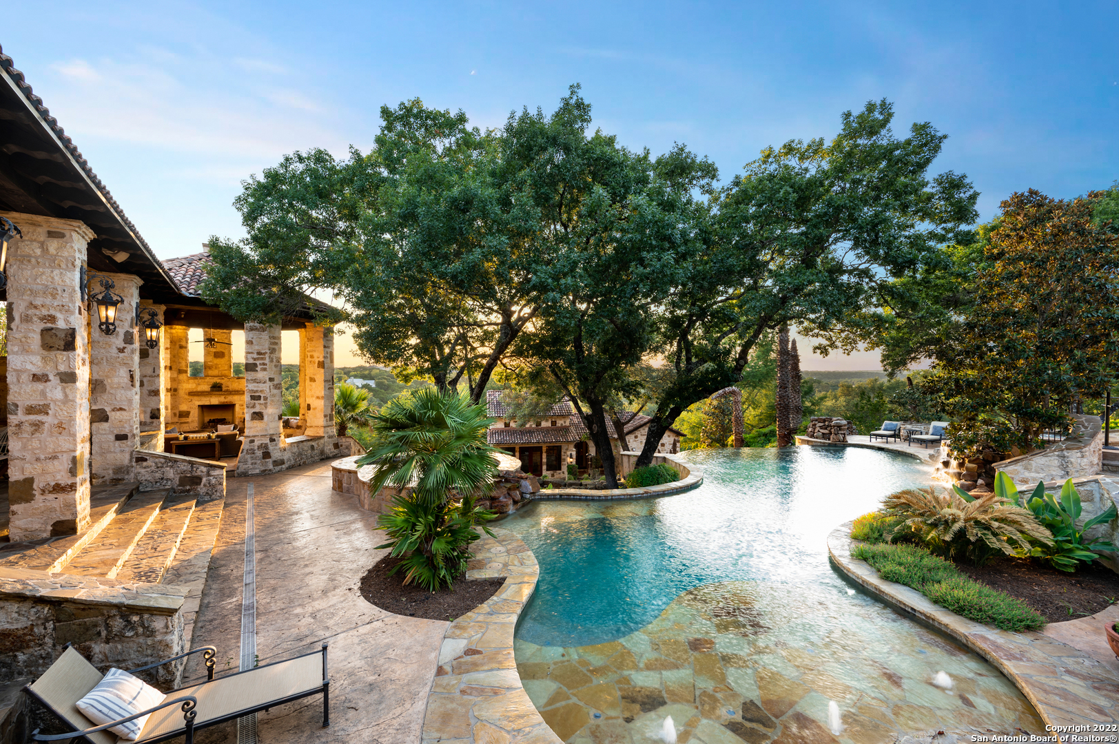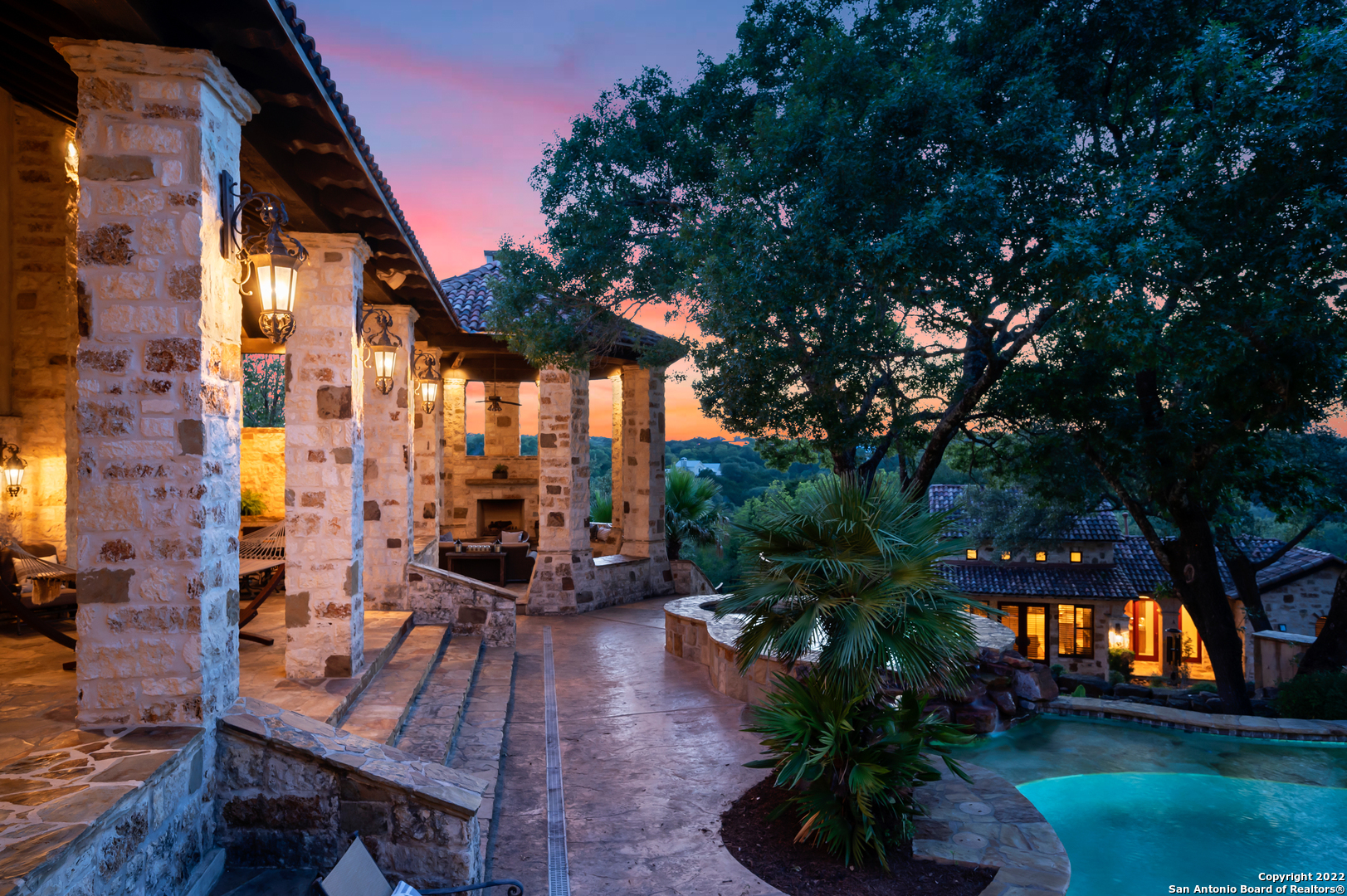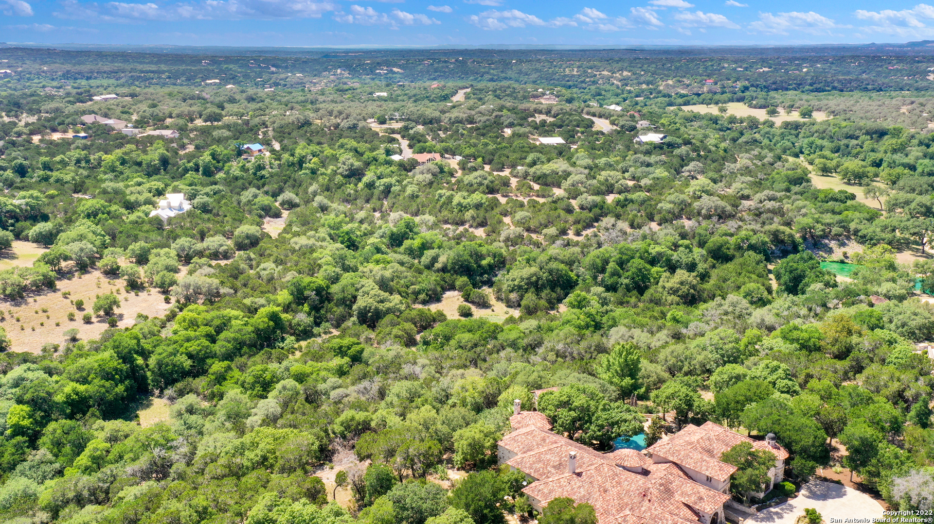 Main Residence: 8549 sq.ft., 4 bedrooms, 4 bathrooms, 2 partial baths. Guest House: 1328 sq.ft., 2 bedrooms, 2 bathrooms, plus a loft. Casita: 965 sq.ft., 1 bedroom, 1 bathroom, 1 partial bath. This custom Mediterranean villa is nestled on 13.85 private acres and features panoramic Hill Country views and the upmost privacy! The entertaining enthusiast will appreciate the elaborate living and dining spaces, which all boasts, floor to ceiling windows, framing some of nature's finest views and creating warm and inviting spaces throughout. A majestic entrance offers a welcoming introduction to the sprawling foyer accented by dual galleries with elegant sconces, slurried brick groined ceiling treatments and stone-cut travertine flooring. The grand dining room is ideal for any scale gatherings and features an eye-catching chandelier and an adjacent butler's pantry. For the culinarian, the commercial kitchen features double islands, upscale stainless steel appliances, an abundance of custom cabinetry and workspace, detailed backsplashes and opens to the captivating great room with a fireplace and superb breakfast nook. Every detail throughout the interior is carefully designed and masterfully finished, from the 13 ft. custom entry doors to a lavish wine tasting or cigar room and a 1,500 plus bottle wine cellar featuring 100+ year old reclaimed wood flooring from a tobacco shed in South Carolina. The owner's wing exudes relaxation and features an elegant spa-infused bath with a steam shower and an exercise room, allowing you to experience spa treatments everyday without leaving home. When it's time to watch your favorite sporting events or movies retreat to the impressive billiards room! There is no need to leave your home when you have your own billard's room. The impressive features 4 television screens plus a projector. The well equipped bar is complete with a sink, beverage cooler and beer tap, dishwasher and ice maker. The private study and secondary bedroom suites, complete the timeless interior. The heart of this property are the well-executed outdoor tiered living areas, which cohesively blend manicured lawns, meandering flagstone walkways and beautiful natural vegetation, to create a true resort-style experience! The outdoor living area - complete with a resort style beach entry pool and dual spas offers the perfect venue for year around entertaining. The expansive covered patio boasts a smoker, grill, fireplace and is surrounded by unsurpassed scenic views of the Hill Country. Your guests will feel at home, while staying in the one-bedroom casita, complete with a living area and kitchenette! The newly two bedroom guest house is equally as impressive as the main residence and boasts all the essential amenities. Appointments include stately arched distressed wood doors, spacious living area, gourmet kitchen, utility room and a sprawling loft! This property was well designed to meet everyone's needs! Even the pets have their own built-in pet shower in the utility room! Come experience refined Hill Country living, within close proximity to the Cordillera Ranch River Park, the Guadalupe River and the Club!
