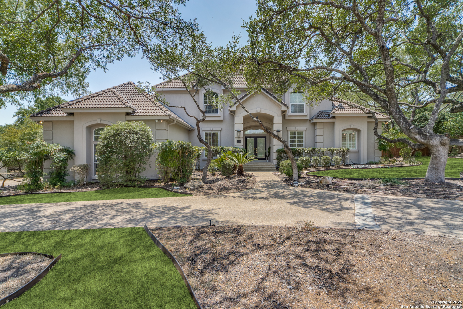 Nestled in the highly sought-after Shavano Creek neighborhood, this exceptional Robert Weiss custom-built residence blends timeless architectural elegance with modern luxury. Surrounded by tree-lined streets and stately homes, this property offers refined suburban living at its finest. From the moment you step through the front door, you're welcomed by a grand foyer that sets the stage for the stylish, contemporary interiors beyond. The spacious living room impresses with soaring ceilings, high-panel windows that flood the space with natural light, and a gas fireplace that serves as the focal point of the room. Ideal for both everyday living and entertaining, the home boasts two dining areas; a formal dining room for special occasions and a breakfast nook with serene views of the beautifully landscaped backyard. The chef's kitchen is the heart of the home, featuring stainless steel appliances, gas cooking, granite countertops, glass tile backsplash, and dual islands offering additional seating and prep space. It opens seamlessly to a comfortable family room, creating a perfect environment for gatherings. The primary bedroom is a private retreat, generous in size and thoughtfully designed for relaxation. The spa-like bath features a tub, glass walk-in shower, dual marble vanities, high-end cabinetry, and a generous walk-in closet. A sophisticated home office with access to a full bath offers flexibility as a potential fourth bedroom. Upstairs, a spacious media/game room and two additional bedrooms flow effortlessly, maintaining the home's cohesive design and charm. Outdoors, enjoy your personal oasis with a covered patio, sparkling swimming pool, and peaceful views of the greenbelt, a perfect setting for entertaining or enjoying time with family and pets. With an immaculate modern design and a prime location in one of San Antonio's premier neighborhoods, this stunning Shavano Creek home is a rare opportunity not to be missed.