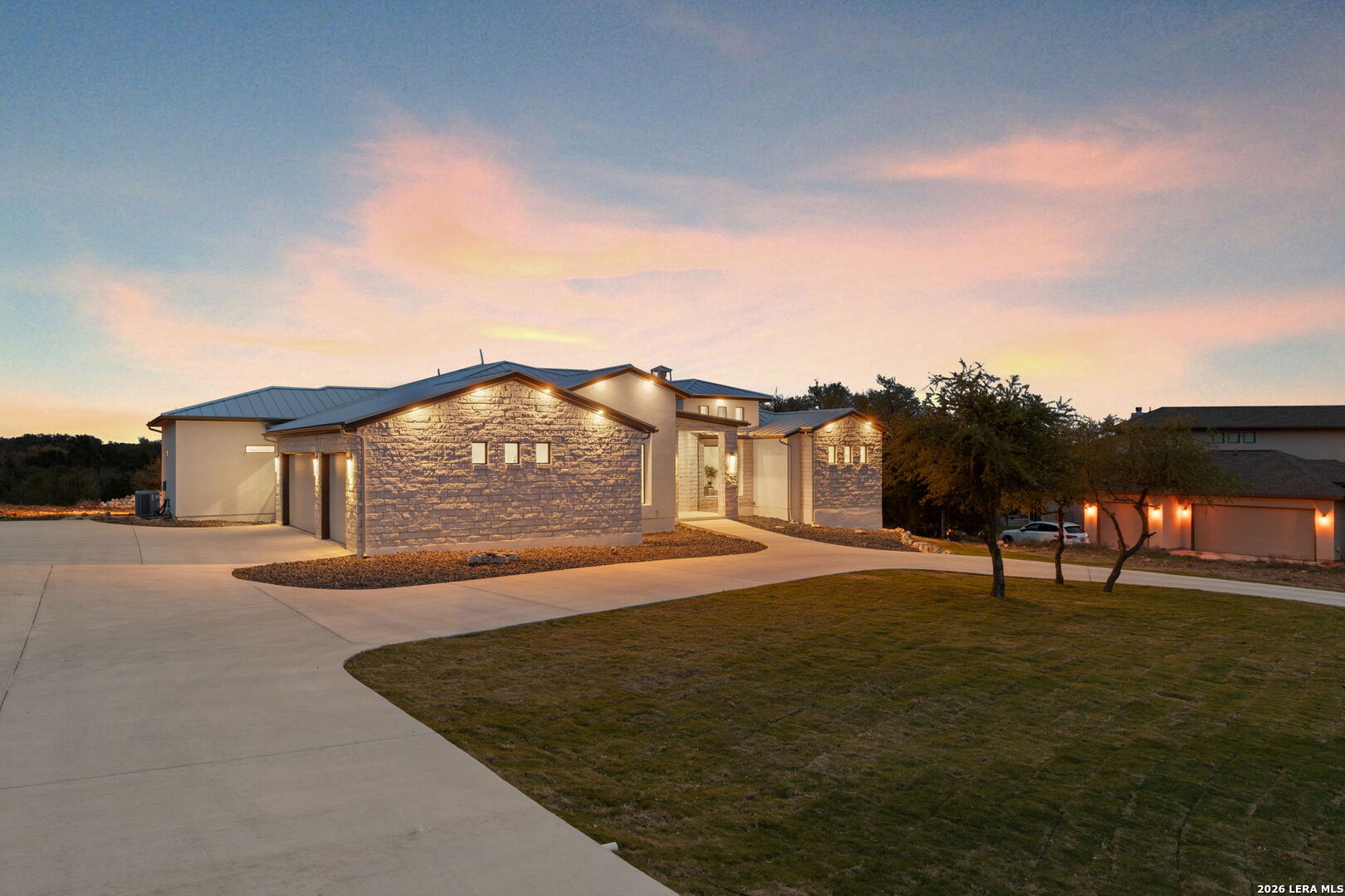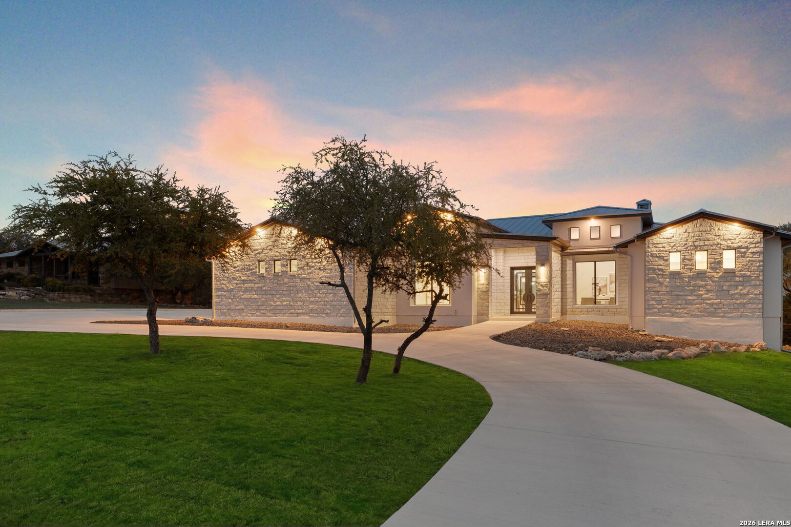 Seller is offering $20,000 in flex cash for buyers to use towards closing costs, rate buydown, landscaping or price reduction**Experience refined Hill Country living in this exceptional single-story residence, nestled on a quiet street in the prestigious Vintage Oaks community, just off Hwy 46 near New Braunfels. Built in 2021, this meticulously crafted home showcases a striking stucco and stone exterior, brand new metal roof, and circular driveway, creating an immediate impression of sophistication. A custom metal and glass front door opens into an expansive open-concept living area, enhanced by high end flooring throughout, vaulted ceilings, floor to ceiling stone fireplace and an abundance of natural light. The gourmet kitchen serves as the centerpiece of the home, appointed with a six-burner gas cooktop, high end stainless steel appliances, built in refrigerator, oversized sink, and a spacious walk-in pantry with plenty of storage space and designated area for a secondary refrigerator. The living area transitions seamlessly to the outdoor entertainment patio with panoramic views of the Texas Hill Country, offering the perfect setting for gatherings or quiet evenings enjoying picturesque sunsets. The primary suite provides a private retreat featuring his and hers vanities, a Texas sized frameless glass rain shower with multiple rainhead shower heads and an expansive walk-in closet. A dedicated office located at the front of the home accommodates today's work from home needs with style and functionality.Four additional secondary bedrooms are situated on the opposite side of the primary providing additional privacy. The oversized three car garage is connected via a practical mudroom, ensuring everyday convenience. Sitting on just over an acre, this property offers ample space and privacy with no rear neighbor in sight. This extraordinary residence embodies the perfect balance of modern luxury and Hill Country charm crafted for those who seek excellence in both design and lifestyle. As part of the Vintage Oaks community, residents enjoy resort-style amenities including a fitness center, clubhouse, private sports courts, baseball field, lazy river, 3 community pools, miles of scenic walking trails, and a calendar filled with social activities. This extraordinary home offers refined Hill Country living at its finest.