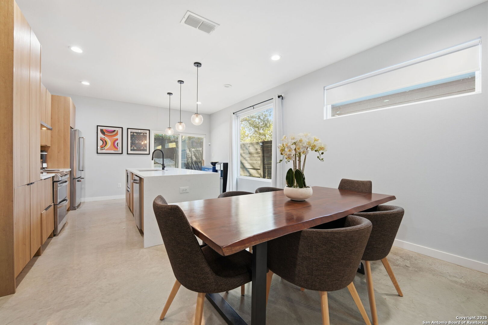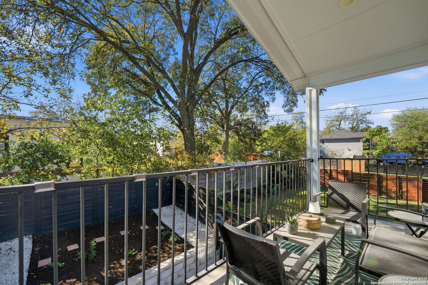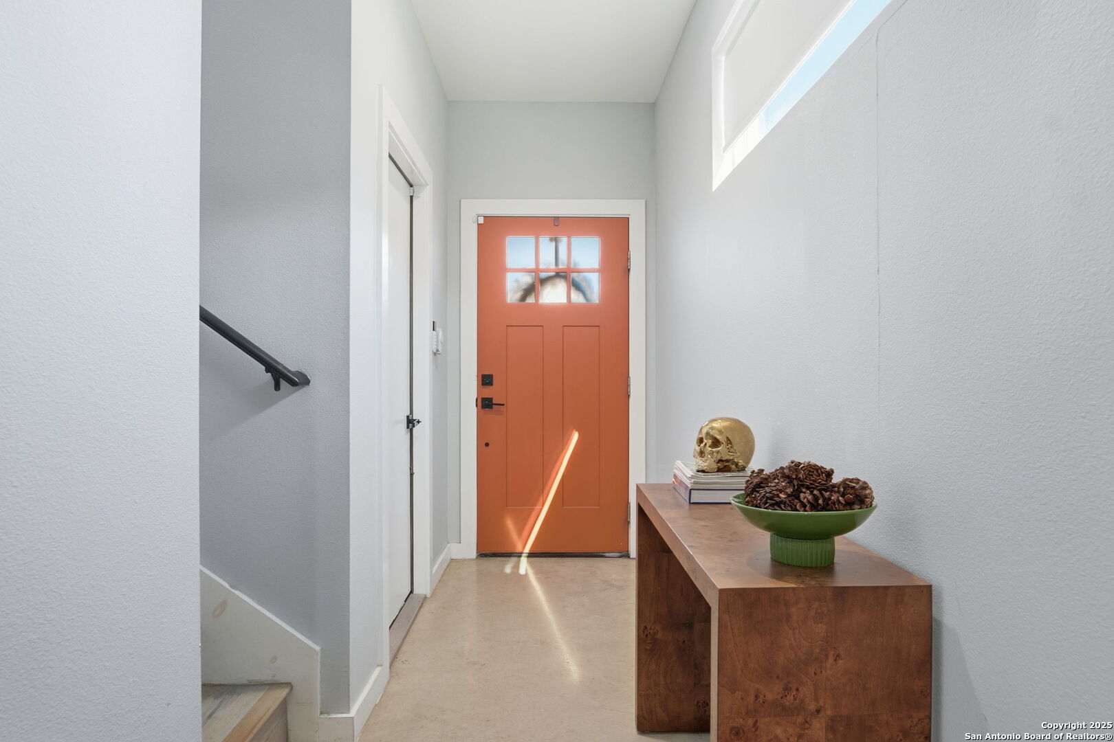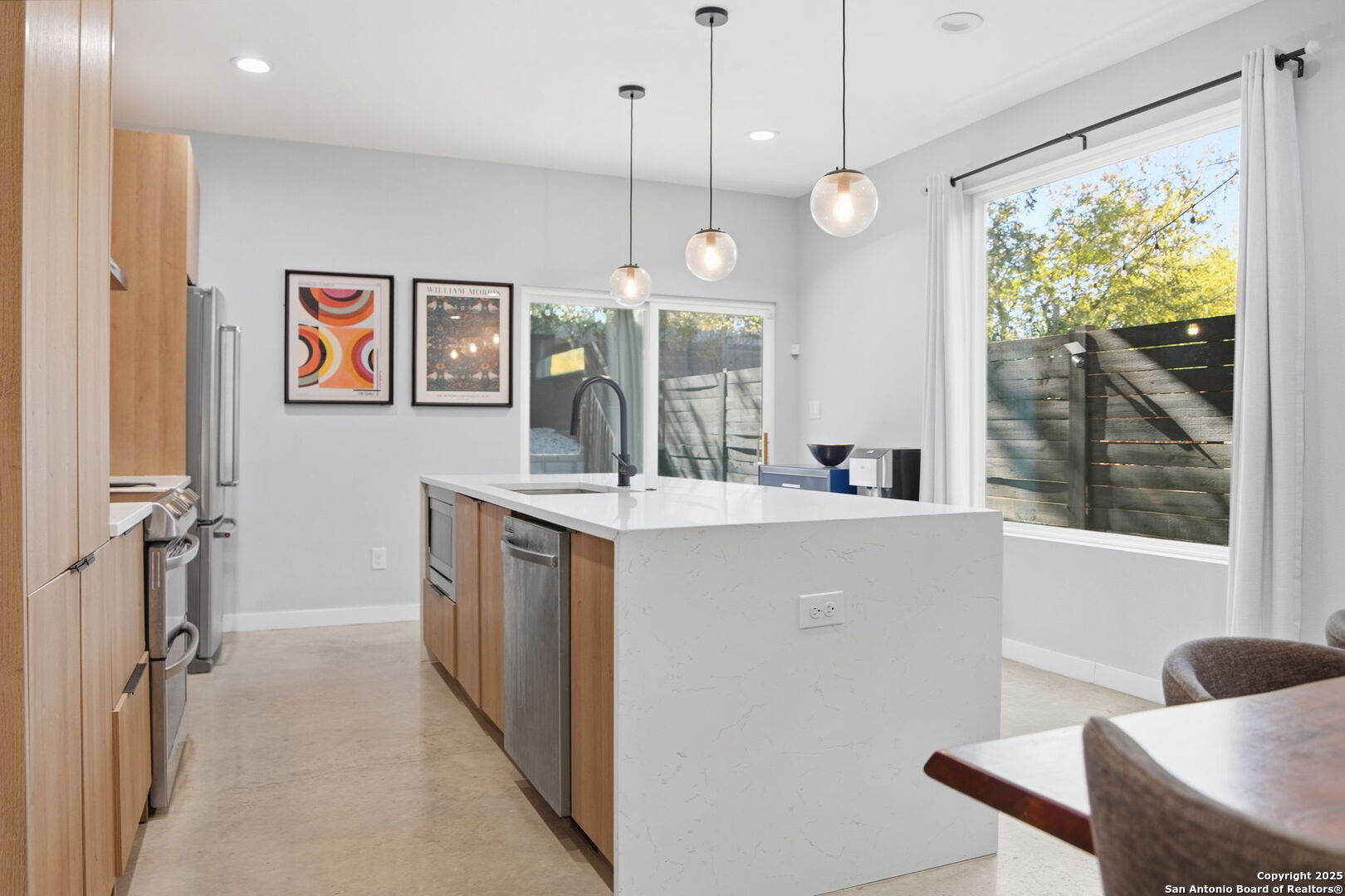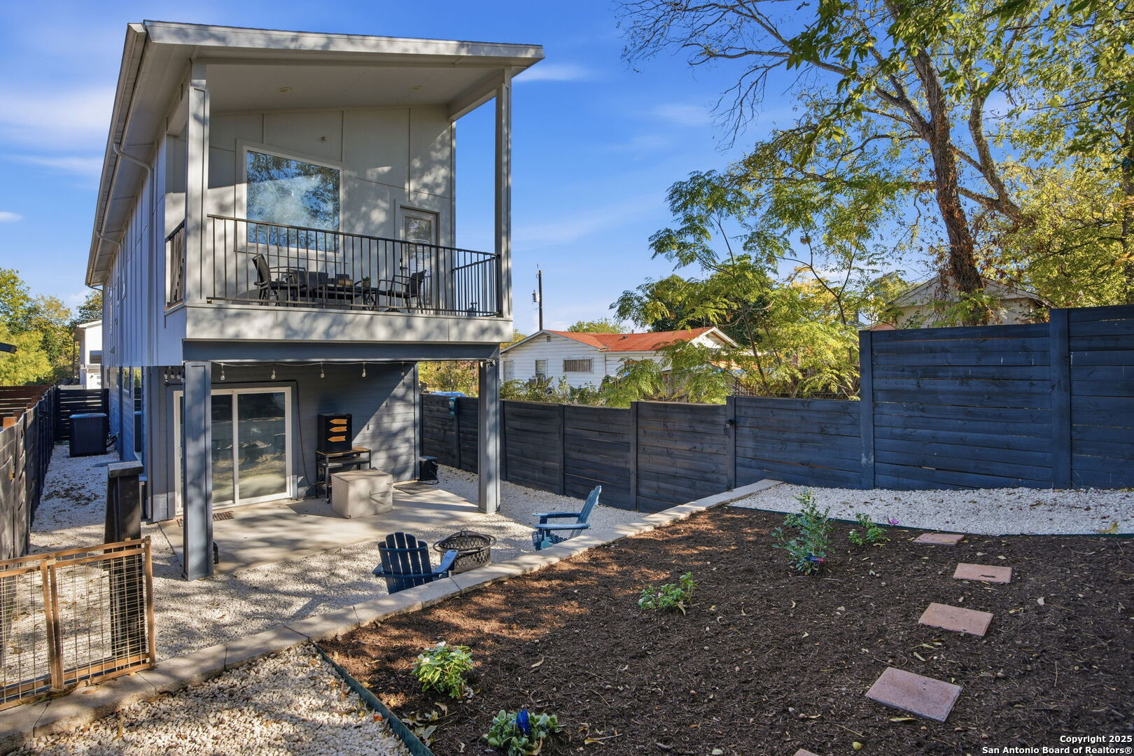 This modern contemporary home blends style, function, and an incredibly convenient location. Stained concrete floors and recessed lighting set a clean and contemporary tone throughout the main living spaces. The kitchen stands out as the centerpiece, offering a striking waterfall island, a comfortable breakfast bar, stainless steel appliances, custom cabinetry, detailed tile accents, and a classic white subway tile backsplash. The layout is designed for practical living, and the upstairs laundry room adds even more convenience with a full-size washer and dryer setup instead of a stacked set up. The primary suite provides a calming retreat with a spa-inspired bathroom featuring a separate shower, a relaxing garden tub, and quartz tile throughout. A customized walk-in closet with built-in shelving maximizes storage, and outside access leads to a private balcony ideal for morning coffee or quiet evenings. The backyard enhances the property with xeriscaping for low-maintenance living and a covered patio that creates a comfortable outdoor area to enjoy or entertain guests. A short drive connects you to Southtown, Downtown San Antonio, Brooks City Base, and Fort Sam Houston, offering effortless access to dining, entertainment, and major destinations. Sellers are willing to offer concessions with a reasonable offer!