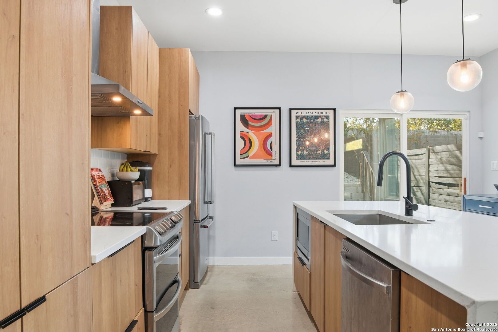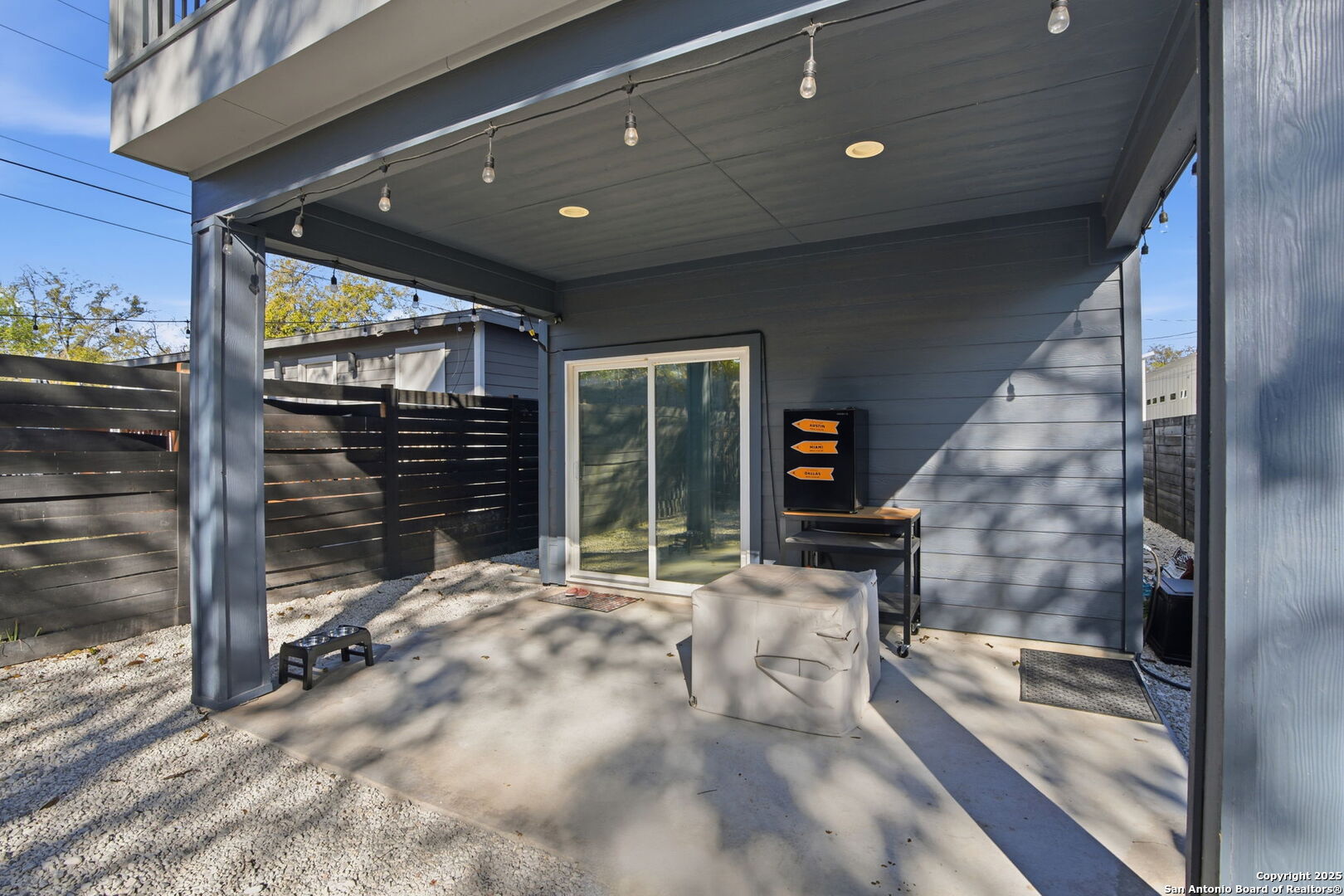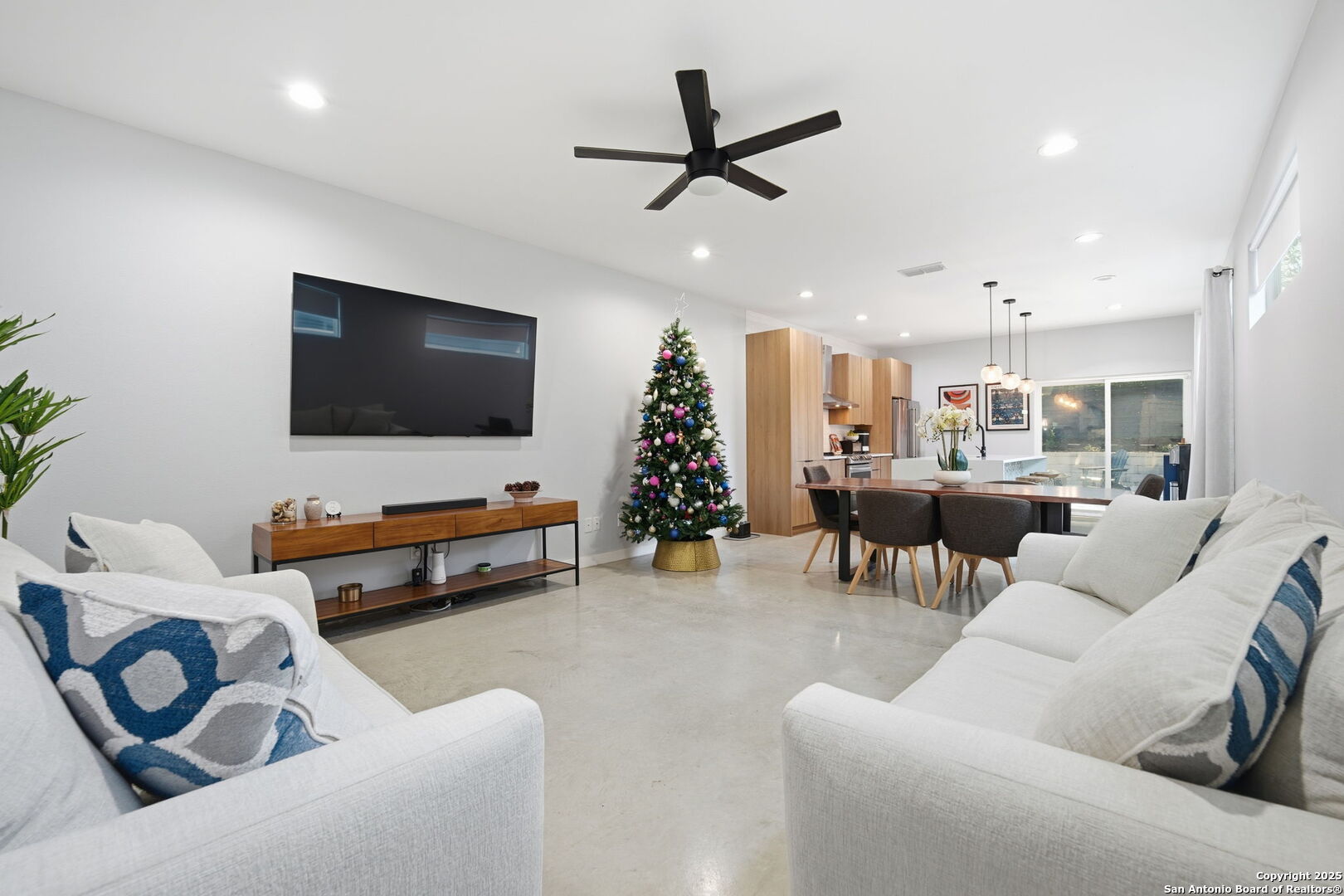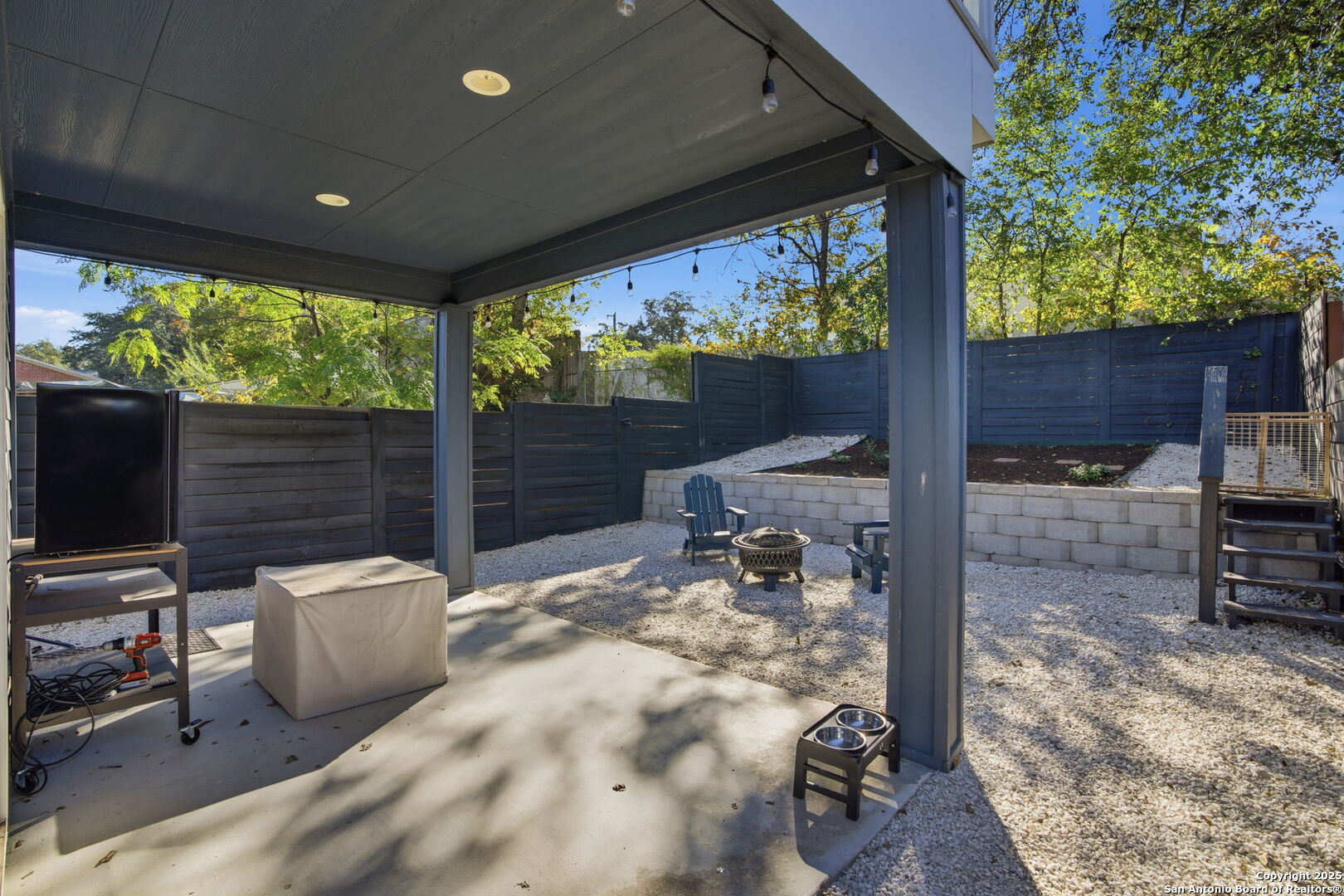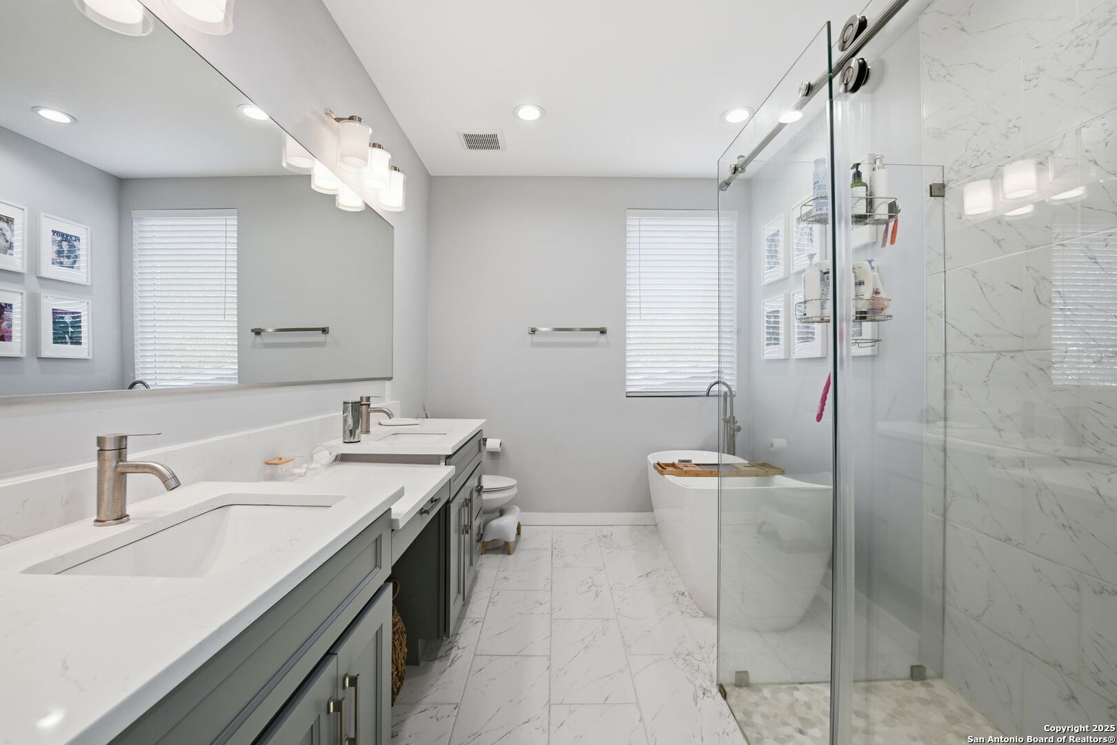 This modern contemporary home blends style, function, and an incredibly convenient location. Stained concrete floors and recessed lighting set a clean and contemporary tone throughout the main living spaces. The kitchen stands out as the centerpiece, offering a striking waterfall island, a comfortable breakfast bar, stainless steel appliances, custom cabinetry, detailed tile accents, and a classic white subway tile backsplash. The layout is designed for practical living, and the upstairs laundry room adds even more convenience with a full-size washer and dryer setup instead of a stacked set up. The primary suite provides a calming retreat with a spa-inspired bathroom featuring a separate shower, a relaxing garden tub, and quartz tile throughout. A customized walk-in closet with built-in shelving maximizes storage, and outside access leads to a private balcony ideal for morning coffee or quiet evenings. The backyard enhances the property with xeriscaping for low-maintenance living and a covered patio that creates a comfortable outdoor area to enjoy or entertain guests. A short drive connects you to Southtown, Downtown San Antonio, Brooks City Base, and Fort Sam Houston, offering effortless access to dining, entertainment, and major destinations. Sellers are willing to offer concessions with a reasonable offer!