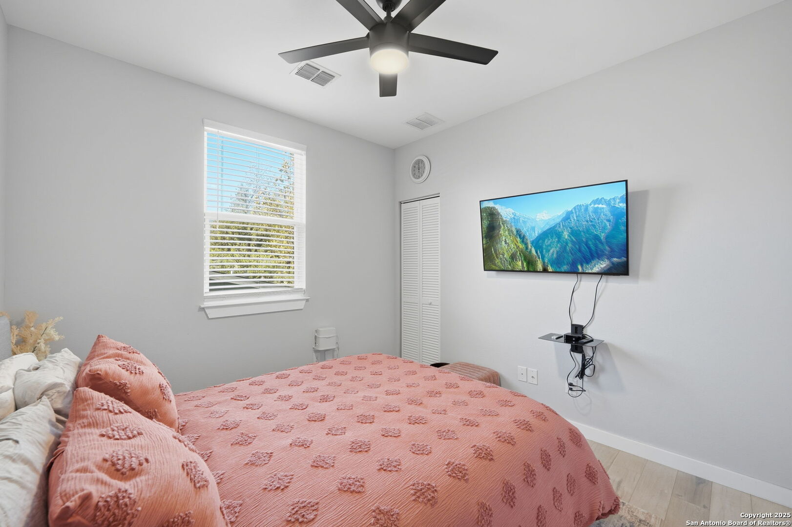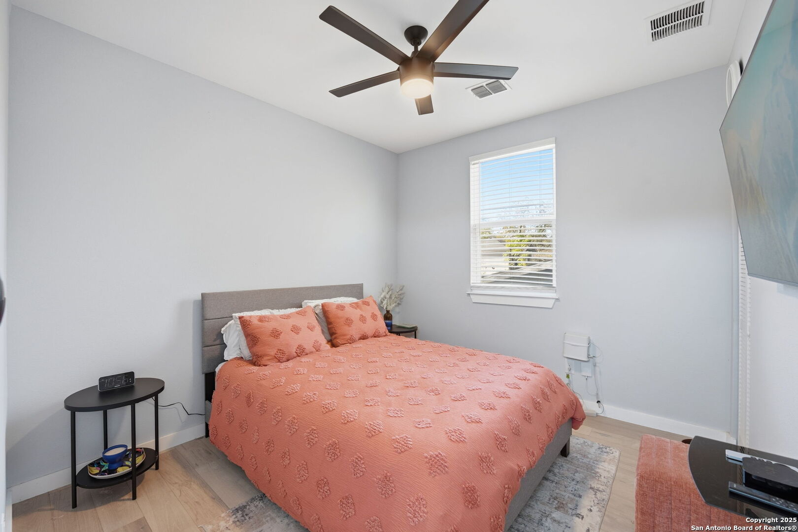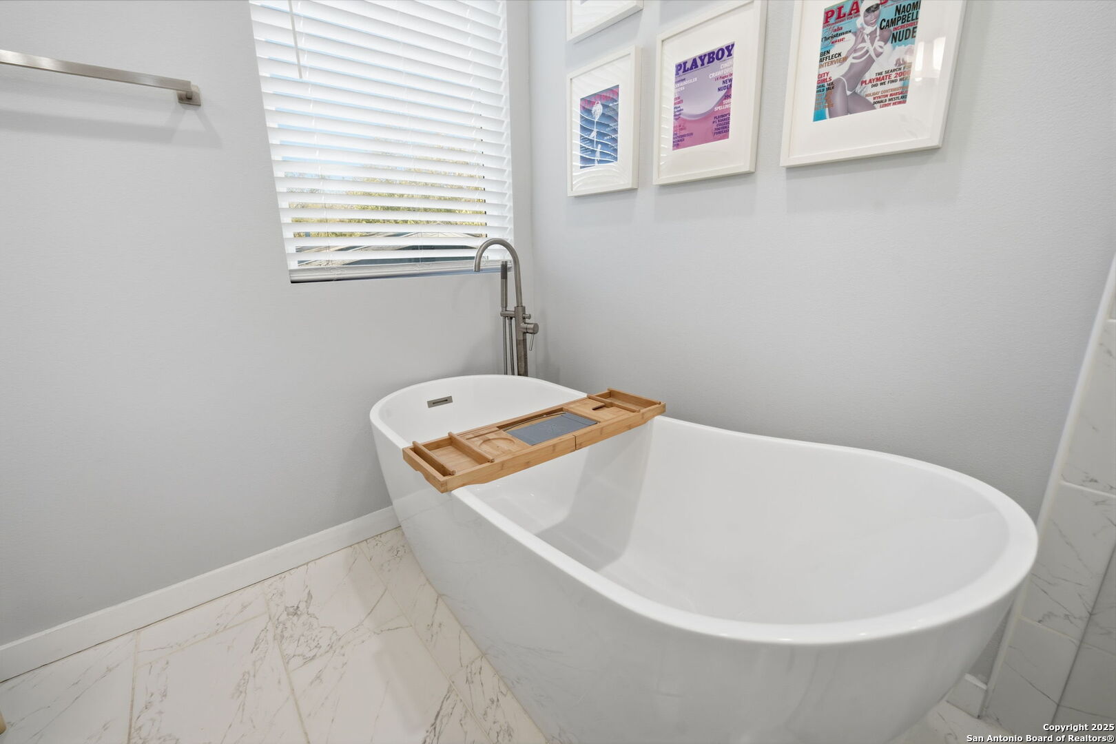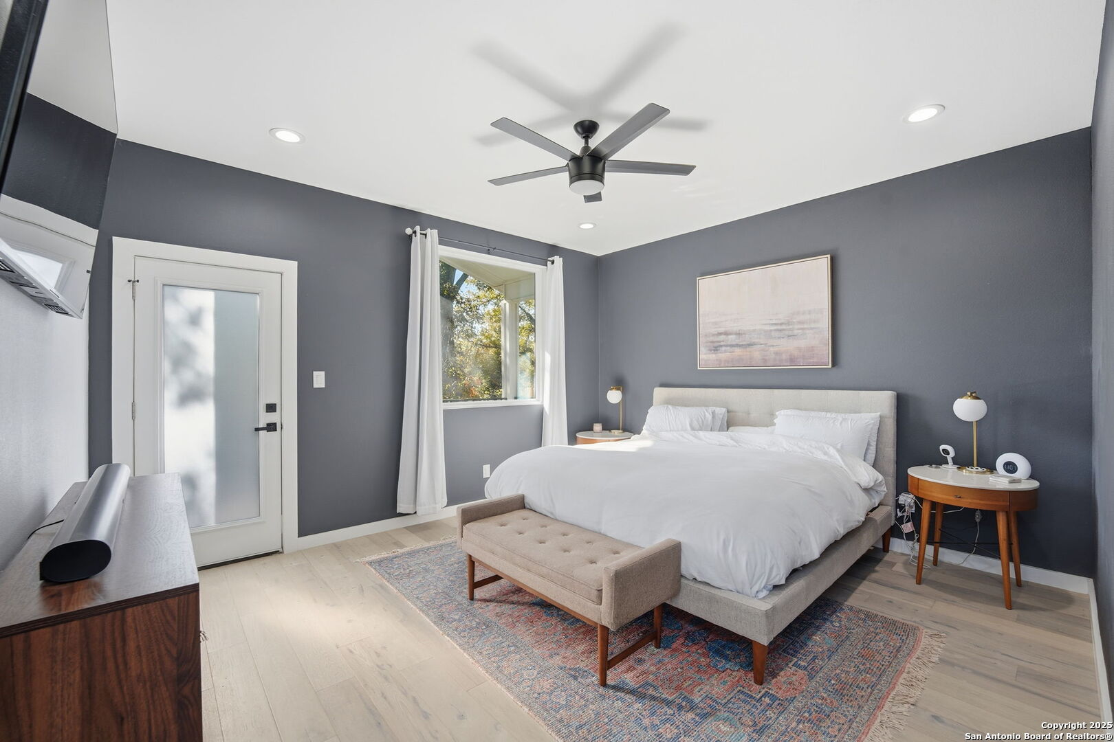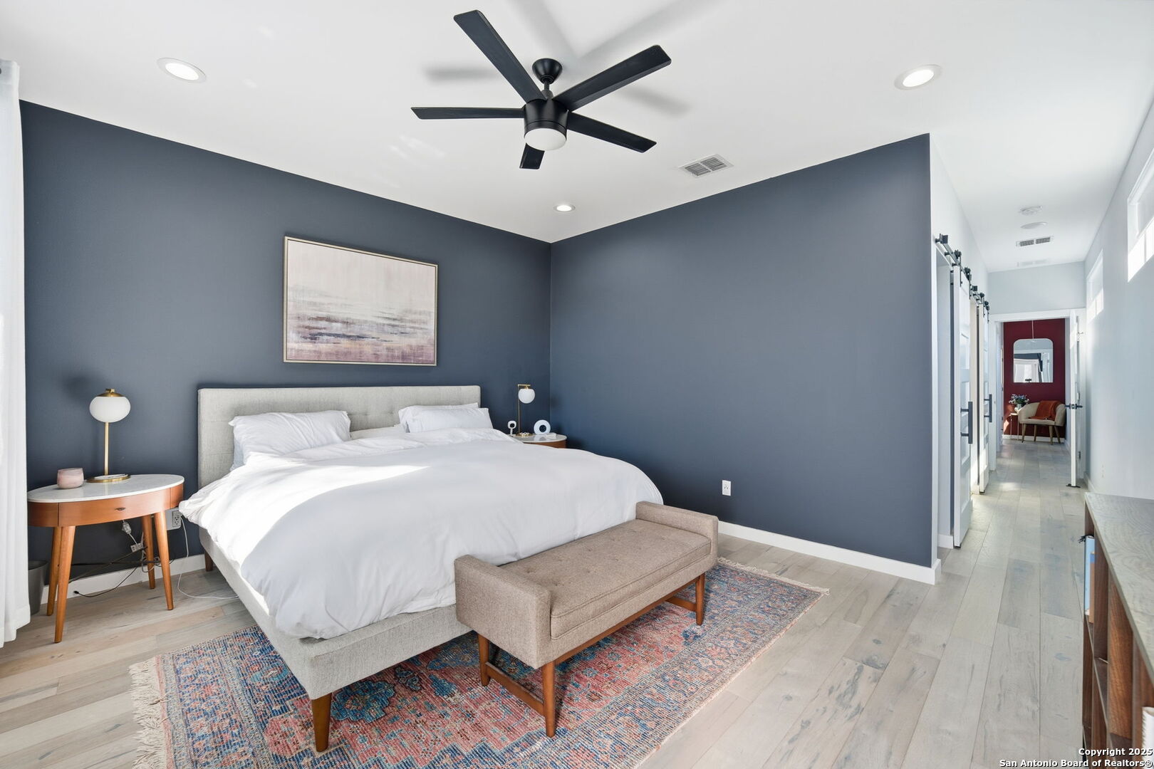 This modern contemporary home blends style, function, and an incredibly convenient location. Stained concrete floors and recessed lighting set a clean and contemporary tone throughout the main living spaces. The kitchen stands out as the centerpiece, offering a striking waterfall island, a comfortable breakfast bar, stainless steel appliances, custom cabinetry, detailed tile accents, and a classic white subway tile backsplash. The layout is designed for practical living, and the upstairs laundry room adds even more convenience with a full-size washer and dryer setup instead of a stacked set up. The primary suite provides a calming retreat with a spa-inspired bathroom featuring a separate shower, a relaxing garden tub, and quartz tile throughout. A customized walk-in closet with built-in shelving maximizes storage, and outside access leads to a private balcony ideal for morning coffee or quiet evenings. The backyard enhances the property with xeriscaping for low-maintenance living and a covered patio that creates a comfortable outdoor area to enjoy or entertain guests. A short drive connects you to Southtown, Downtown San Antonio, Brooks City Base, and Fort Sam Houston, offering effortless access to dining, entertainment, and major destinations. Sellers are willing to offer concessions with a reasonable offer!