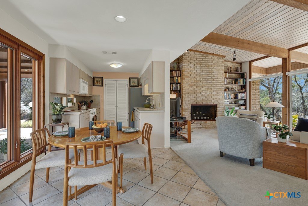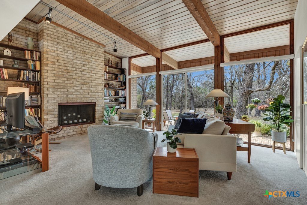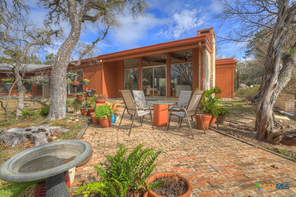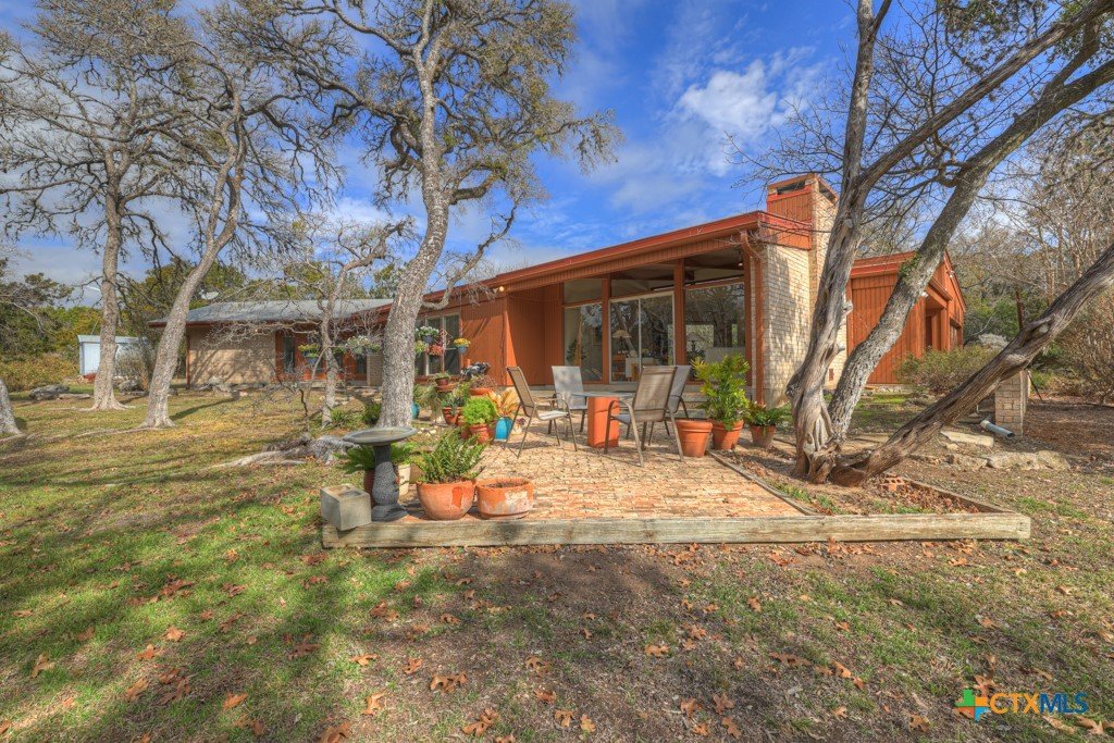 Now offered for the first time, this true architect-designed mid-century modern estate is a rare find, thoughtfully inspired by the clean lines and organic principles of Frank Lloyd Wright and Richard Neutra. Set on 4.5 tree-covered acres in the Texas Hill Country, the home has been meticulously cared for by a single family since its construction. Natural light pours in through floor-to-ceiling and clerestory windows, while three sets of sliding glass doors extend the living spaces onto generous patios. Warm wood and beamed ceilings in both the living room and primary suite create a seamless connection to the outdoors. A striking room-anchoring fireplace, flanked by built-in bookshelves, defines the main living area. The open-concept living, kitchen, and dining spaces were designed with intention and precision. The kitchen offers exceptional storage, and the living room is complemented by a hidden wall of cabinetry discreetly tucked behind four large doors. The primary suite, added in 1988, features dual closets with custom built-ins. Thoughtful xeriscape landscaping with deer-resistant plants enhances the natural setting. A well-designed breezeway connects the home to the garage, which includes a sink, cabinetry, and organized storage solutions. At every turn, the craftsmanship and care are evident. While the photography is beautiful, experiencing this home in person is essential.