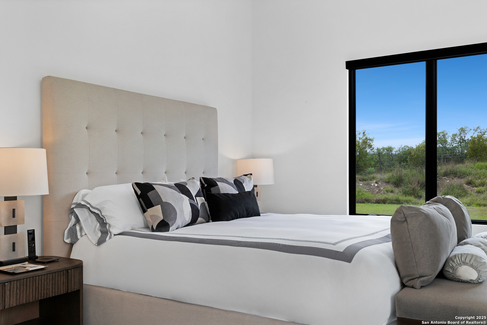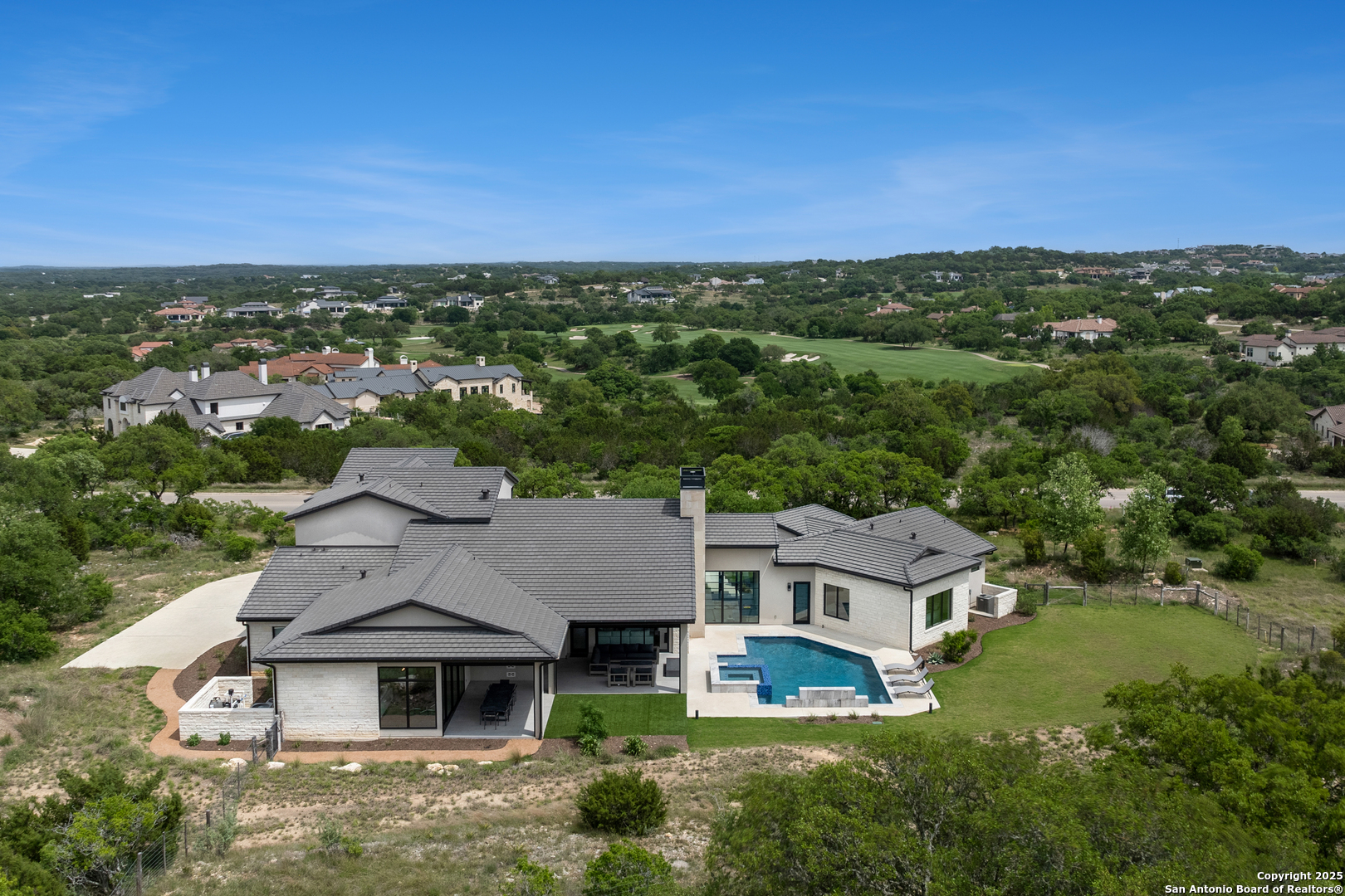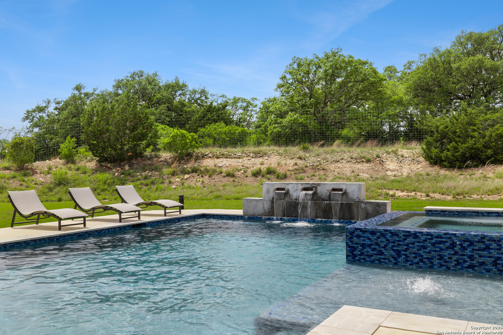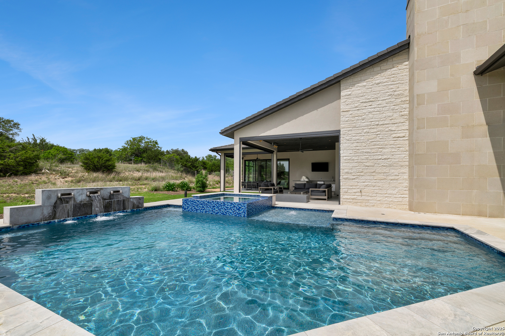 Nestled in the prestigious Clubs Village at Cordillera Ranch, this custom Garner Home perfectly blends modern Hill Country style with everyday livability. Every detail was thoughtfully chosen to create a balance of comfort, elegance, and clean architectural design. The dramatic glass entry doors immediately frame peaceful views of the outdoor oasis, complete with a resort-style pool and spa. Inside, soaring ceilings, abundant natural light, and a soft neutral palette set a calm, inviting tone throughout the home. The chef's kitchen is both stunning and highly functional, featuring quartzite countertops, a waterfall island, and a full suite of Thermador appliances. It opens seamlessly to the main living area, where a floor-to-ceiling stone fireplace becomes the centerpiece of the room. The primary suite feels like a private retreat, offering its own sitting area and a spa-inspired bath with dual vanities, a freestanding soaking tub, an oversized walk-in shower, and separate dressing areas. Upstairs, two additional bedrooms share a cozy private lounge and a covered balcony with beautiful long-range views. Two main-level guest suites provide added comfort and privacy for visitors. For entertaining, the game room is ideal, complete with a full bar and sliding glass doors that open directly to the outdoor living area. A separate fitness room offers flexibility for a fifth bedroom, home office, or creative space. Outside, the home continues to shine with a summer kitchen, multiple lounging areas, and the gorgeous pool and spa. THIS PROPERTY ALSO INCLUDES A MASTER FULL GOLF RIGHT MEMBERSHIP TO THE CLUBS OF CORDILLERA RANCH!! With its privacy, thoughtful amenities, and elevated lifestyle, this home truly embodies luxury living in one of the Hill Country's most desirable communities.