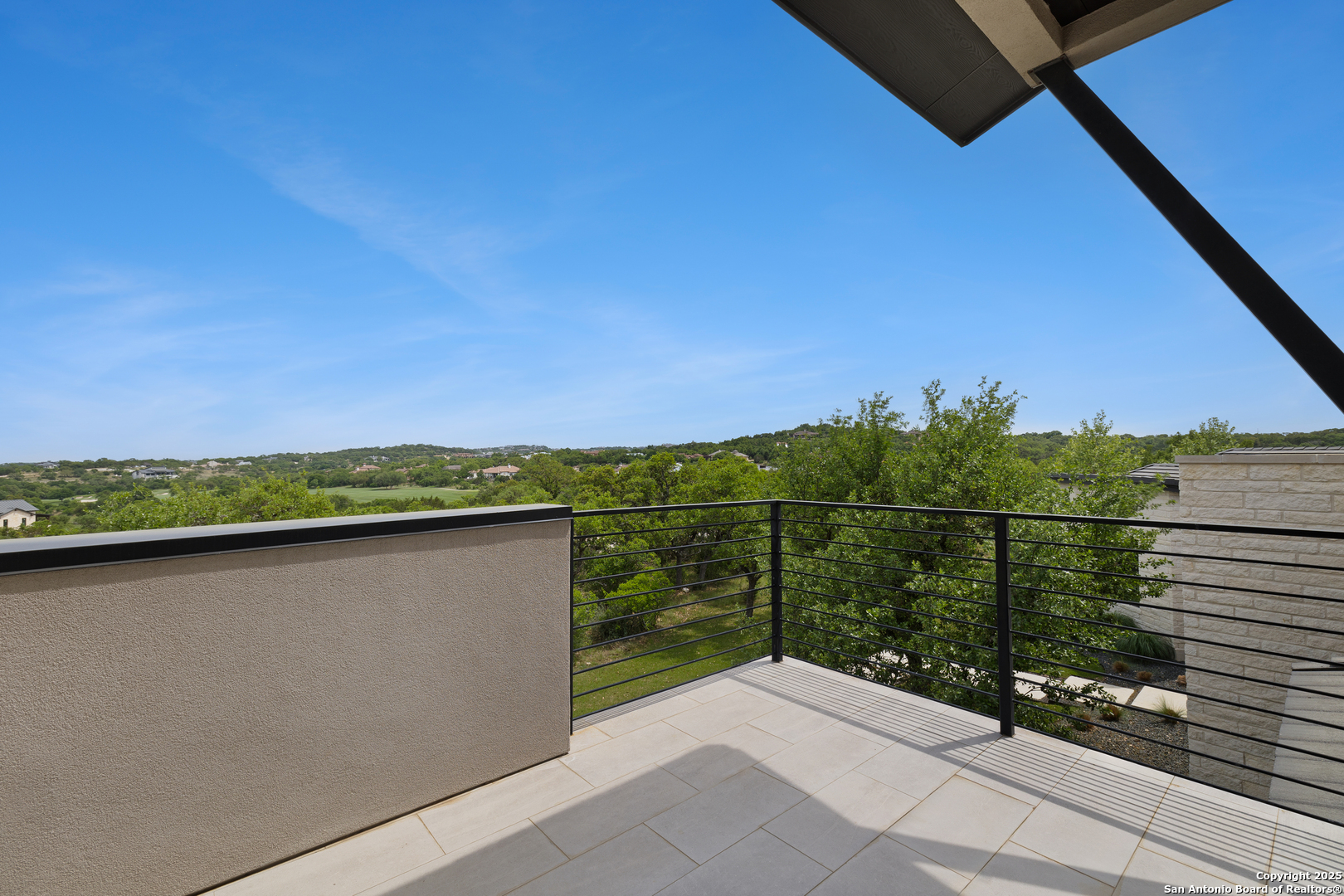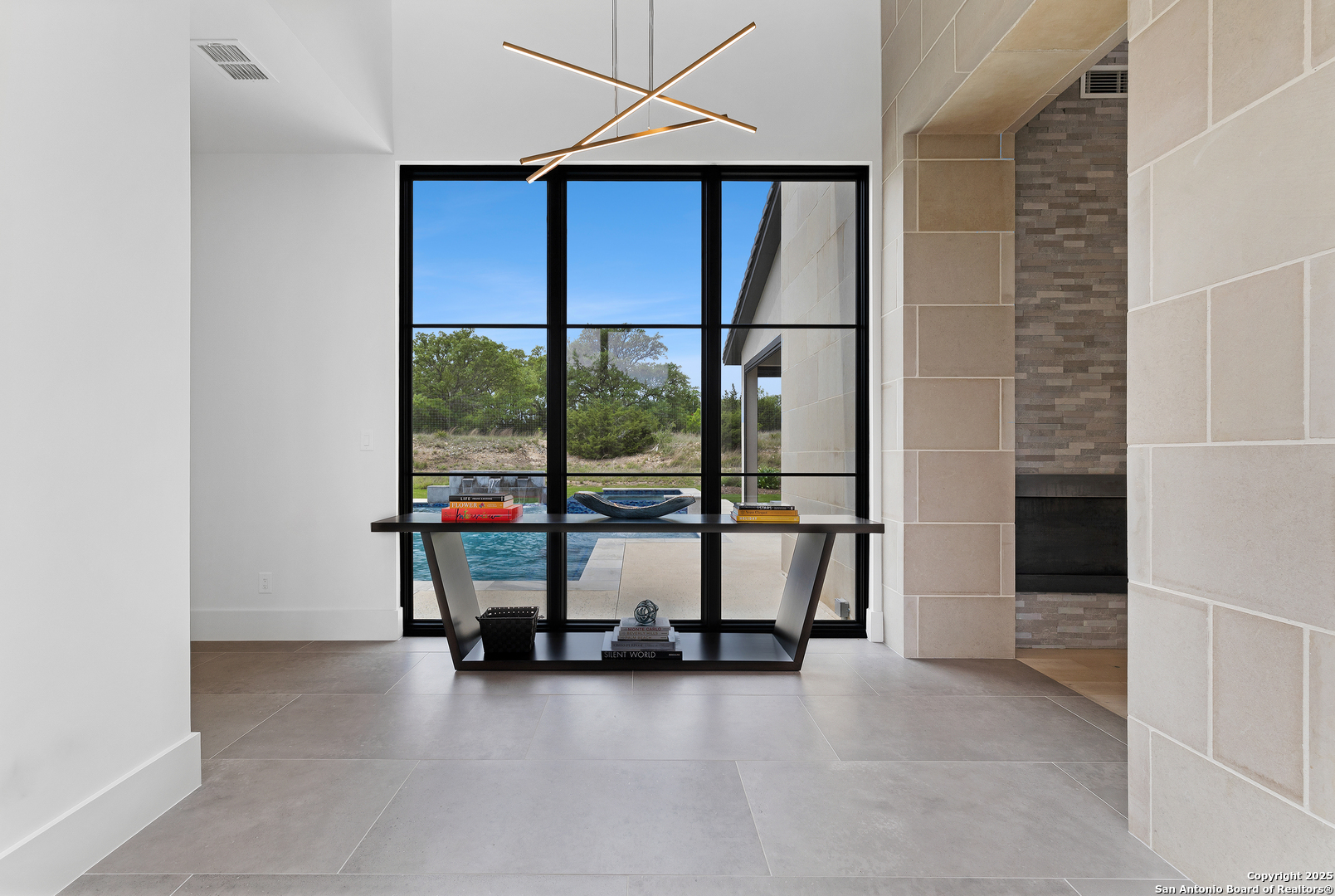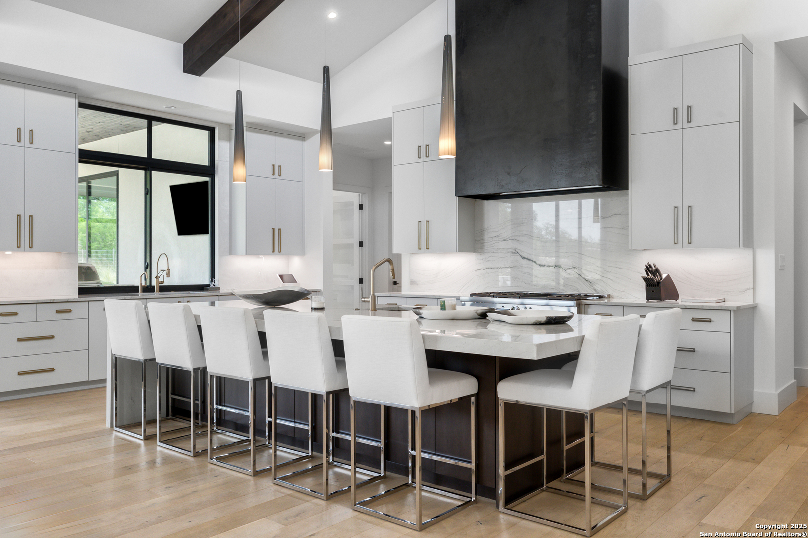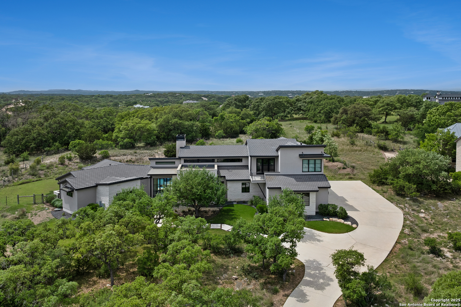 Nestled in the prestigious Clubs Village at Cordillera Ranch, this custom Garner Home perfectly blends modern Hill Country style with everyday livability. Every detail was thoughtfully chosen to create a balance of comfort, elegance, and clean architectural design. The dramatic glass entry doors immediately frame peaceful views of the outdoor oasis, complete with a resort-style pool and spa. Inside, soaring ceilings, abundant natural light, and a soft neutral palette set a calm, inviting tone throughout the home. The chef's kitchen is both stunning and highly functional, featuring quartzite countertops, a waterfall island, and a full suite of Thermador appliances. It opens seamlessly to the main living area, where a floor-to-ceiling stone fireplace becomes the centerpiece of the room. The primary suite feels like a private retreat, offering its own sitting area and a spa-inspired bath with dual vanities, a freestanding soaking tub, an oversized walk-in shower, and separate dressing areas. Upstairs, two additional bedrooms share a cozy private lounge and a covered balcony with beautiful long-range views. Two main-level guest suites provide added comfort and privacy for visitors. For entertaining, the game room is ideal, complete with a full bar and sliding glass doors that open directly to the outdoor living area. A separate fitness room offers flexibility for a fifth bedroom, home office, or creative space. Outside, the home continues to shine with a summer kitchen, multiple lounging areas, and the gorgeous pool and spa. THIS PROPERTY ALSO INCLUDES A MASTER FULL GOLF RIGHT MEMBERSHIP TO THE CLUBS OF CORDILLERA RANCH!! With its privacy, thoughtful amenities, and elevated lifestyle, this home truly embodies luxury living in one of the Hill Country's most desirable communities.