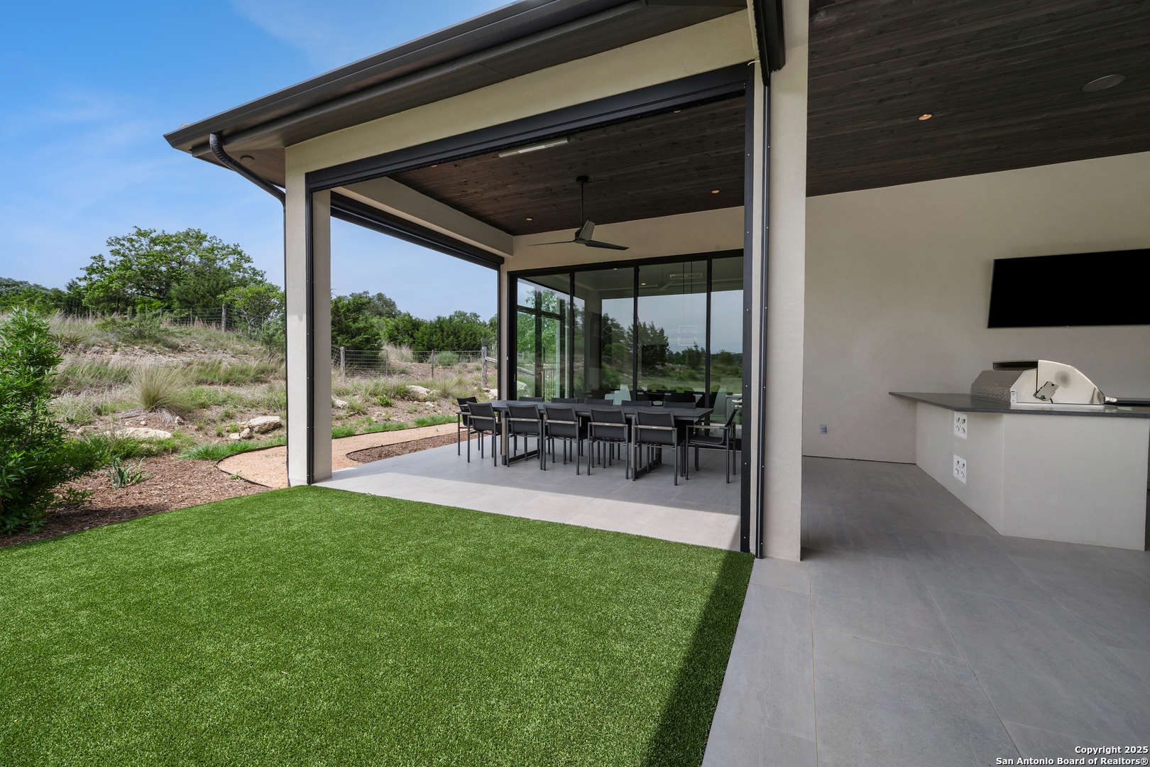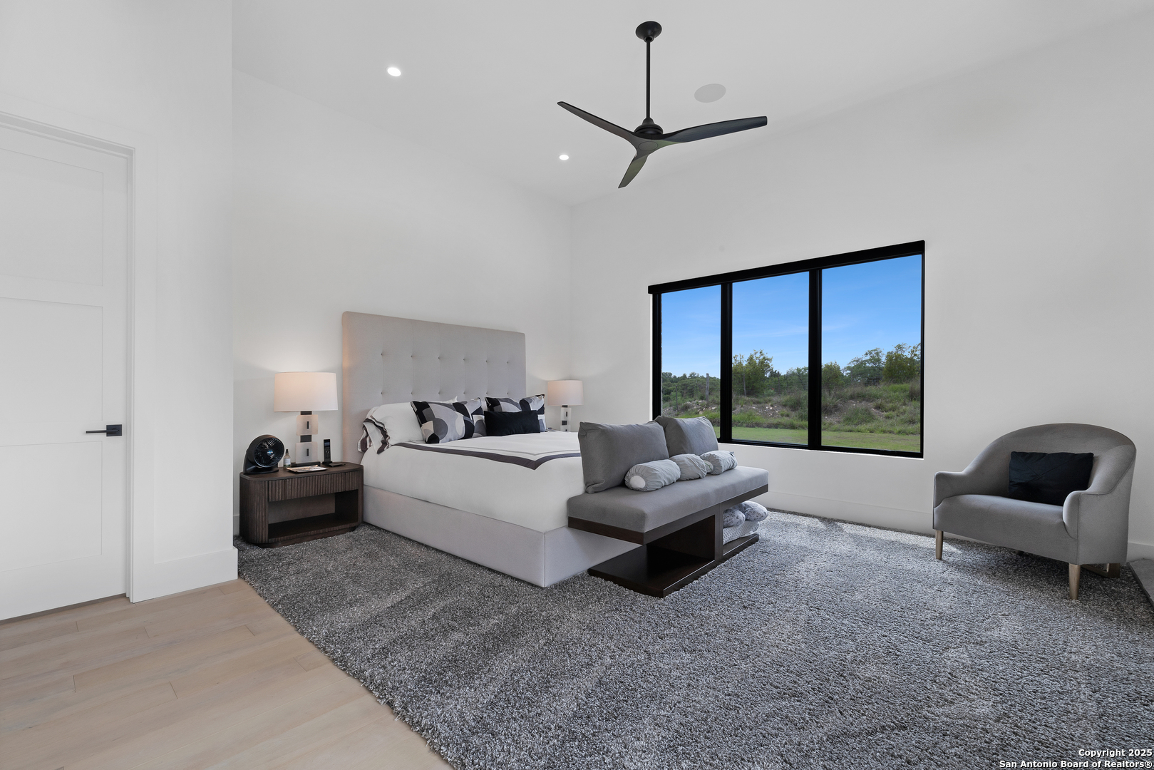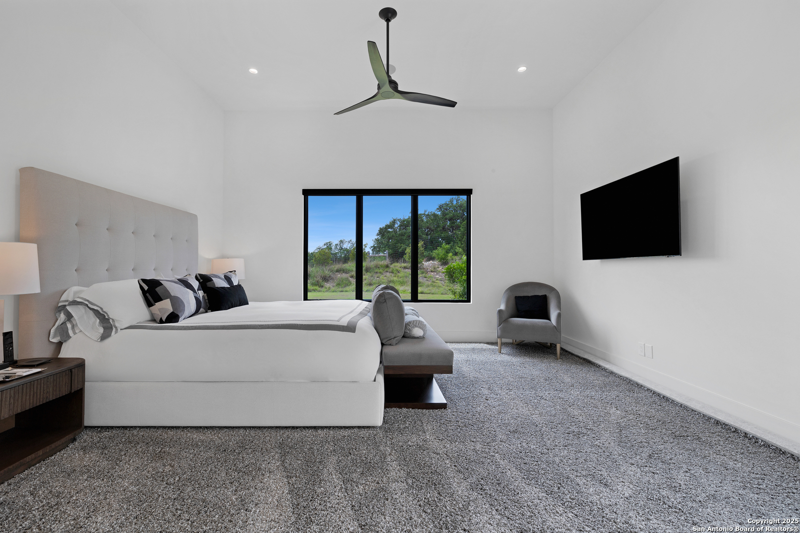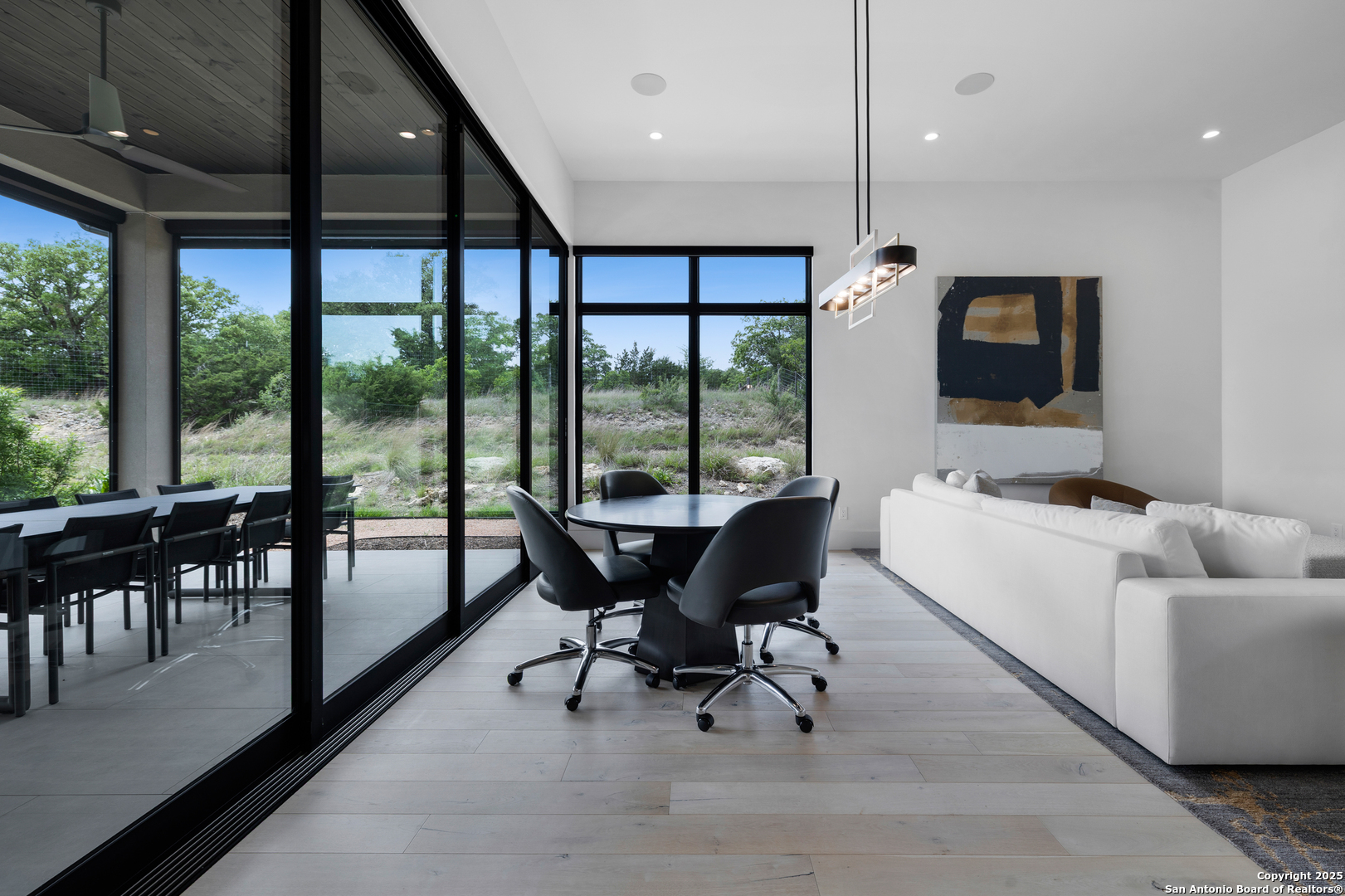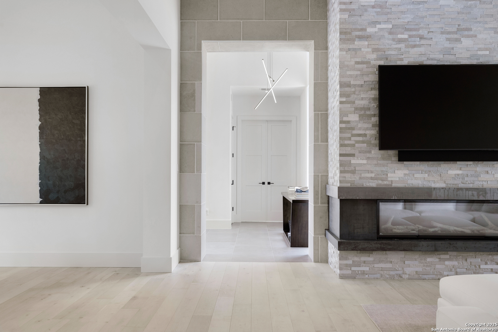Nestled in the prestigious Clubs Village at Cordillera Ranch, this custom Garner Home perfectly blends modern Hill Country style with everyday livability. Every detail was thoughtfully chosen to create a balance of comfort, elegance, and clean architectural design. The dramatic glass entry doors immediately frame peaceful views of the outdoor oasis, complete with a resort-style pool and spa. Inside, soaring ceilings, abundant natural light, and a soft neutral palette set a calm, inviting tone throughout the home. The chef's kitchen is both stunning and highly functional, featuring quartzite countertops, a waterfall island, and a full suite of Thermador appliances. It opens seamlessly to the main living area, where a floor-to-ceiling stone fireplace becomes the centerpiece of the room. The primary suite feels like a private retreat, offering its own sitting area and a spa-inspired bath with dual vanities, a freestanding soaking tub, an oversized walk-in shower, and separate dressing areas. Upstairs, two additional bedrooms share a cozy private lounge and a covered balcony with beautiful long-range views. Two main-level guest suites provide added comfort and privacy for visitors. For entertaining, the game room is ideal, complete with a full bar and sliding glass doors that open directly to the outdoor living area. A separate fitness room offers flexibility for a fifth bedroom, home office, or creative space. Outside, the home continues to shine with a summer kitchen, multiple lounging areas, and the gorgeous pool and spa. THIS PROPERTY ALSO INCLUDES A MASTER FULL GOLF RIGHT MEMBERSHIP TO THE CLUBS OF CORDILLERA RANCH!! With its privacy, thoughtful amenities, and elevated lifestyle, this home truly embodies luxury living in one of the Hill Country's most desirable communities.