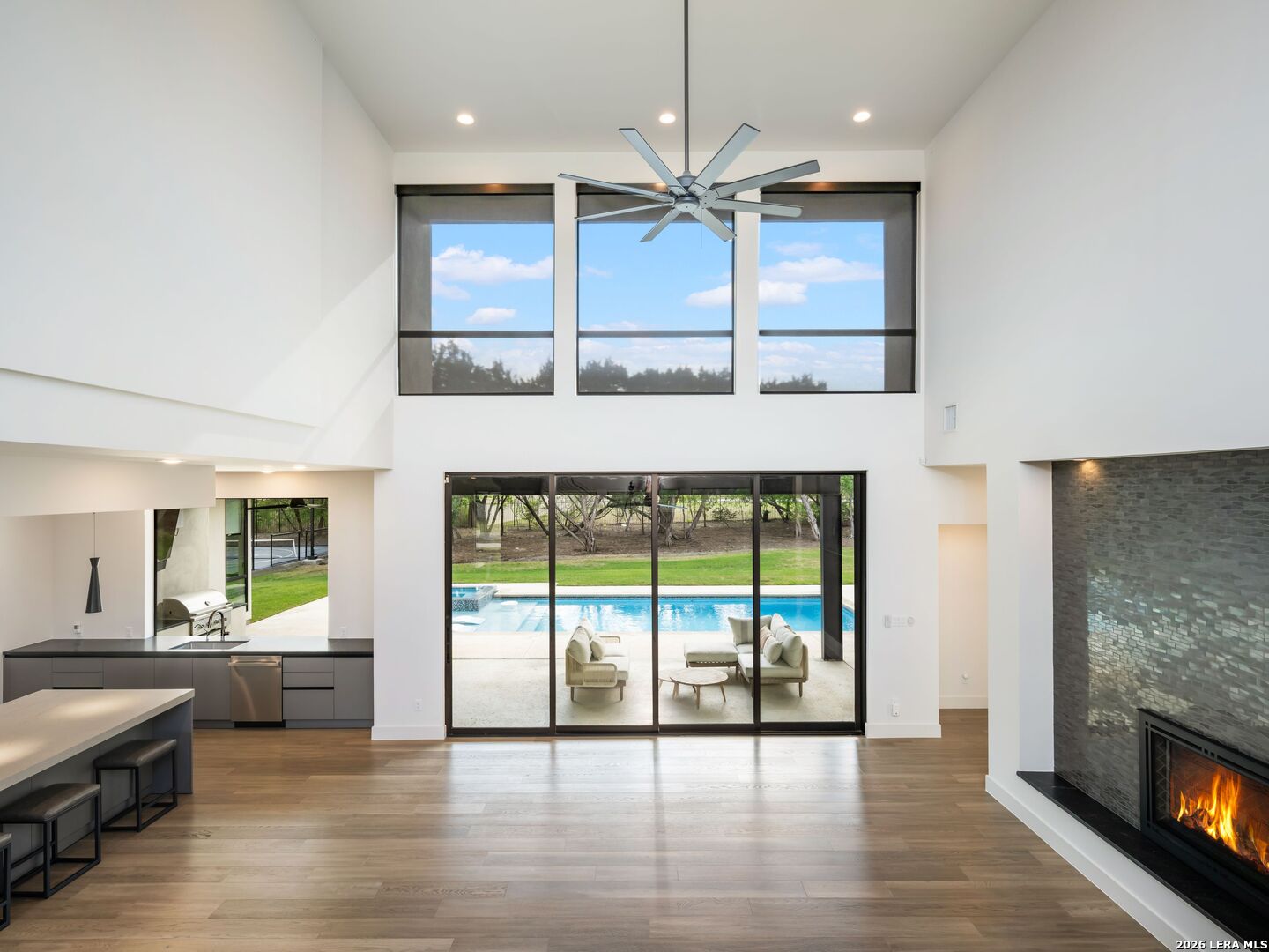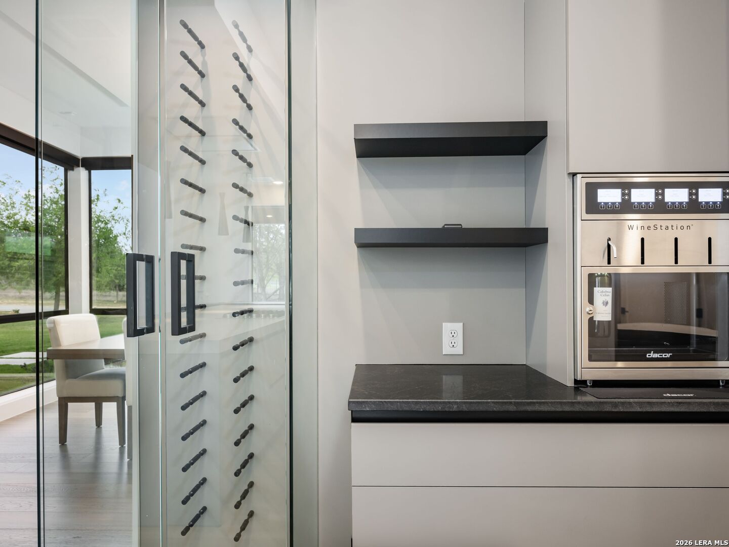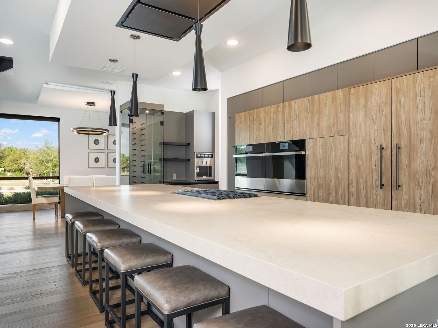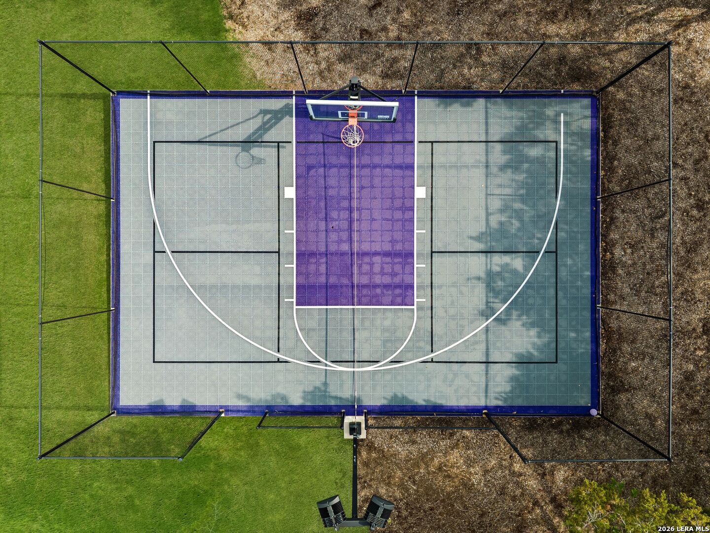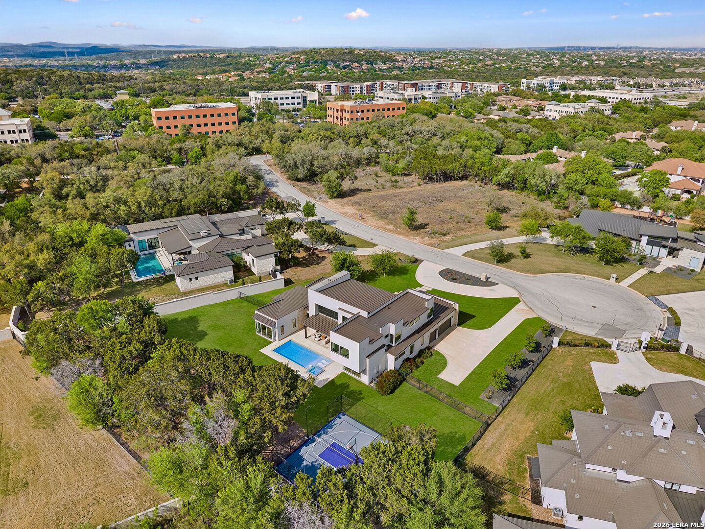 Set within the guard-gated Huntington enclave of Shavano Park, this custom Adam Wilson home brings together a contemporary architectural sensibility with warmth, functionality, and a layout designed for both large-scale entertaining and everyday living. Expansive light-filled interiors, broad windows, and a well-considered floor plan create a strong sense of openness while still allowing each space to feel purposeful and distinct. The kitchen is designed to perform as both a true workspace and a central gathering point, appointed with stone countertops, Italian cabinetry, dual ovens, generous prep space, appliance storage, and a large pantry. Entertaining is further elevated by a built-in serving area, glass-enclosed display storage, and a Dacor four-bottle wine dispenser that adds a distinctive layer of convenience and presentation. The main level owner's suite is privately positioned and features dual closets along with a luxe bath finished with a statement wall and integrated mood lighting. A spacious guest suite or second primary bedroom with its own beautiful bath and large closet is located on the opposite side of the home, offering ideal separation for guests or multigenerational living. Additional main level spaces include a bedroom currently arranged as a gym with close access to a full bath, along with a flexible room with custom built-ins, en suite bath, and closet suited for an office, library, music room, or additional exercise space. Upstairs, an expansive game room with built-ins and storage is accompanied by a powder bath and three secondary bedroom suites, each with a private bath. Outdoors, the property is equally well suited for entertaining with a pool, hot tub, covered patio, grill station, and sport court with pickleball. Additional features include a whole-house generator, motorized Hunter Douglas shades, and a NOVO water softener system.