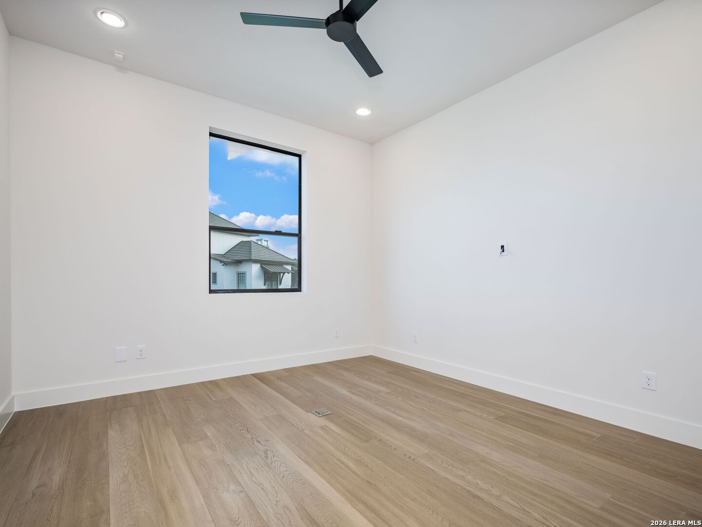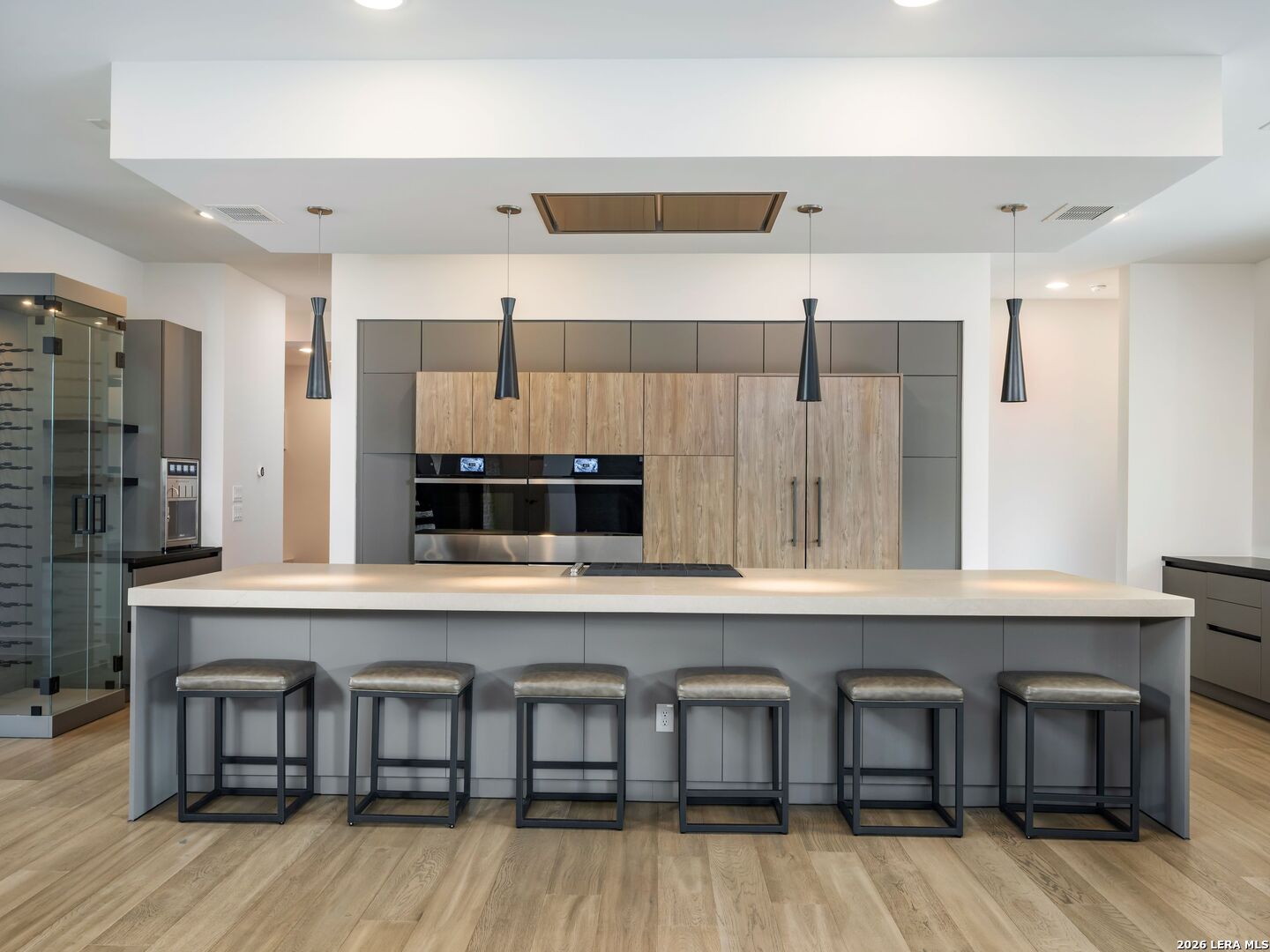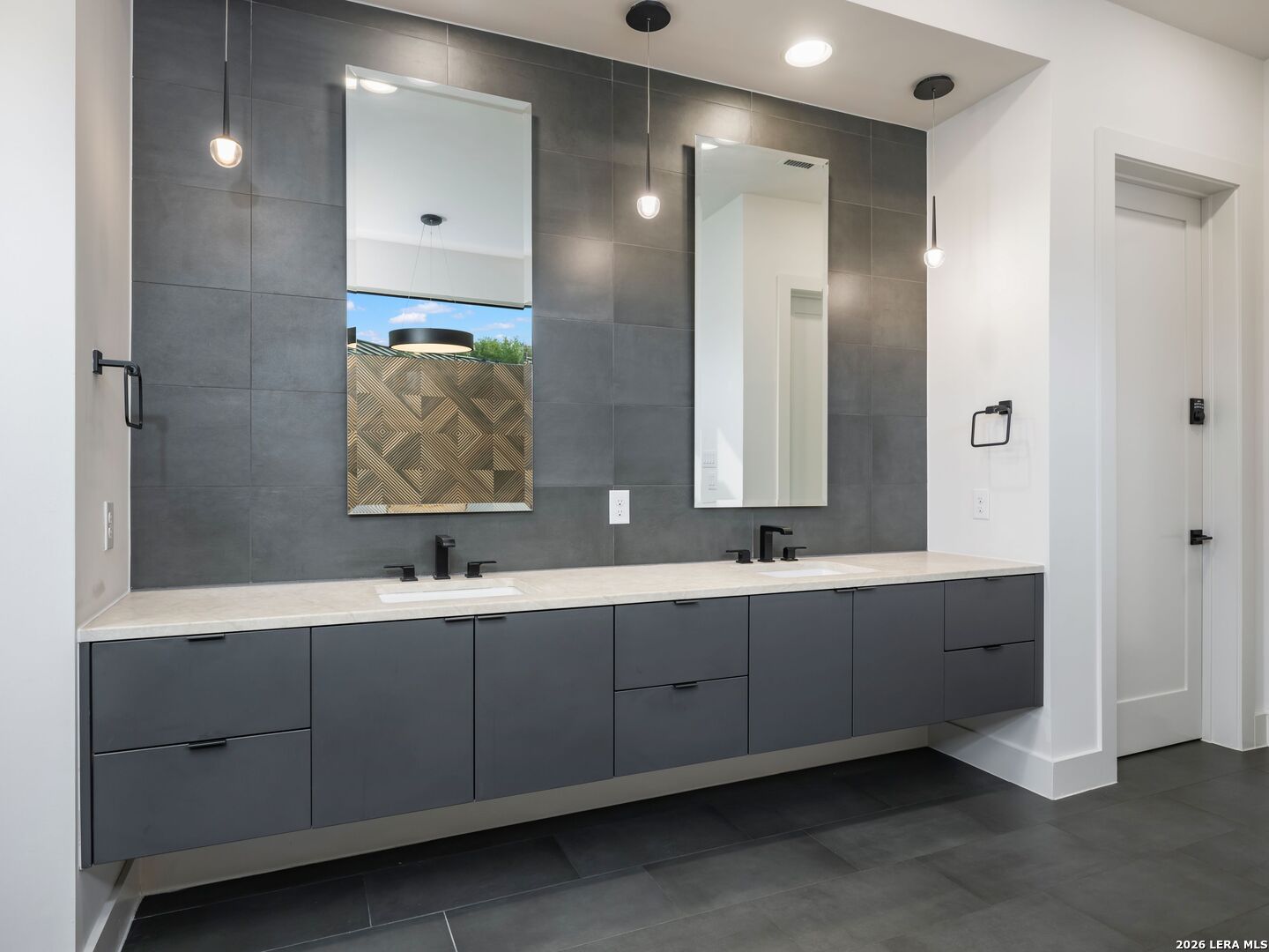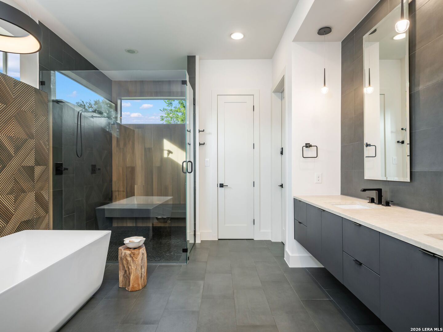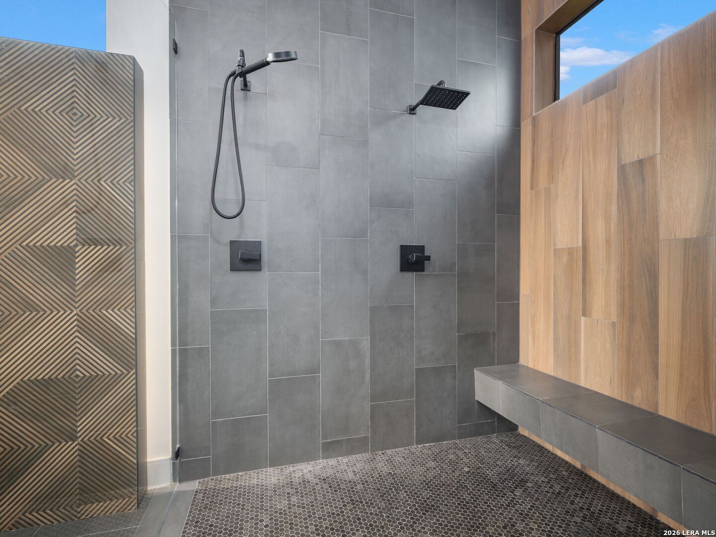 Set within the guard-gated Huntington enclave of Shavano Park, this custom Adam Wilson home brings together a contemporary architectural sensibility with warmth, functionality, and a layout designed for both large-scale entertaining and everyday living. Expansive light-filled interiors, broad windows, and a well-considered floor plan create a strong sense of openness while still allowing each space to feel purposeful and distinct. The kitchen is designed to perform as both a true workspace and a central gathering point, appointed with stone countertops, Italian cabinetry, dual ovens, generous prep space, appliance storage, and a large pantry. Entertaining is further elevated by a built-in serving area, glass-enclosed display storage, and a Dacor four-bottle wine dispenser that adds a distinctive layer of convenience and presentation. The main level owner's suite is privately positioned and features dual closets along with a luxe bath finished with a statement wall and integrated mood lighting. A spacious guest suite or second primary bedroom with its own beautiful bath and large closet is located on the opposite side of the home, offering ideal separation for guests or multigenerational living. Additional main level spaces include a bedroom currently arranged as a gym with close access to a full bath, along with a flexible room with custom built-ins, en suite bath, and closet suited for an office, library, music room, or additional exercise space. Upstairs, an expansive game room with built-ins and storage is accompanied by a powder bath and three secondary bedroom suites, each with a private bath. Outdoors, the property is equally well suited for entertaining with a pool, hot tub, covered patio, grill station, and sport court with pickleball. Additional features include a whole-house generator, motorized Hunter Douglas shades, and a NOVO water softener system.