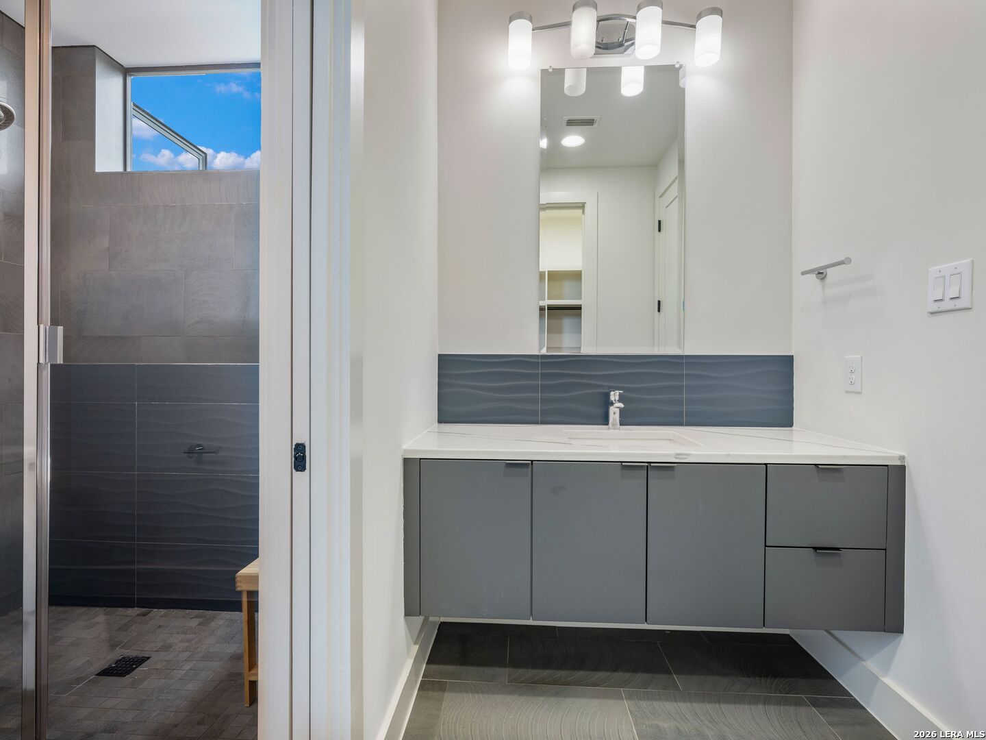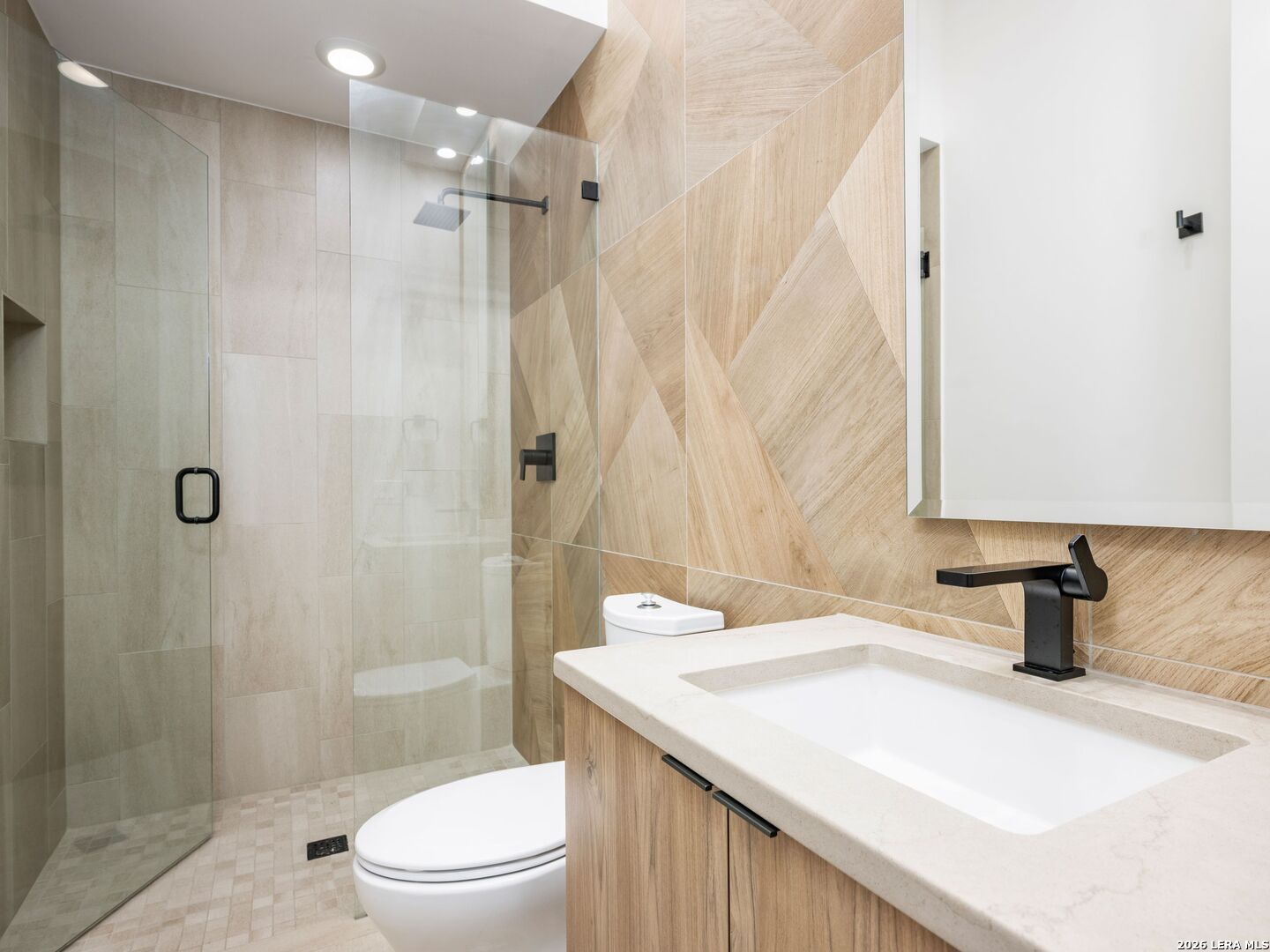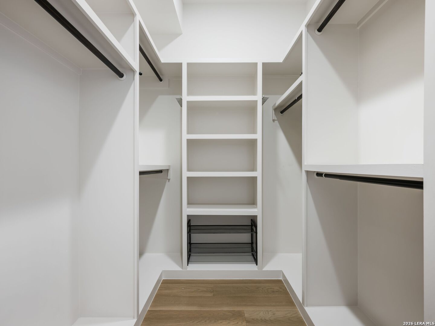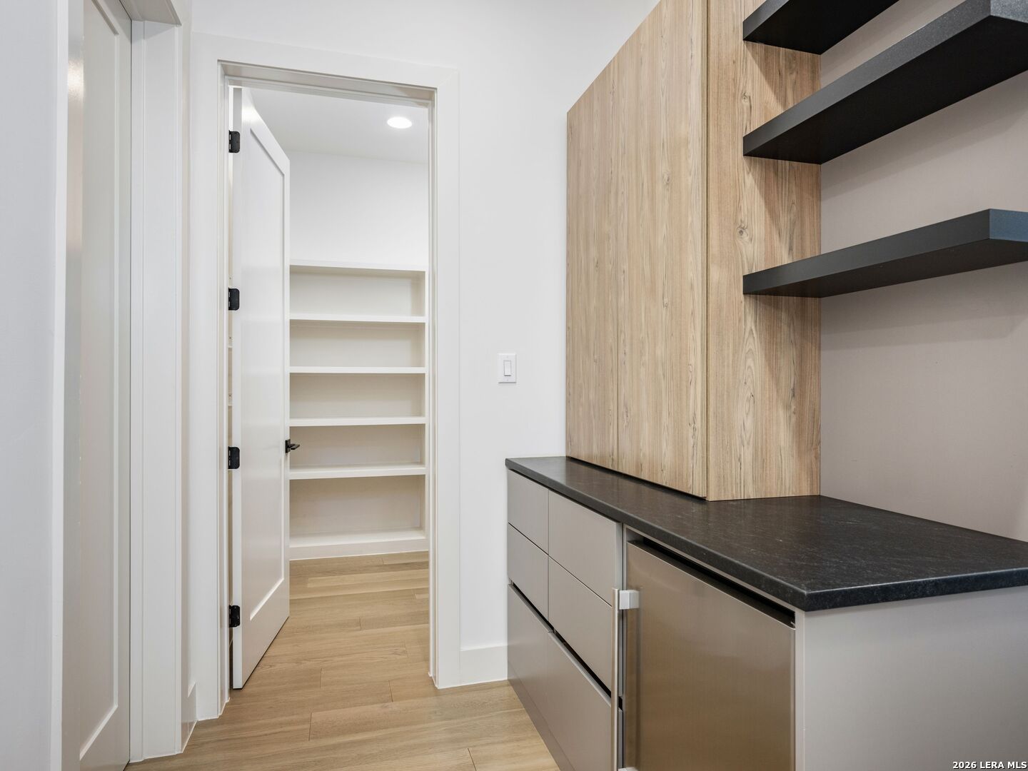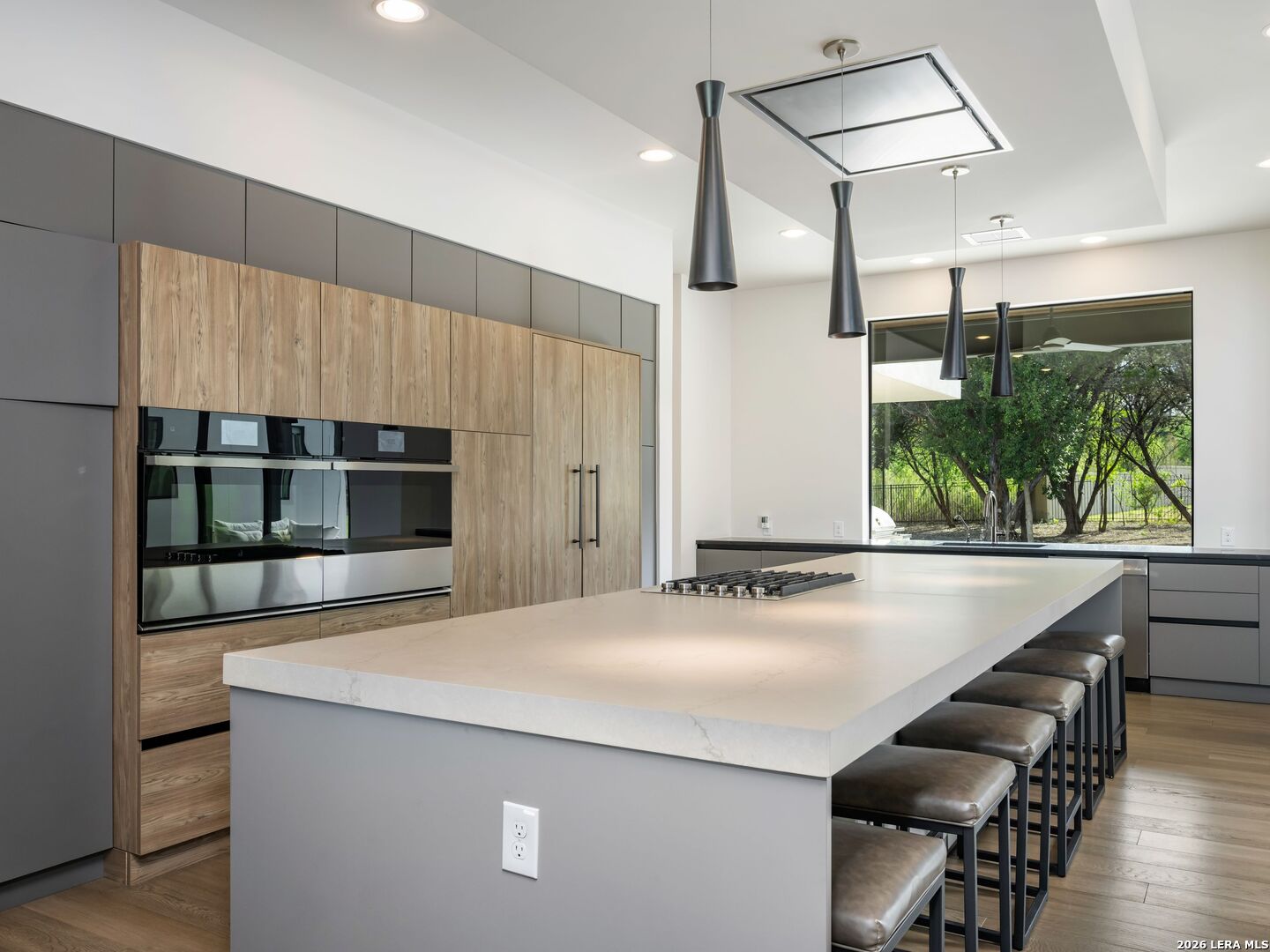 Set within the guard-gated Huntington enclave of Shavano Park, this custom Adam Wilson home brings together a contemporary architectural sensibility with warmth, functionality, and a layout designed for both large-scale entertaining and everyday living. Expansive light-filled interiors, broad windows, and a well-considered floor plan create a strong sense of openness while still allowing each space to feel purposeful and distinct. The kitchen is designed to perform as both a true workspace and a central gathering point, appointed with stone countertops, Italian cabinetry, dual ovens, generous prep space, appliance storage, and a large pantry. Entertaining is further elevated by a built-in serving area, glass-enclosed display storage, and a Dacor four-bottle wine dispenser that adds a distinctive layer of convenience and presentation. The main level owner's suite is privately positioned and features dual closets along with a luxe bath finished with a statement wall and integrated mood lighting. A spacious guest suite or second primary bedroom with its own beautiful bath and large closet is located on the opposite side of the home, offering ideal separation for guests or multigenerational living. Additional main level spaces include a bedroom currently arranged as a gym with close access to a full bath, along with a flexible room with custom built-ins, en suite bath, and closet suited for an office, library, music room, or additional exercise space. Upstairs, an expansive game room with built-ins and storage is accompanied by a powder bath and three secondary bedroom suites, each with a private bath. Outdoors, the property is equally well suited for entertaining with a pool, hot tub, covered patio, grill station, and sport court with pickleball. Additional features include a whole-house generator, motorized Hunter Douglas shades, and a NOVO water softener system.