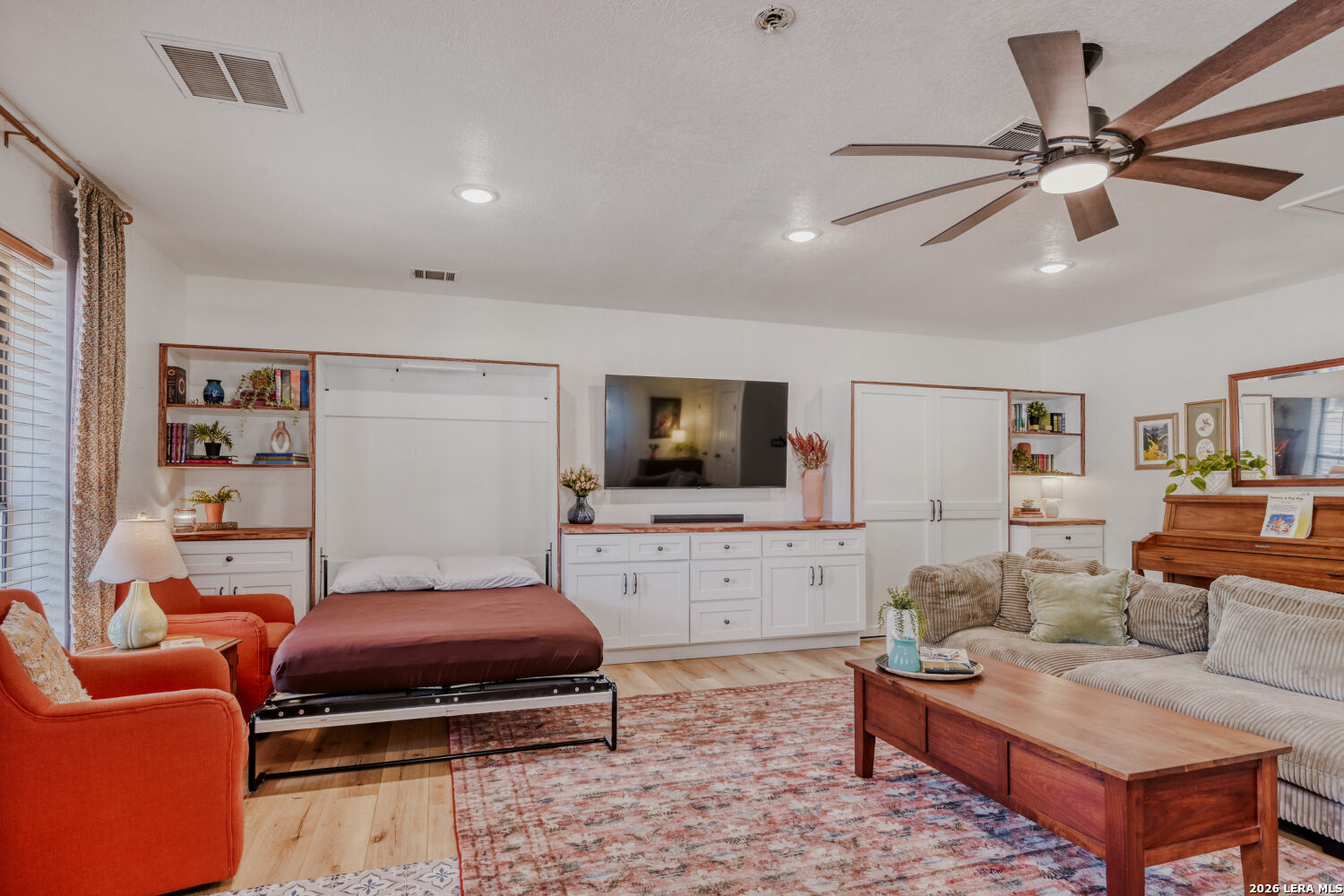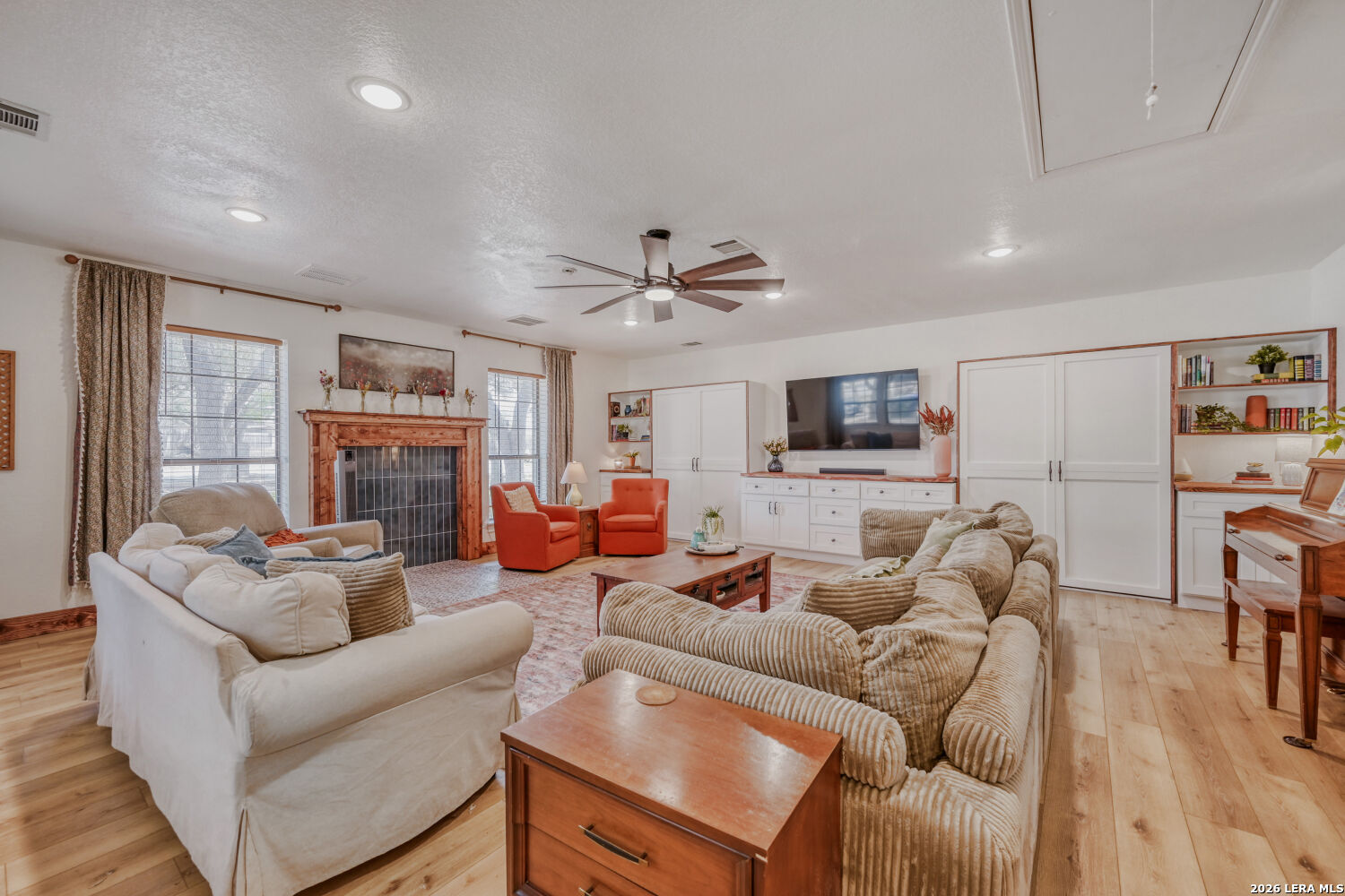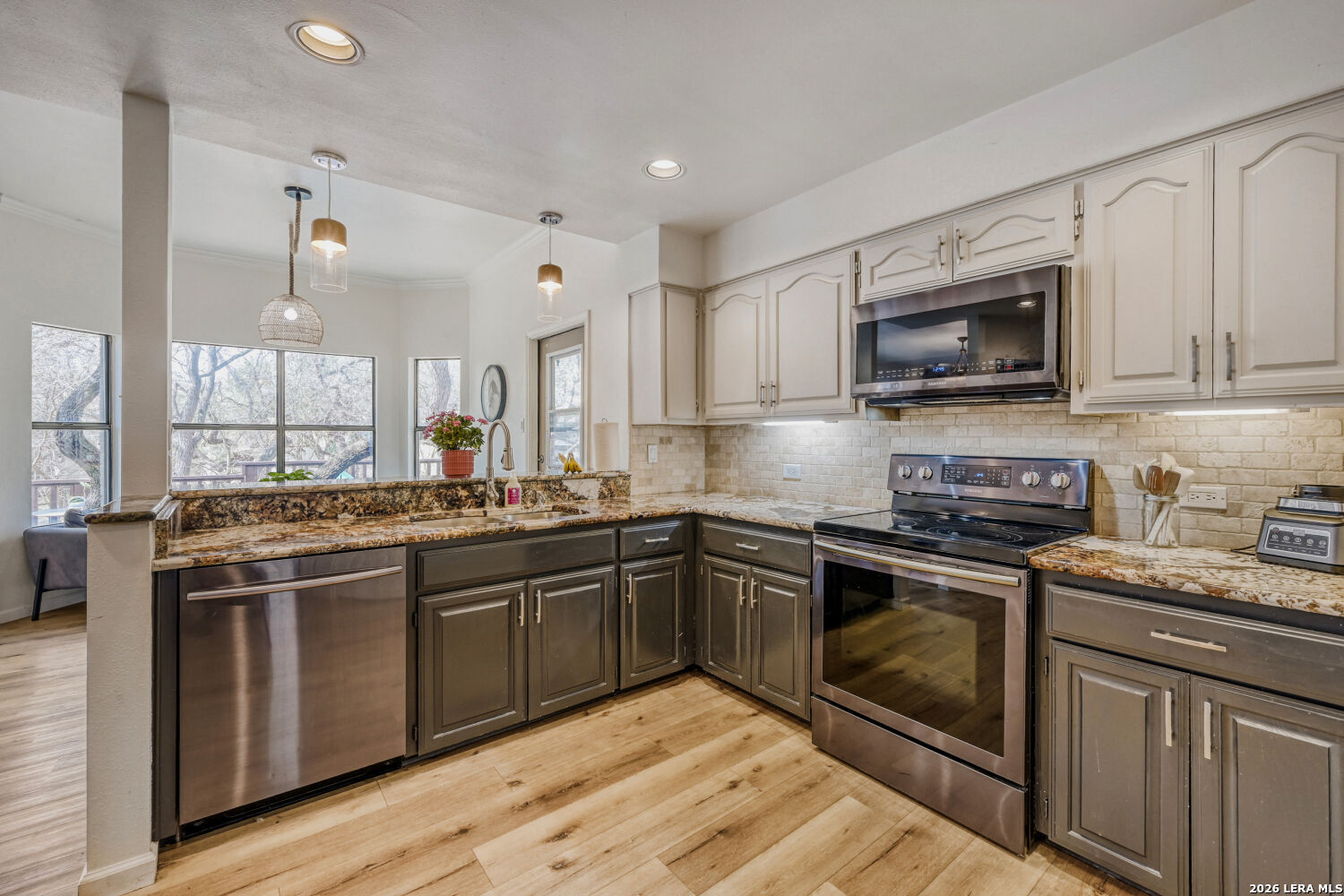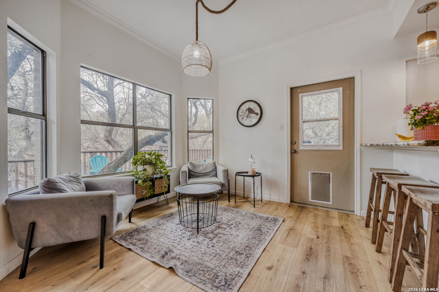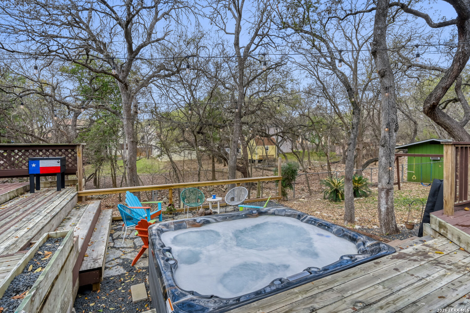 Welcome to your dream home-a beautifully maintained single-story residence in the desirable Oak Haven Heights neighborhood, perfectly positioned in the North East Independent School District for convenience and community appeal. This charming 1989-built home spans 2,332 square feet of thoughtful living space, featuring 4 bedrooms (or 3 beds + flexible 4th room/office/den) and 2 full baths. High ceilings throughout create an open, airy feel, complemented by two spacious living areas, a separate formal dining room, and abundant natural light. The updated kitchen is a standout, boasting granite countertops, modern appliances, an eat-in area with a cozy nook for casual meals, and plenty of storage. No carpet here-enjoy easy-care tile and wood flooring throughout for a clean, contemporary vibe. Step outside to your private oasis: a huge wrap-around deck surrounds an jacuzzi hot tub making this the ultimate spot for entertaining, summer barbecues, or relaxing under mature shade trees that nestle the home front and back. A workshop with electricity and a window unit provides excellent storage or hobby space. Additional highlights include no HOA restrictions, and proximity to Oakhaven Park-just steps away with walking trails, basketball courts, tennis courts, and a softball field for active lifestyles. Located in a quiet, tree-lined area with quick access to US-281, shopping, dining, McAllister Park, and all that San Antonio has to offer, this move-in-ready gem combines comfort, updates, and outdoor enjoyment.