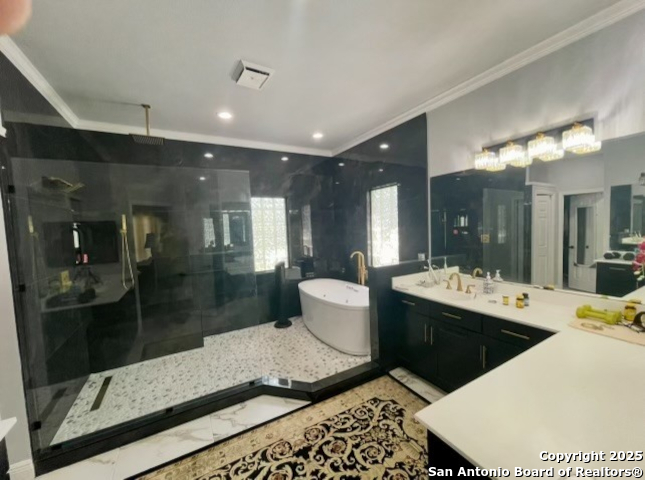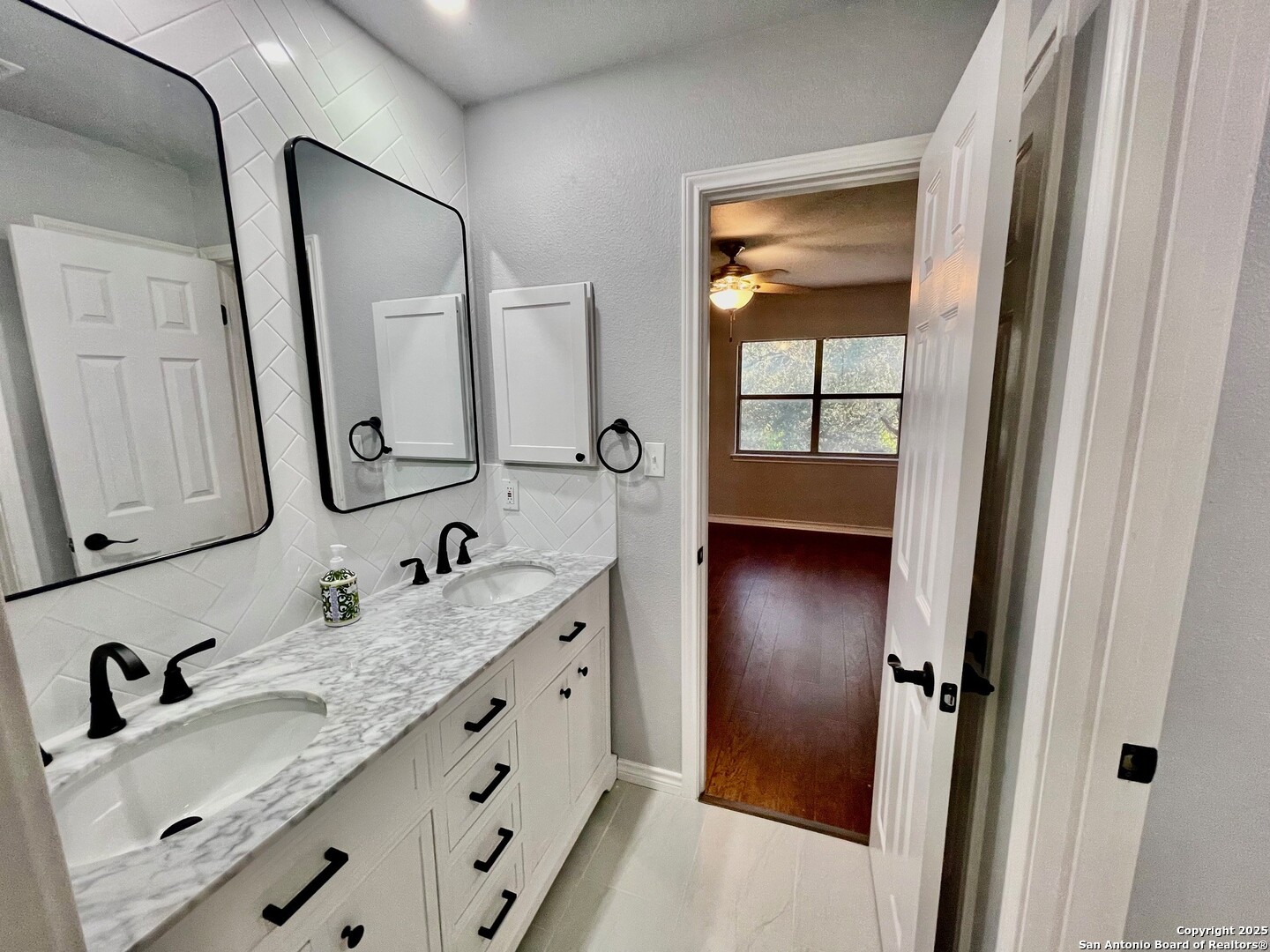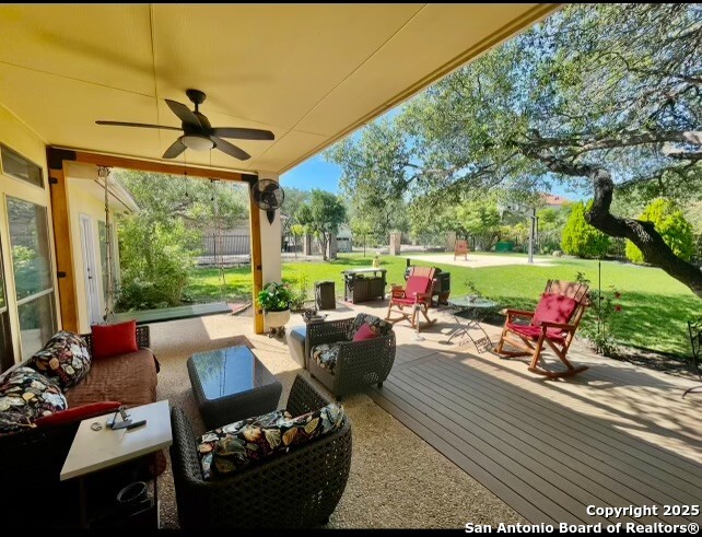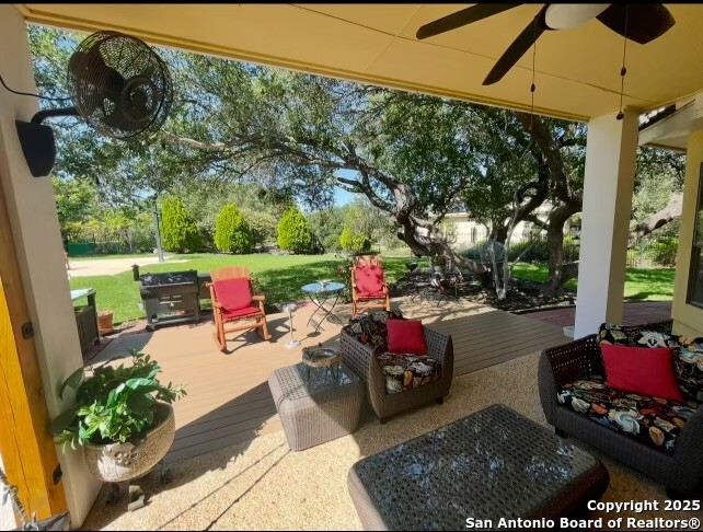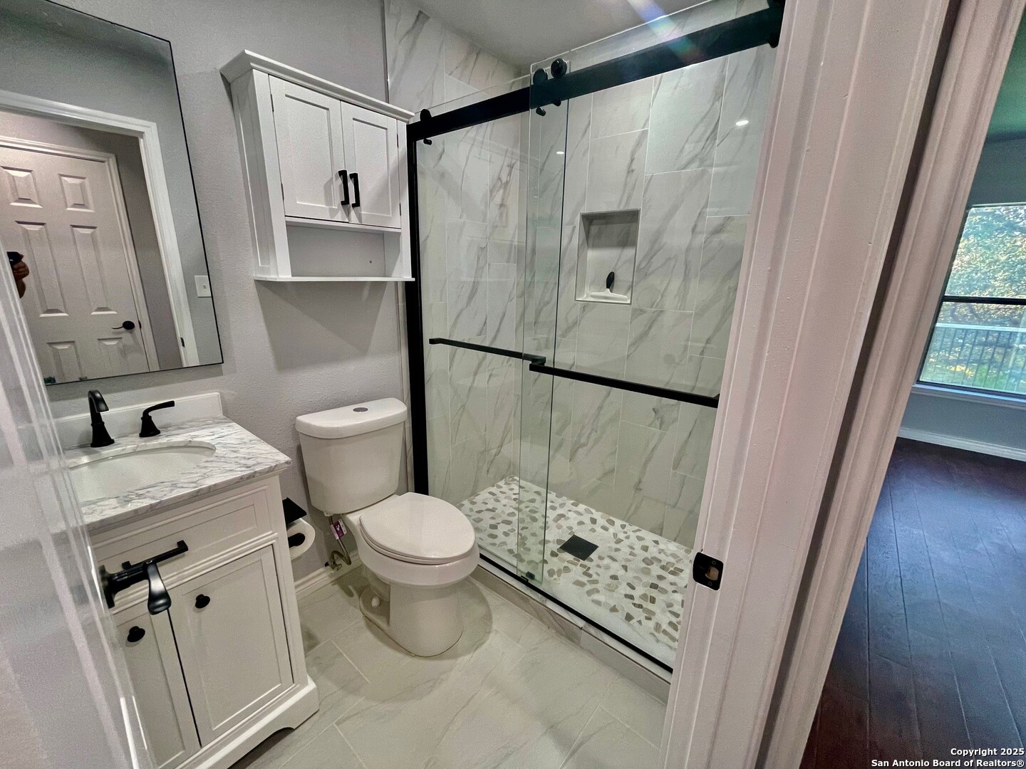REMODEL HOME IN THE PRIVATE GATED "VILLAGE IN THE HILLS" COMMUNITY LOCATED EVANS AT HWY 281 , IN THE MIDDLE OF SAN ANTONIO! PERFECT SETTING WITH BEAUTIFUL BACK YARD/ COVERED PATIO AND LUSH LANDSCAPING! PRIMARY BEDROOM AND STUDY DOWN / WITH TWO LARGE CLOSETS IN PRIMARY/ NEW COUNTER TOPS / CHEFS KITCHEN STAINLESS STEEL VIKING APPLIANCES, ISLAND, HIGH CEILINGS AND OPEN FLOOR PLAN/ LARGE TWO CAR SIDE ENTRY GARAGE WITH EXTRA PARKING ON DRIVEWAY!SPRINKLER SYSTEM, SOFT WATER AND MUCH MORE! PRIVATE COMMUNITY WITH BEAUTIFUL CUSTOM HOMES SURROUNDING THE ENTIRE AREA! NEW CERAMIC TILE, WOOD FLOORS, NO CARPET AND FRESH PAINT! ENTRY HAS SPIRAL STAIRCASE LEADING TO THREE BEDROOMS, GAME ROOM AND HUGE STEP OUT BALCONY! 65" SAMSUNG TV, SOUND BAR AND WOOFER STAY! WELCOME TO THE VILLAGE IN THE HILLS!