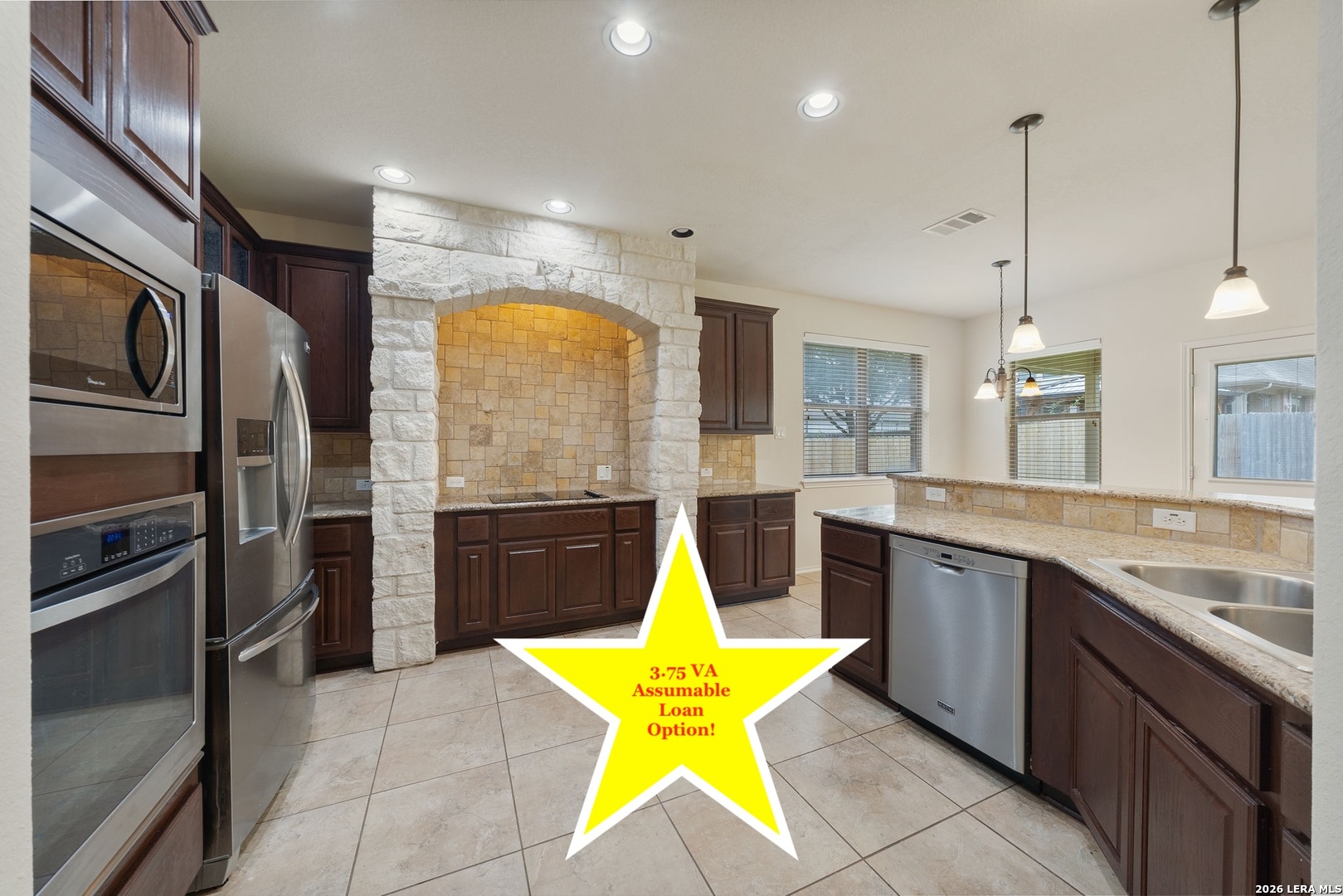Stunning stone and stucco home with timeless architectural details and thoughtful updates throughout. Enjoy peace of mind with a 3-year-old roof, 3-year-old HVAC system, and recently installed gutters. The open floor plan is enhanced by soaring ceilings, large arches, and elegant art niches that add character and visual interest throughout the home. All bedrooms are conveniently located downstairs, including a spacious primary suite on the main level. Upstairs, you'll find a versatile loft and a half bathroom-ideal for a game room, home office, or guest retreat. The luxury entertainer's kitchen is a true showpiece, featuring granite countertops, stainless steel appliances, abundant counter space, and a dramatic stone alcove range as the focal point. Laminate flooring flows through the main living areas, with tile in wet areas and brand-new carpet (May 2025) in all bedrooms and the loft. Step outside to an extended covered patio perfect for relaxing or entertaining. Ideally located just 5 minutes from Fisher Park, this home offers the perfect blend of style, comfort, and convenience. 3.75 VA assumable rate is available for veteran buyers.
