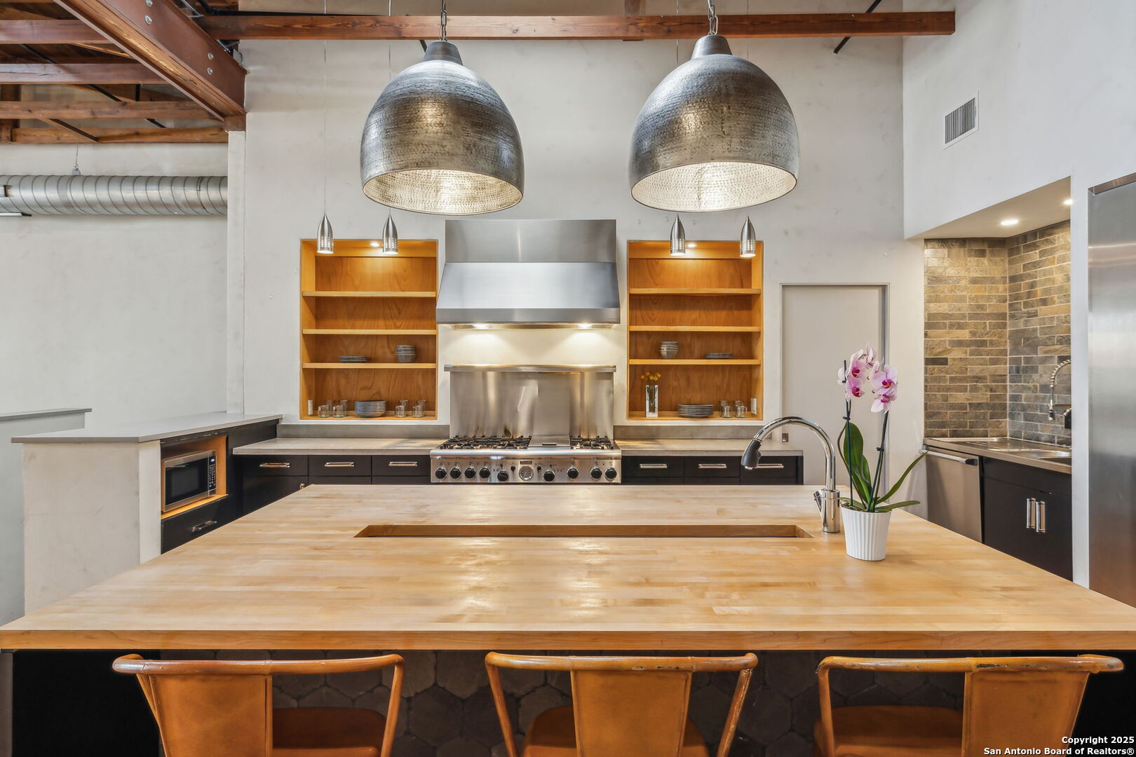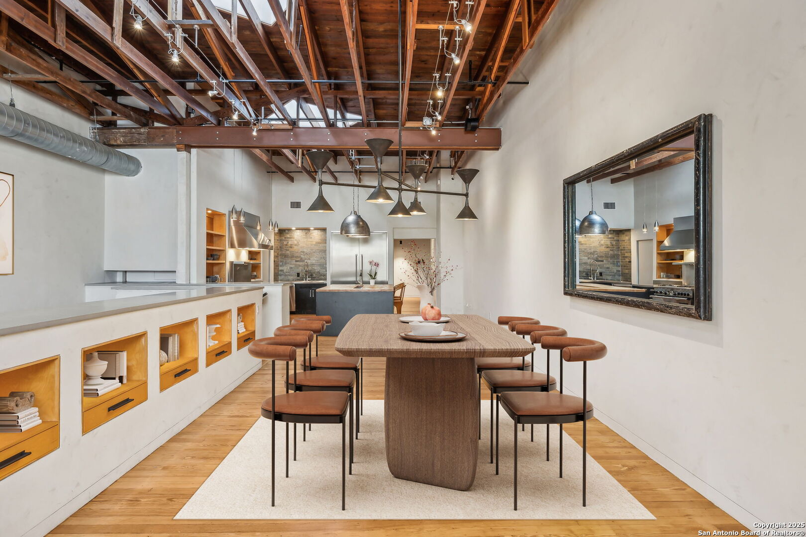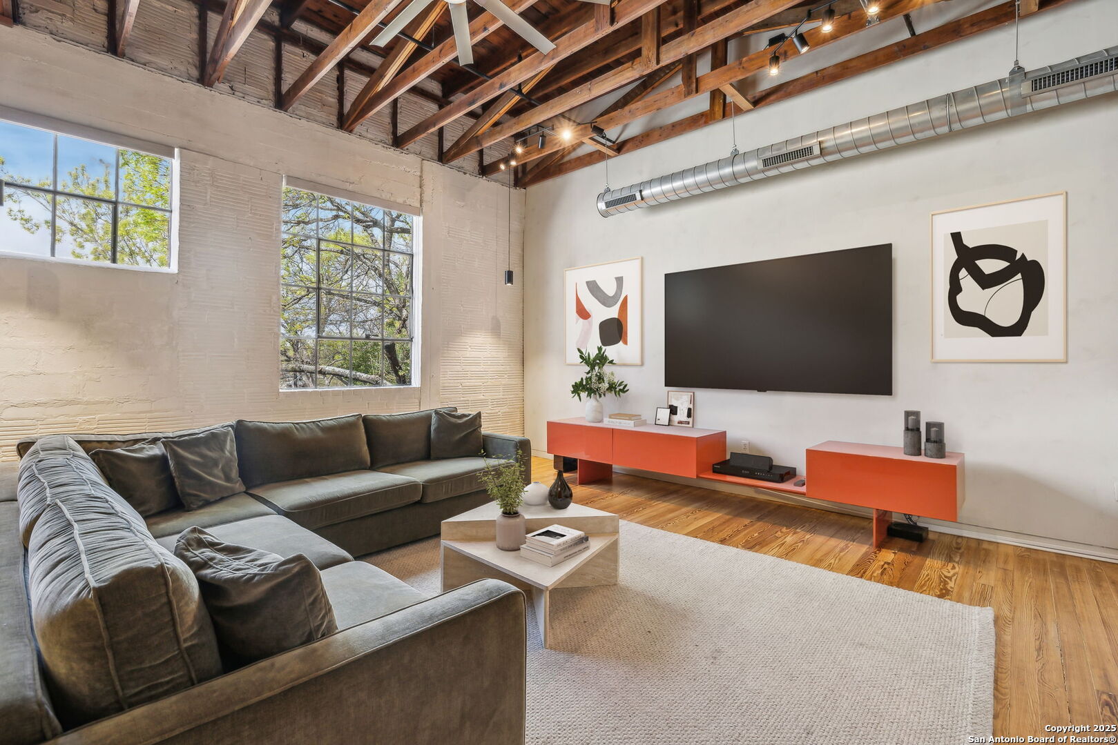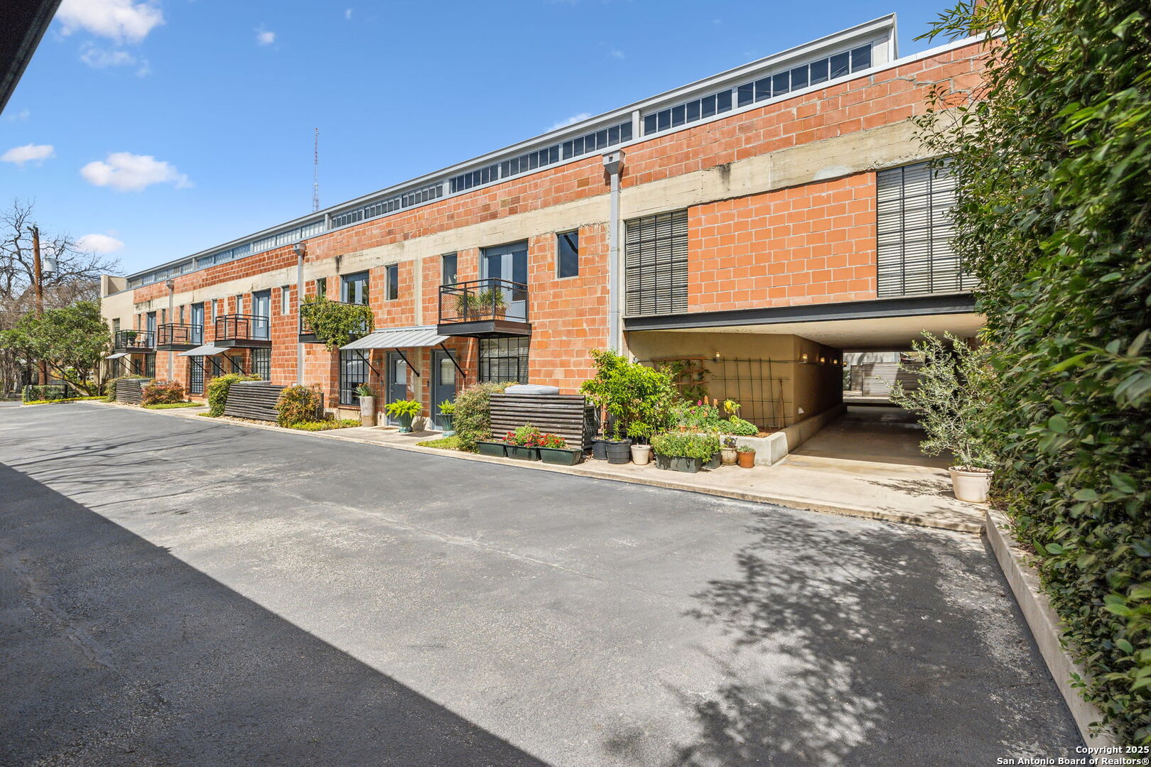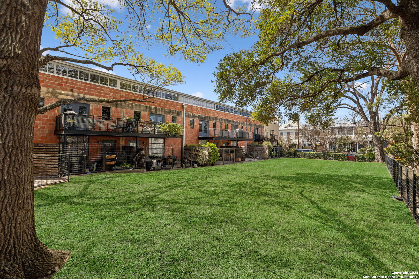 A striking fusion of industrial character and refined design, this residence offers a seamless lock-and-leave lifestyle in the heart of the King William Historic District. Two private entrances lead to a thoughtfully arranged space with views of the shared tree-filled green space. Oversized windows, soaring ceilings with exposed beams, and skylights fill the interiors with natural light, while meticulously refurbished original hardwood floors, lime-washed walls with Romabio paint, and vintage designer light fixtures add warmth and dimension. Custom cabinetry, shelving, and thoughtfully placed art niches enhance both functionality and aesthetics. / The main floor is designed with an open-concept layout, seamlessly integrating the kitchen, living, and dining areas. The kitchen is outfitted with a generous butcher's block island with a trough sink in the center, stylish lighting, and Thermador appliances, including a gas range and ice maker. / The secluded primary bedroom features a fully customized closet system and a spa-worthy ensuite bath. / A stunning secondary living space downstairs offers options for work, relaxation, or entertaining. / Rooftop access provides breathtaking downtown views and a great space to relax. / Perfectly positioned just steps from King William's vibrant scene yet offering a private and tranquil retreat. / The residence includes a side-by-side refrigerator, stackable washer/dryer, Sonos speakers, and two parking spaces (garage as well as one covered).
