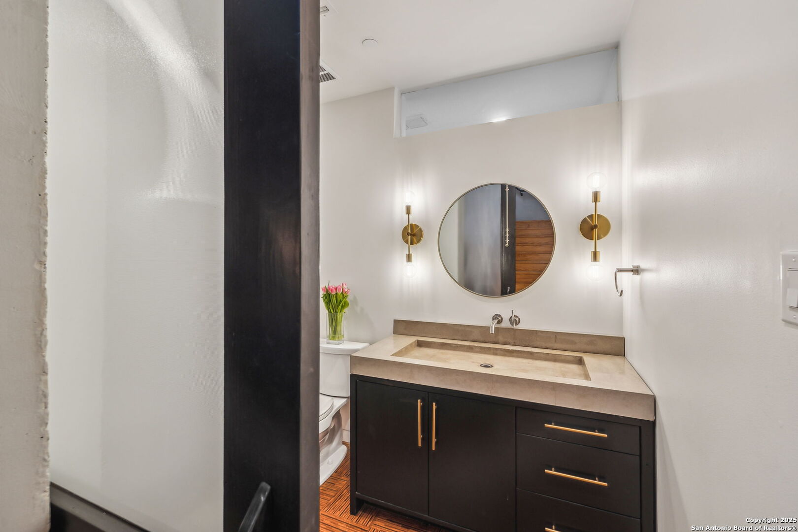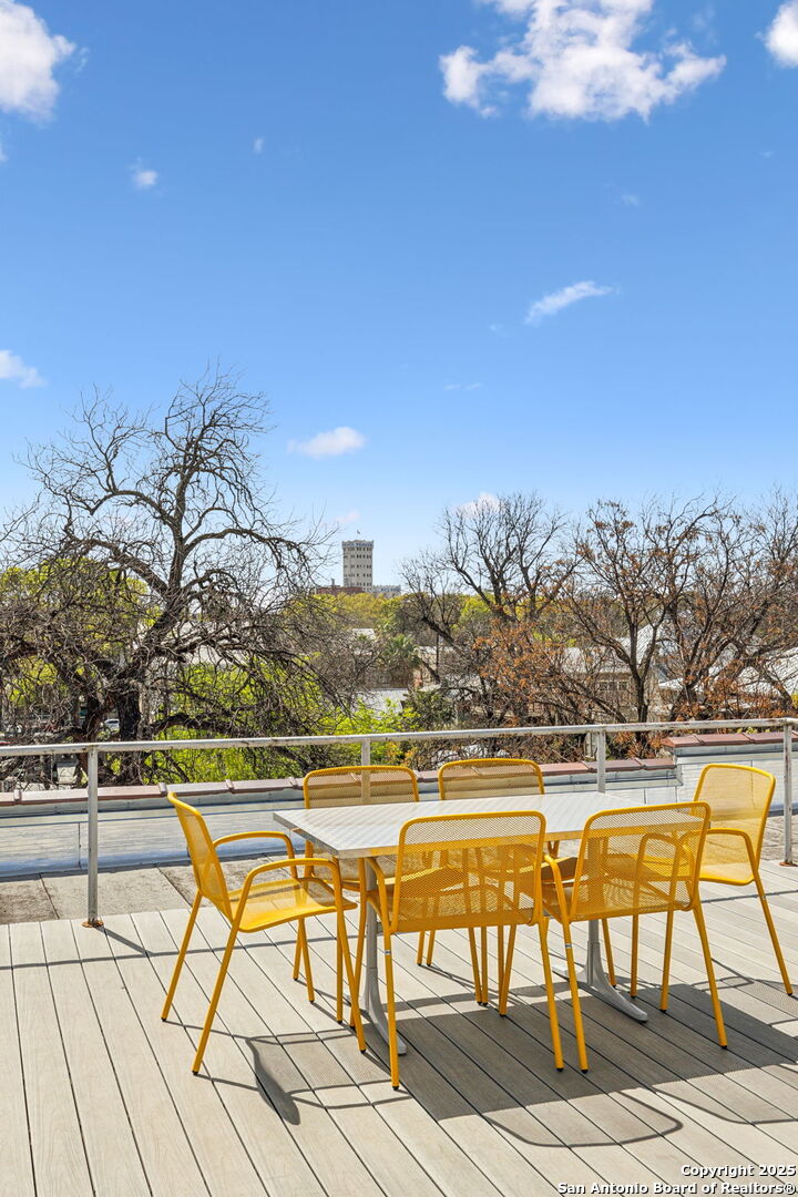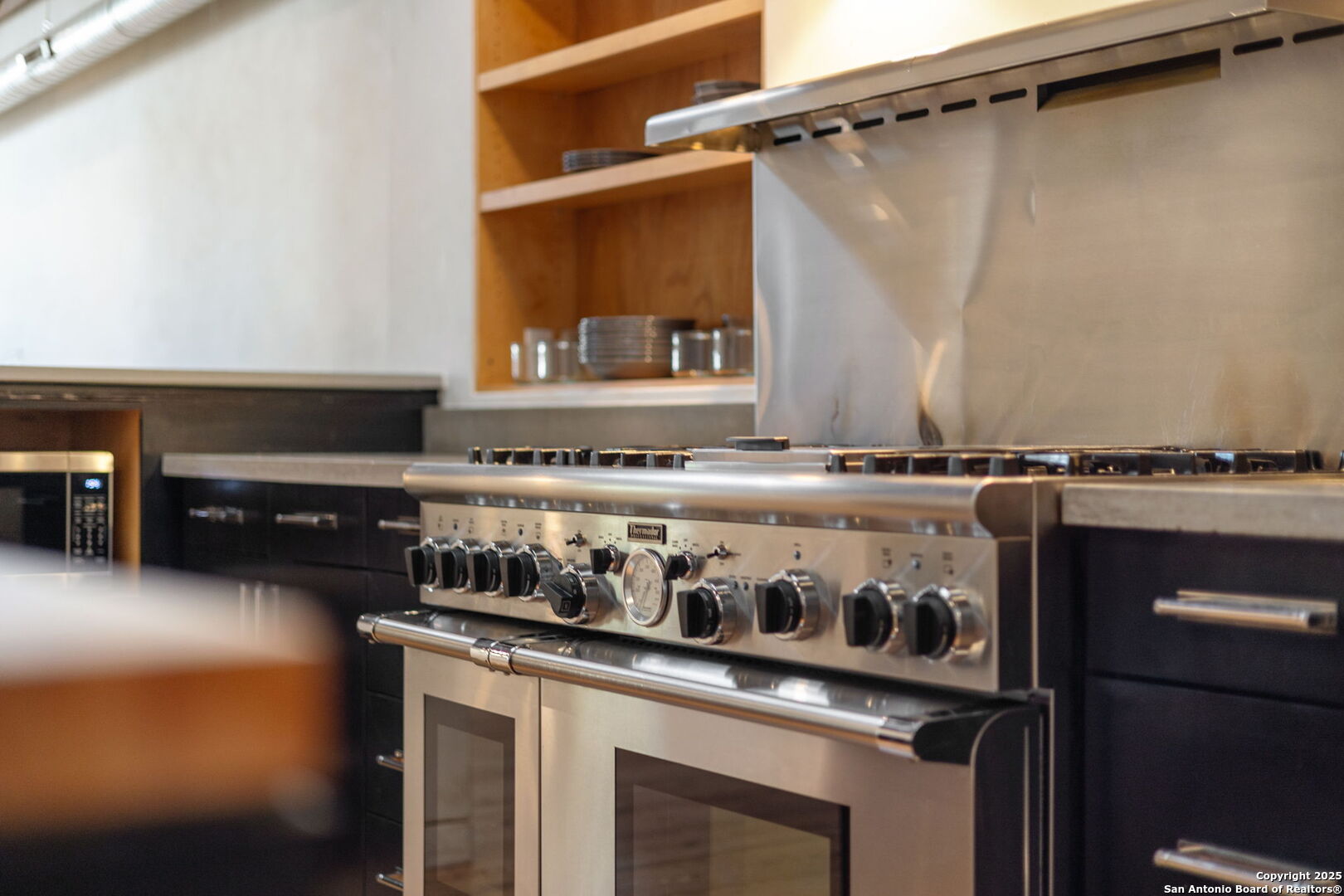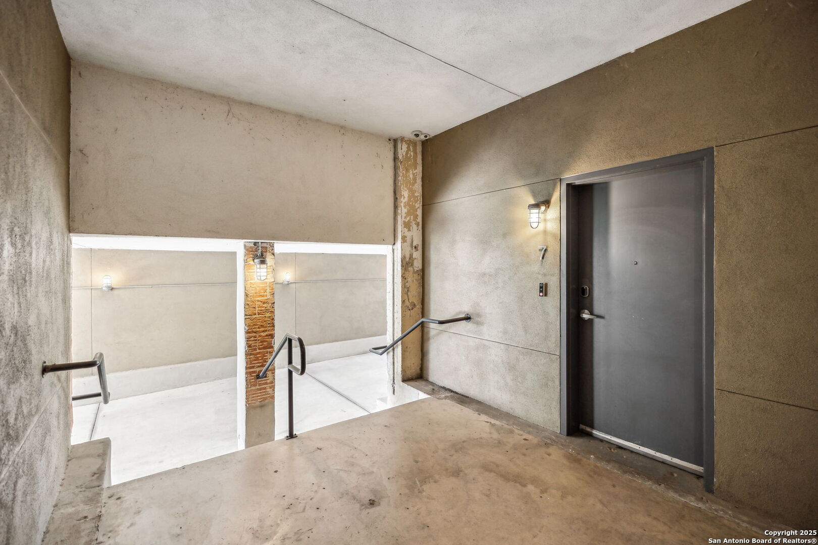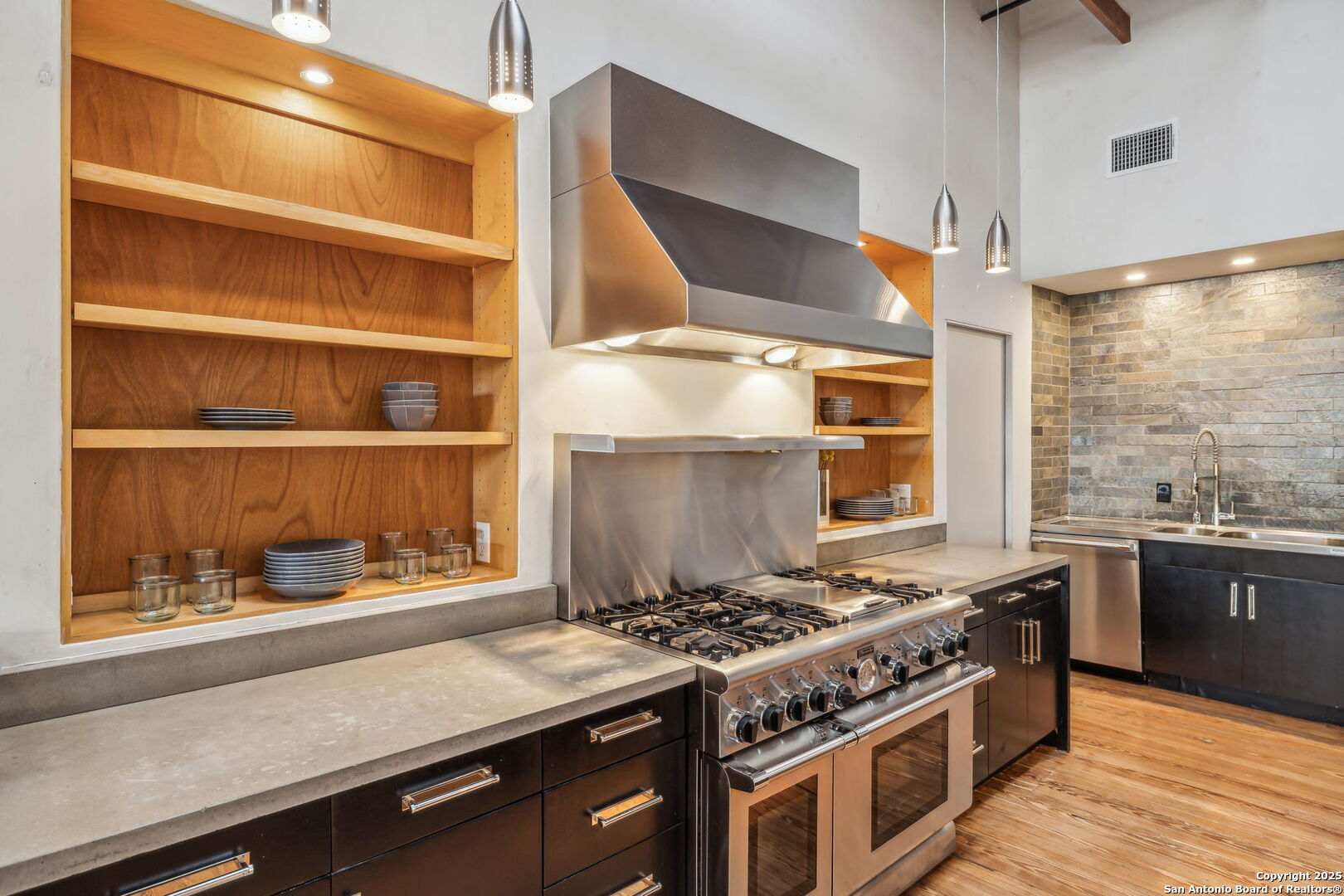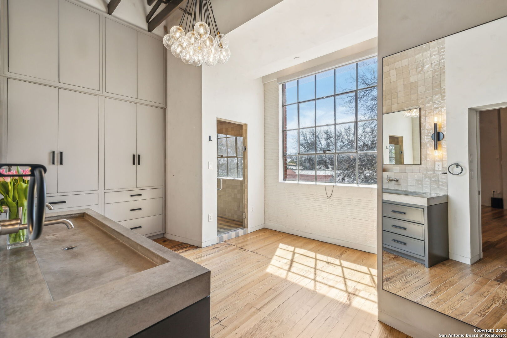 A striking fusion of industrial character and refined design, this residence offers a seamless lock-and-leave lifestyle in the heart of the King William Historic District. Two private entrances lead to a thoughtfully arranged space with views of the shared tree-filled green space. Oversized windows, soaring ceilings with exposed beams, and skylights fill the interiors with natural light, while meticulously refurbished original hardwood floors, lime-washed walls with Romabio paint, and vintage designer light fixtures add warmth and dimension. Custom cabinetry, shelving, and thoughtfully placed art niches enhance both functionality and aesthetics. / The main floor is designed with an open-concept layout, seamlessly integrating the kitchen, living, and dining areas. The kitchen is outfitted with a generous butcher's block island with a trough sink in the center, stylish lighting, and Thermador appliances, including a gas range and ice maker. / The secluded primary bedroom features a fully customized closet system and a spa-worthy ensuite bath. / A stunning secondary living space downstairs offers options for work, relaxation, or entertaining. / Rooftop access provides breathtaking downtown views and a great space to relax. / Perfectly positioned just steps from King William's vibrant scene yet offering a private and tranquil retreat. / The residence includes a side-by-side refrigerator, stackable washer/dryer, Sonos speakers, and two parking spaces (garage as well as one covered).