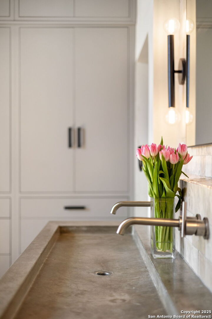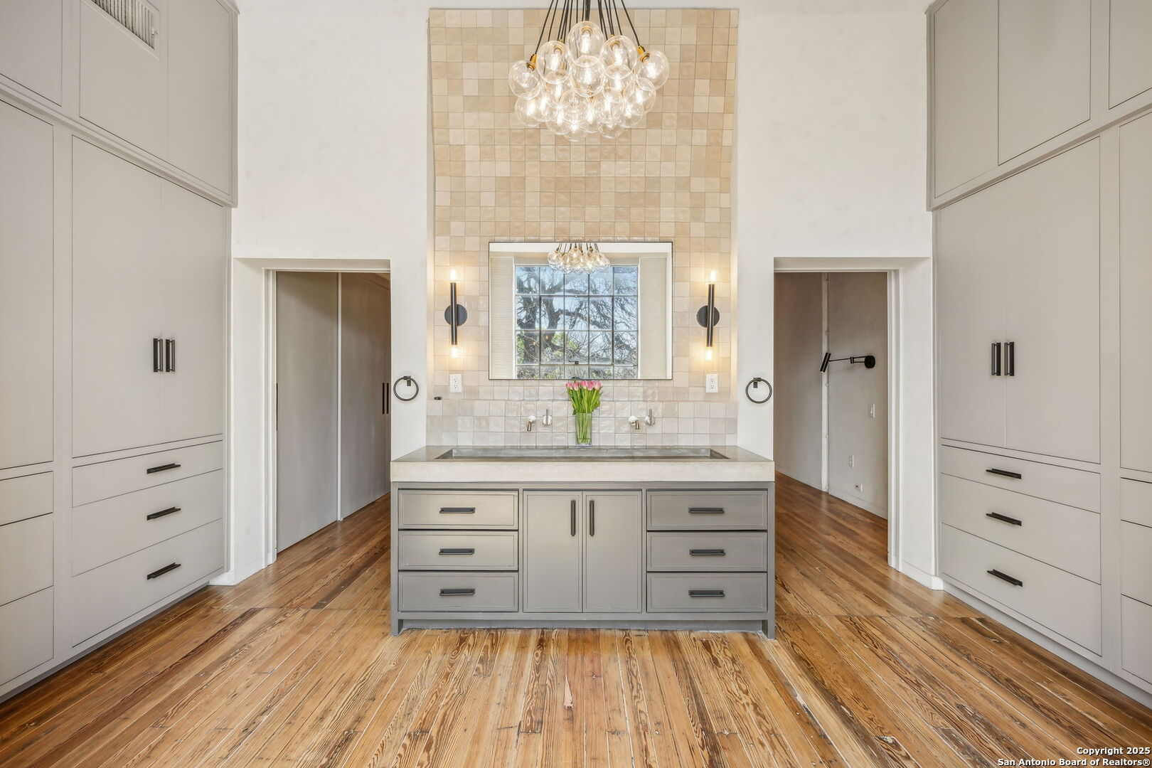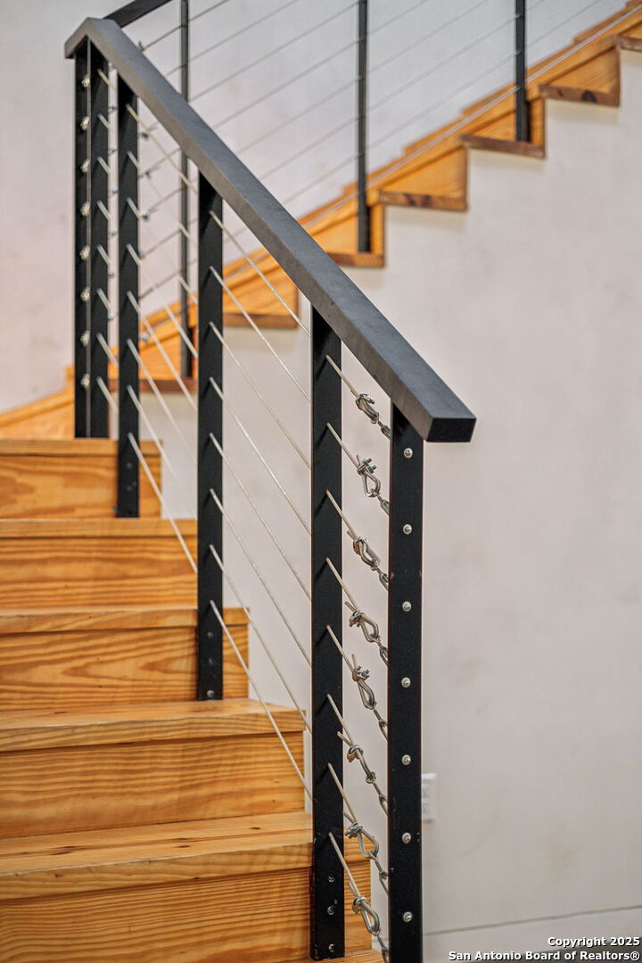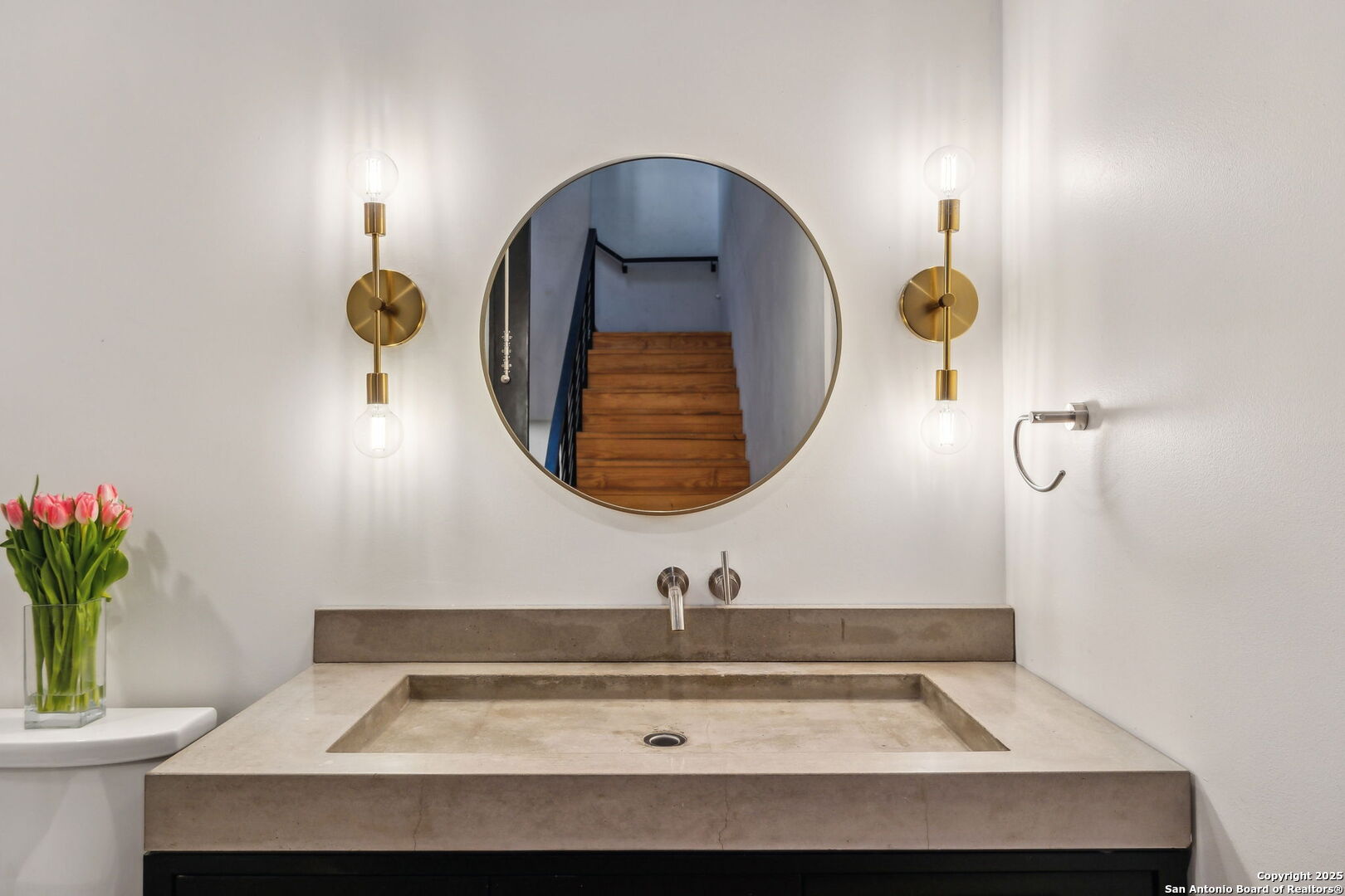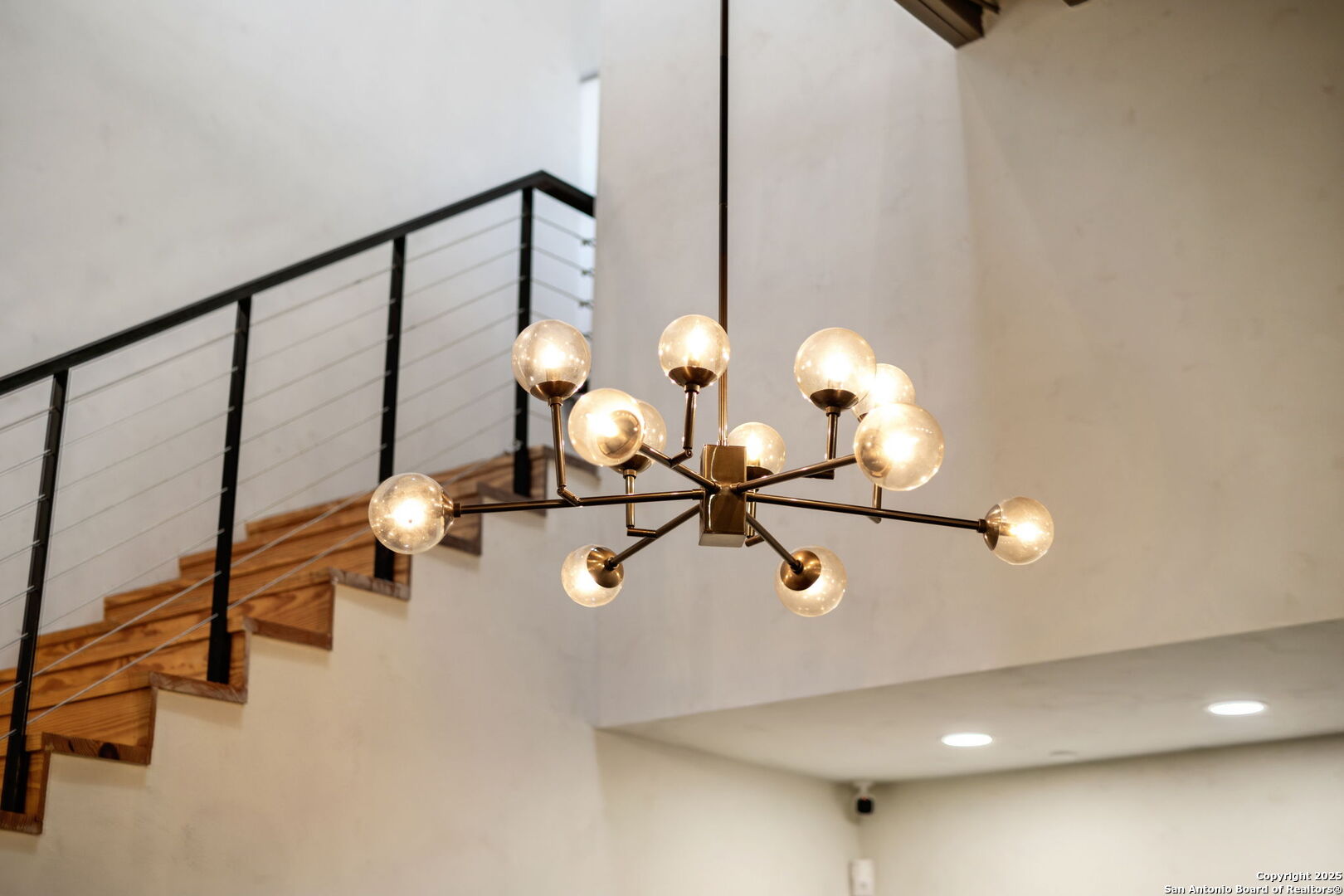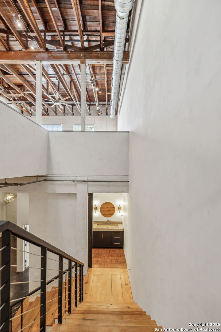 A striking fusion of industrial character and refined design, this residence offers a seamless lock-and-leave lifestyle in the heart of the King William Historic District. Two private entrances lead to a thoughtfully arranged space with views of the shared tree-filled green space. Oversized windows, soaring ceilings with exposed beams, and skylights fill the interiors with natural light, while meticulously refurbished original hardwood floors, lime-washed walls with Romabio paint, and vintage designer light fixtures add warmth and dimension. Custom cabinetry, shelving, and thoughtfully placed art niches enhance both functionality and aesthetics. / The main floor is designed with an open-concept layout, seamlessly integrating the kitchen, living, and dining areas. The kitchen is outfitted with a generous butcher's block island with a trough sink in the center, stylish lighting, and Thermador appliances, including a gas range and ice maker. / The secluded primary bedroom features a fully customized closet system and a spa-worthy ensuite bath. / A stunning secondary living space downstairs offers options for work, relaxation, or entertaining. / Rooftop access provides breathtaking downtown views and a great space to relax. / Perfectly positioned just steps from King William's vibrant scene yet offering a private and tranquil retreat. / The residence includes a side-by-side refrigerator, stackable washer/dryer, Sonos speakers, and two parking spaces (garage as well as one covered).