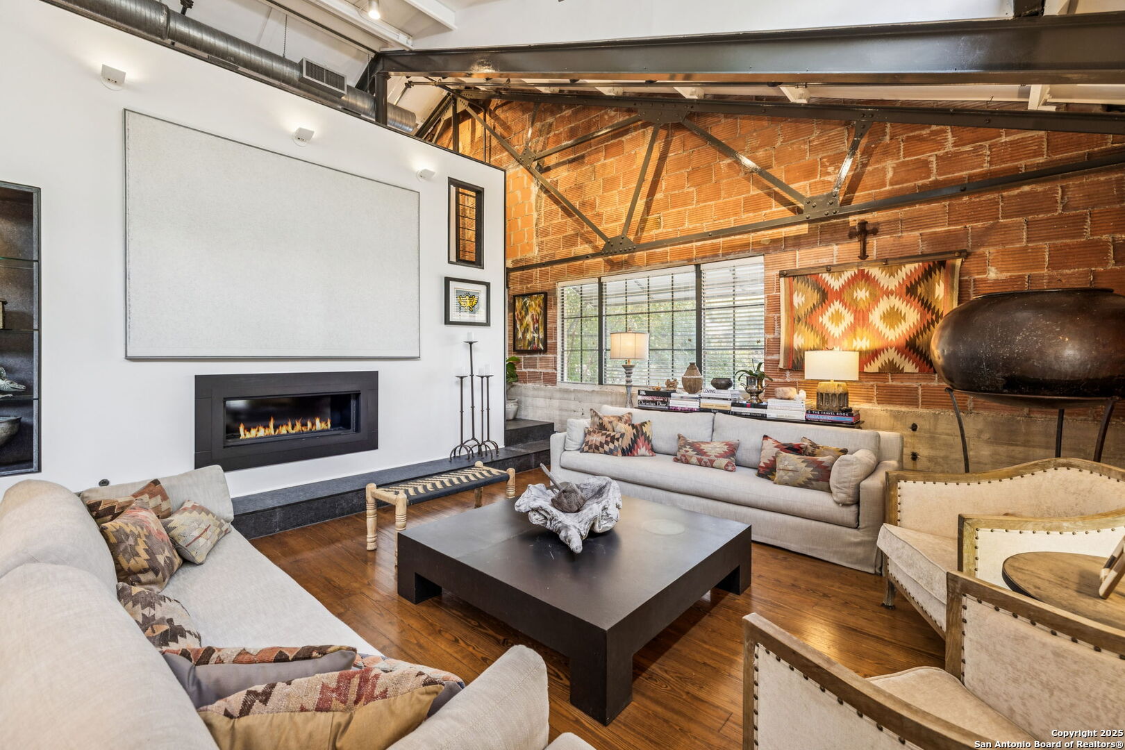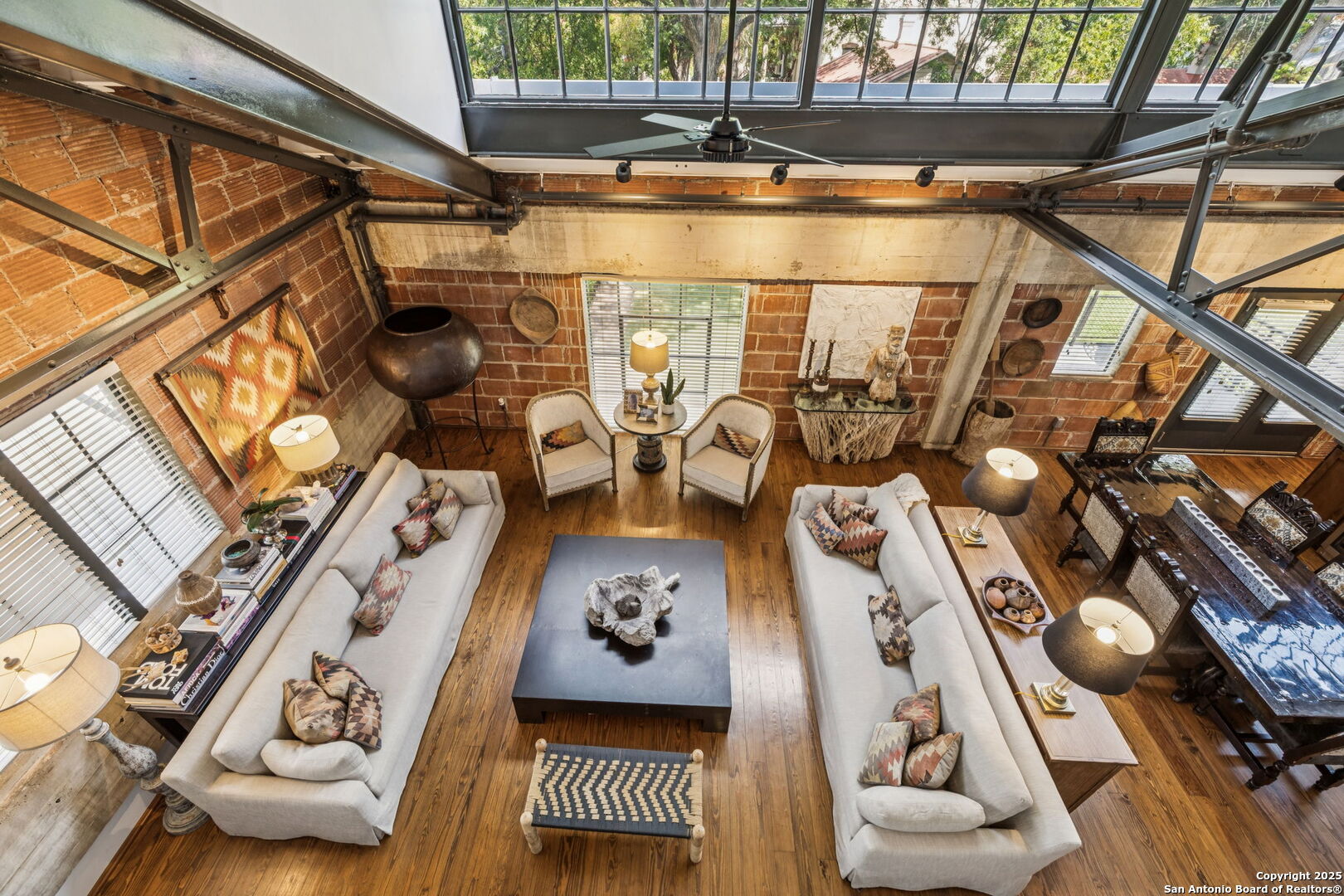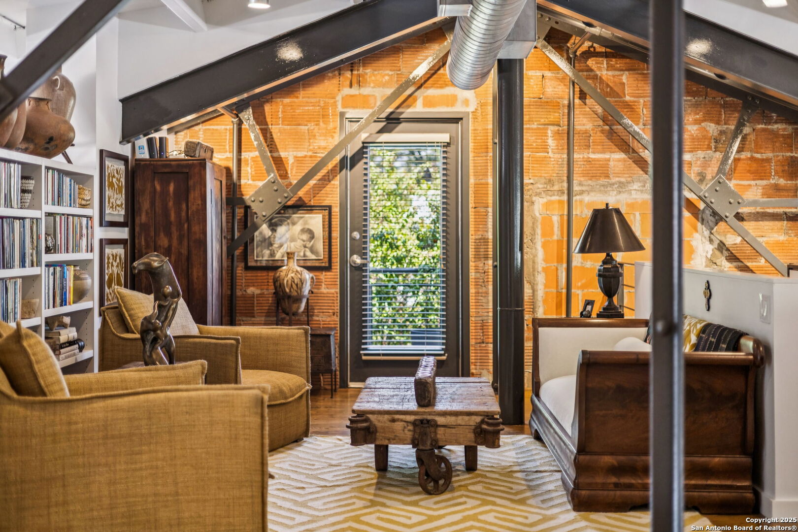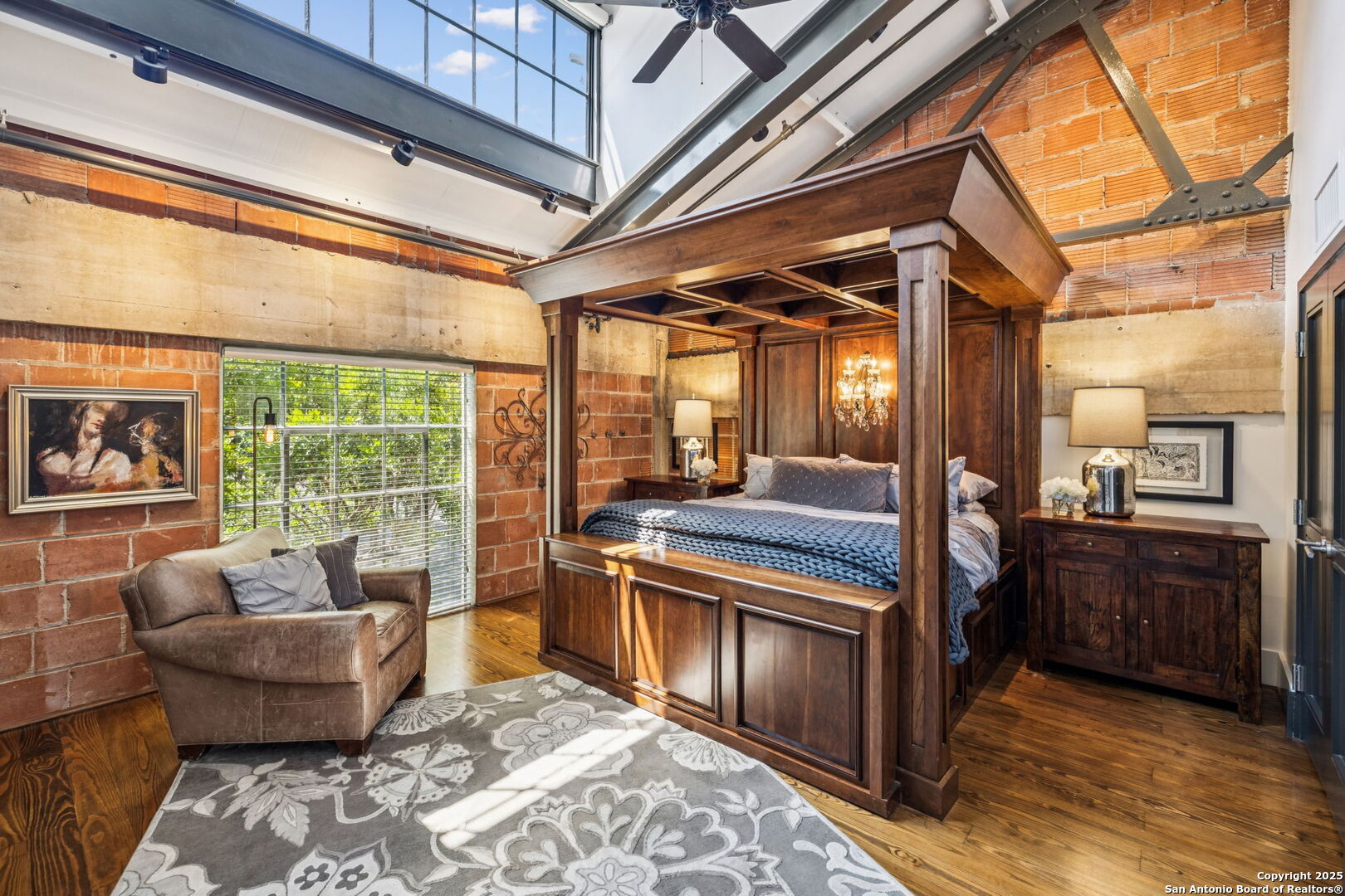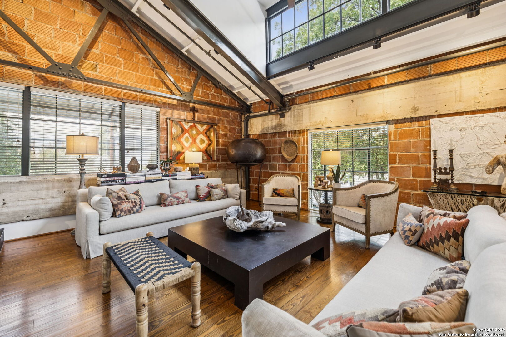 An extraordinary residence within the oldest historic neighborhood in Texas - San Antonio's King William Historic District, this 4,014-square-foot loft unfolds across three levels. Steel beams and exposed brick form the backdrop for interiors that move fluidly between grand gathering spaces and more intimate alcoves, punctuated by multiple patios and balconies that extend the living experience outward. The floor plan offers four distinct living areas, each with its own atmosphere: from a soaring double-height living room edged in industrial windows to fireside seating arranged with sculptural precision. The kitchen takes its place as a functional and aesthetic centerpiece, finished in warm wood cabinetry, professional-grade appliances with gas cooking and dekton countertops Two private bedroom suites anchor the plan, complemented by additional flexible sleeping areas and four full baths. The primary suite is a dramatic gesture in wood and steel, crowned by a custom canopy bed beneath vaulted trusses, with a Japanese copper soaking tub fed by a ceiling-mounted faucet creating a striking focal point in the bath. A curated environment that is part gallery and part sanctuary, this residence offers the scale and function of a house within San Antonio's most storied district and stands as one of its rarest offerings. 4,014 sq ft 2 bedroom suites (with 1-2 additional sleeping areas) 4 full baths 4 living areas 3-levels 4 patio/balconies