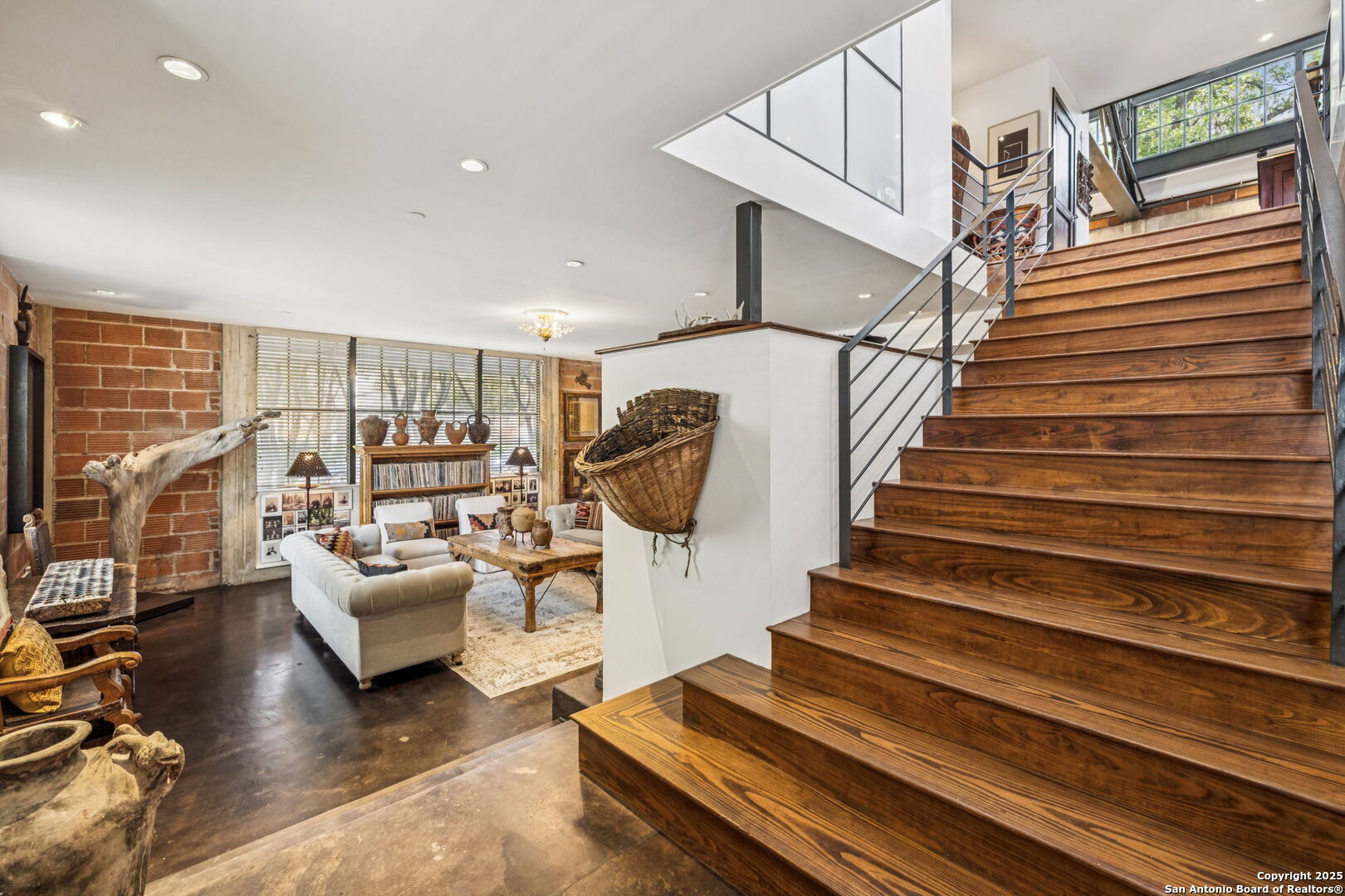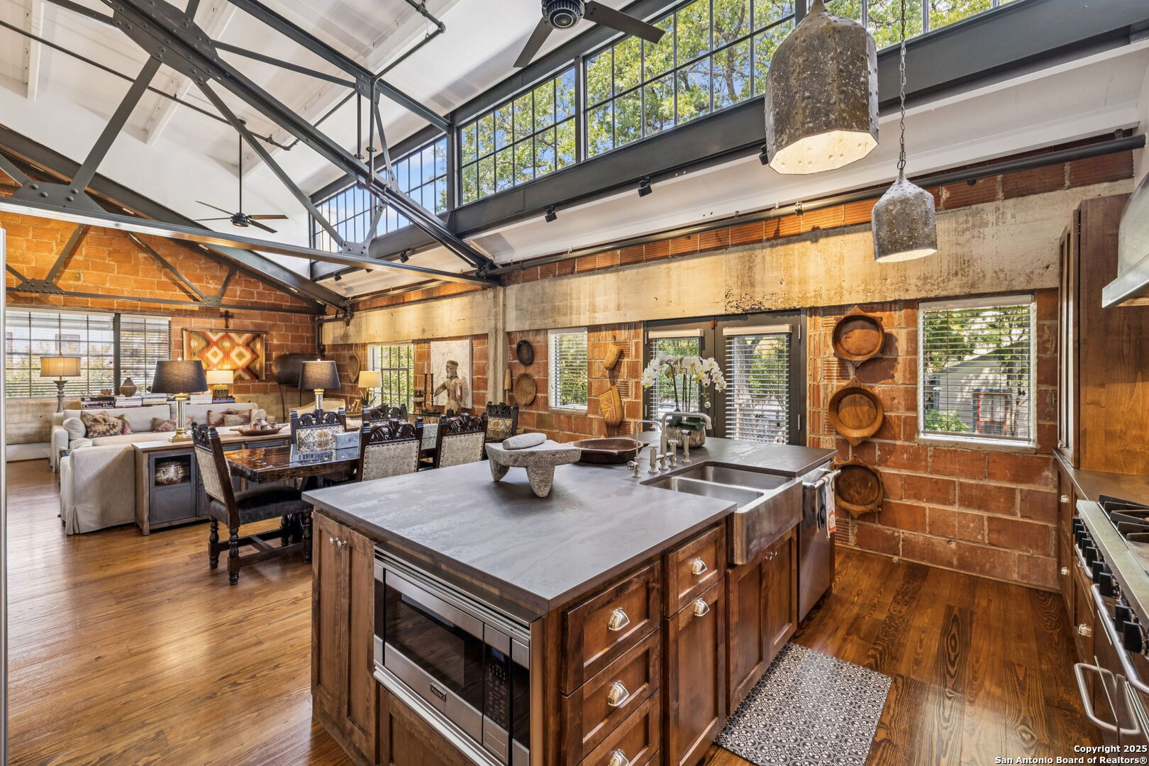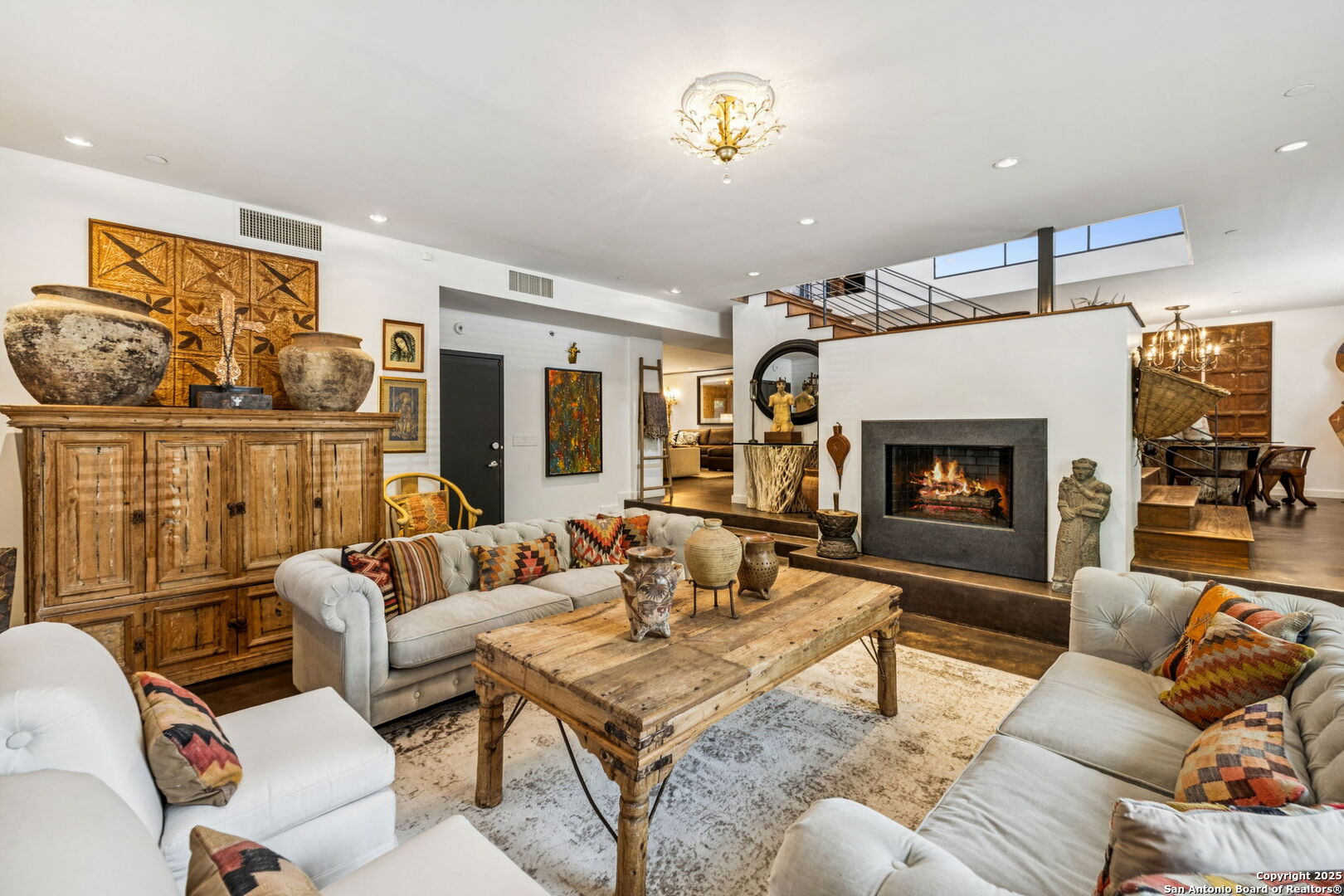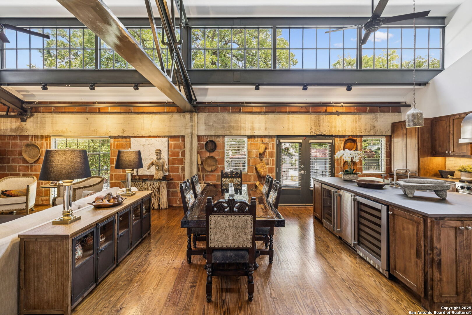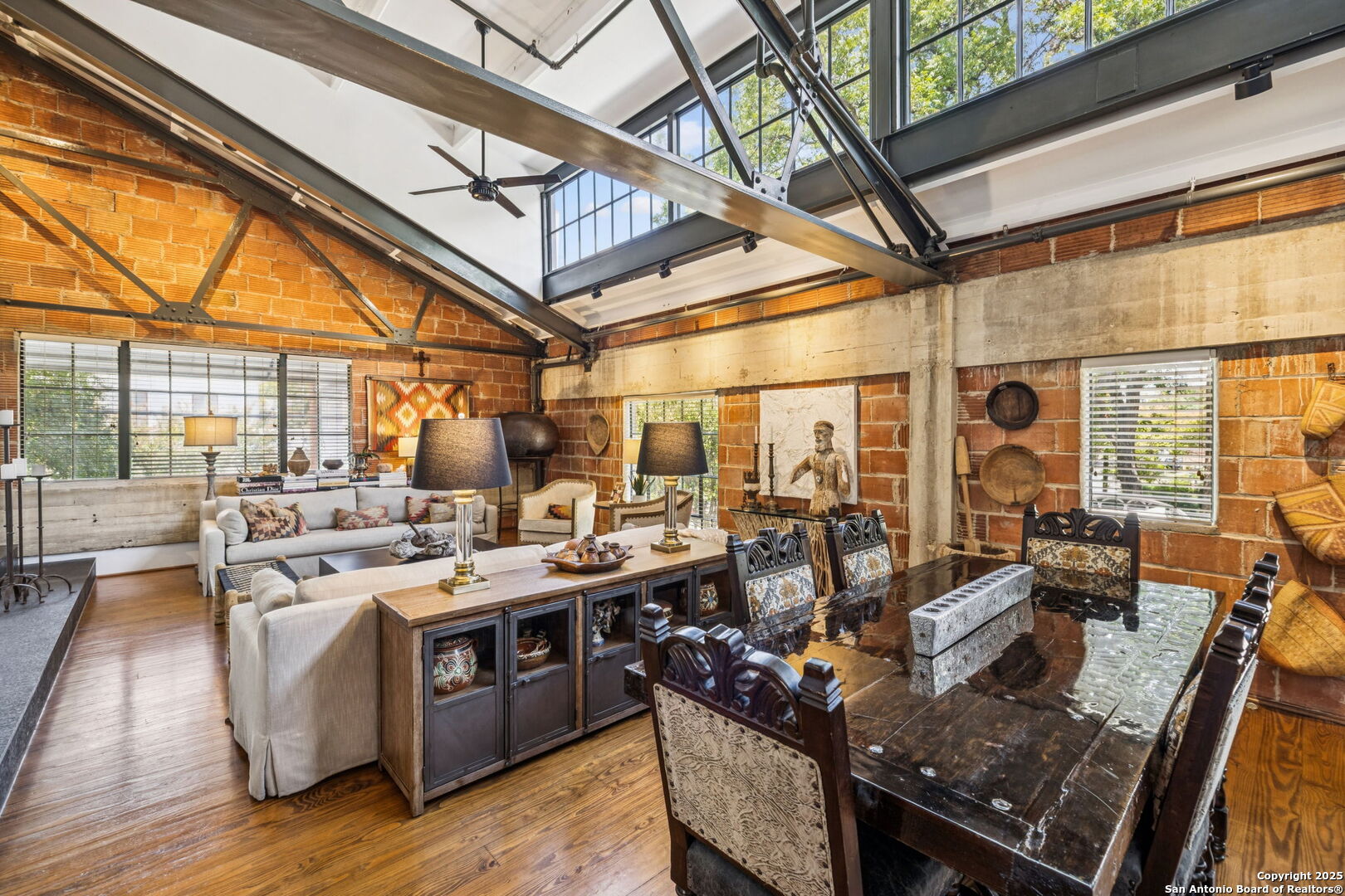 An extraordinary residence within the oldest historic neighborhood in Texas - San Antonio's King William Historic District, this 4,014-square-foot loft unfolds across three levels. Steel beams and exposed brick form the backdrop for interiors that move fluidly between grand gathering spaces and more intimate alcoves, punctuated by multiple patios and balconies that extend the living experience outward. The floor plan offers four distinct living areas, each with its own atmosphere: from a soaring double-height living room edged in industrial windows to fireside seating arranged with sculptural precision. The kitchen takes its place as a functional and aesthetic centerpiece, finished in warm wood cabinetry, professional-grade appliances with gas cooking and dekton countertops Two private bedroom suites anchor the plan, complemented by additional flexible sleeping areas and four full baths. The primary suite is a dramatic gesture in wood and steel, crowned by a custom canopy bed beneath vaulted trusses, with a Japanese copper soaking tub fed by a ceiling-mounted faucet creating a striking focal point in the bath. A curated environment that is part gallery and part sanctuary, this residence offers the scale and function of a house within San Antonio's most storied district and stands as one of its rarest offerings. 4,014 sq ft 2 bedroom suites (with 1-2 additional sleeping areas) 4 full baths 4 living areas 3-levels 4 patio/balconies