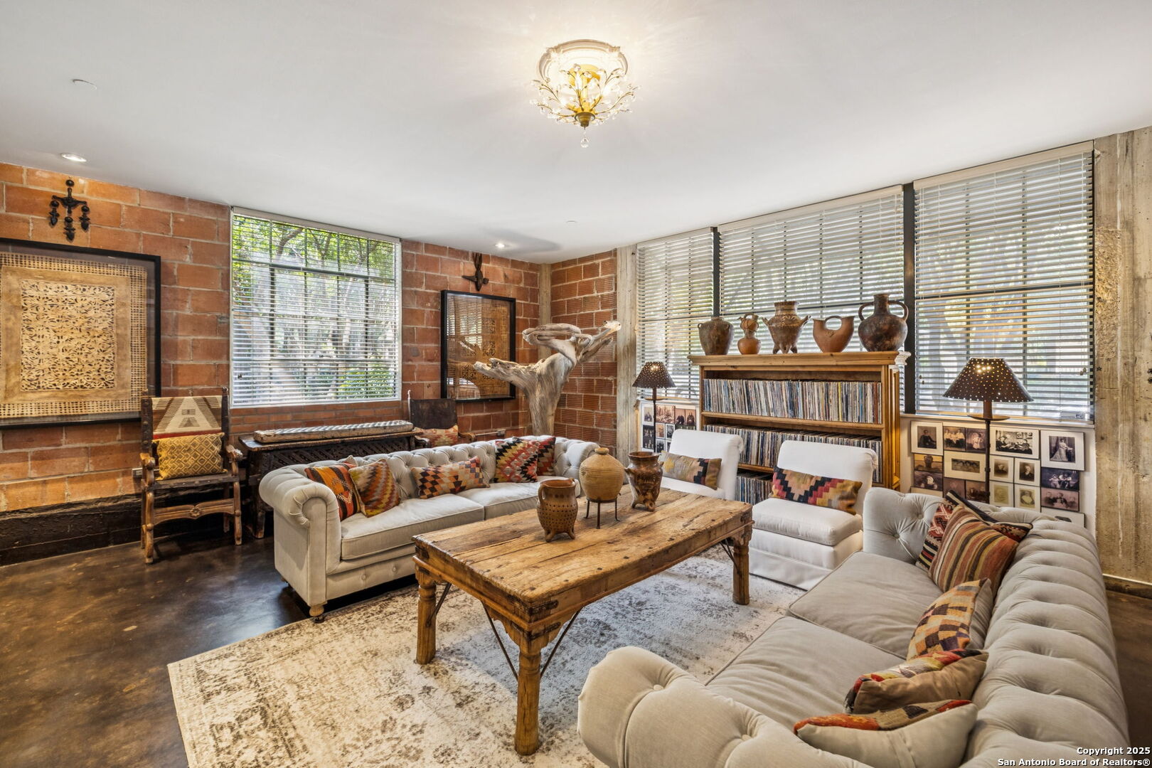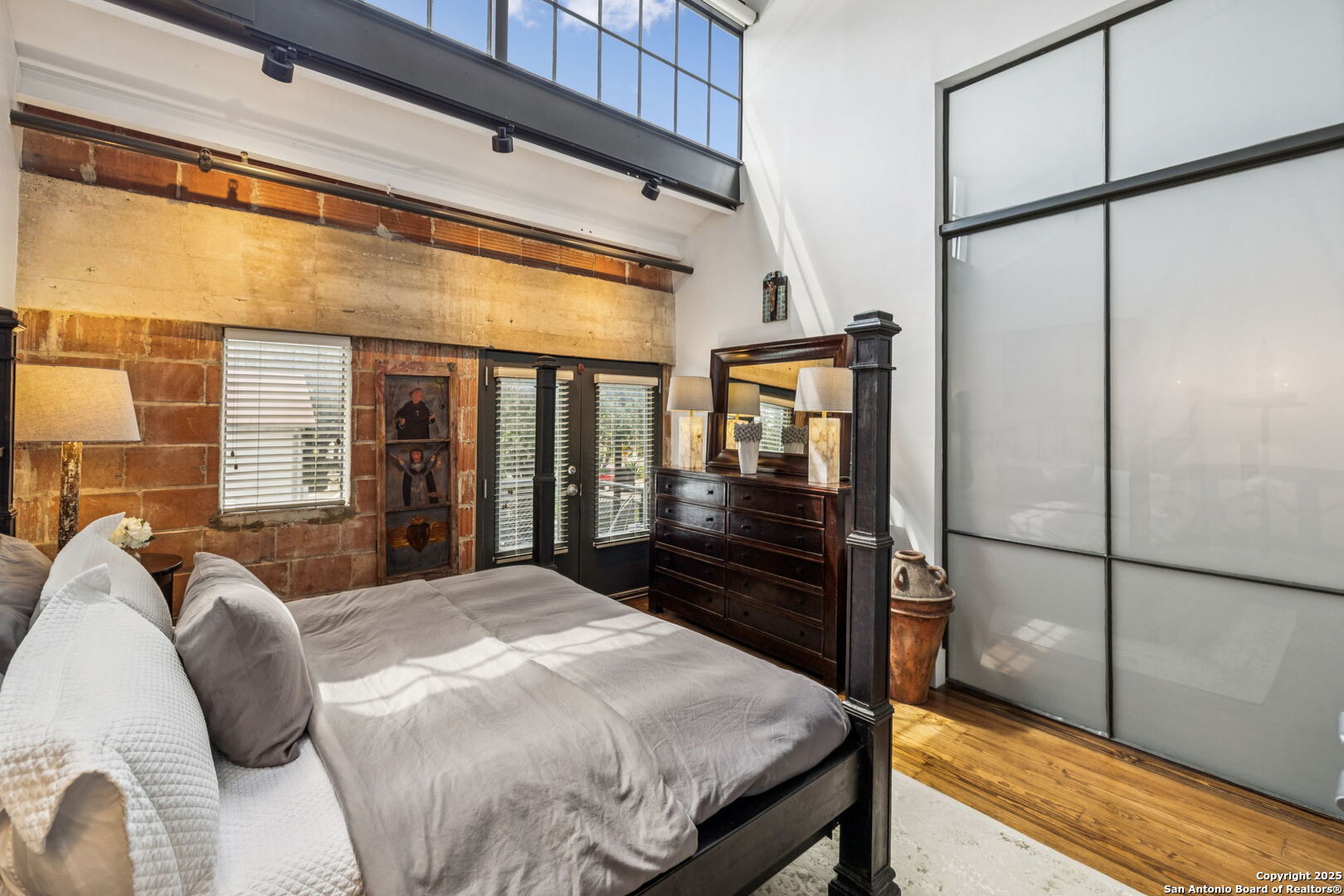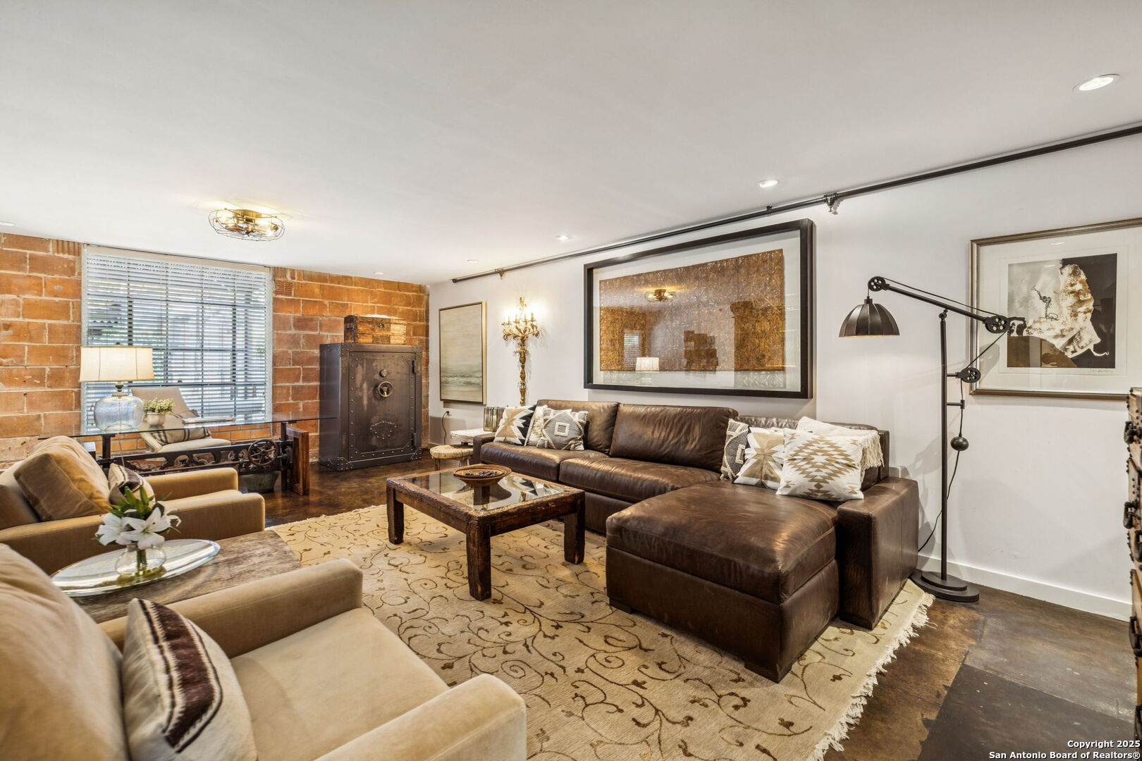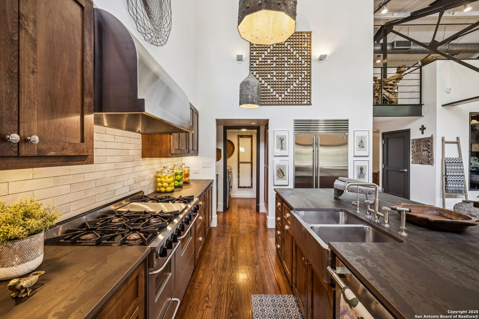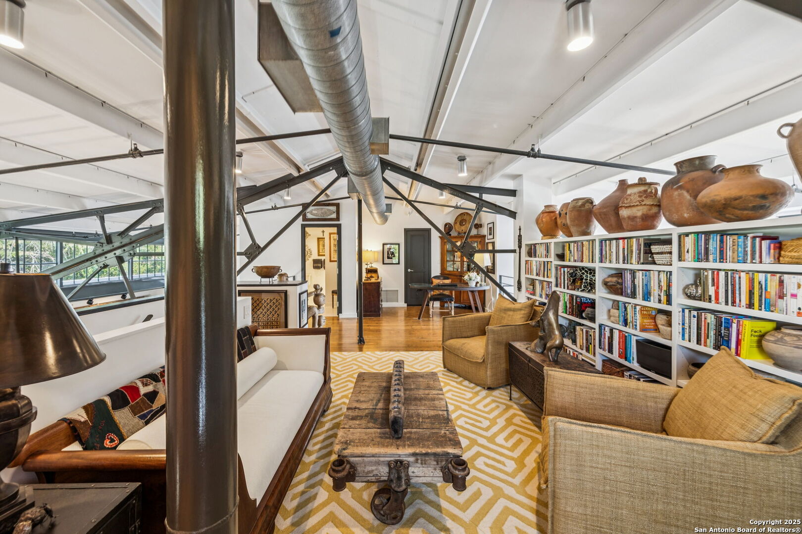 An extraordinary residence within the oldest historic neighborhood in Texas - San Antonio's King William Historic District, this 4,014-square-foot loft unfolds across three levels. Steel beams and exposed brick form the backdrop for interiors that move fluidly between grand gathering spaces and more intimate alcoves, punctuated by multiple patios and balconies that extend the living experience outward. The floor plan offers four distinct living areas, each with its own atmosphere: from a soaring double-height living room edged in industrial windows to fireside seating arranged with sculptural precision. The kitchen takes its place as a functional and aesthetic centerpiece, finished in warm wood cabinetry, professional-grade appliances with gas cooking and dekton countertops Two private bedroom suites anchor the plan, complemented by additional flexible sleeping areas and four full baths. The primary suite is a dramatic gesture in wood and steel, crowned by a custom canopy bed beneath vaulted trusses, with a Japanese copper soaking tub fed by a ceiling-mounted faucet creating a striking focal point in the bath. A curated environment that is part gallery and part sanctuary, this residence offers the scale and function of a house within San Antonio's most storied district and stands as one of its rarest offerings. 4,014 sq ft 2 bedroom suites (with 1-2 additional sleeping areas) 4 full baths 4 living areas 3-levels 4 patio/balconies