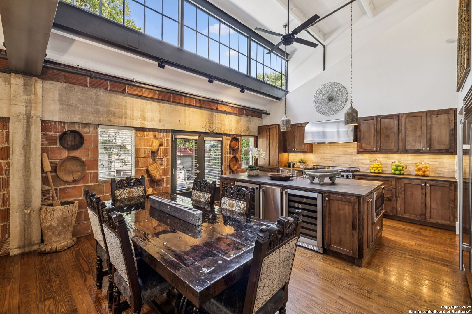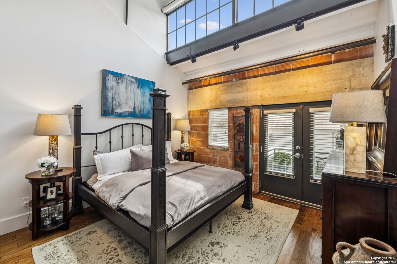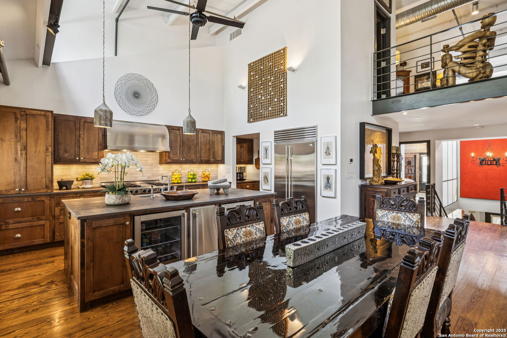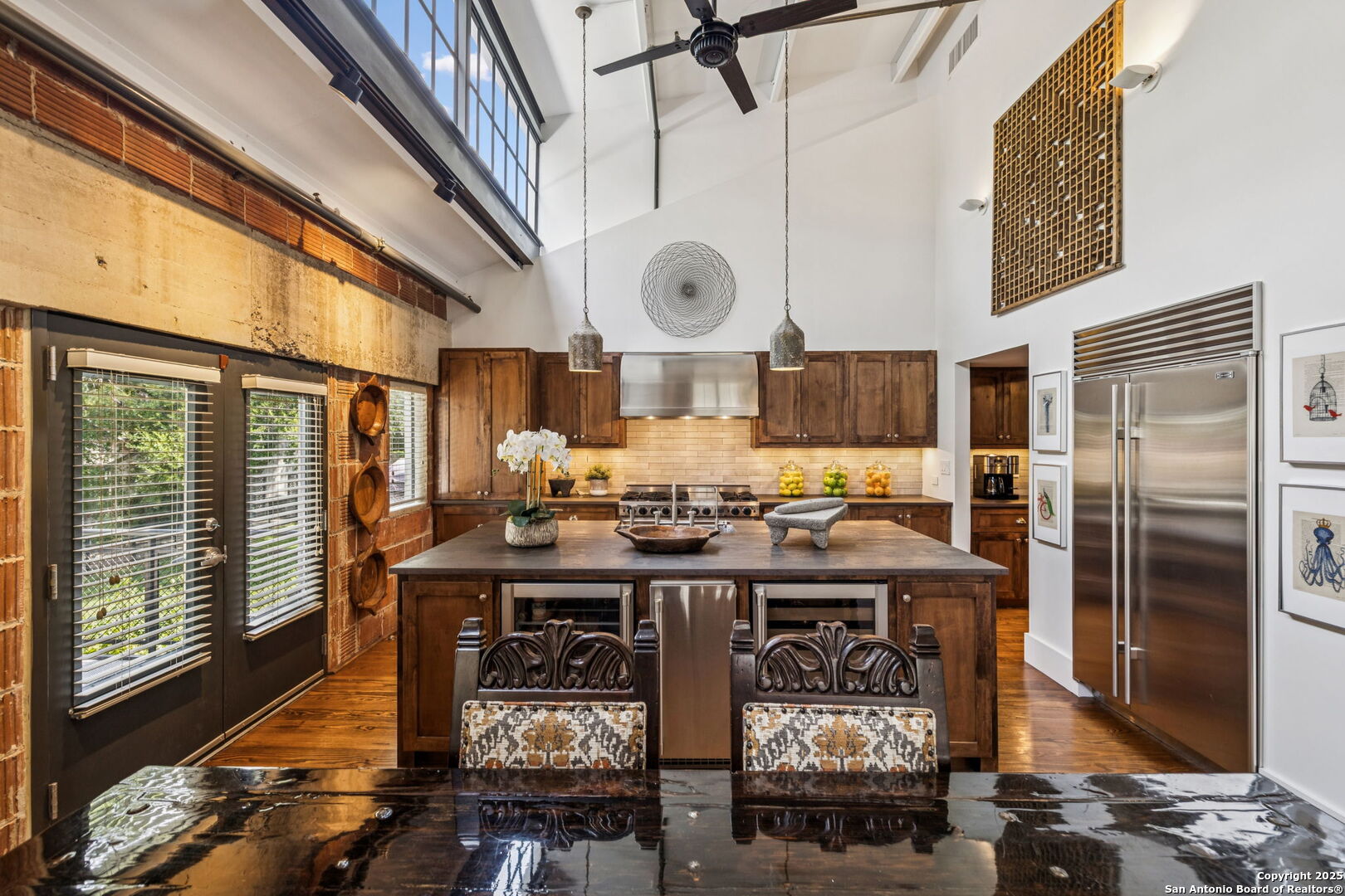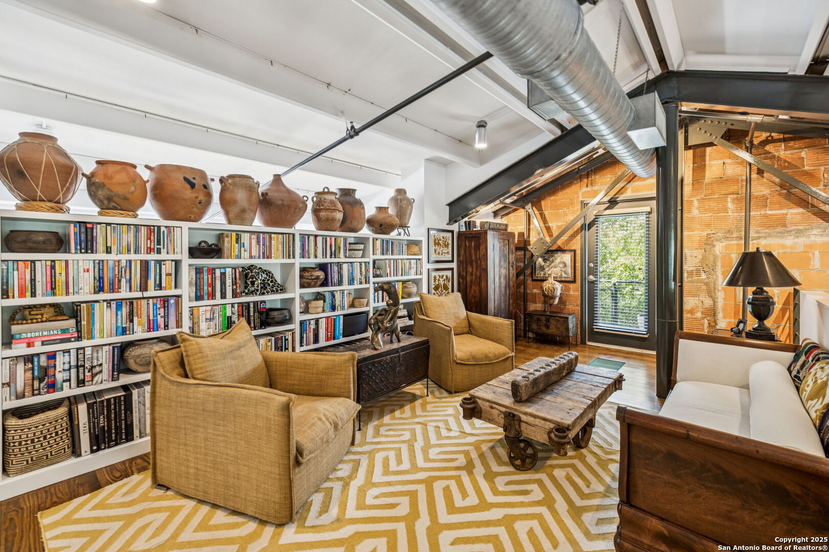 An extraordinary residence within the oldest historic neighborhood in Texas - San Antonio's King William Historic District, this 4,014-square-foot loft unfolds across three levels. Steel beams and exposed brick form the backdrop for interiors that move fluidly between grand gathering spaces and more intimate alcoves, punctuated by multiple patios and balconies that extend the living experience outward. The floor plan offers four distinct living areas, each with its own atmosphere: from a soaring double-height living room edged in industrial windows to fireside seating arranged with sculptural precision. The kitchen takes its place as a functional and aesthetic centerpiece, finished in warm wood cabinetry, professional-grade appliances with gas cooking and dekton countertops Two private bedroom suites anchor the plan, complemented by additional flexible sleeping areas and four full baths. The primary suite is a dramatic gesture in wood and steel, crowned by a custom canopy bed beneath vaulted trusses, with a Japanese copper soaking tub fed by a ceiling-mounted faucet creating a striking focal point in the bath. A curated environment that is part gallery and part sanctuary, this residence offers the scale and function of a house within San Antonio's most storied district and stands as one of its rarest offerings. 4,014 sq ft 2 bedroom suites (with 1-2 additional sleeping areas) 4 full baths 4 living areas 3-levels 4 patio/balconies
