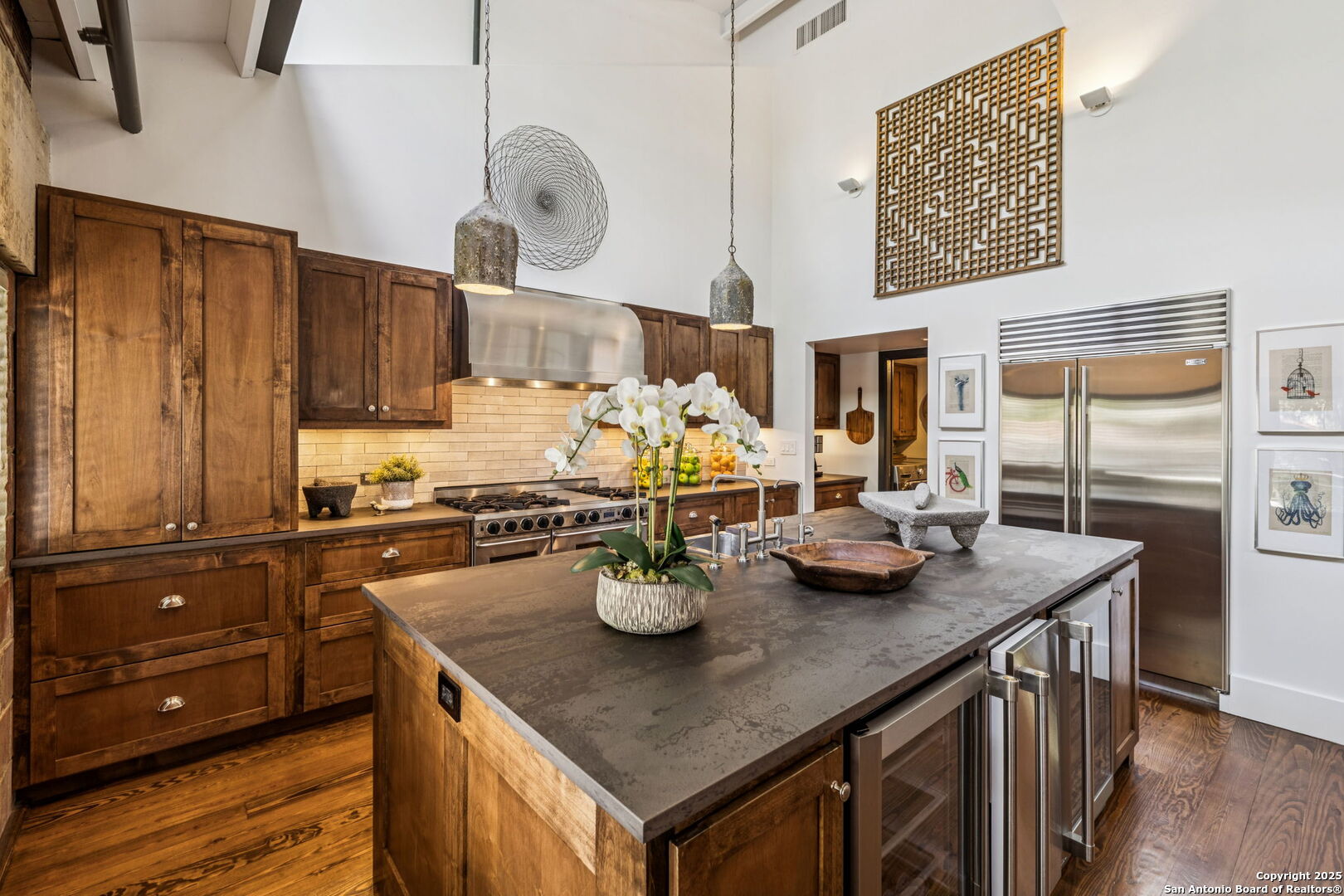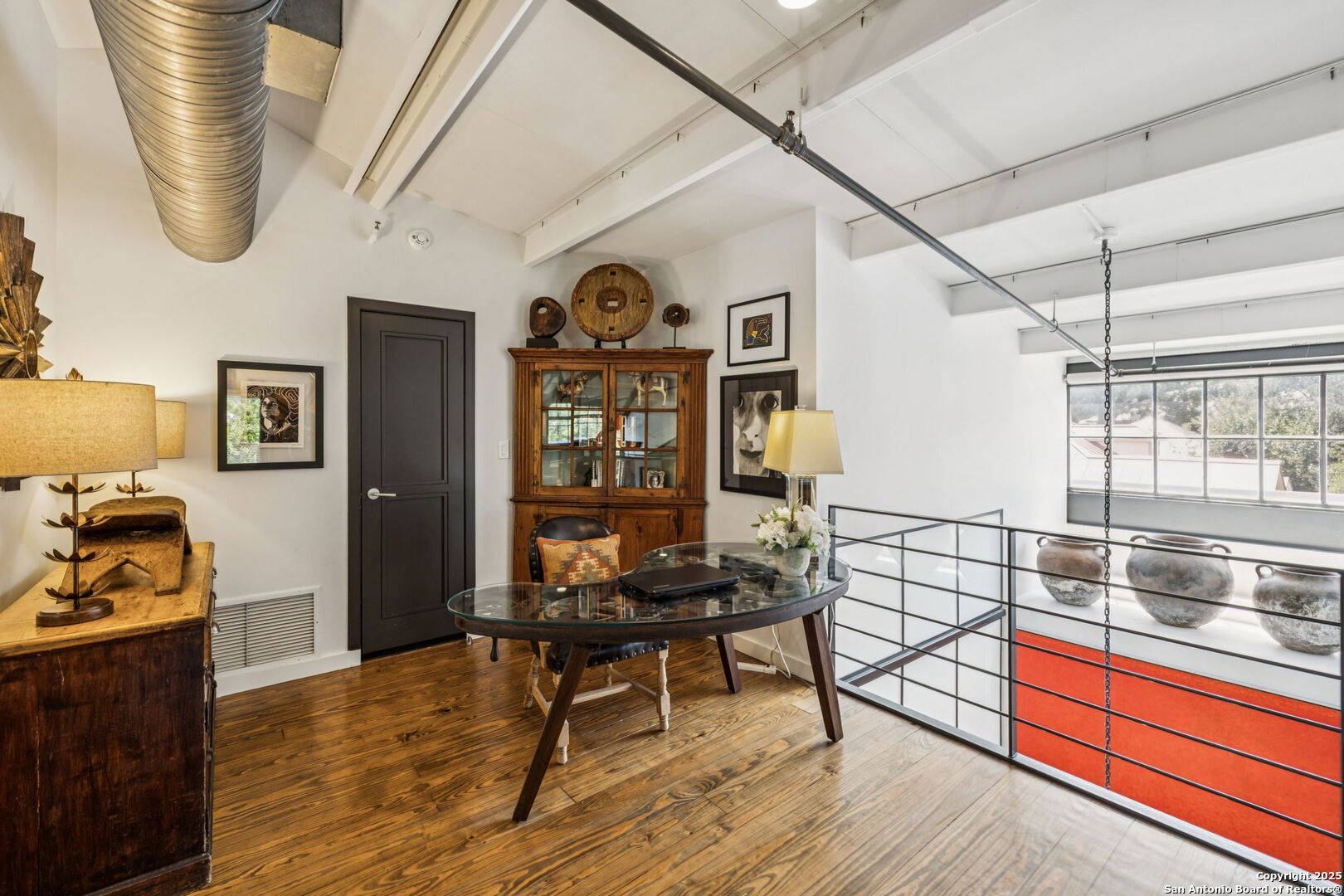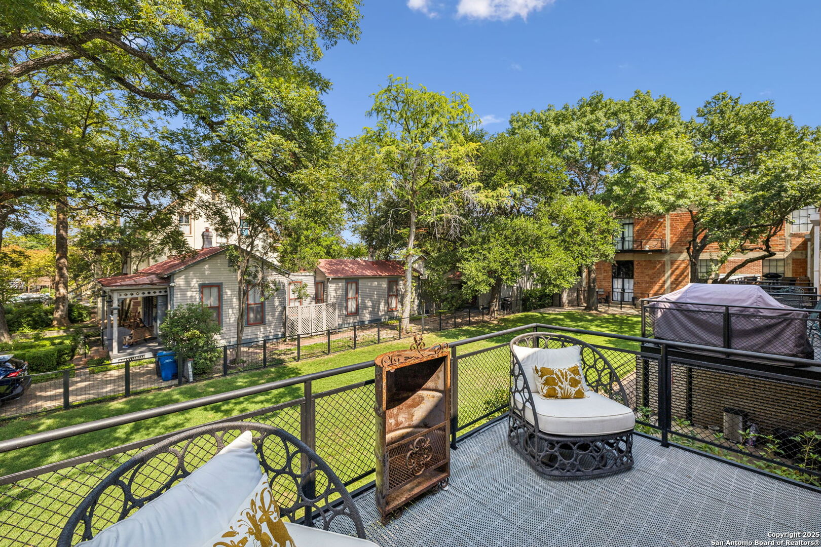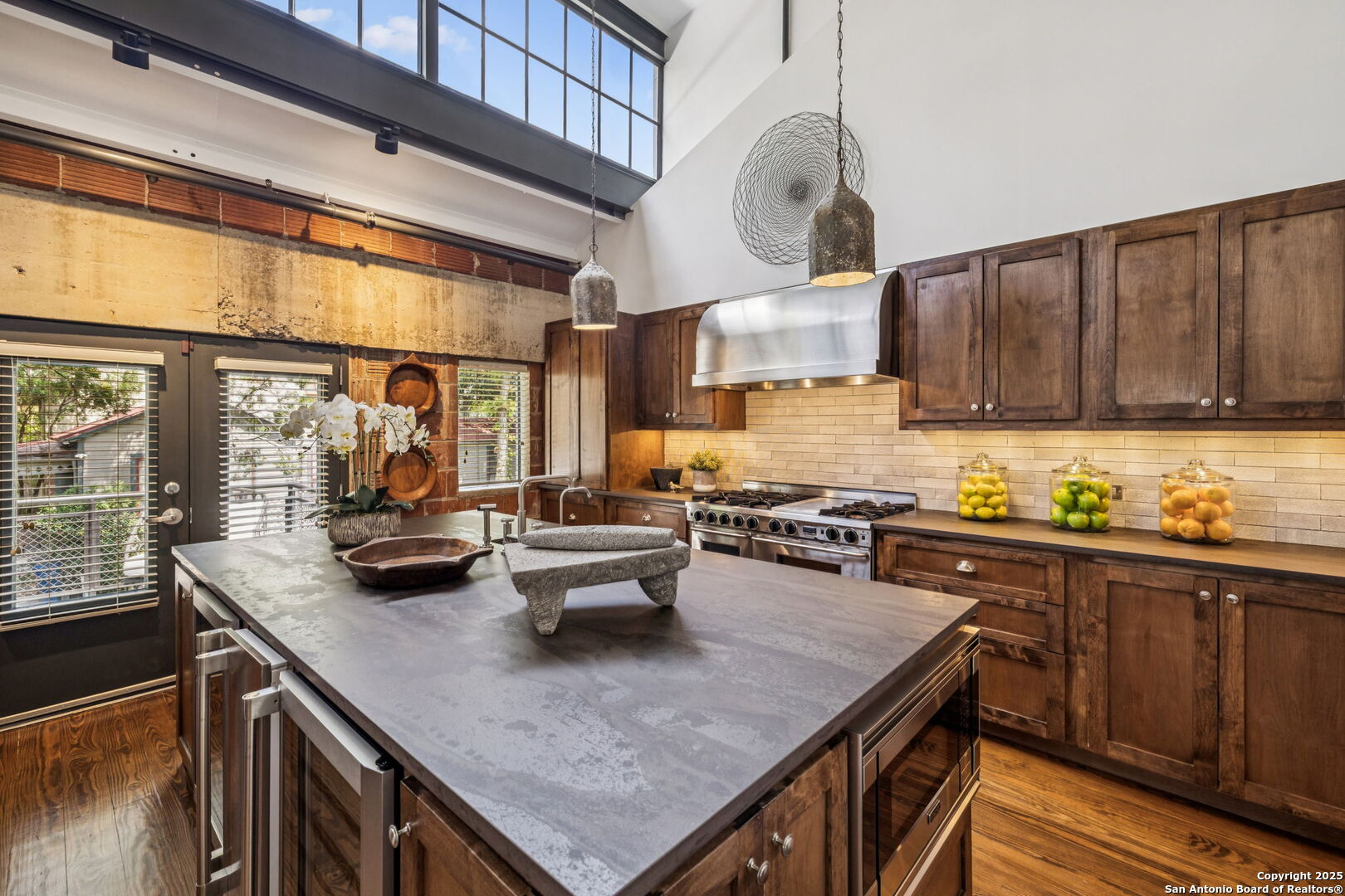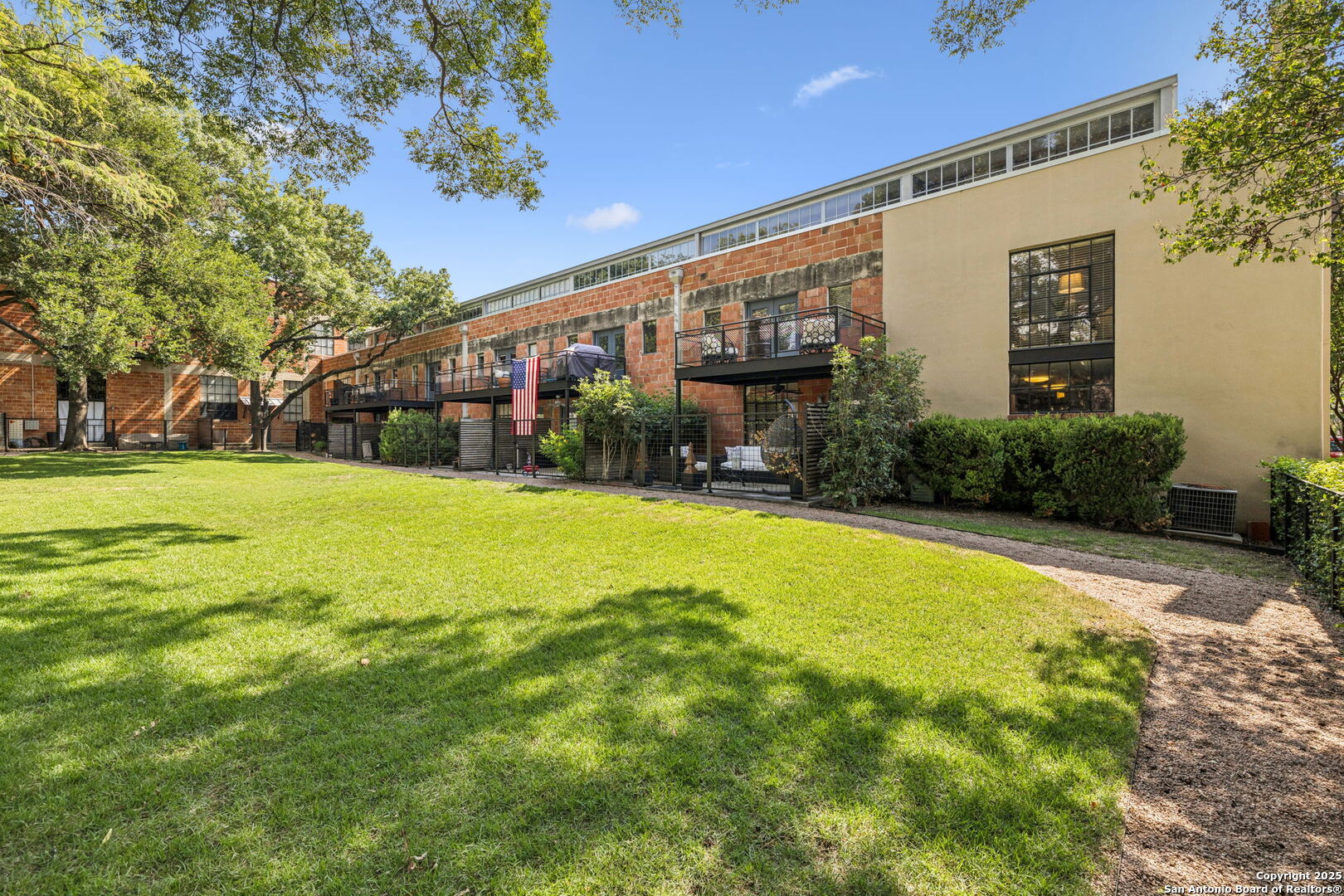 An extraordinary residence within the oldest historic neighborhood in Texas - San Antonio's King William Historic District, this 4,014-square-foot loft unfolds across three levels. Steel beams and exposed brick form the backdrop for interiors that move fluidly between grand gathering spaces and more intimate alcoves, punctuated by multiple patios and balconies that extend the living experience outward. The floor plan offers four distinct living areas, each with its own atmosphere: from a soaring double-height living room edged in industrial windows to fireside seating arranged with sculptural precision. The kitchen takes its place as a functional and aesthetic centerpiece, finished in warm wood cabinetry, professional-grade appliances with gas cooking and dekton countertops Two private bedroom suites anchor the plan, complemented by additional flexible sleeping areas and four full baths. The primary suite is a dramatic gesture in wood and steel, crowned by a custom canopy bed beneath vaulted trusses, with a Japanese copper soaking tub fed by a ceiling-mounted faucet creating a striking focal point in the bath. A curated environment that is part gallery and part sanctuary, this residence offers the scale and function of a house within San Antonio's most storied district and stands as one of its rarest offerings. 4,014 sq ft 2 bedroom suites (with 1-2 additional sleeping areas) 4 full baths 4 living areas 3-levels 4 patio/balconies