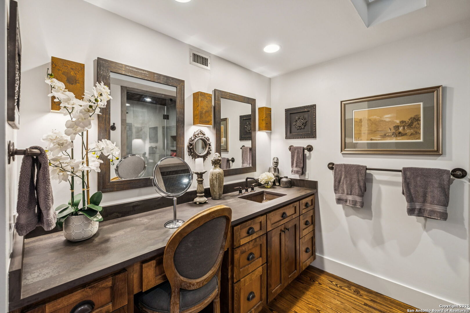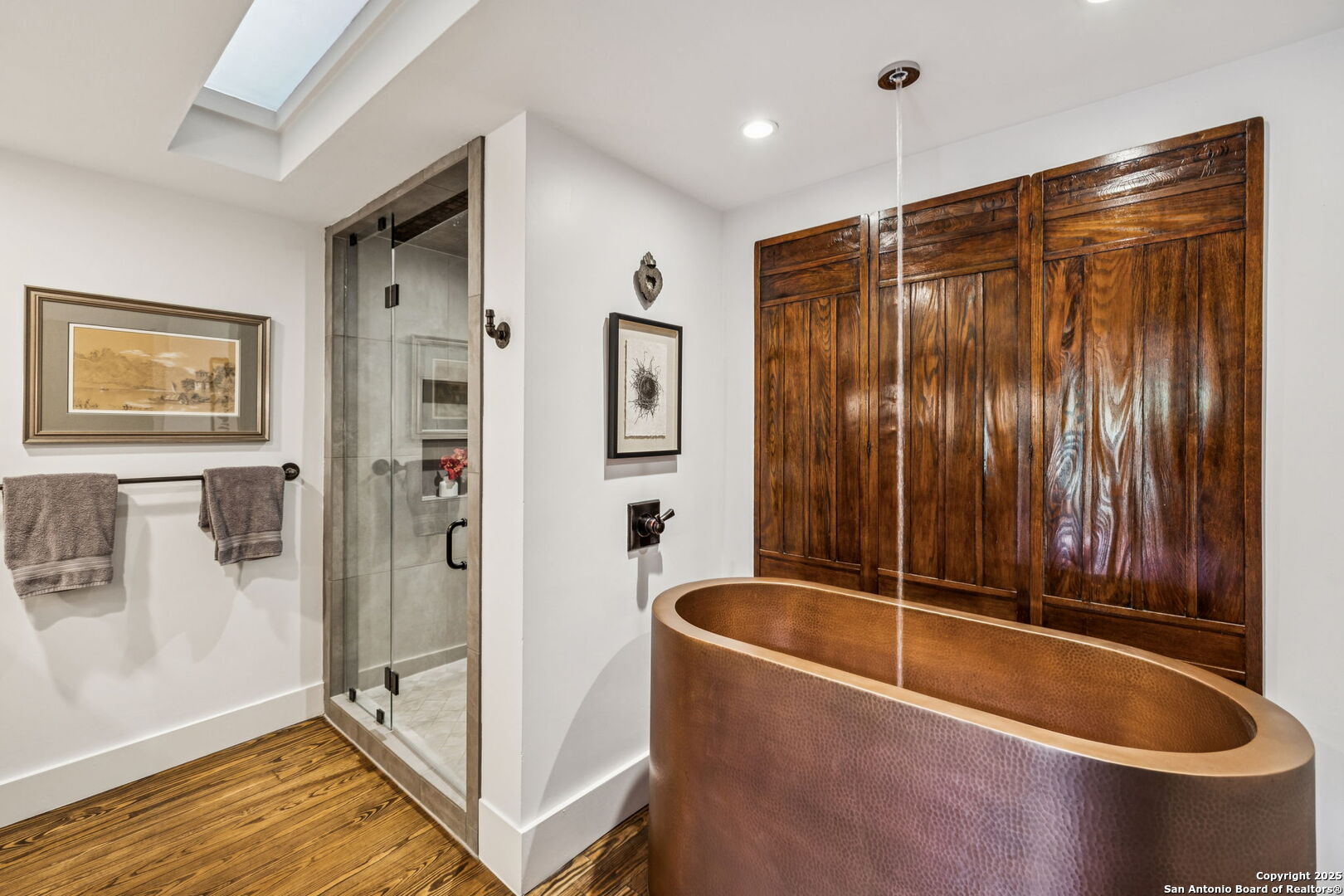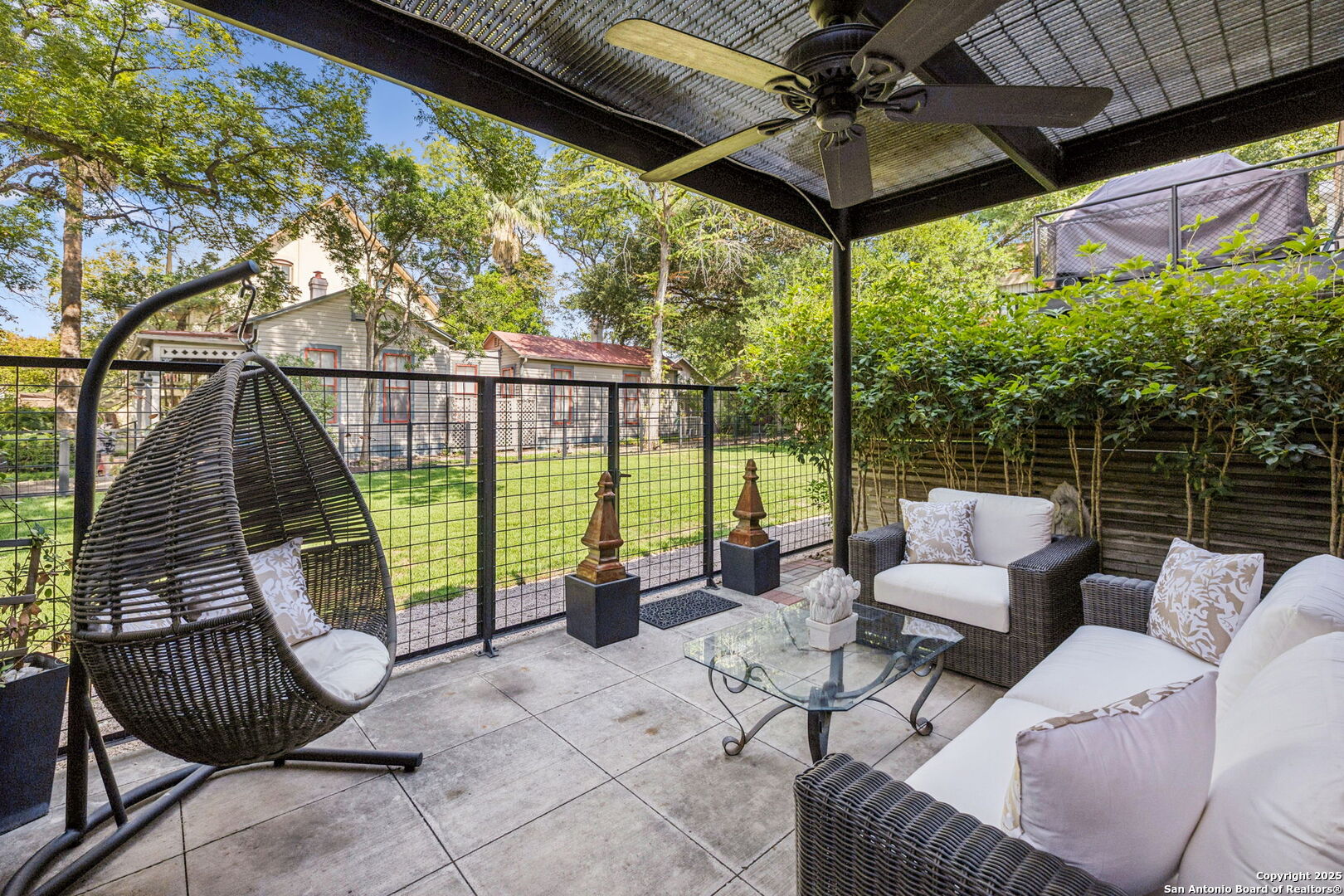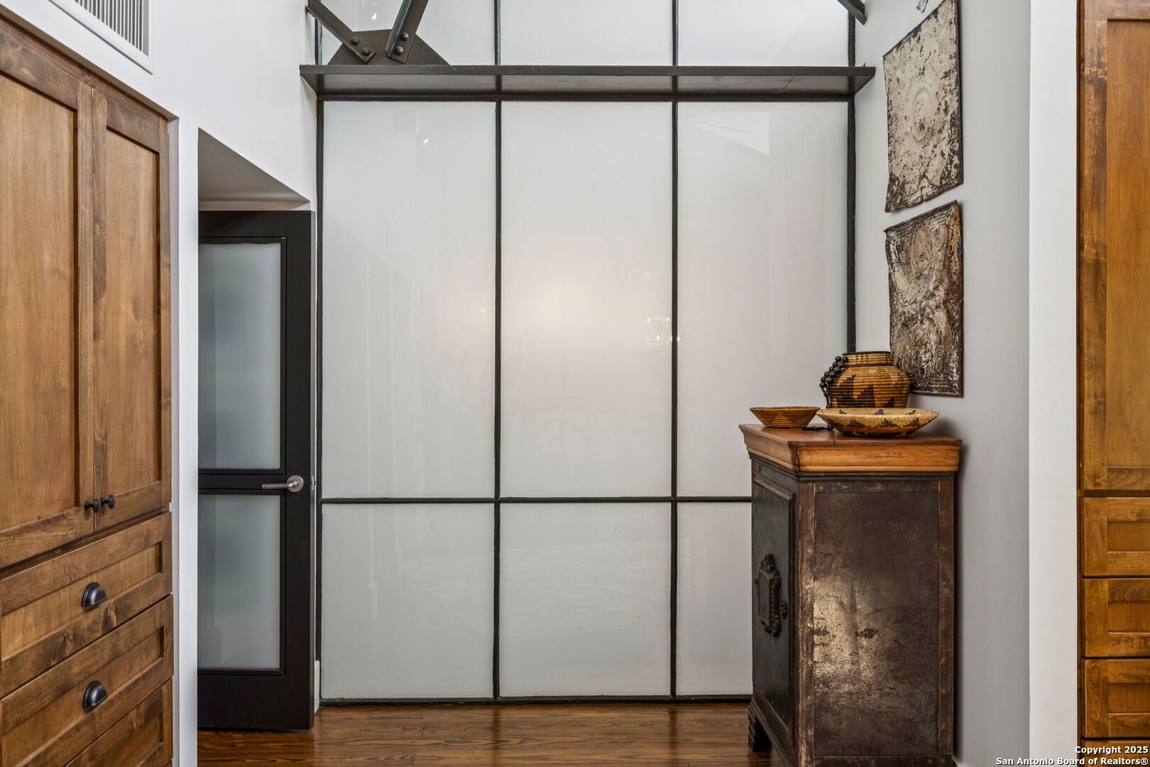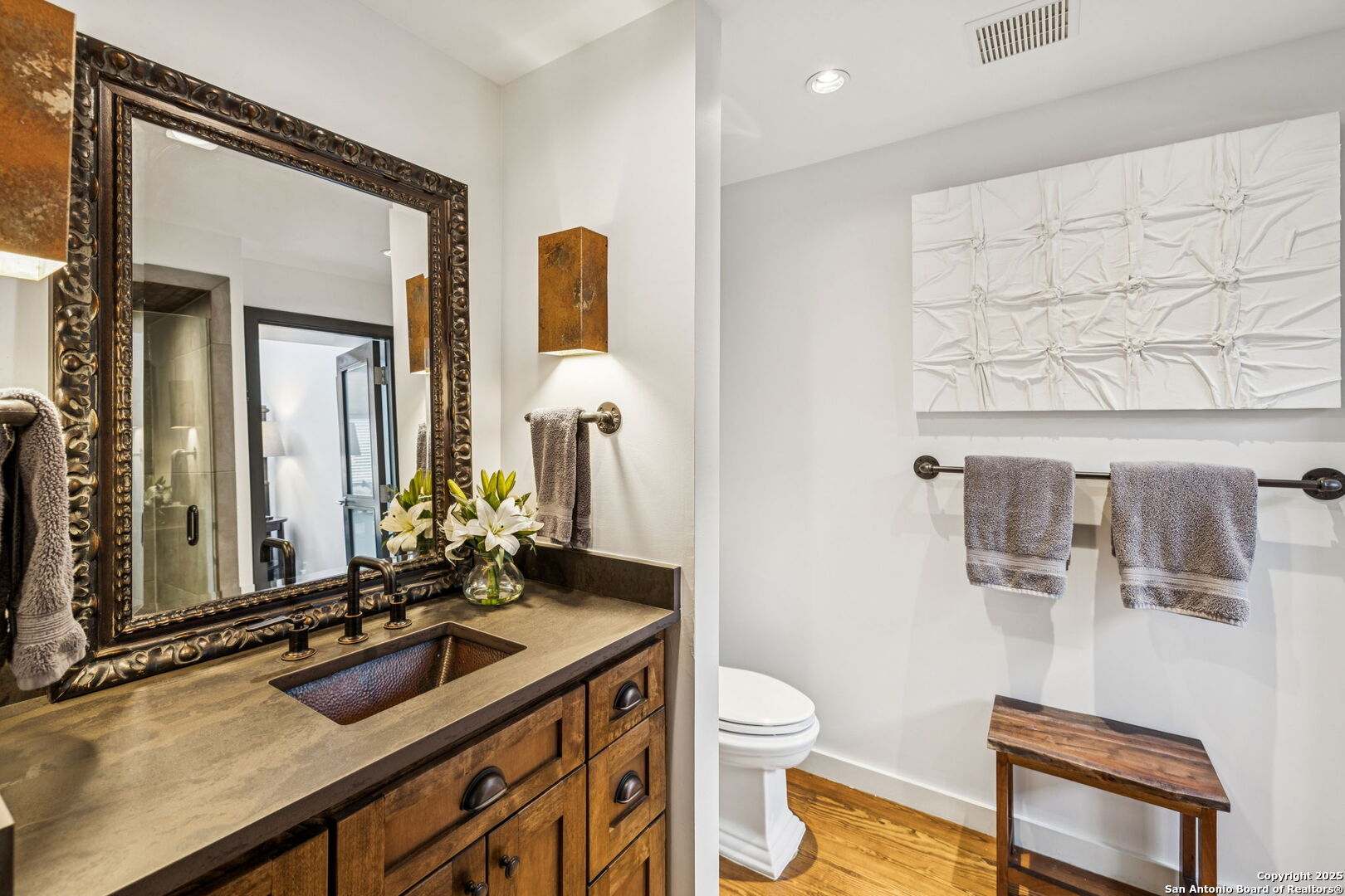 An extraordinary residence within the oldest historic neighborhood in Texas - San Antonio's King William Historic District, this 4,014-square-foot loft unfolds across three levels. Steel beams and exposed brick form the backdrop for interiors that move fluidly between grand gathering spaces and more intimate alcoves, punctuated by multiple patios and balconies that extend the living experience outward. The floor plan offers four distinct living areas, each with its own atmosphere: from a soaring double-height living room edged in industrial windows to fireside seating arranged with sculptural precision. The kitchen takes its place as a functional and aesthetic centerpiece, finished in warm wood cabinetry, professional-grade appliances with gas cooking and dekton countertops Two private bedroom suites anchor the plan, complemented by additional flexible sleeping areas and four full baths. The primary suite is a dramatic gesture in wood and steel, crowned by a custom canopy bed beneath vaulted trusses, with a Japanese copper soaking tub fed by a ceiling-mounted faucet creating a striking focal point in the bath. A curated environment that is part gallery and part sanctuary, this residence offers the scale and function of a house within San Antonio's most storied district and stands as one of its rarest offerings. 4,014 sq ft 2 bedroom suites (with 1-2 additional sleeping areas) 4 full baths 4 living areas 3-levels 4 patio/balconies