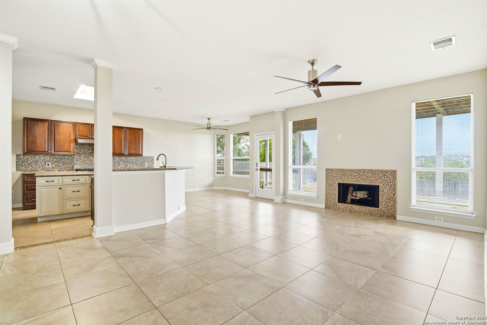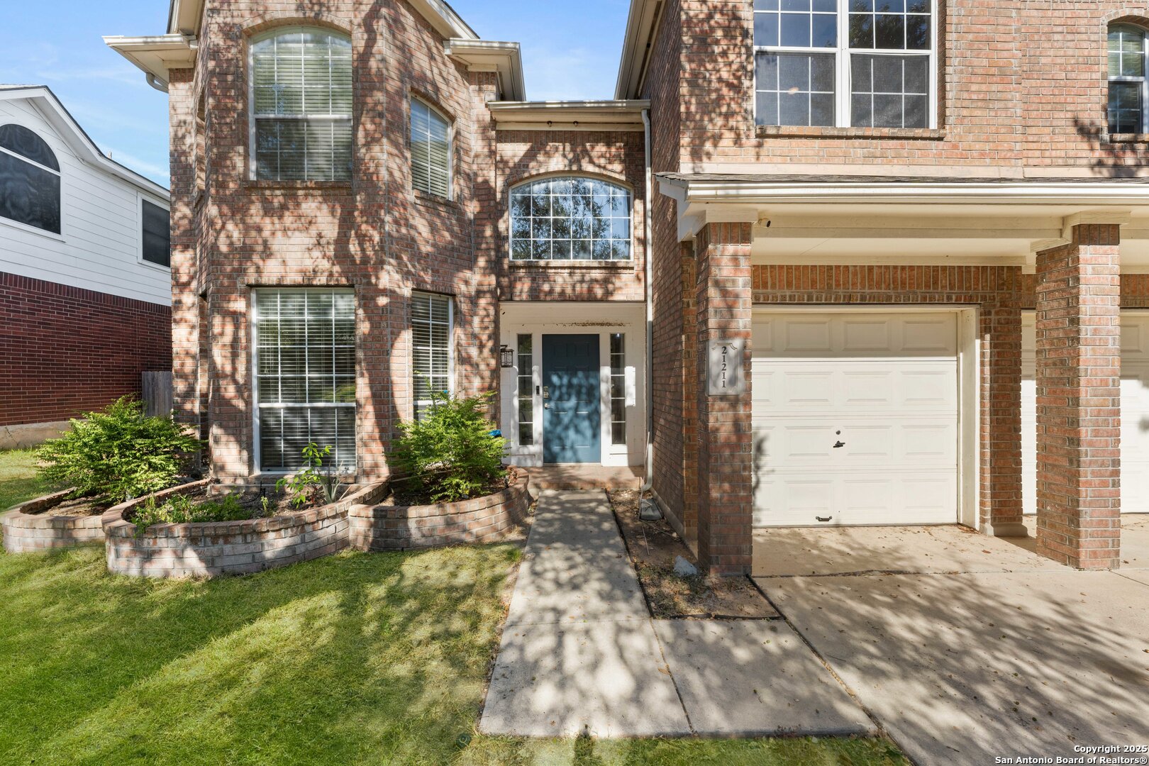 Move-in-ready two-story home with sweeping hill country views in the gated Encino Rio community. Zoned to top-rated North East ISD schools, including Encino Park Elementary within the neighborhood, Tejada Middle within walking distance, and Johnson High. This 5-bedroom, 3 bath home offers over 2,500 sq ft of well-designed living space with a home office, upstairs game room, and a spacious open layout. Classic brick exterior, mature landscaping, and a towering shade tree create welcoming curb appeal. Inside, tall ceilings, abundant natural light, modern ceiling fans, and neutral finishes highlight beautifully maintained tile and wood-look flooring throughout-no carpet. The kitchen features granite countertops, a center island, stainless steel appliances, decorative tile backsplash, and generous cabinet space. Wraparound bar seating connects seamlessly to the living and dining areas for easy entertaining. The traditional formal dining room has added glass doors for use as an office or private flex space. A full secondary bath and laundry room complete the level. Upstairs, the large primary suite includes dual vanities and a walk-in closet. A second living area separates the primary from four additional bedrooms and 3rd full bath. Outdoor living includes a covered second-floor balcony and a shaded patio below-both perfect for enjoying the long-distance views. The fenced backyard offers plenty of room for play, pets, and gardening, plus a storage shed. Encino Rio residents enjoy a community pool, park, playground, and sports court. Nearby are HEB Plus, several restaurants, and Canyon Springs Golf Club, with easy access to major shopping, medical centers, and Hwy 281-just 25 minutes to downtown. Don't miss out on this prime opportunity to secure a home in this coveted community - schedule a showing today!