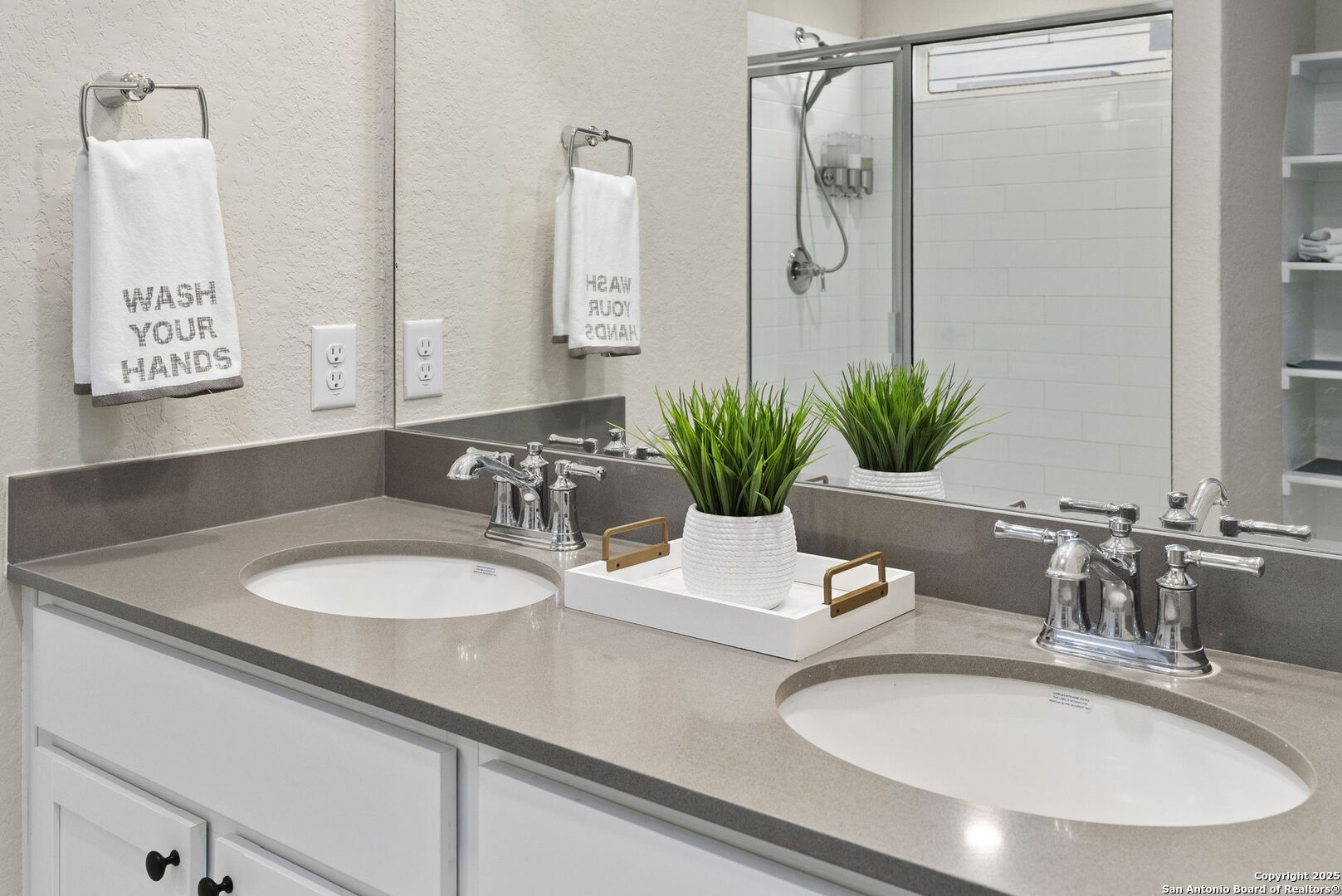 Beautiful Farmhouse-Style single story home ready for you to make your own! Can't build this series of home anymore. Modern door invites guests inside with an open floorplan. Light Oak flooring compliments the home and offers a bright, clean look walking in. Up front you will find 2 bedrooms with ceiling fan and a full hall bathroom. 3rd bedroom down the hall can make a great office or guest room. Spacious living room with ceiling fan and a large wall perfect for a large TV and opens to the kitchen with white cabinets with stainless steel appliances, gas cooking and an island that is perfect for bar stool seating. Dining area off the kitchen is perfect for entertaining or simply enjoying a quiet dinner with a view of your back yard. Large Primary bedroom is hidden on the backside of the home offering great privacy with a full bathroom offering a walk in shower, large closet and a double vanity with additional wall shelving. Enjoy your back patio with plenty of space for a table or seating with an included pull down sun shade. You will appreciate the upgraded black doorknobs, ceiling fans, Night light Plug plates, Upgraded shower heads and more! Home has also been upgraded with Cat 6E with network drops. Reverse osmosis filter system remains and home has full sprinkler system front and back. Garage offers a 220 Volt for level 2 EV charging! Great NEISD Schools and low taxes! Brookstone community has an awesome amentiy center and pool. Set up your showing today!