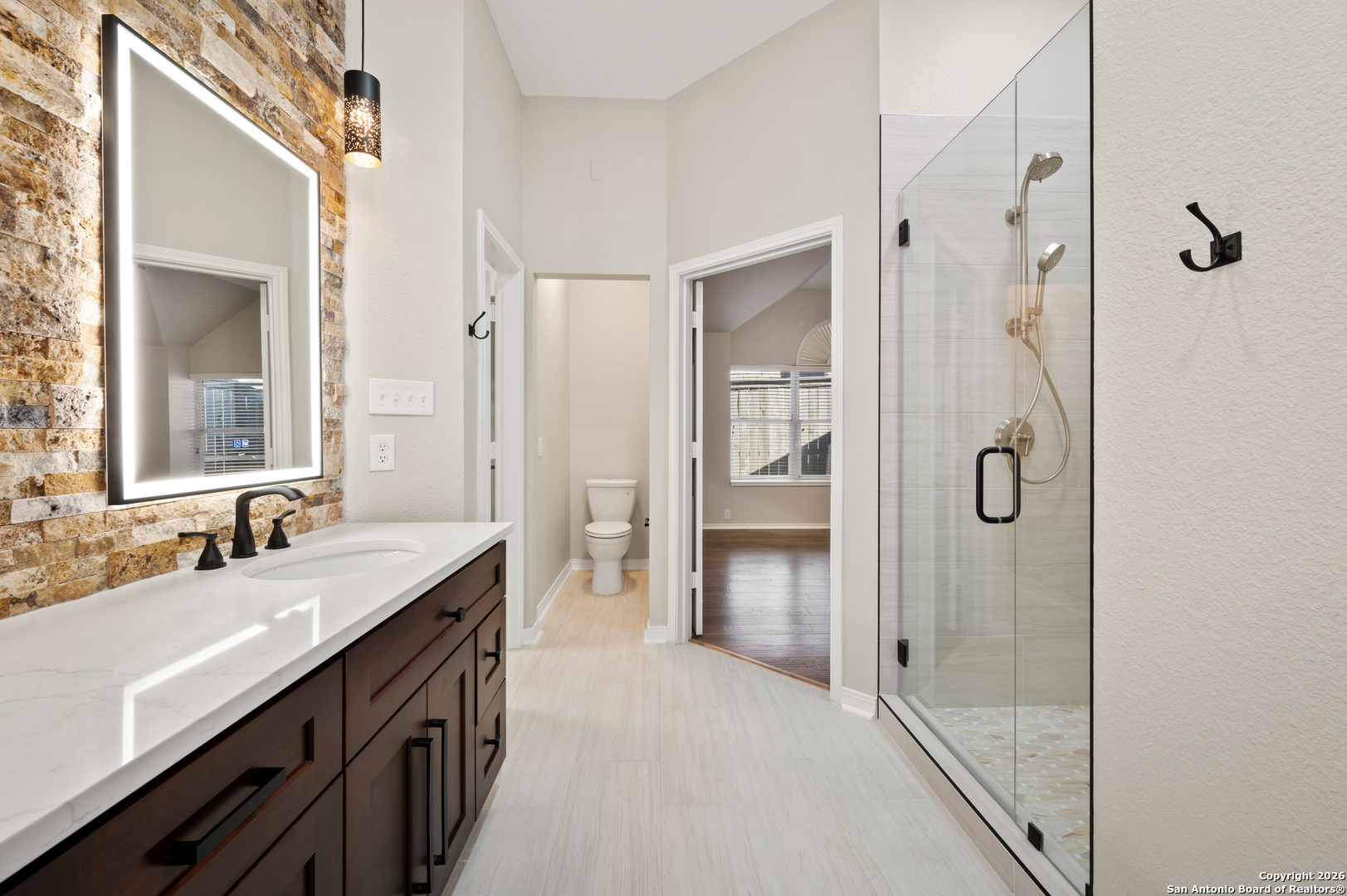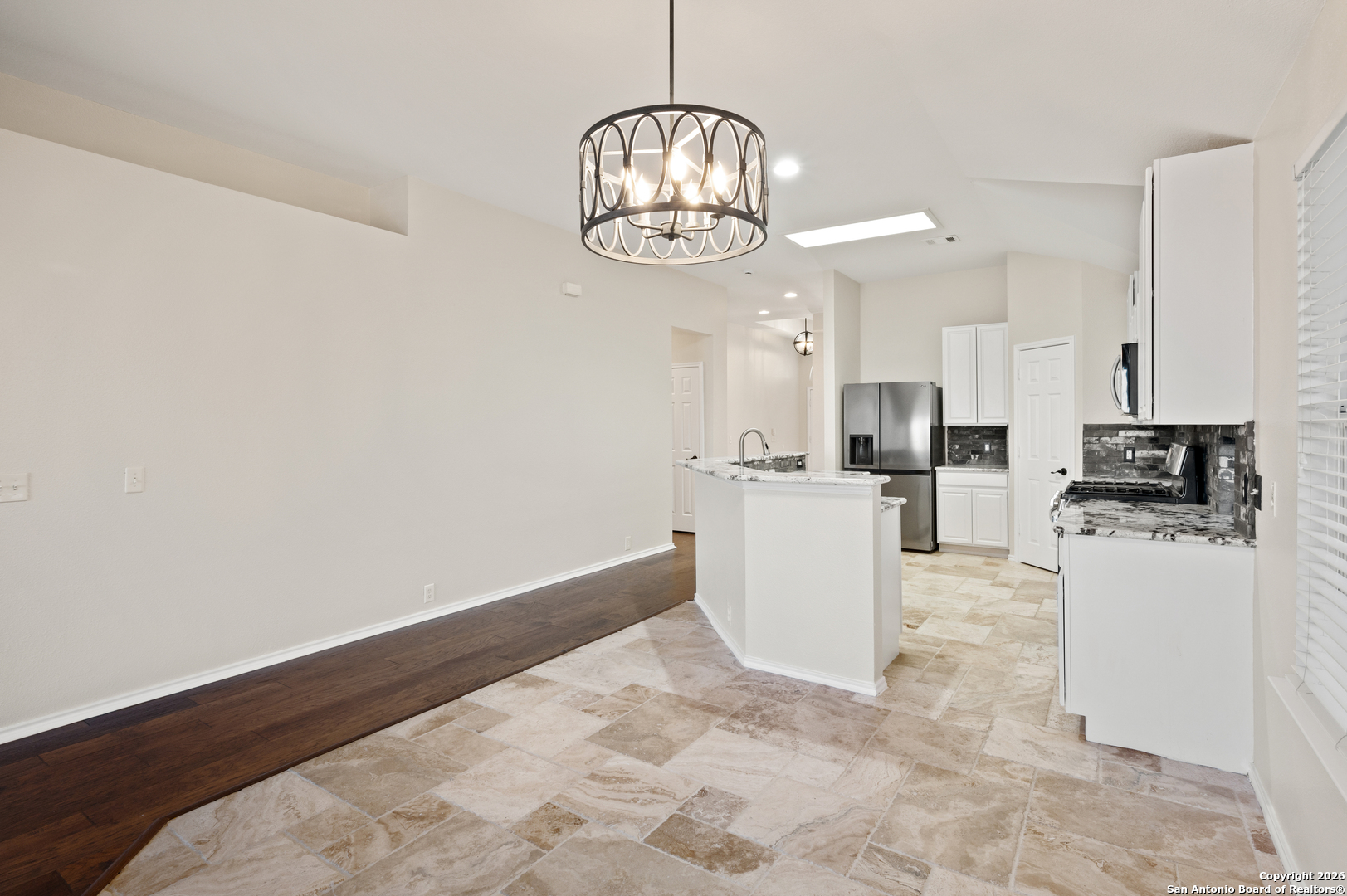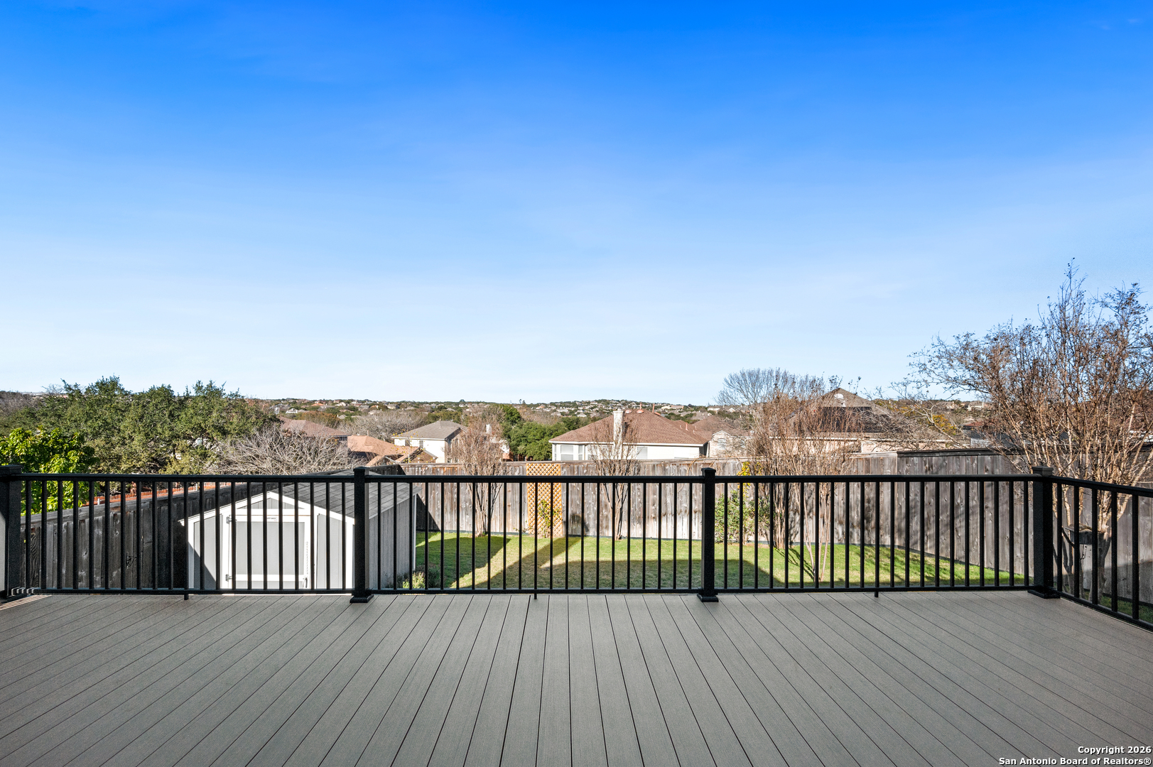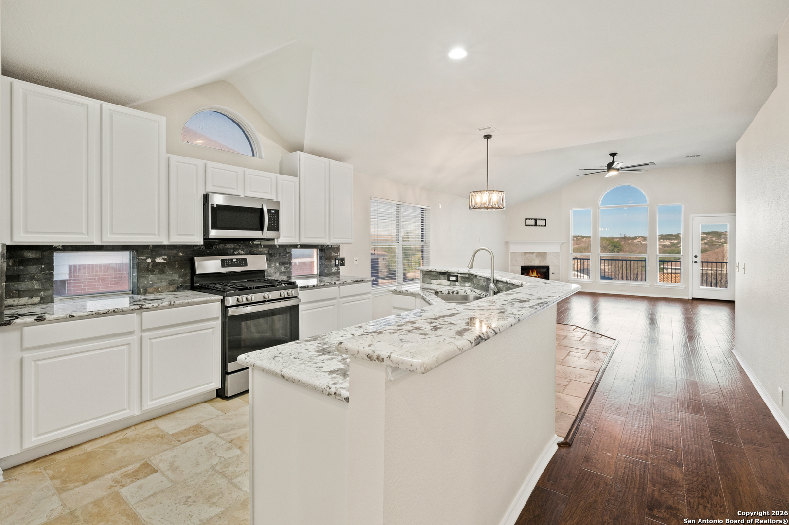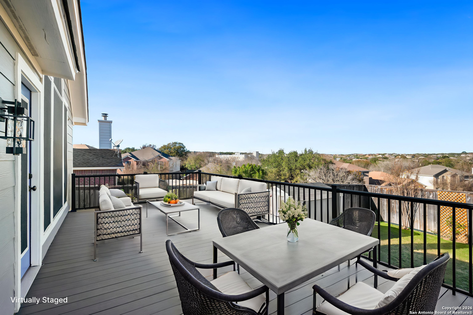 Welcome to 21247 Rio Sabinal, a beautifully updated single-story home tucked inside the gated community of Encino Rio. Set on a meticulously landscaped lot, this four bedroom, two bath, two car garage residence offers sweeping hill country style views that stretch for miles and a backyard that feels like your own private park. Inside, the home has been thoughtfully refreshed with fresh paint throughout, new carpet in the secondary bedrooms, and upgraded flooring featuring high-end travertine and wide wood scraped plank flooring. The fully remodeled primary suite is a true retreat, highlighted by a tastefully finished bathroom with custom tile work and a frameless glass shower enclosure. The kitchen is designed to impress, making a bold statement with exotic granite countertops, a natural stone backsplash, and a stainless steel five burner gas stove. Whether entertaining or enjoying everyday living, the layout is both functional and visually striking. Step outside to a maintenance-free deck overlooking a serene, park-like backyard with breathtaking views that elevate everyday moments. This Encino Rio gem blends privacy, style, and comfort in one of the area's most desirable gated neighborhoods.
