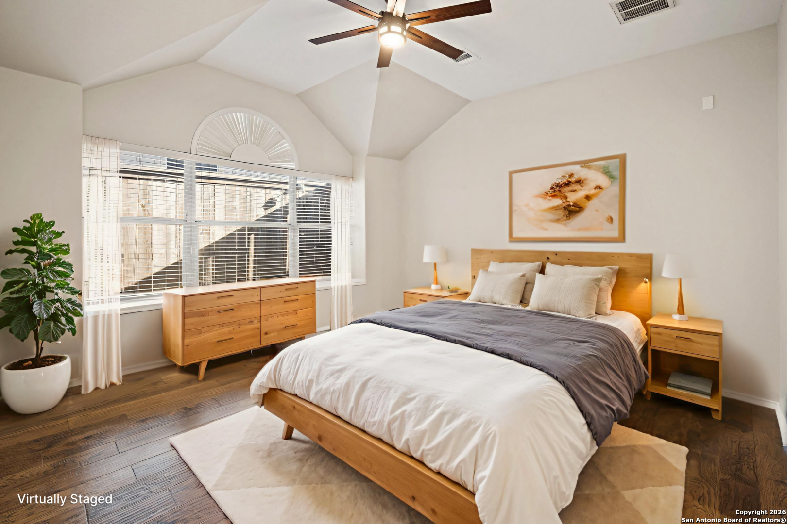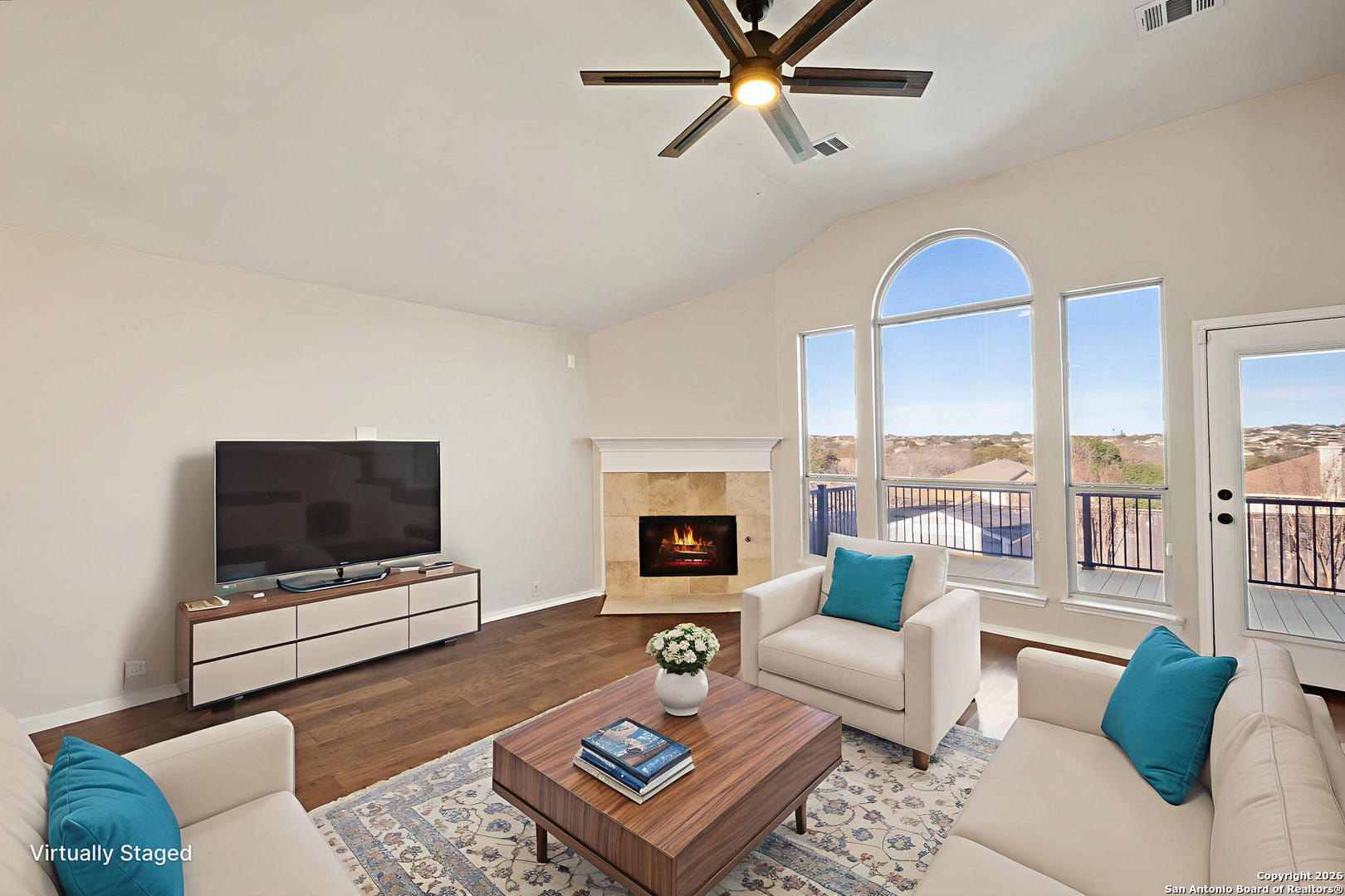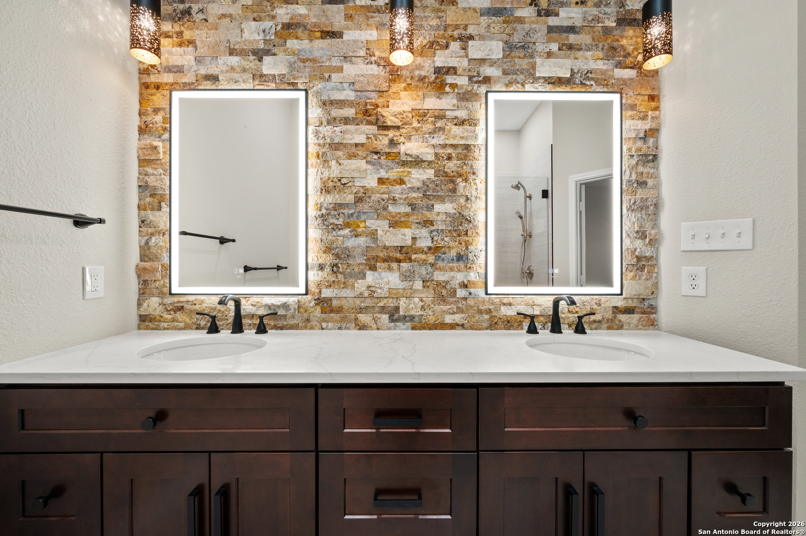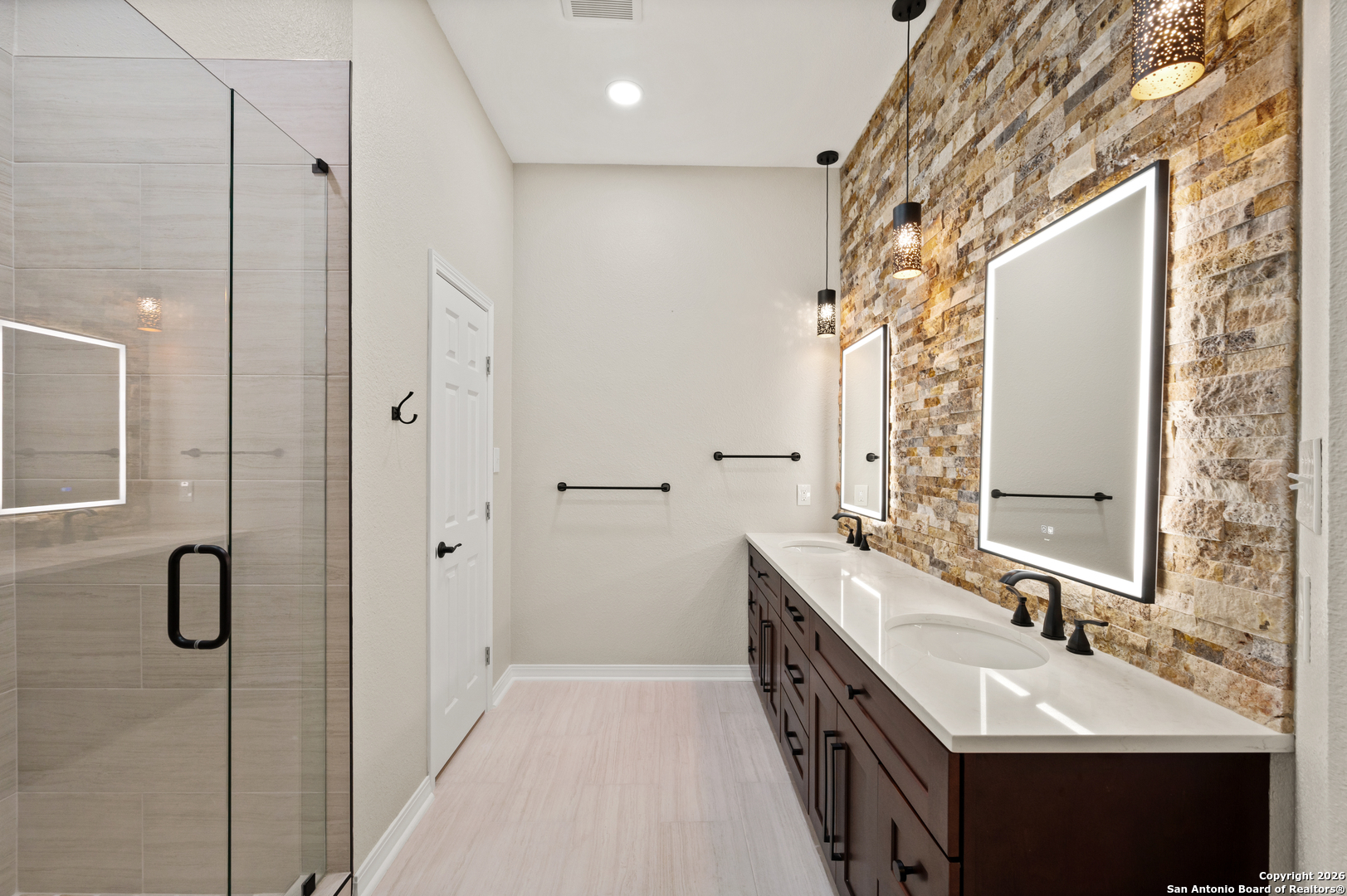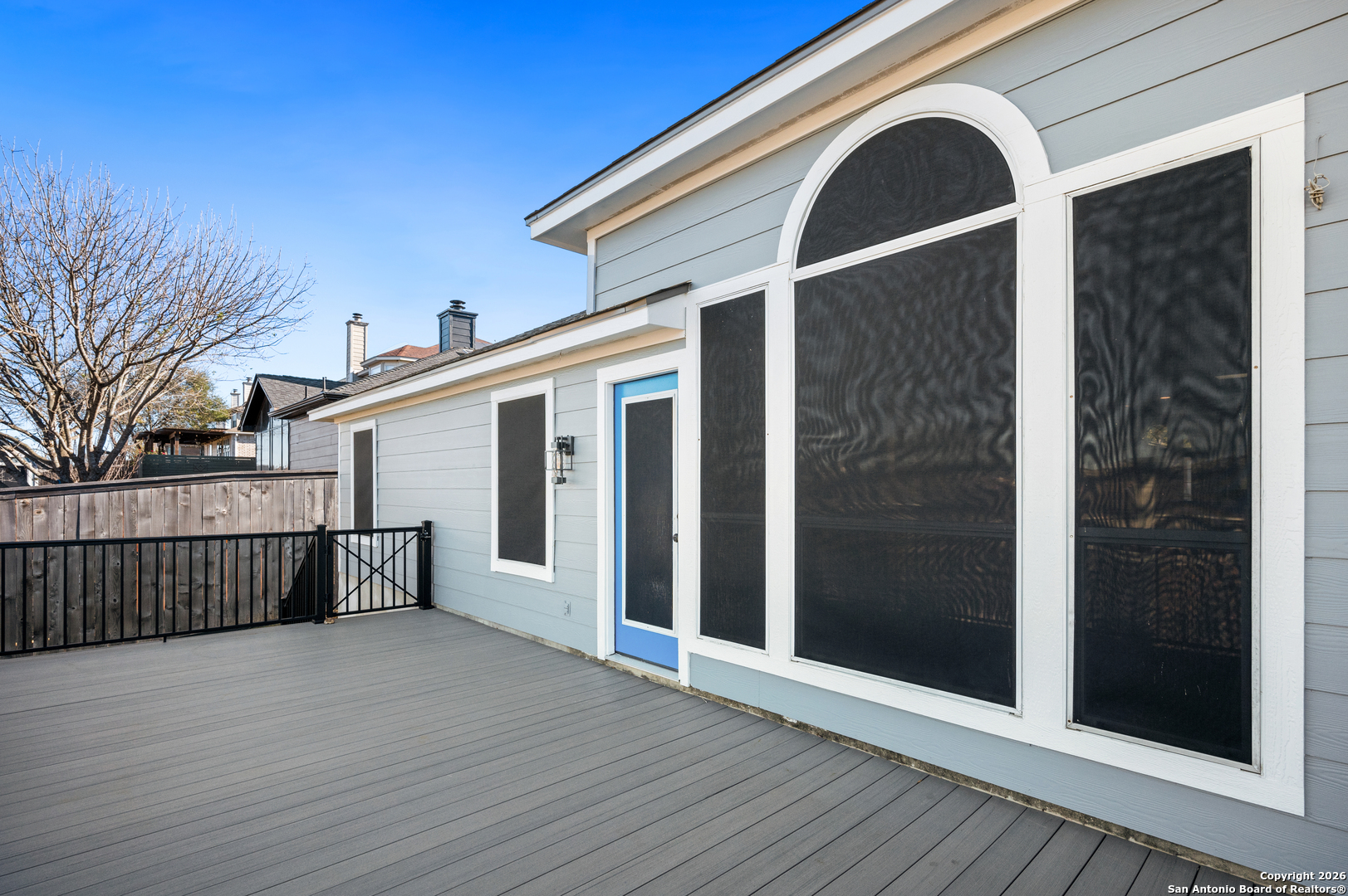Welcome to 21247 Rio Sabinal, a beautifully updated single-story home tucked inside the gated community of Encino Rio. Set on a meticulously landscaped lot, this four bedroom, two bath, two car garage residence offers sweeping hill country style views that stretch for miles and a backyard that feels like your own private park. Inside, the home has been thoughtfully refreshed with fresh paint throughout, new carpet in the secondary bedrooms, and upgraded flooring featuring high-end travertine and wide wood scraped plank flooring. The fully remodeled primary suite is a true retreat, highlighted by a tastefully finished bathroom with custom tile work and a frameless glass shower enclosure. The kitchen is designed to impress, making a bold statement with exotic granite countertops, a natural stone backsplash, and a stainless steel five burner gas stove. Whether entertaining or enjoying everyday living, the layout is both functional and visually striking. Step outside to a maintenance-free deck overlooking a serene, park-like backyard with breathtaking views that elevate everyday moments. This Encino Rio gem blends privacy, style, and comfort in one of the area's most desirable gated neighborhoods.