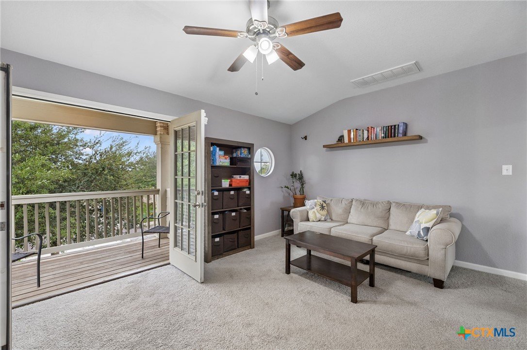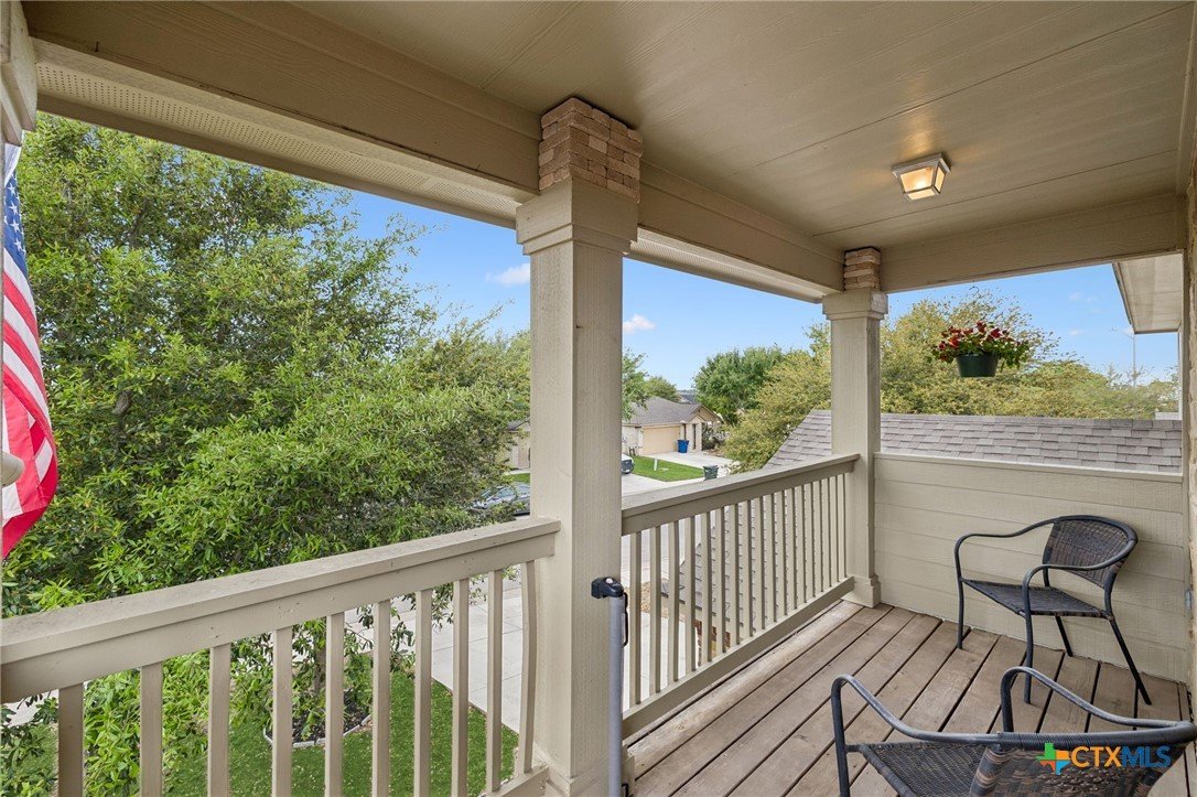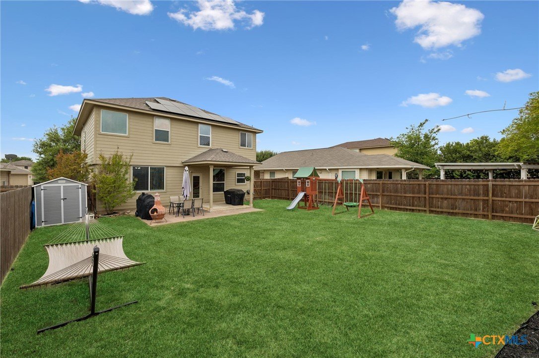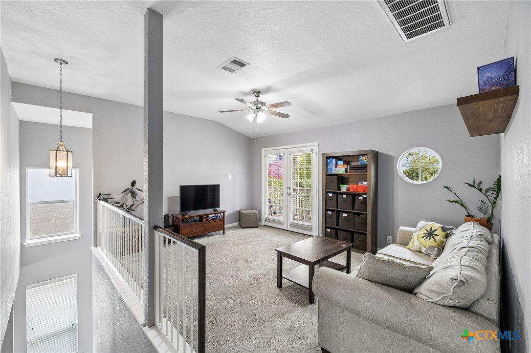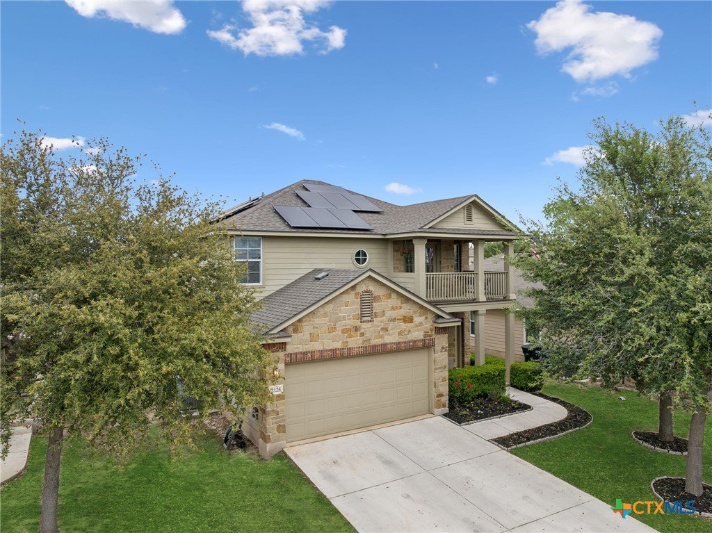 Energy-efficient living in Avery Park with community pool, playground, and flexible living space. This home features 34 solar panels providing an efficient energy source, along with a spacious backyard, covered patio, and privacy fencing designed for outdoor enjoyment. Inside, the open floor plan connects the kitchen, dining, and living areas, while a main-level bonus room offers flexibility for a home office, playroom, or guest space. Upstairs, a second family room with balcony access creates additional living and entertaining space. The kitchen includes upgraded granite countertops, stainless steel appliances, abundant cabinetry, and a large walk-in pantry with shelving. The dining area offers direct outdoor access for easy indoor-outdoor living. The owner’s suite features an oversized bedroom, large walk-in closet, and en suite bath with soaking tub, walk-in shower, and dual vanity. Secondary bedrooms provide spacious closets and ceiling fans. Additional highlights include a two-car attached garage with overhead storage, exterior security cameras, and landscaped yard.
