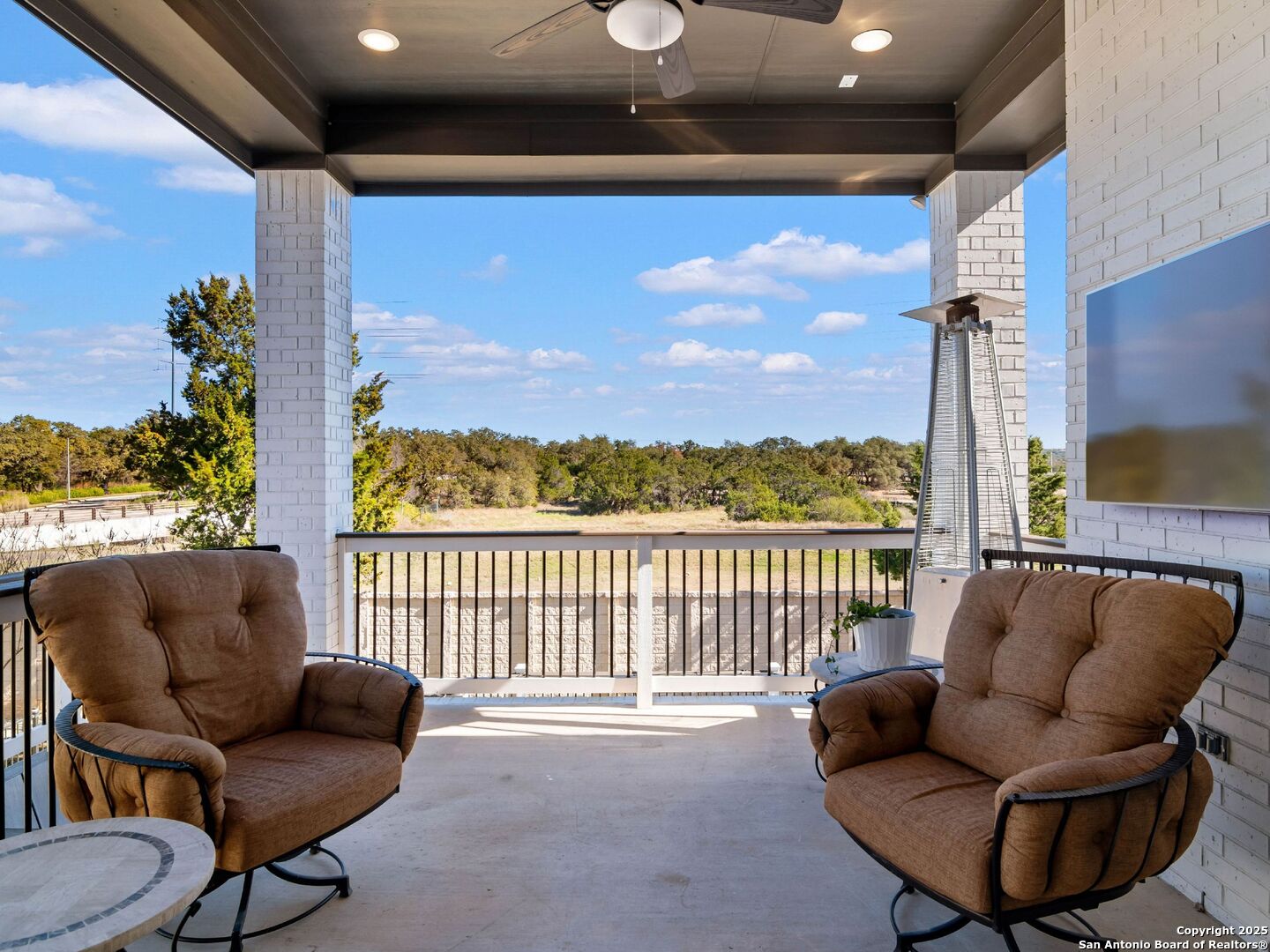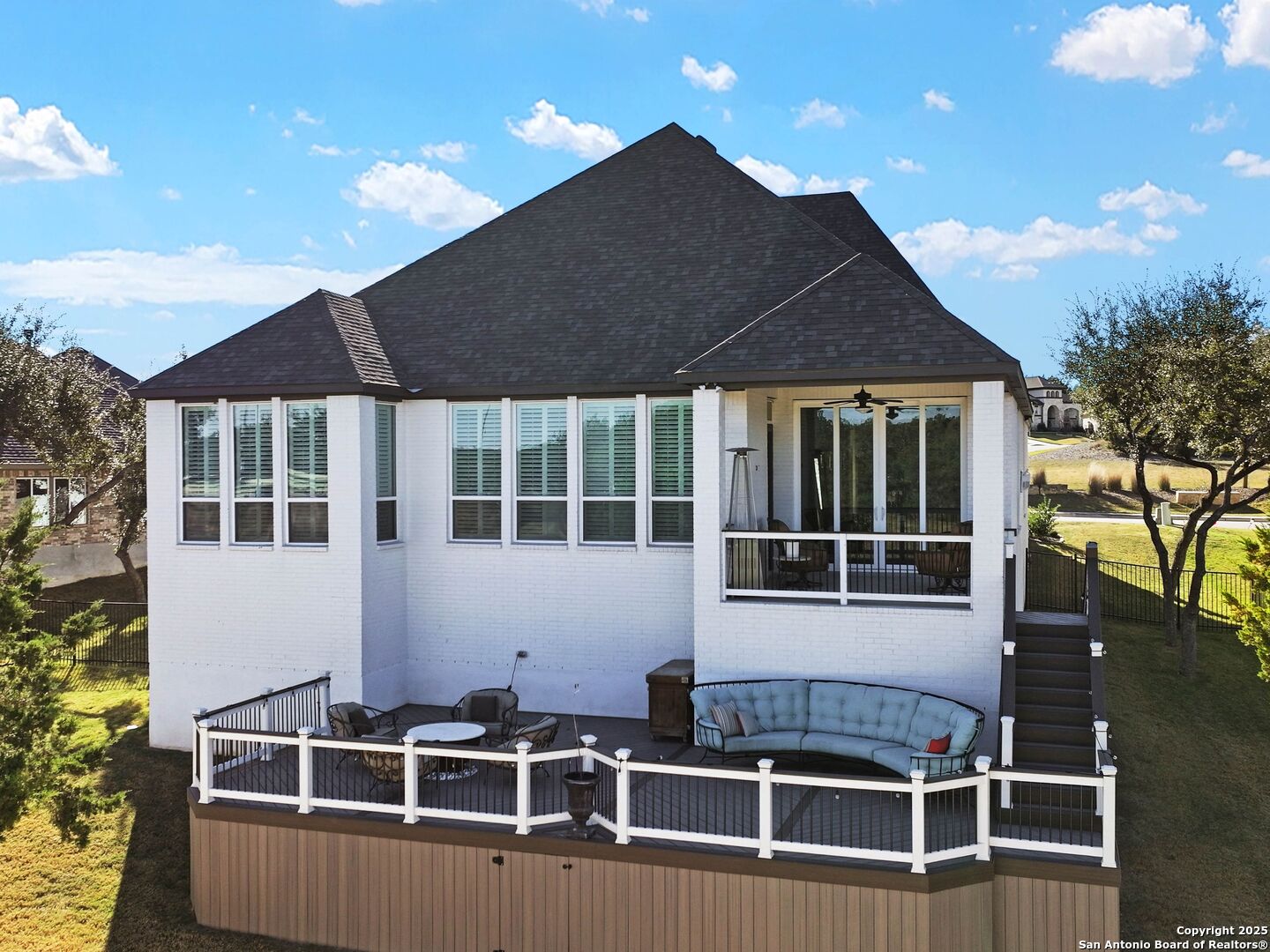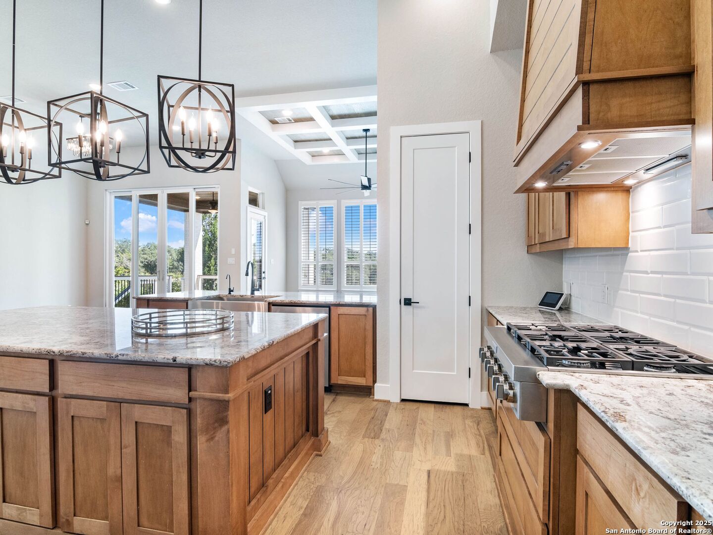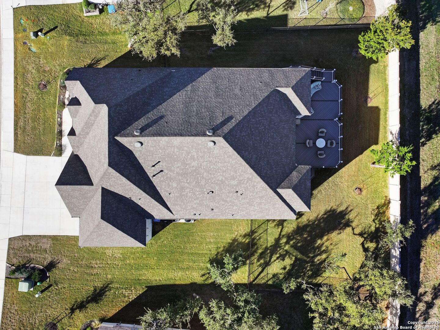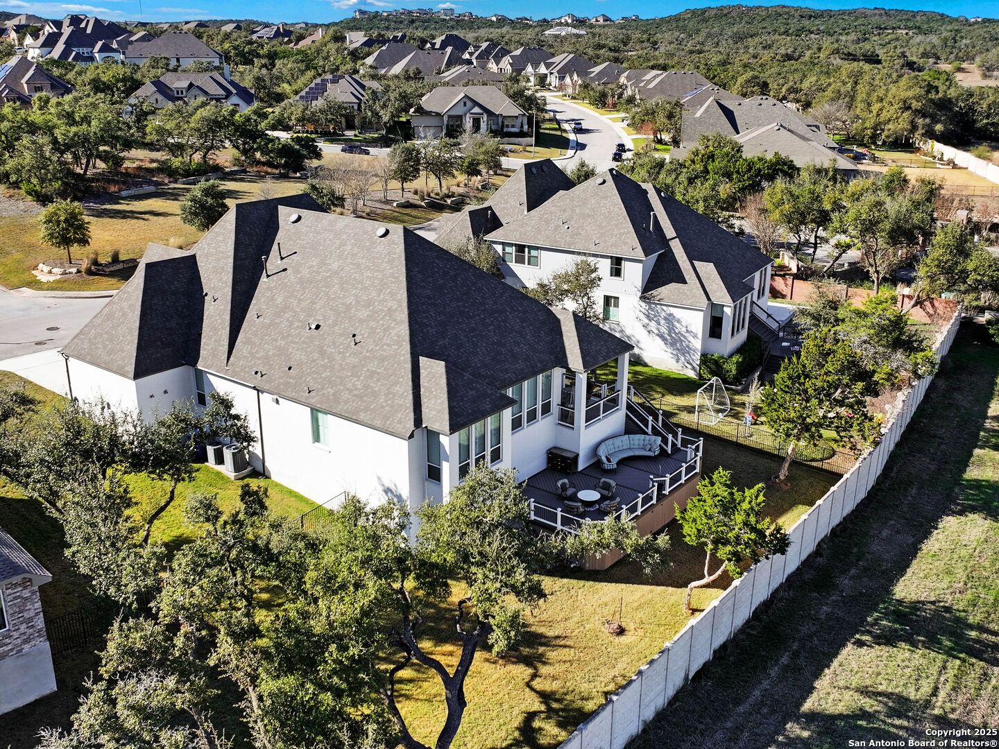 MOVE IN READY! NEW TREES (WAX MYRTLE) PLANTED ACROSS BACK OF PROPERTY - ONE STORY dream home with just about every upgrade you can think of! Premium painted brick elevation, double door front entry, hardwood and tile floors throughout, arched/vaulted ceilings, plantation shutters, custom black lighting fixtures, professional landscaping, etc. The kitchen offers custom cabinetry, a large granite island with built-in stainless-steel appliances, 6 burner commercial gas cooktop, double ovens. The second pantry has been converted to a beverage room complete with a KitchenAid beverage refrigerator, wine bottle holders and additional cabinet storage. The open floor plan allows a natural flow from the kitchen to a comfortable family room / gathering room with a gas fireplace. An Owner suite includes a sitting area, and spa bath - dual vanities, vessel tub, walk-in shower, huge walk-in closet! The secondary rooms are generous in size. Separate Study and game room complete the interior extraordinary package. Outdoor living space includes a custom deck for extended entertaining space. Plenty of room to add your own pool. Enhanced laundry room plus craft room, a must see!! 3 car garage. No steps into the home. This beautiful home has been thoughtfully designed to ensure comfort and convenience. It's perfect for those seeking luxury, comfort with a hill country setting with the conveniences of the city. Don't miss out on this beautiful home! Schedule your showing today. Hwy 281 is just minutes from the community. Schools (Piper elementary TO high school), restaurants, shopping and the Stone Oak HEB grocery are within a 5-minute drive! NO MUD OR CITY TAX!