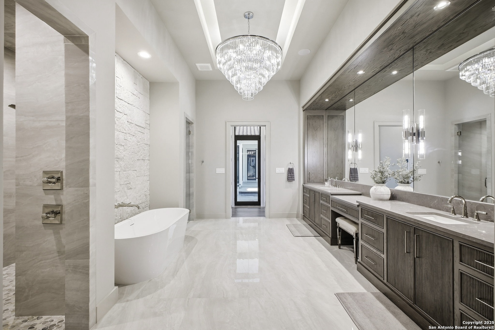 Welcome to this new one-story Modern Transitional estate which embodies show stopping detail and sophistication within The Dominion. The over 5,100 sq/ft home features unsurpassed craftsmanship and design elements that showcase the open floor plan seamlessly integrating indoor and outdoor living. The chef's kitchen features top of the line appliances, an expansive custom island that flows into the living/dining room with custom architectural ceiling detail, a dramatic fireplace and large dining room area. The interior is detailed with European oak floors, smoothly finished walls and designer light fixtures. The oversized master retreat boasts a luxurious spa-like bathroom and massive walk-in his/hers closets with extensive custom cabinetry/built-ins and with outdoor access. Impeccable craftsmanship prevails, with four spacious guest bedrooms, all with en-suite bathrooms. The home is complete with an oversized game room with a full wet bar and patio access leading out to a large covered patio with a full outdoor kitchen. The seamless indoor and outdoor integration has an outdoor fireplace, oversized patio, large yard and custom pool/spa. Four car garage offers ample parking and tons of built-in storage. This property must be experienced in person to be able to take in all it has to offer. Pictures are from previous custom built homes.