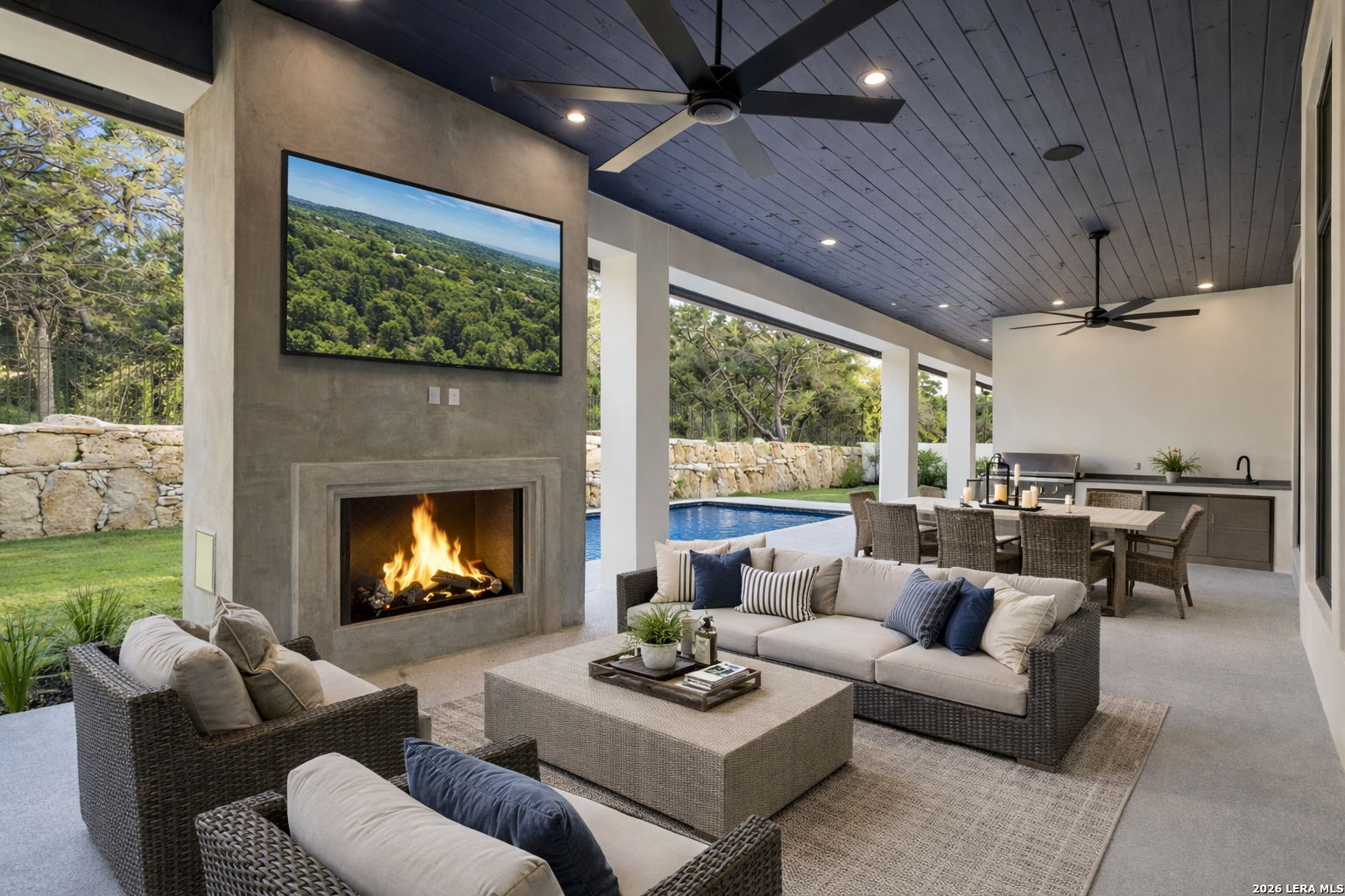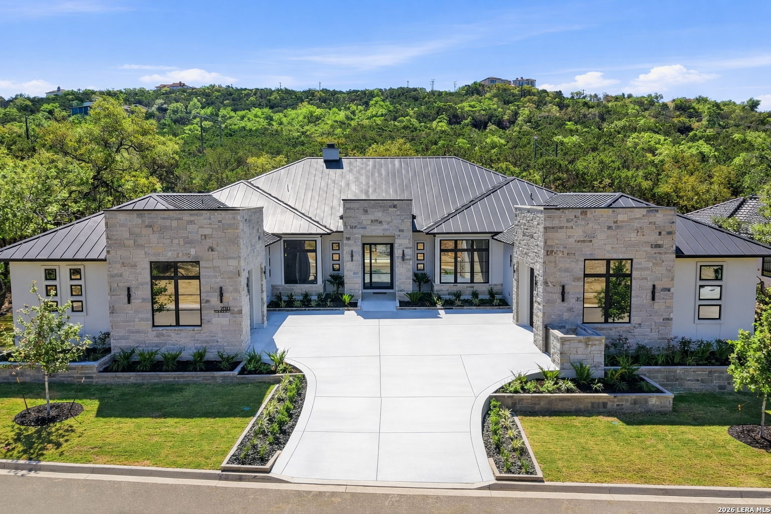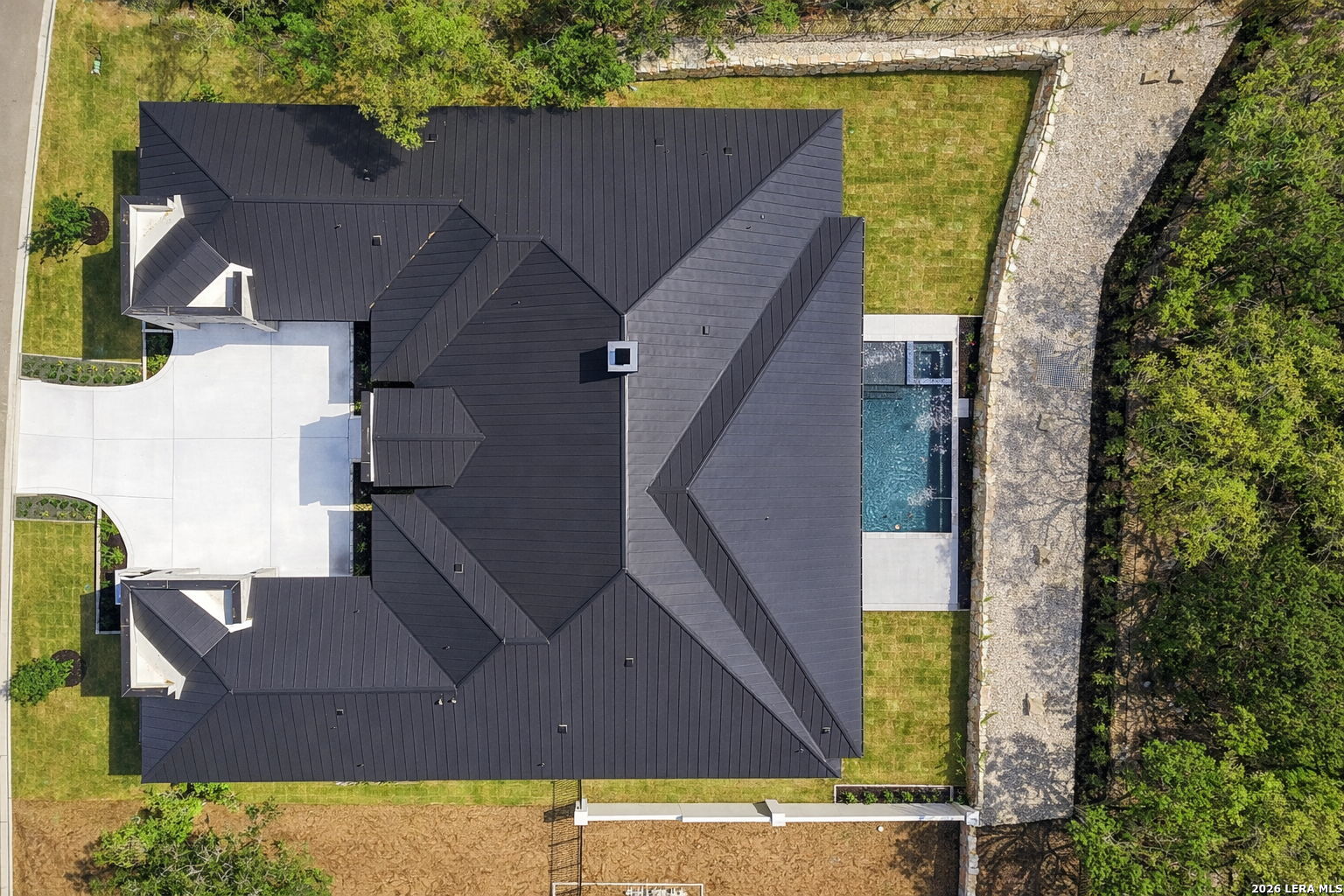 Welcome to this new one-story Modern Transitional estate which embodies show stopping detail and sophistication within The Dominion. The over 5,200 sq/ft home features unsurpassed craftsmanship and design elements that showcase the open floor plan seamlessly integrating indoor and outdoor living. The chef's kitchen features top of the line appliances, an expansive custom island that flows into the living/dining room with custom architectural ceiling detail, a dramatic fireplace and large dining room area. 5 bedrooms all with on suite bathrooms. Oversized secondary game room or living room with outside access to pool. 4 car garage with tons of built in storage.