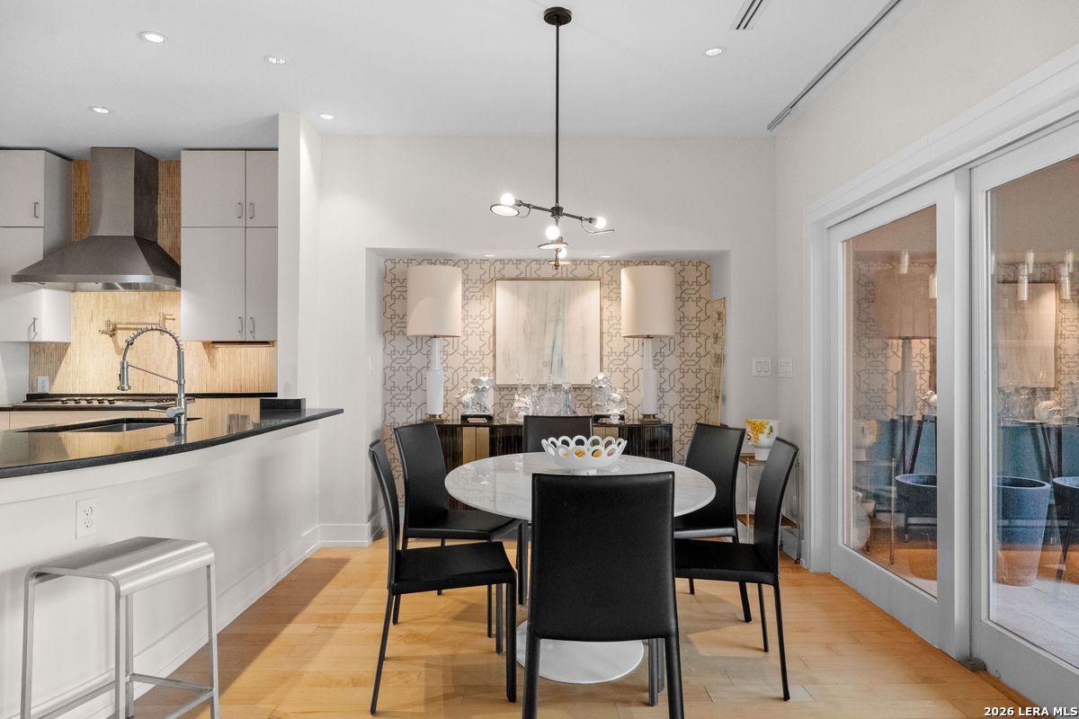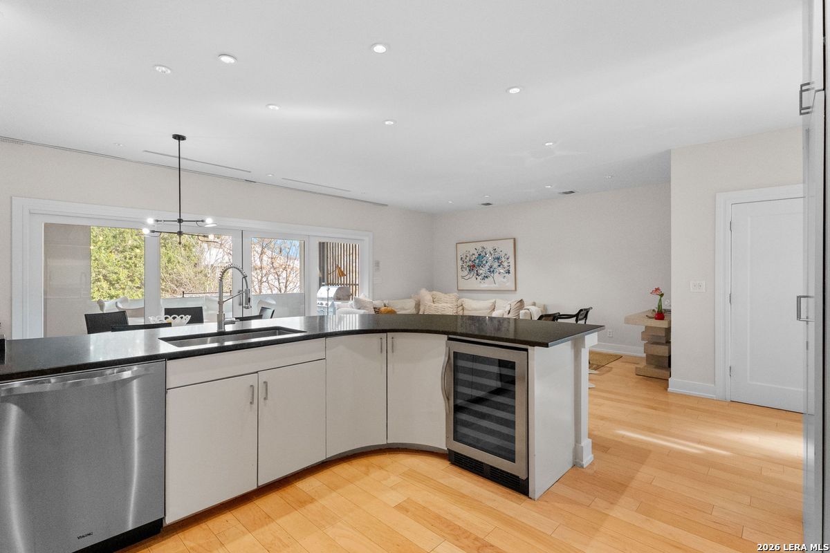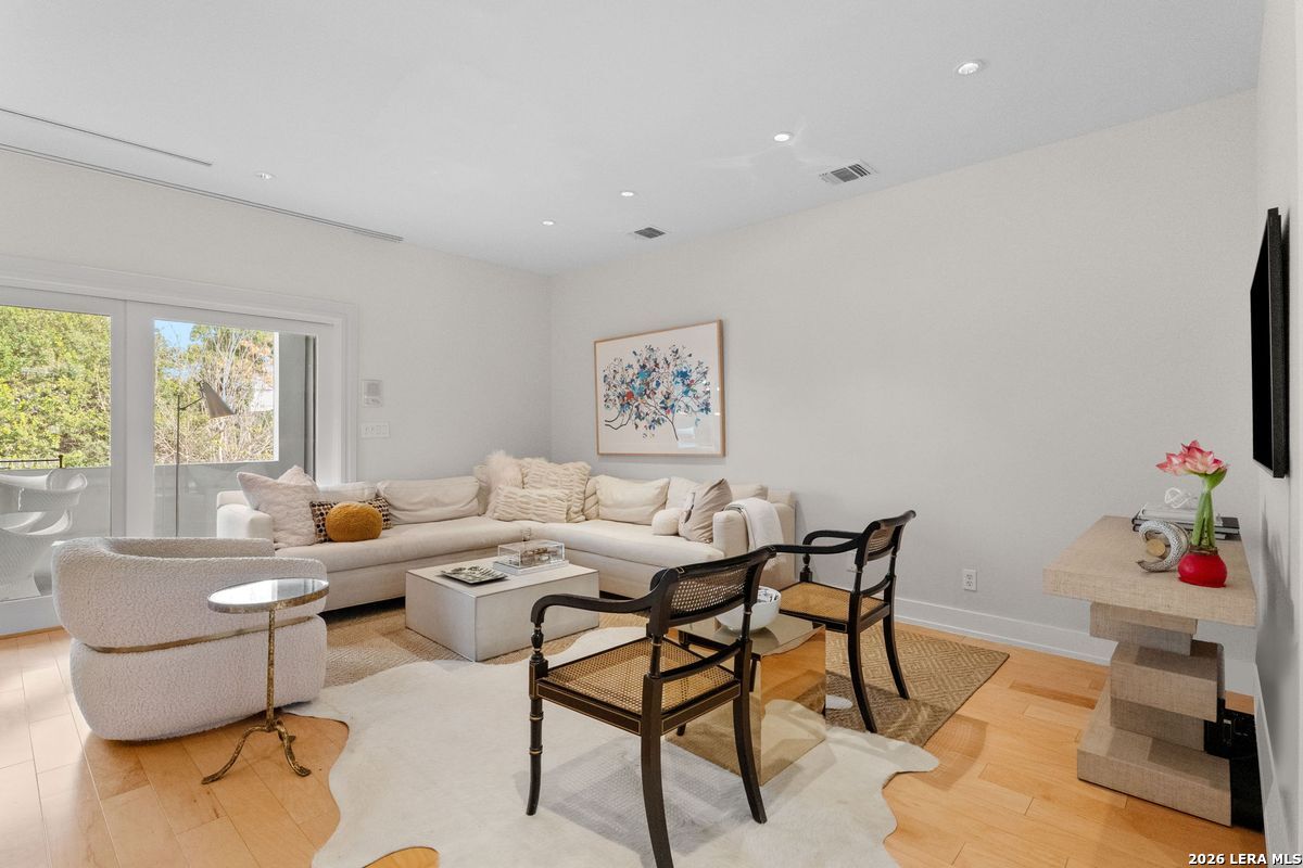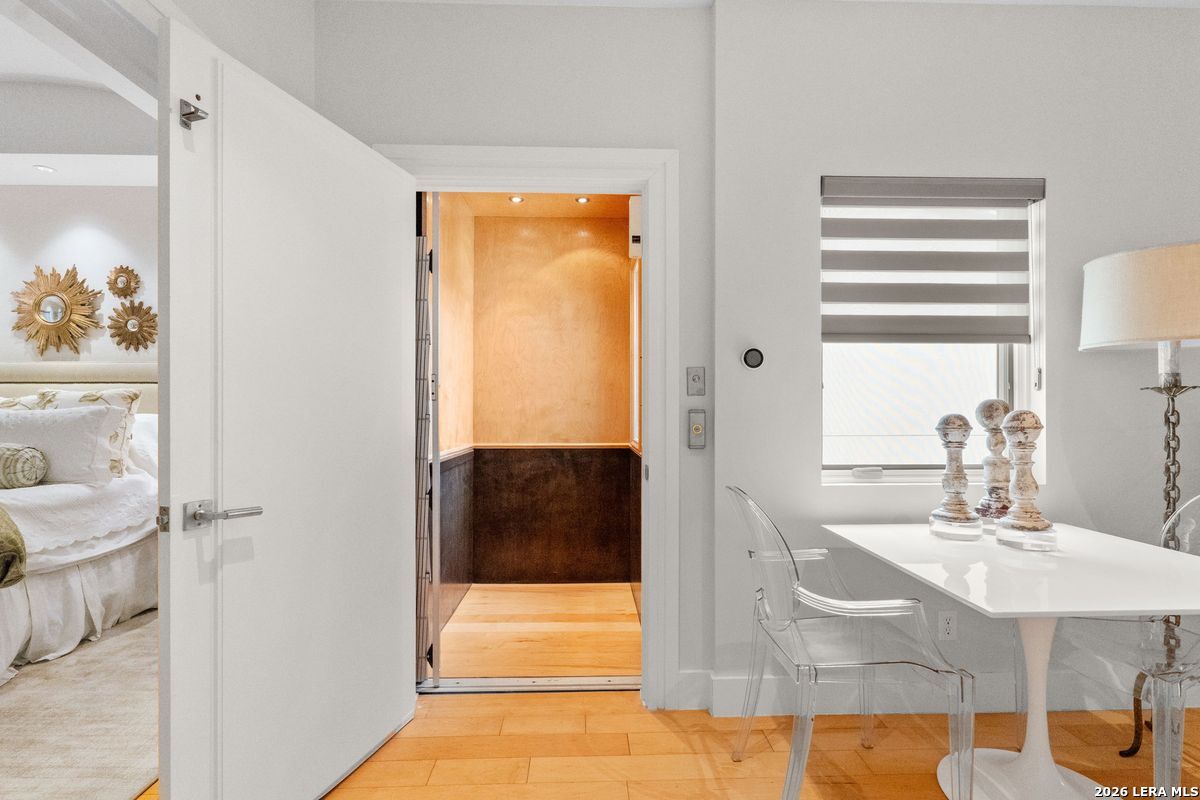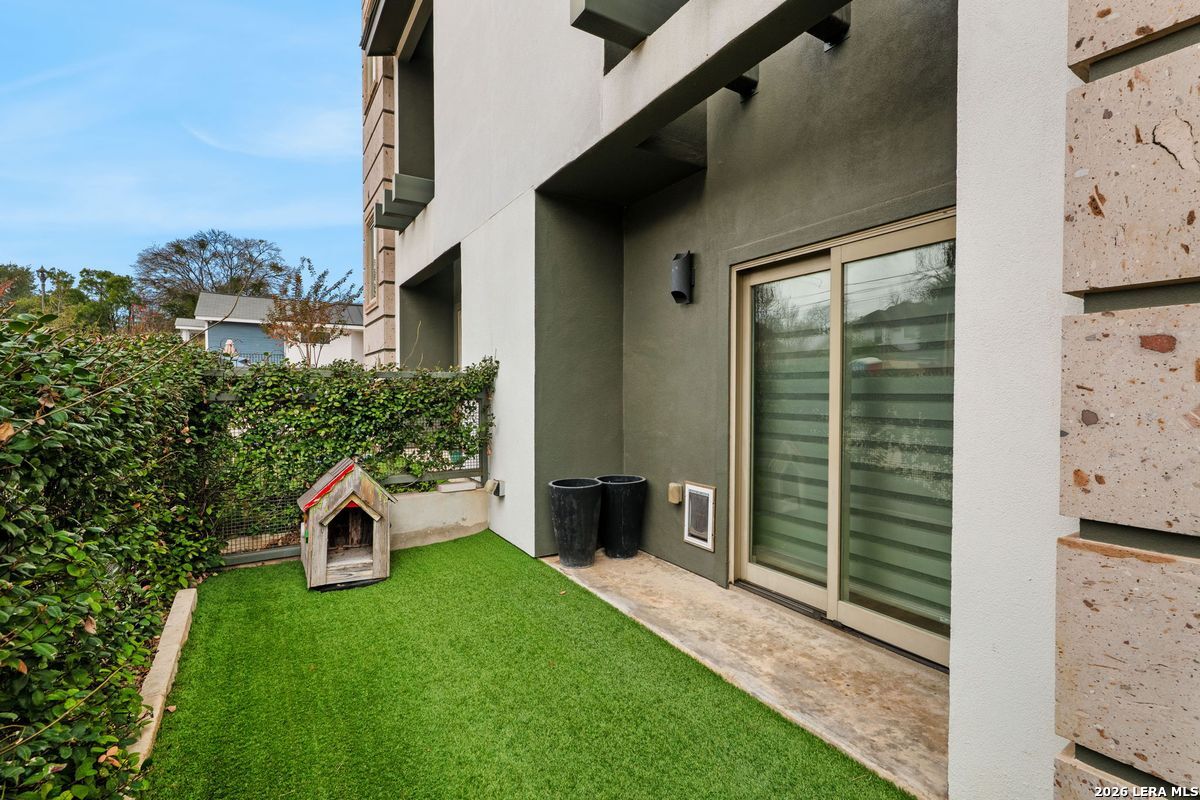 Welcome to refined, lock-and-leave living in this stunning three-story contemporary townhome condominium, where sophisticated design meets everyday functionality. Thoughtfully appointed with high-end finishes and modern conveniences, this residence offers an exceptional luxury lifestyle in Olmos Park. An elevator provides effortless access to all three levels. The main living space is designed for both entertaining and daily living, featuring an open-concept layout that seamlessly connects the kitchen, dining, and family room. At the center of the home, the chef's kitchen impresses with premium Viking appliances, gas cooking, a wine refrigerator, and sleek black granite countertops. Expansive double sliding doors open to an incredible screened-in porch, creating the perfect indoor-outdoor living experience. This inviting space is ideal for al fresco dining, morning coffee, or relaxing while enjoying fresh air year-round, all while filling the home with beautiful natural light. The residence offers three spacious bedrooms, each with its own private bathroom. The tranquil primary suite is a private retreat featuring a wet bar with refrigerator, a generous walk-in closet, and a recently renovated spa-inspired bathroom complete with a whirlpool tub, walk-in steam shower, dual vanities, and designer lighting. Additional highlights include a dedicated home office ideal for remote work, an expansive laundry room with an adjoining walk-in storage closet-features rarely found in townhome living-and an enclosed turfed yard perfect for pets. An oversized two-car attached garage provides ample parking and storage. Located within the prestigious Olmos Park community and the highly acclaimed Alamo Heights School District, this exceptional home offers walkable access to local shops, restaurants, and coffee bars while delivering the comfort, convenience, and luxury of modern urban living.