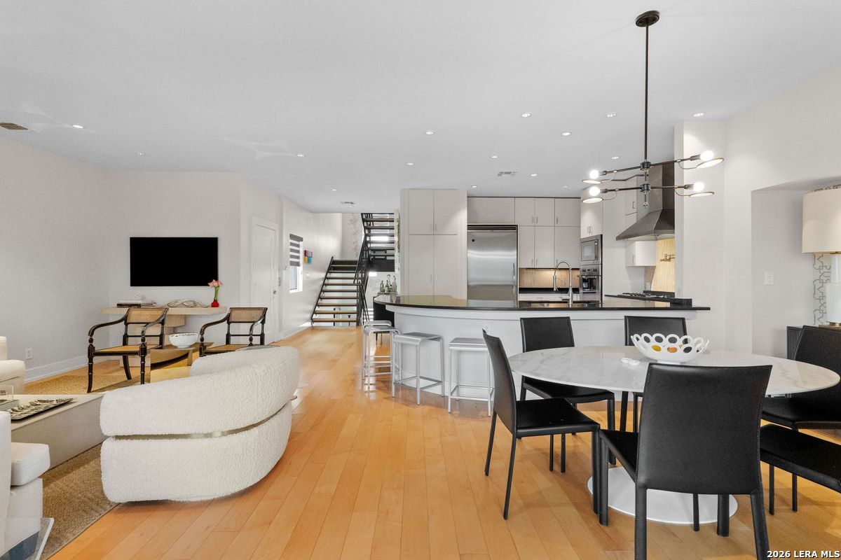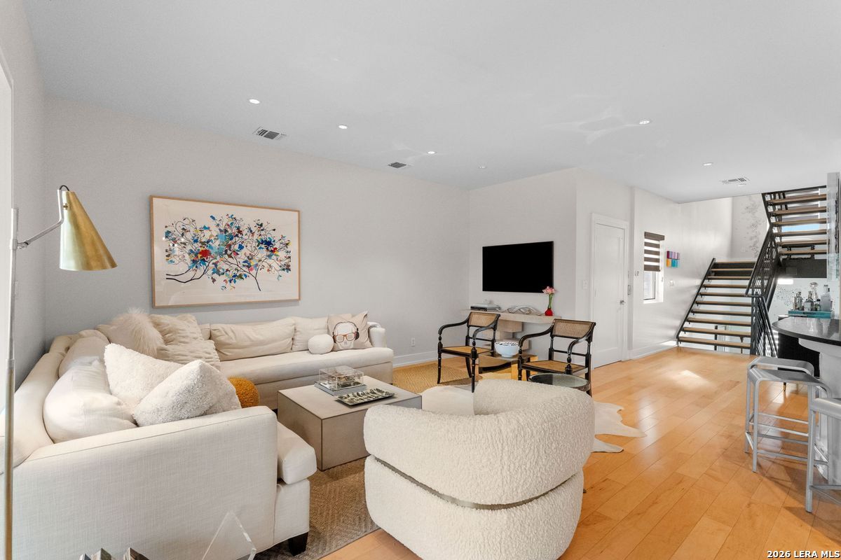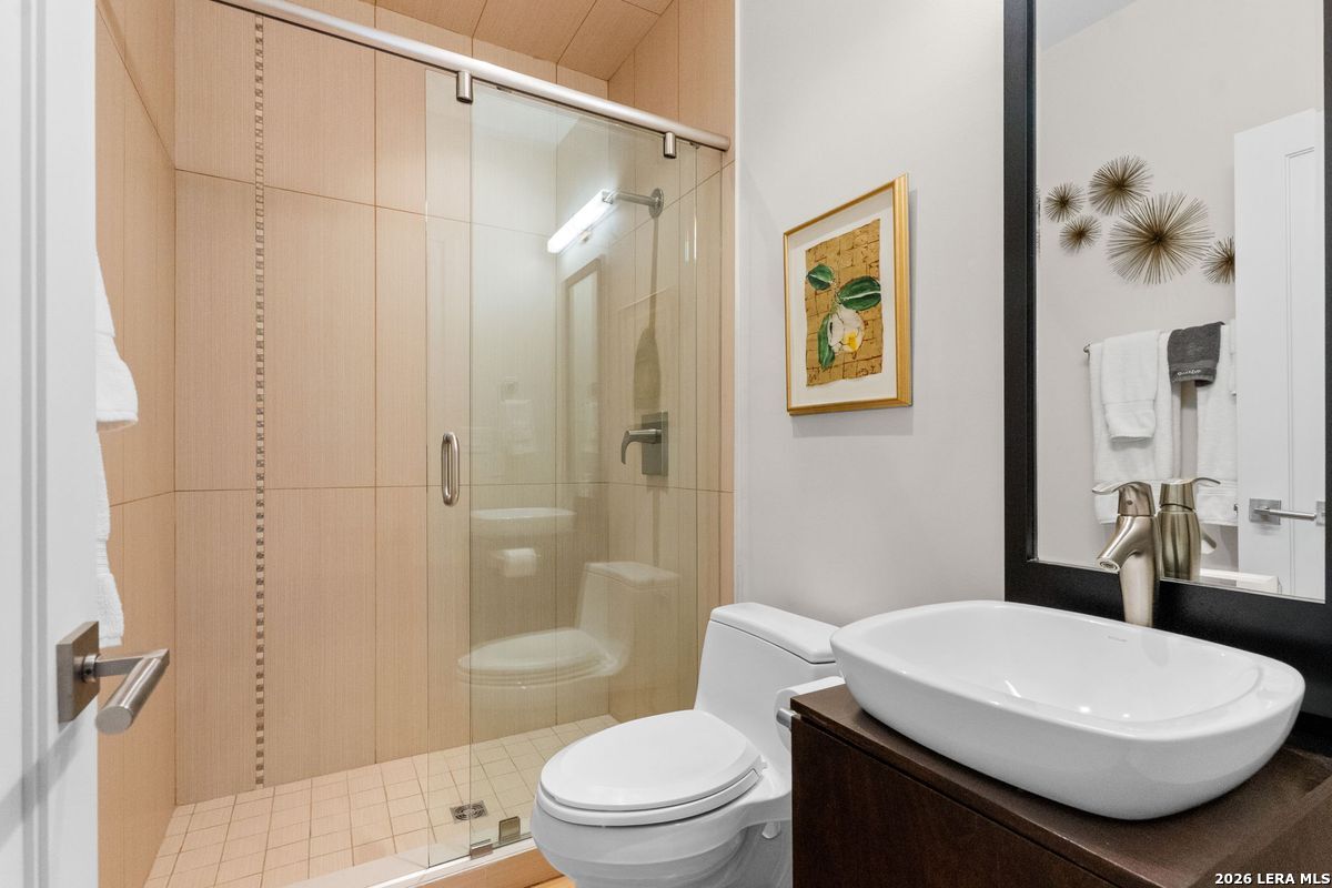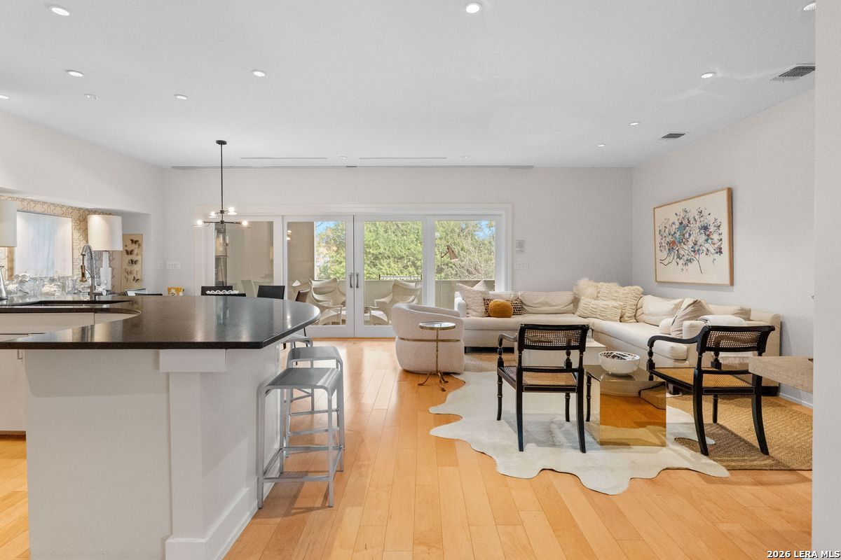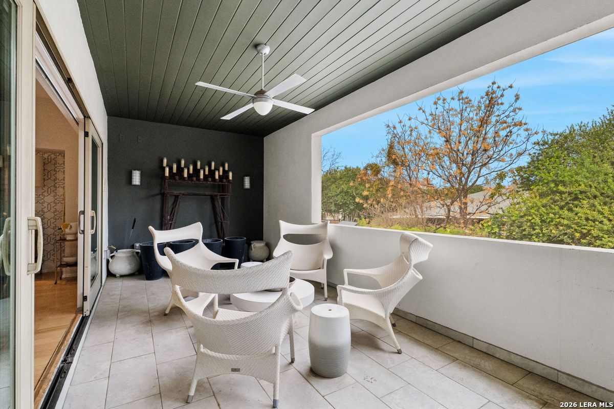 Welcome to refined, lock-and-leave living in this stunning three-story contemporary townhome condominium, where sophisticated design meets everyday functionality. Thoughtfully appointed with high-end finishes and modern conveniences, this residence offers an exceptional luxury lifestyle in Olmos Park. An elevator provides effortless access to all three levels. The main living space is designed for both entertaining and daily living, featuring an open-concept layout that seamlessly connects the kitchen, dining, and family room. At the center of the home, the chef's kitchen impresses with premium Viking appliances, gas cooking, a wine refrigerator, and sleek black granite countertops. Expansive double sliding doors open to an incredible screened-in porch, creating the perfect indoor-outdoor living experience. This inviting space is ideal for al fresco dining, morning coffee, or relaxing while enjoying fresh air year-round, all while filling the home with beautiful natural light. The residence offers three spacious bedrooms, each with its own private bathroom. The tranquil primary suite is a private retreat featuring a wet bar with refrigerator, a generous walk-in closet, and a recently renovated spa-inspired bathroom complete with a whirlpool tub, walk-in steam shower, dual vanities, and designer lighting. Additional highlights include a dedicated home office ideal for remote work, an expansive laundry room with an adjoining walk-in storage closet-features rarely found in townhome living-and an enclosed turfed yard perfect for pets. An oversized two-car attached garage provides ample parking and storage. Located within the prestigious Olmos Park community and the highly acclaimed Alamo Heights School District, this exceptional home offers walkable access to local shops, restaurants, and coffee bars while delivering the comfort, convenience, and luxury of modern urban living.