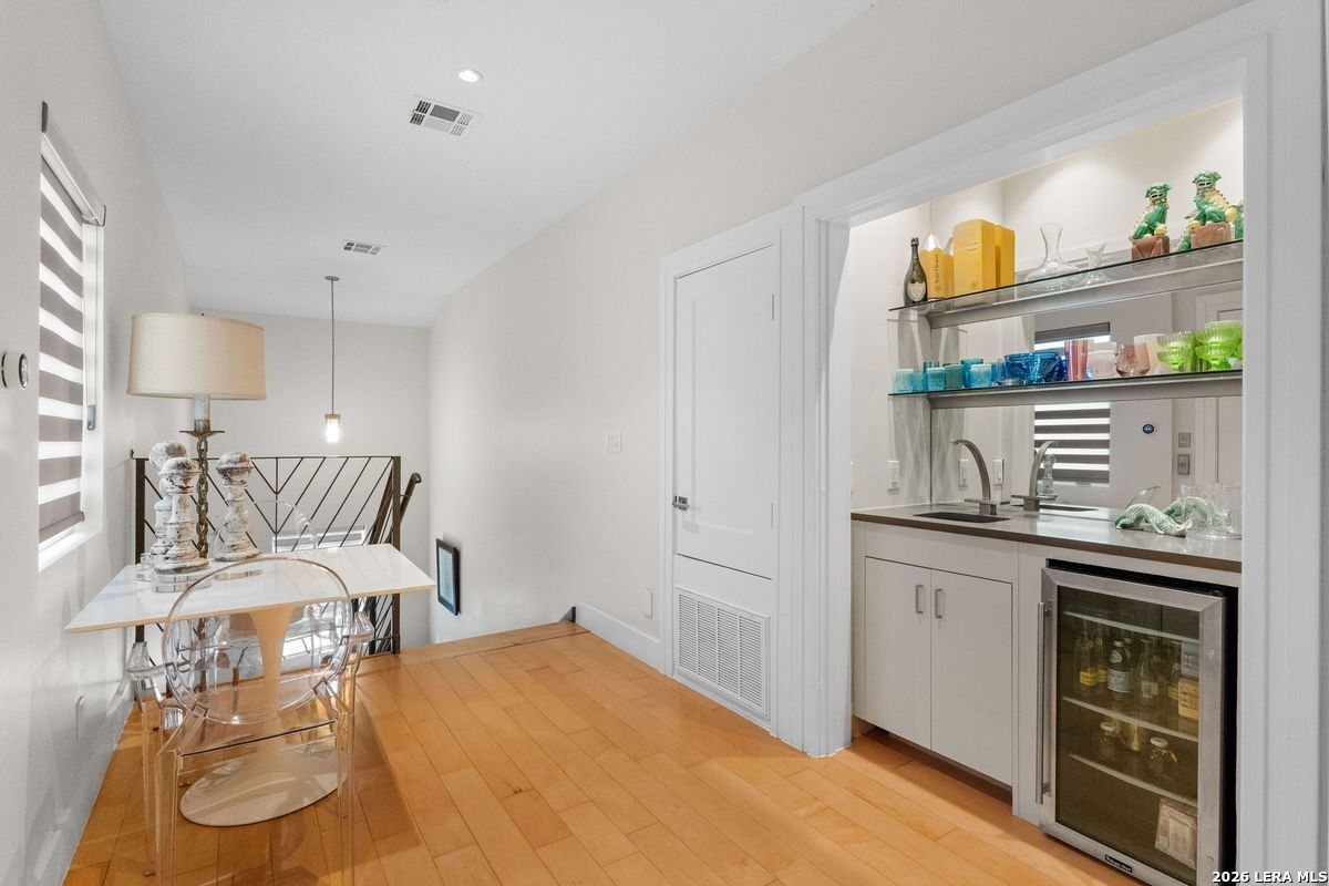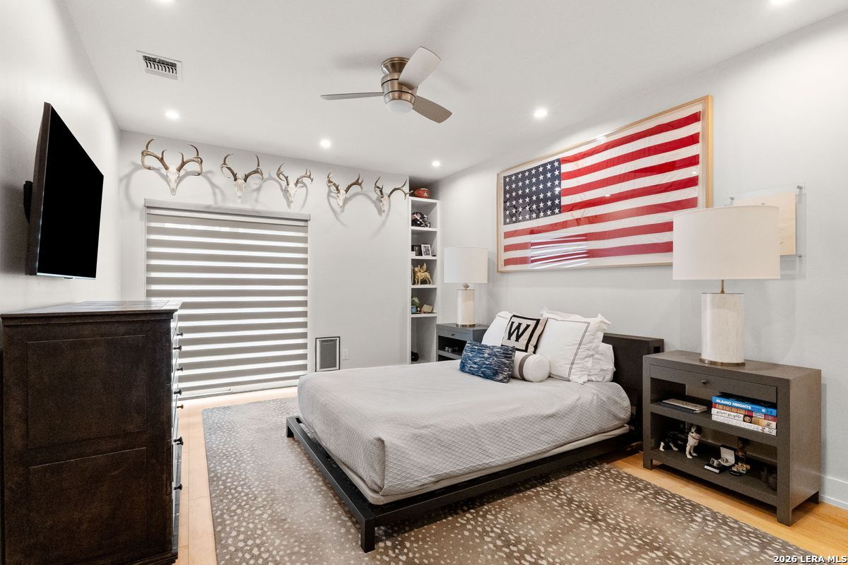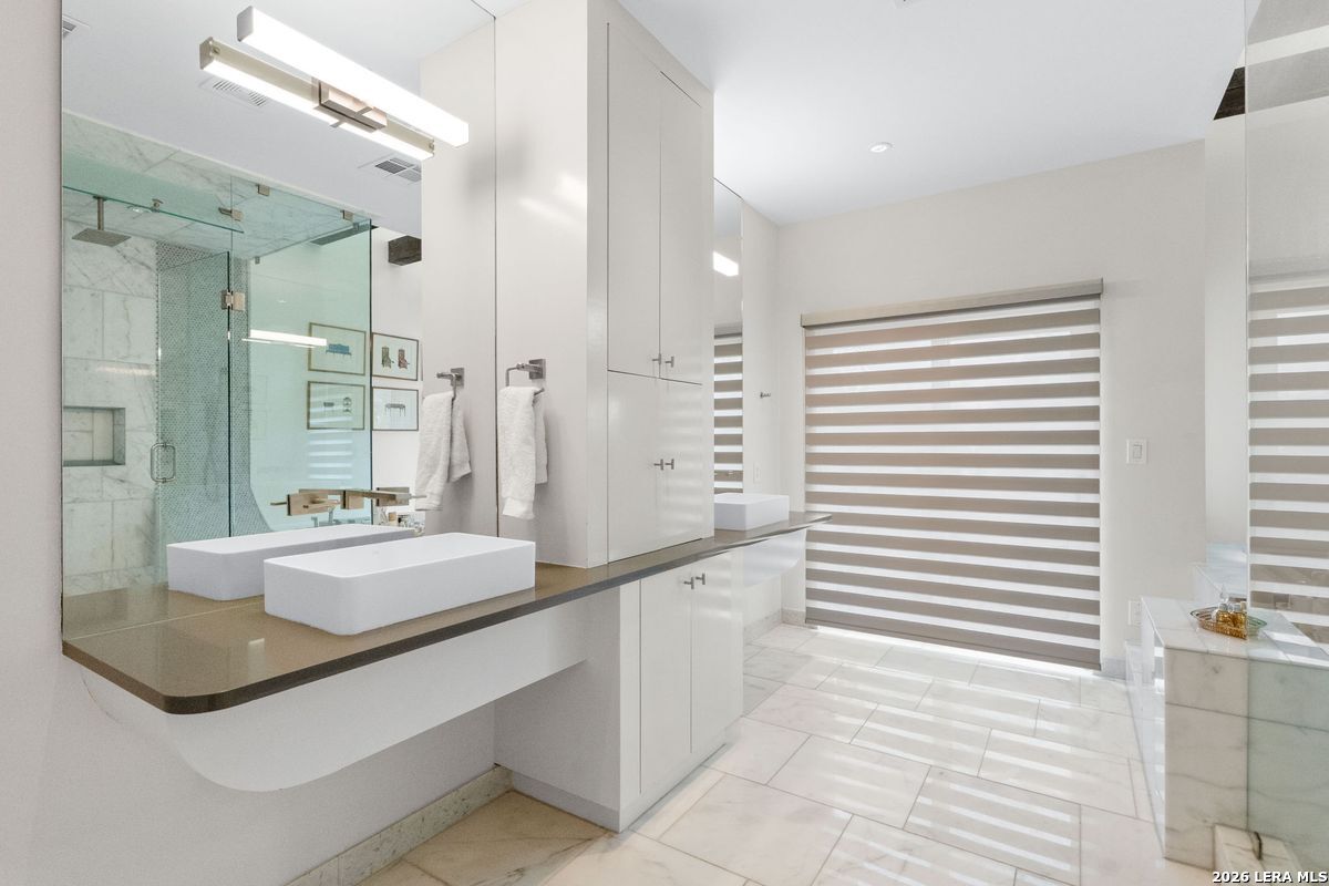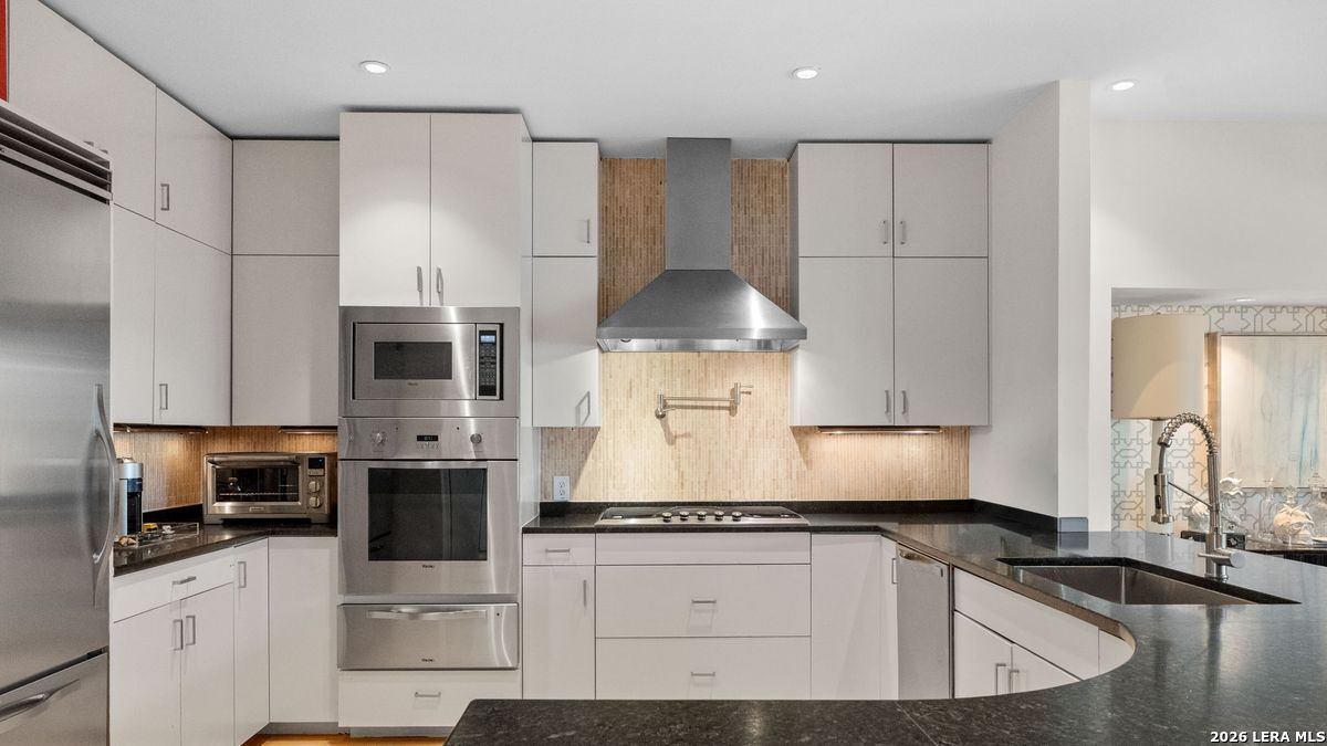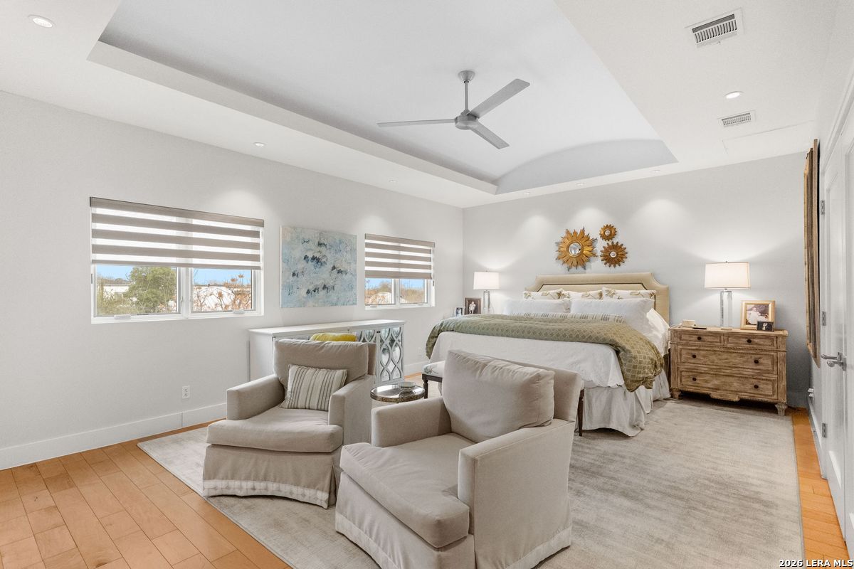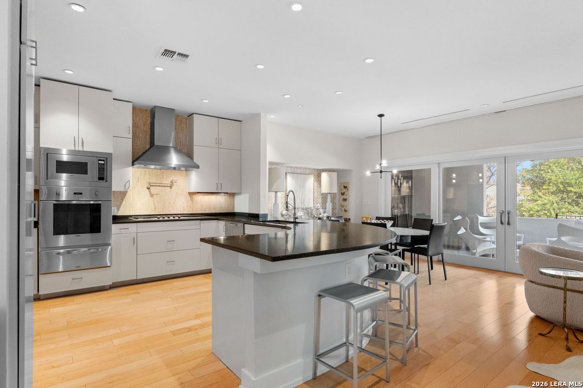 Welcome to refined, lock-and-leave living in this stunning three-story contemporary townhome condominium, where sophisticated design meets everyday functionality. Thoughtfully appointed with high-end finishes and modern conveniences, this residence offers an exceptional luxury lifestyle in Olmos Park. An elevator provides effortless access to all three levels. The main living space is designed for both entertaining and daily living, featuring an open-concept layout that seamlessly connects the kitchen, dining, and family room. At the center of the home, the chef's kitchen impresses with premium Viking appliances, gas cooking, a wine refrigerator, and sleek black granite countertops. Expansive double sliding doors open to an incredible screened-in porch, creating the perfect indoor-outdoor living experience. This inviting space is ideal for al fresco dining, morning coffee, or relaxing while enjoying fresh air year-round, all while filling the home with beautiful natural light. The residence offers three spacious bedrooms, each with its own private bathroom. The tranquil primary suite is a private retreat featuring a wet bar with refrigerator, a generous walk-in closet, and a recently renovated spa-inspired bathroom complete with a whirlpool tub, walk-in steam shower, dual vanities, and designer lighting. Additional highlights include a dedicated home office ideal for remote work, an expansive laundry room with an adjoining walk-in storage closet-features rarely found in townhome living-and an enclosed turfed yard perfect for pets. An oversized two-car attached garage provides ample parking and storage. Located within the prestigious Olmos Park community and the highly acclaimed Alamo Heights School District, this exceptional home offers walkable access to local shops, restaurants, and coffee bars while delivering the comfort, convenience, and luxury of modern urban living.