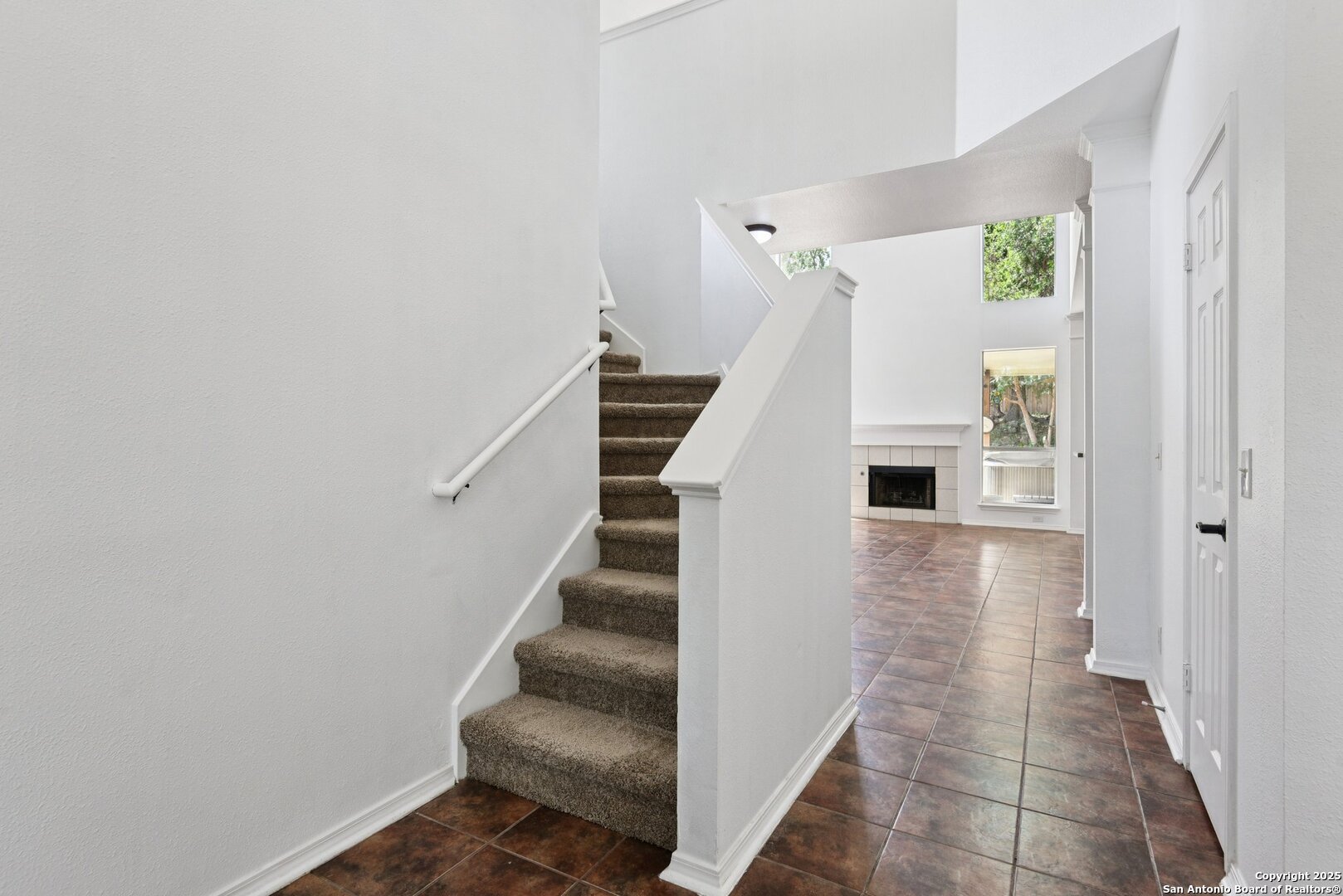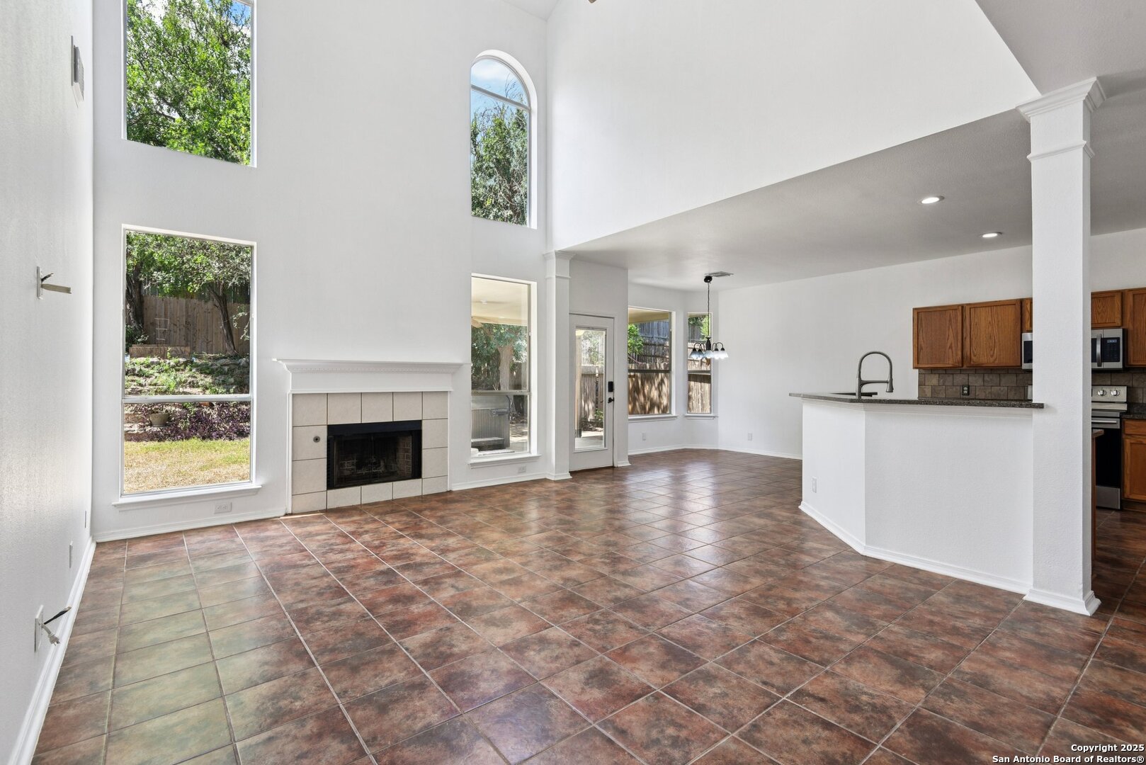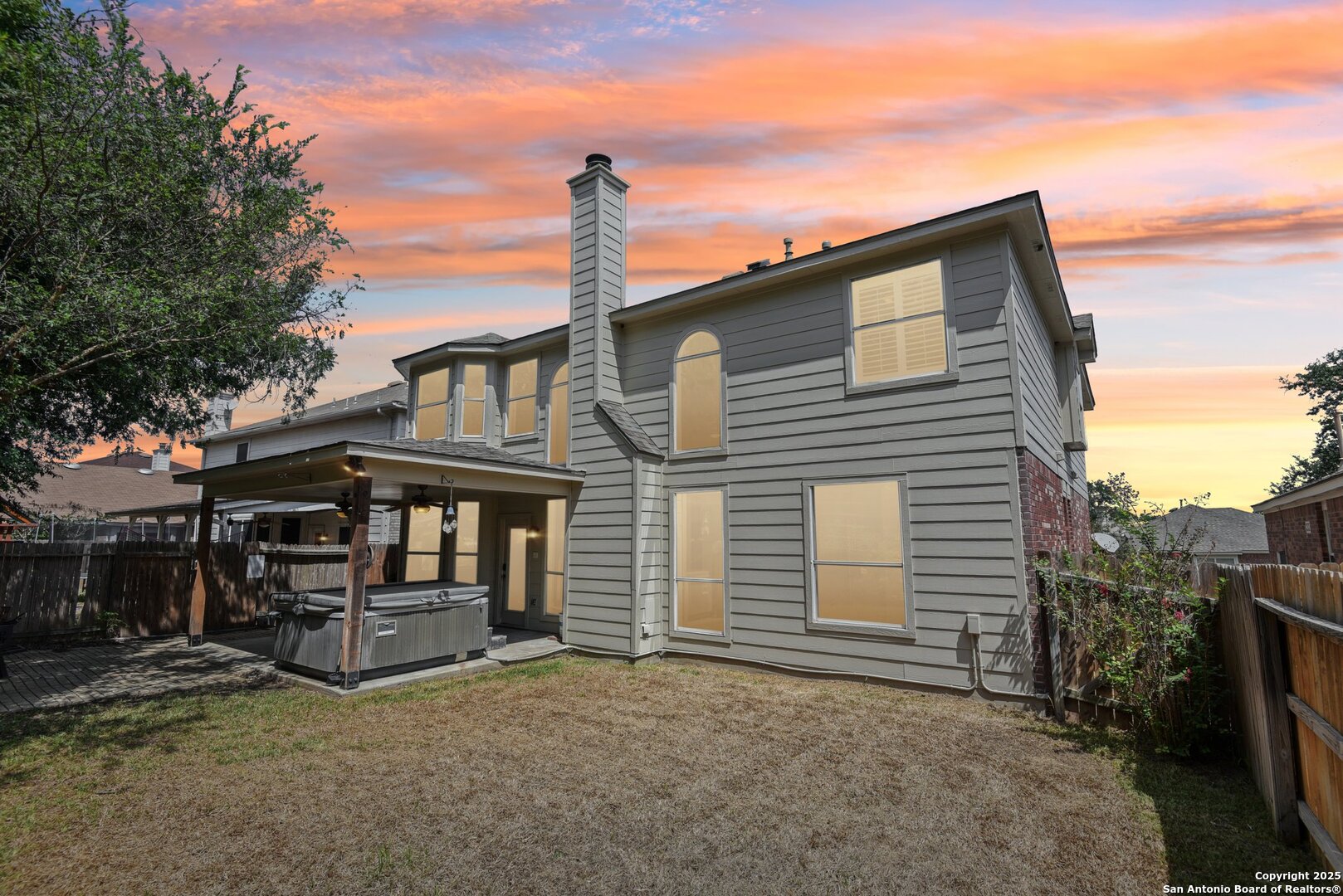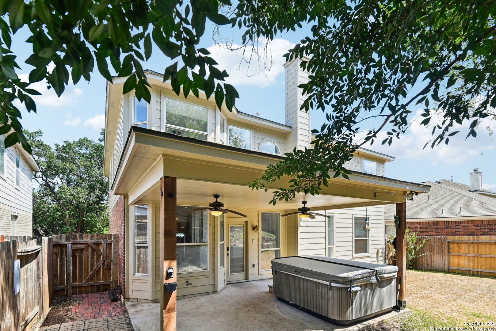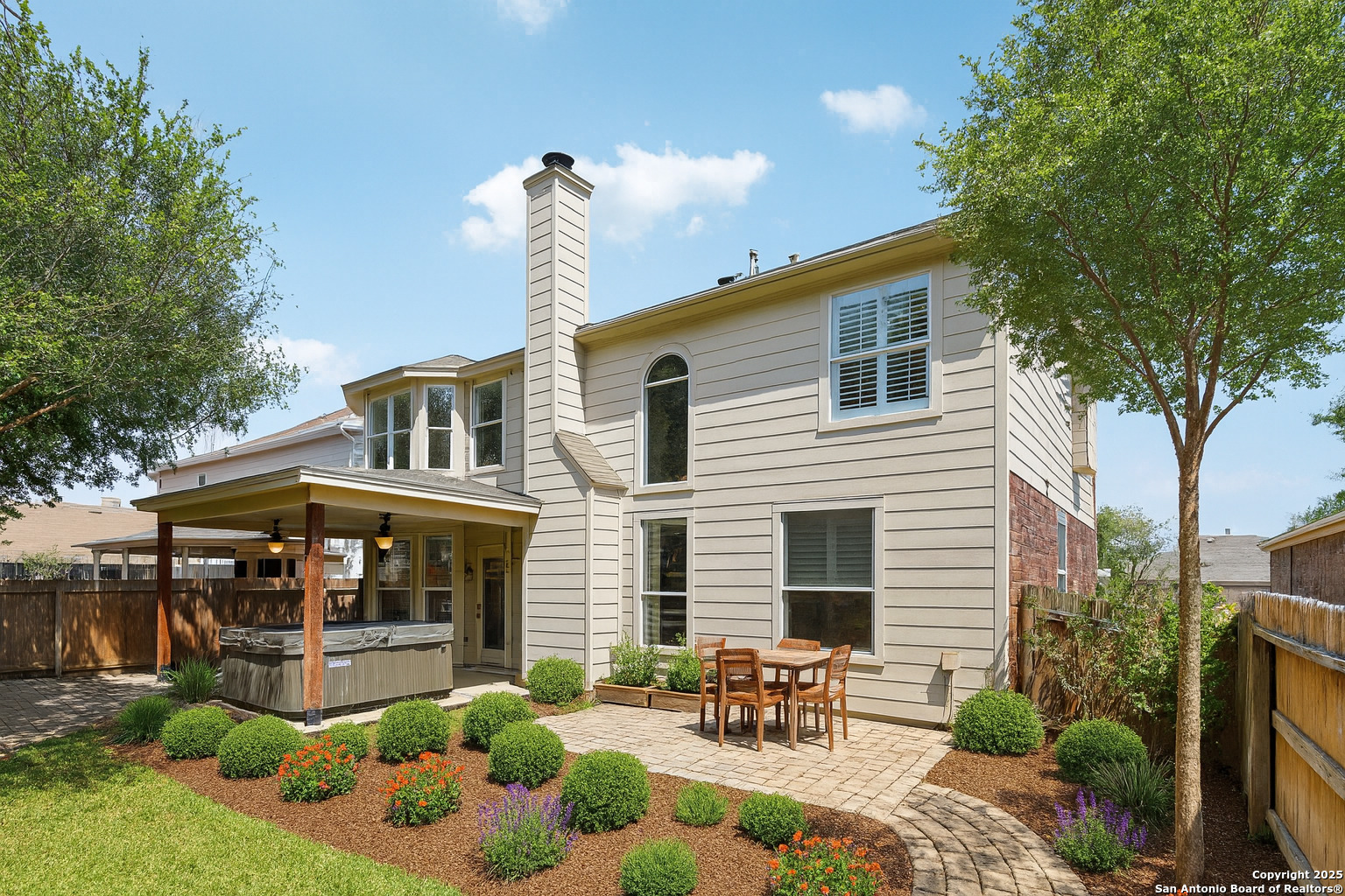 Move-in ready home in sought-after Encino Rio! This spacious property welcomes you with soaring ceilings and tall windows that fill the open, tiled main level with natural light. The dining area flows seamlessly into the granite kitchen featuring stainless steel appliances, and on into the generous living space with a cozy gas fireplace. A secondary bedroom downstairs offers flexibility for guests or a home office. Upstairs, brand-new carpet leads to the large primary suite with an attached primary bath with new LVP flooring, double vanities, a garden soaking tub, separate shower and a generous walk in closet. Two additional bedrooms and a loft/sitting area complete the second floor. Step outside to a private backyard retreat with a covered patio and included hot tub (landscaping suggestion pictured). Encino Rio is a gated community with neighborhood pool and park, conveniently located near shopping, entertainment, and highly rated NEISD schools. So easy to show and ready for you to make this one home!!