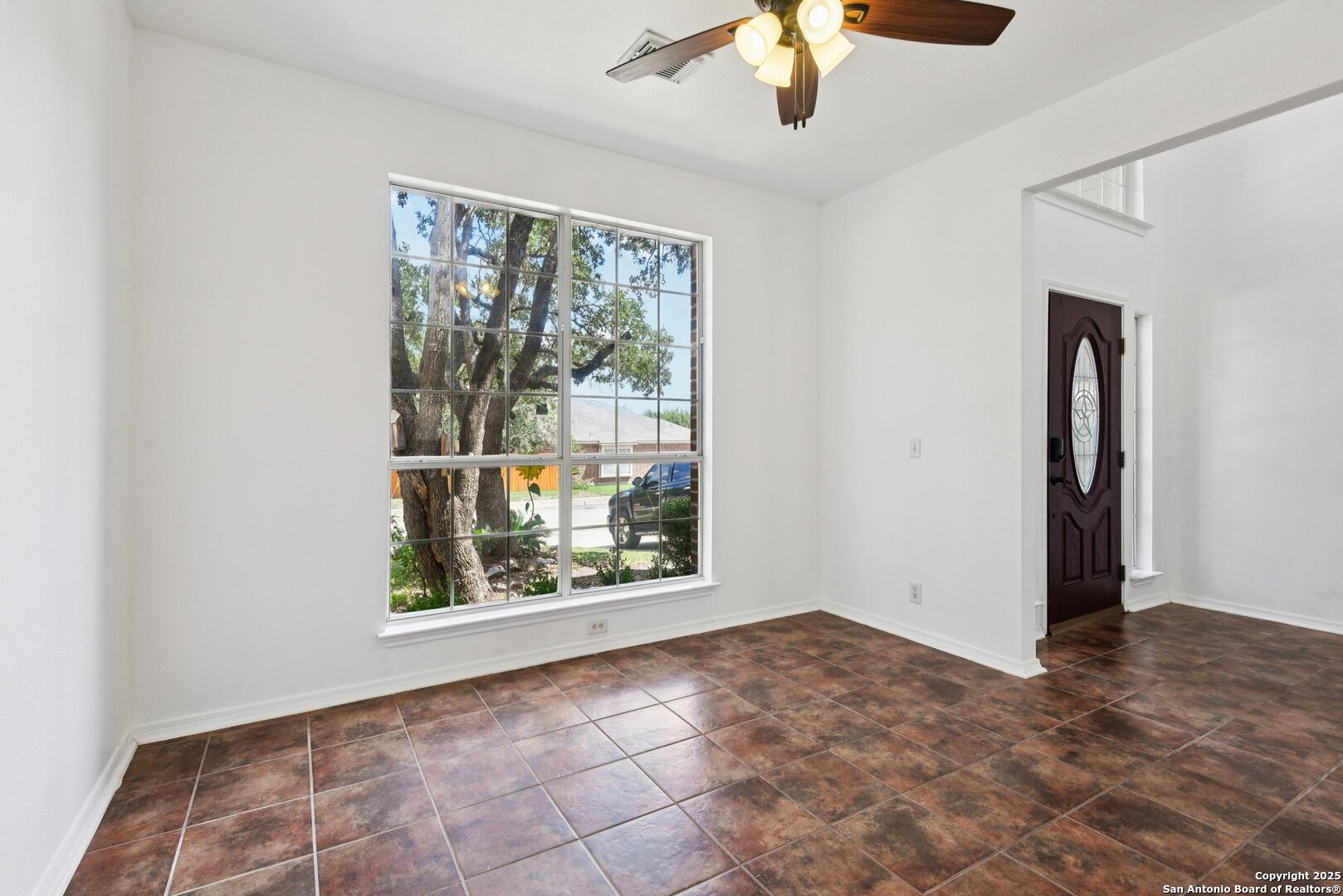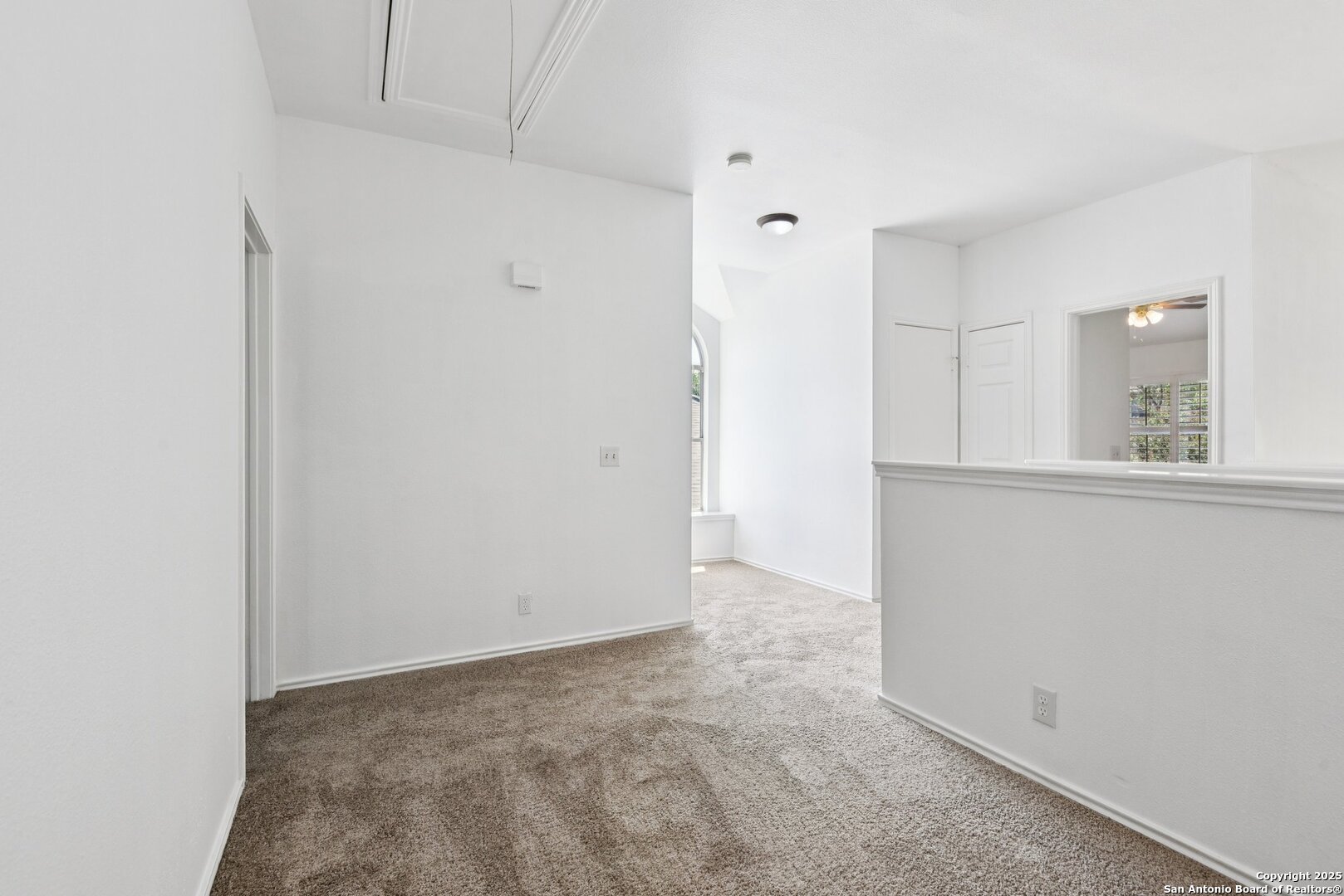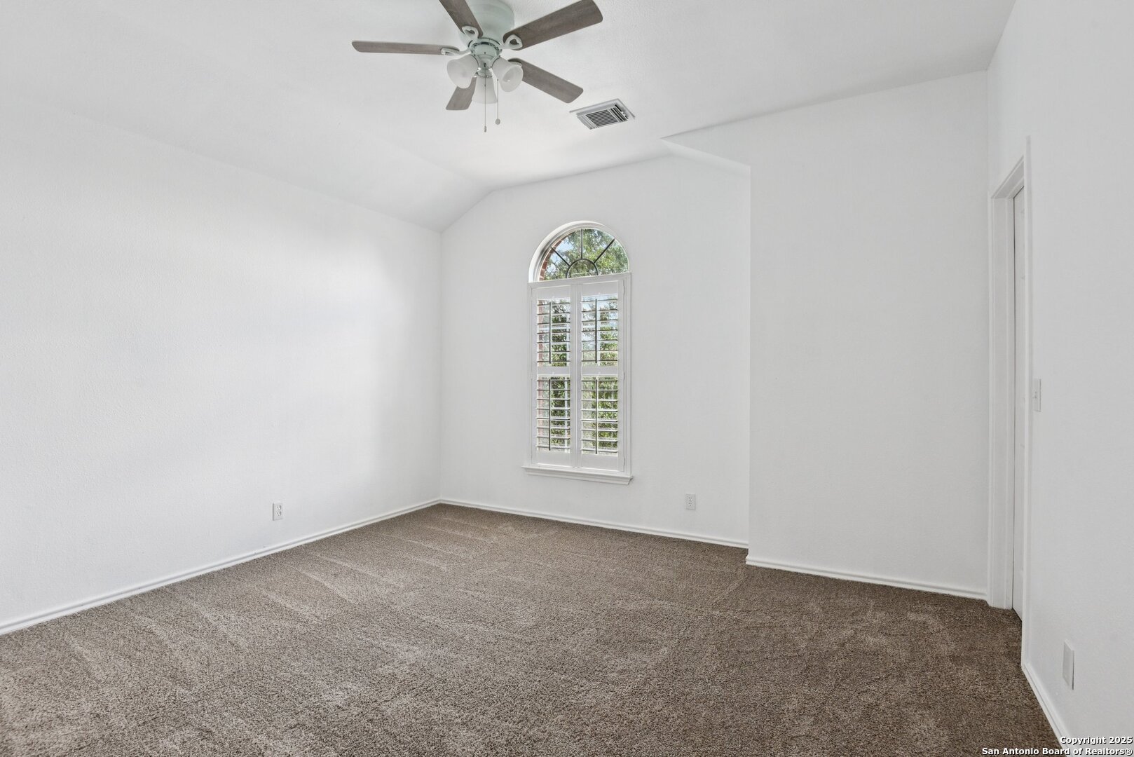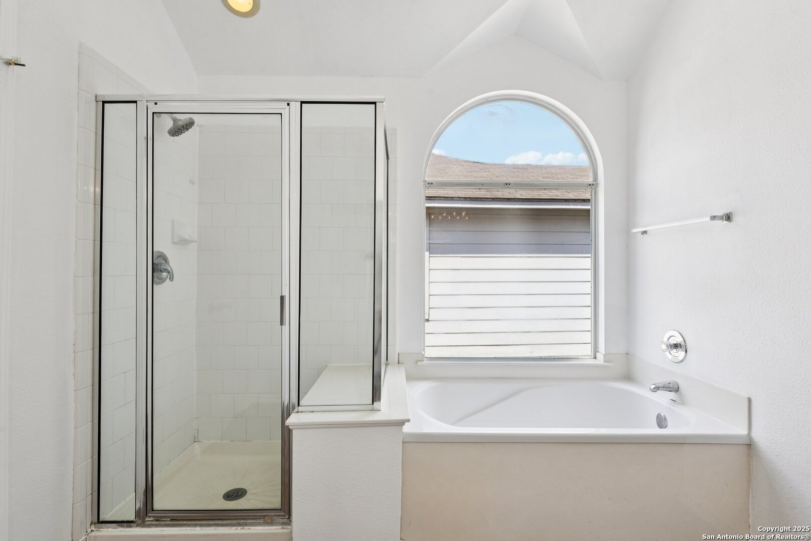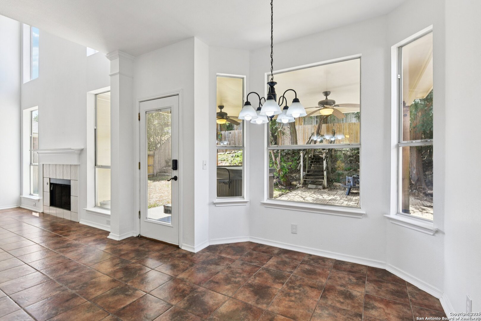 Move-in ready home in sought-after Encino Rio! This spacious property welcomes you with soaring ceilings and tall windows that fill the open, tiled main level with natural light. The dining area flows seamlessly into the granite kitchen featuring stainless steel appliances, and on into the generous living space with a cozy gas fireplace. A secondary bedroom downstairs offers flexibility for guests or a home office. Upstairs, brand-new carpet leads to the large primary suite with an attached primary bath with new LVP flooring, double vanities, a garden soaking tub, separate shower and a generous walk in closet. Two additional bedrooms and a loft/sitting area complete the second floor. Step outside to a private backyard retreat with a covered patio and included hot tub (landscaping suggestion pictured). Encino Rio is a gated community with neighborhood pool and park, conveniently located near shopping, entertainment, and highly rated NEISD schools. So easy to show and ready for you to make this one home!!