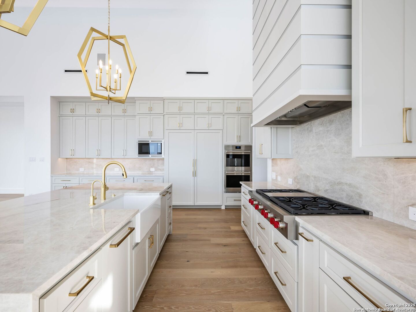 A striking transitional estate positioned along an exclusive cul-de-sac street within The Dominion, offering spectacular panoramic views and exceptional privacy. Walls of floor-to-ceiling glass fill the interiors with natural light, accentuating the home's remarkable craftsmanship and curated finishes. Designed on an impressive scale with soaring ceilings and verdant vistas, the interior showcases European white oak floors, smooth-finish walls, architectural ceiling details, designer lighting, and exquisite stone and marble selections throughout. The chef's kitchen features professional-grade stainless steel appliances and an oversized island that opens seamlessly to the family room, where soaring two-story ceilings and a stone-clad gas fireplace create an atmosphere of grandeur and warmth. The primary suite is a true sanctuary, offering patio access for morning coffee or evening relaxation, dual spa-like baths with separate vanities, and two custom-fitted closets with glass display cabinetry. Three spacious guest bedrooms each feature en-suite baths, while an expansive game room with a full wet bar provides an ideal setting for entertaining. Outdoors, a large covered patio with a full kitchen overlooks the resort-style pool and spa framed by sweeping Hill Country views. A four-car side-entry garage with epoxy-finished floors is complemented by an additional two-car garage and generous guest parking. Every element of this residence reflects thoughtful design and timeless luxury.